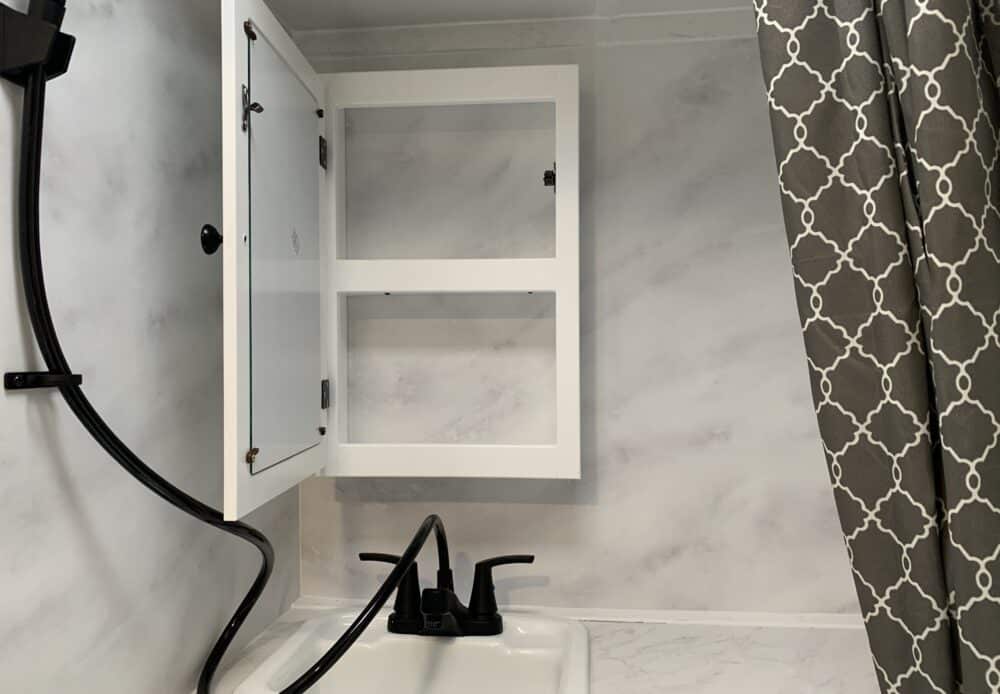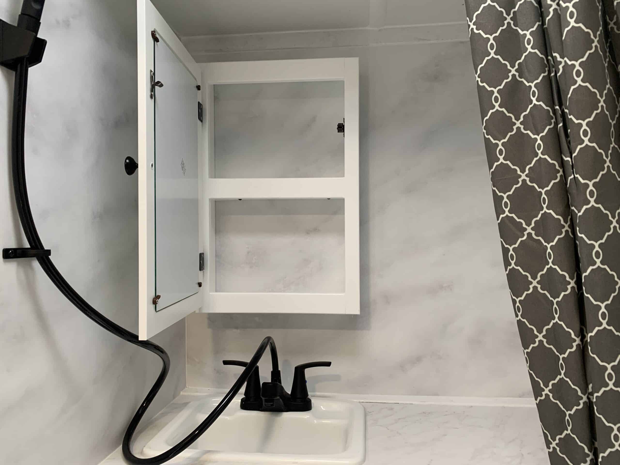 Sans oublier, la salle de bain avec douche, toilette, lavabo et cabinet pharmacie.