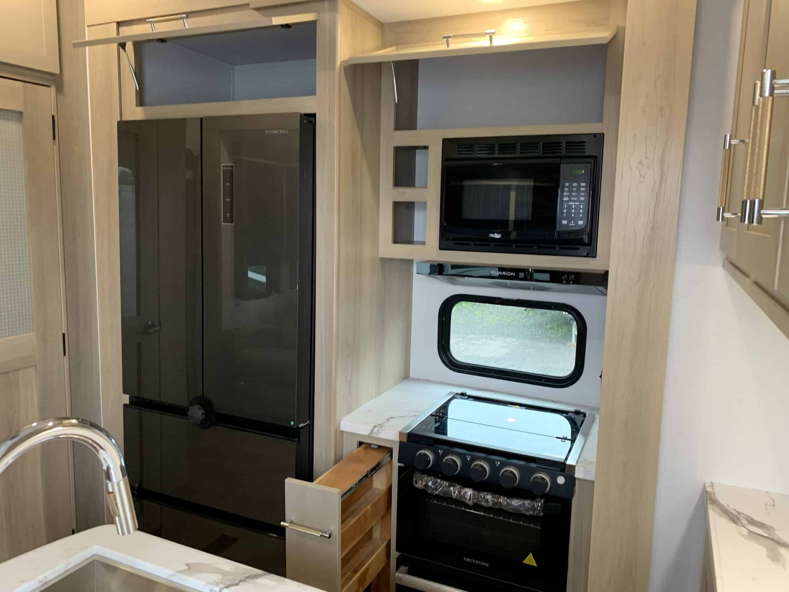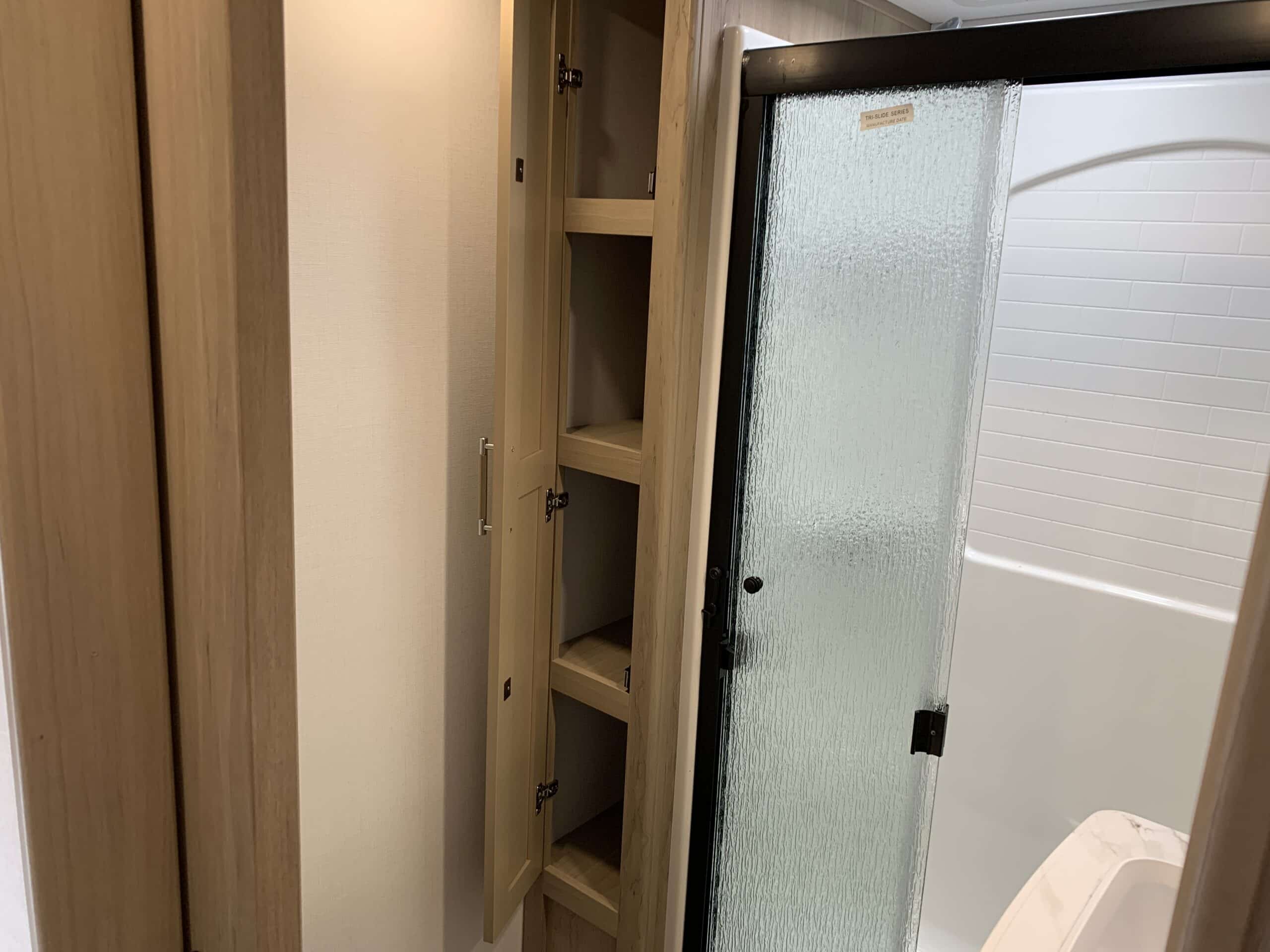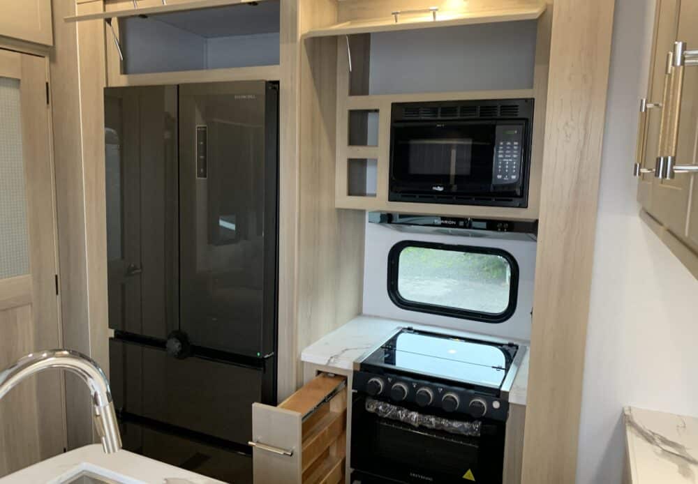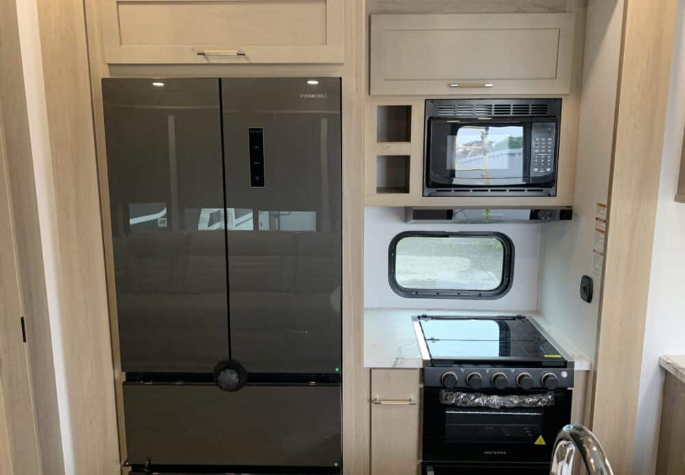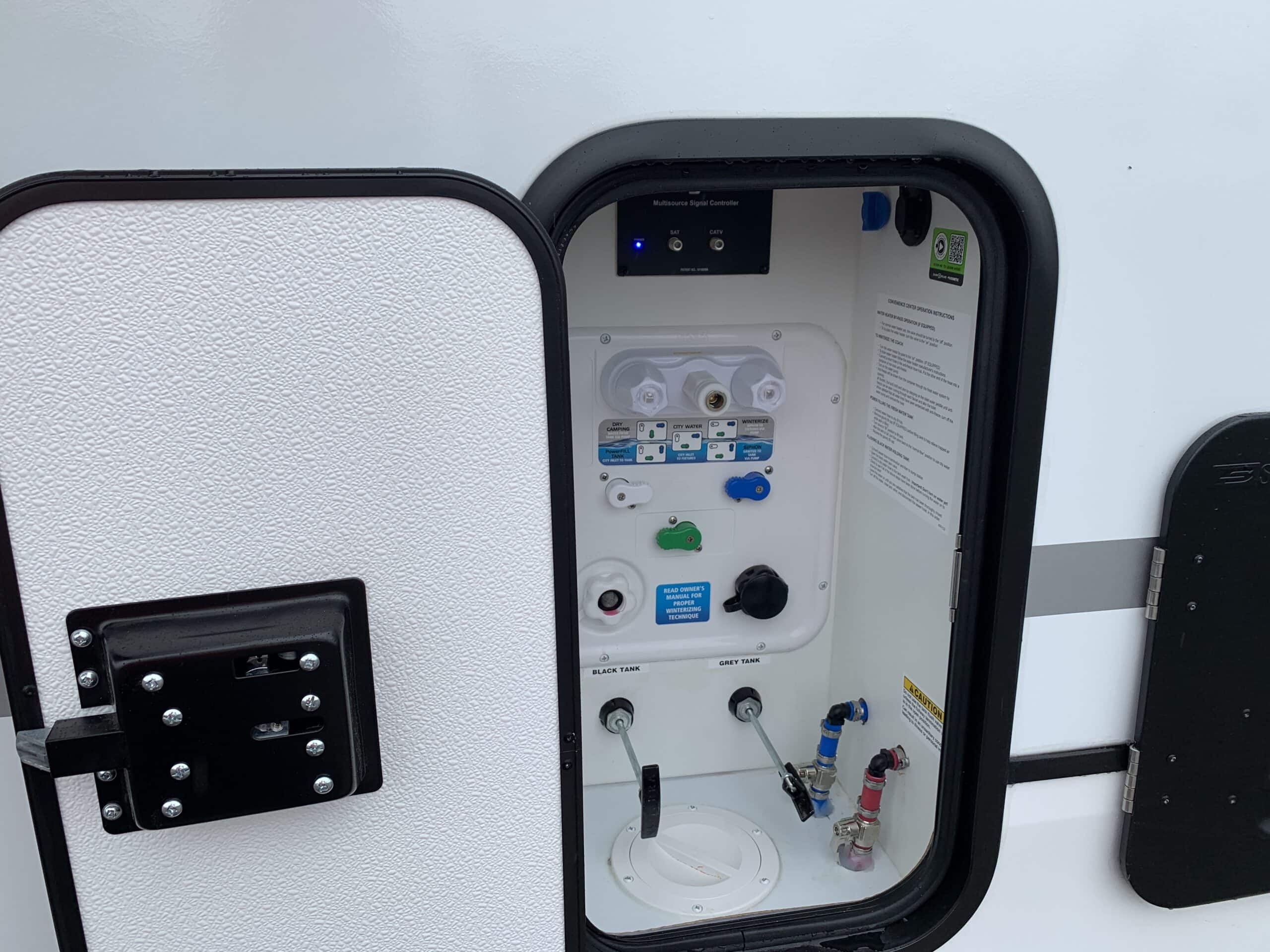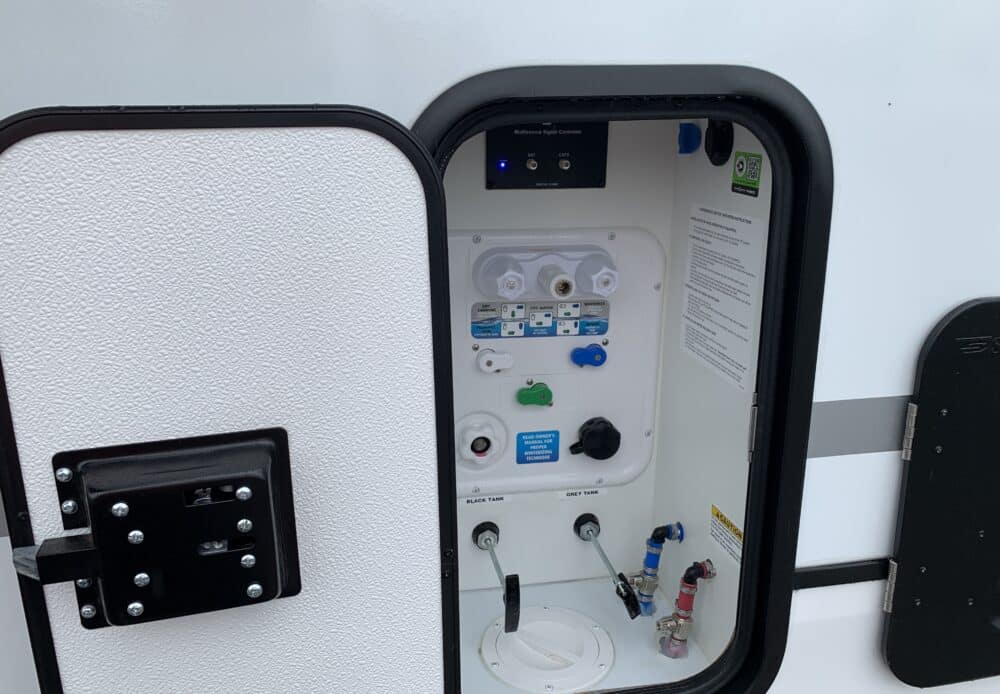 D’abord cette roulotte a un garage fermé de 13 pieds. Grâce à son auvent de 15 pieds et sa douche, vous profiterez de l’extérieur sans soucis. Ensuite, elle est muni d’une prise 50 ampères pour une meilleure qualité de courant ainsi qu’un panneau solaire.