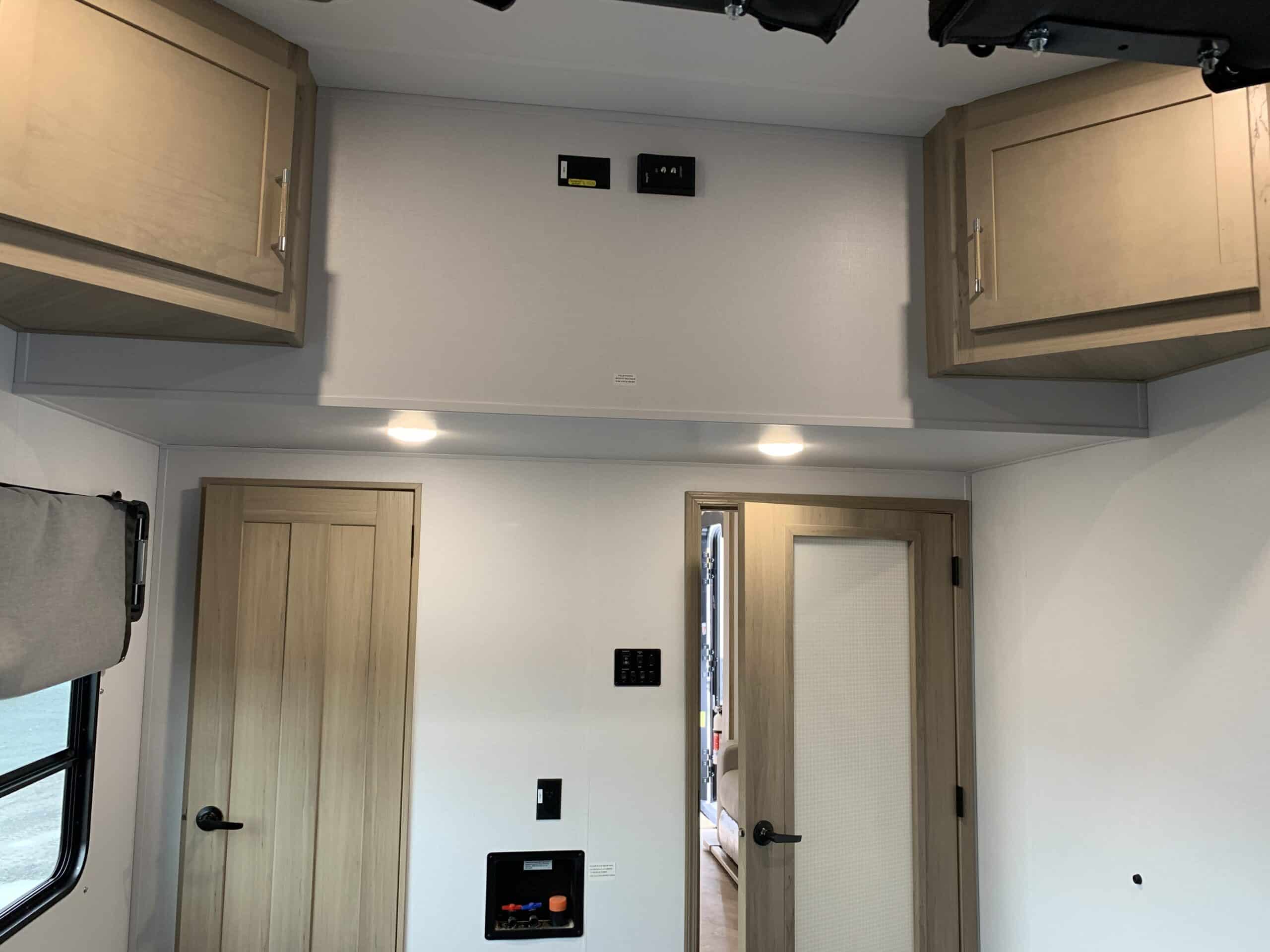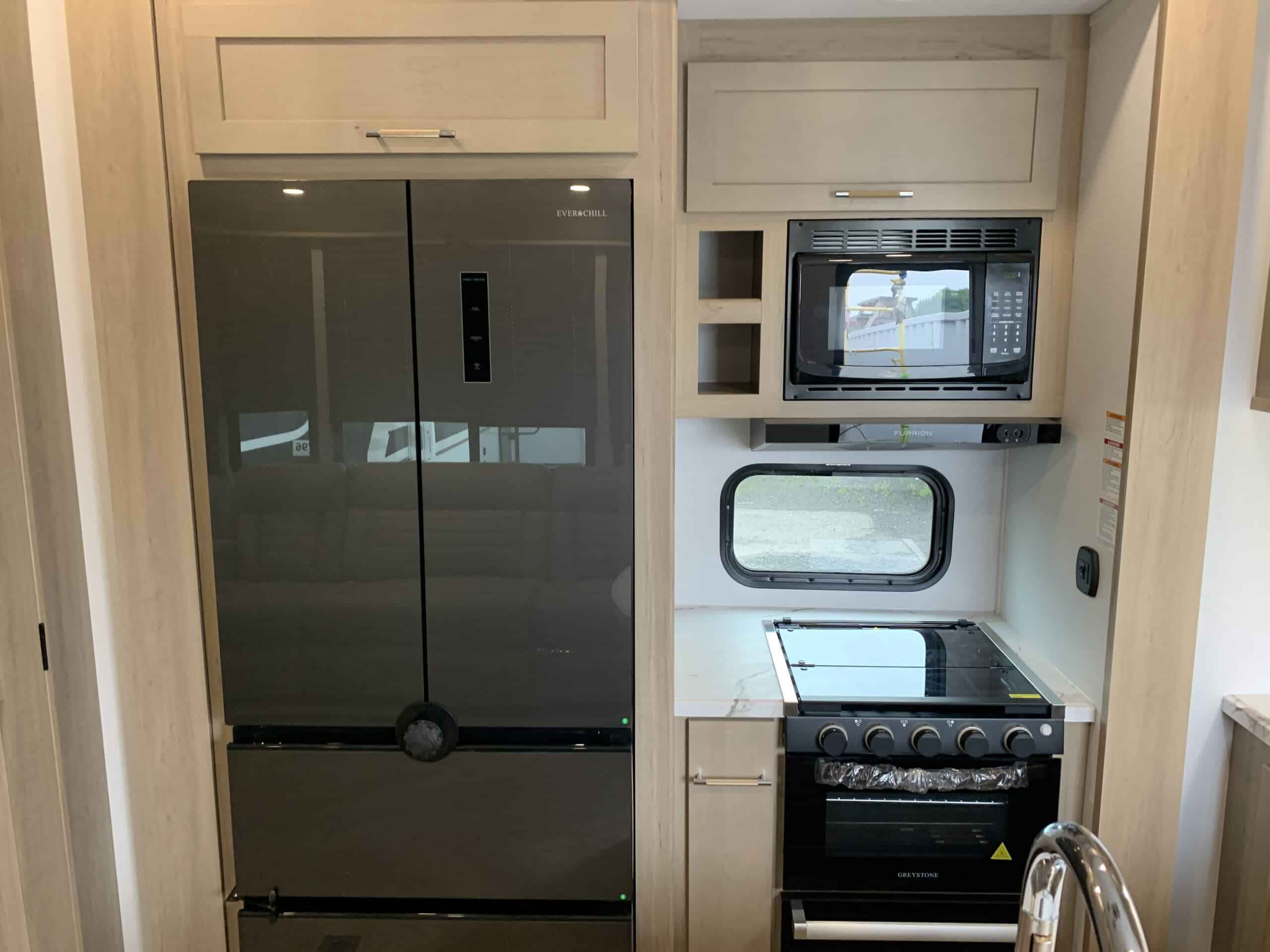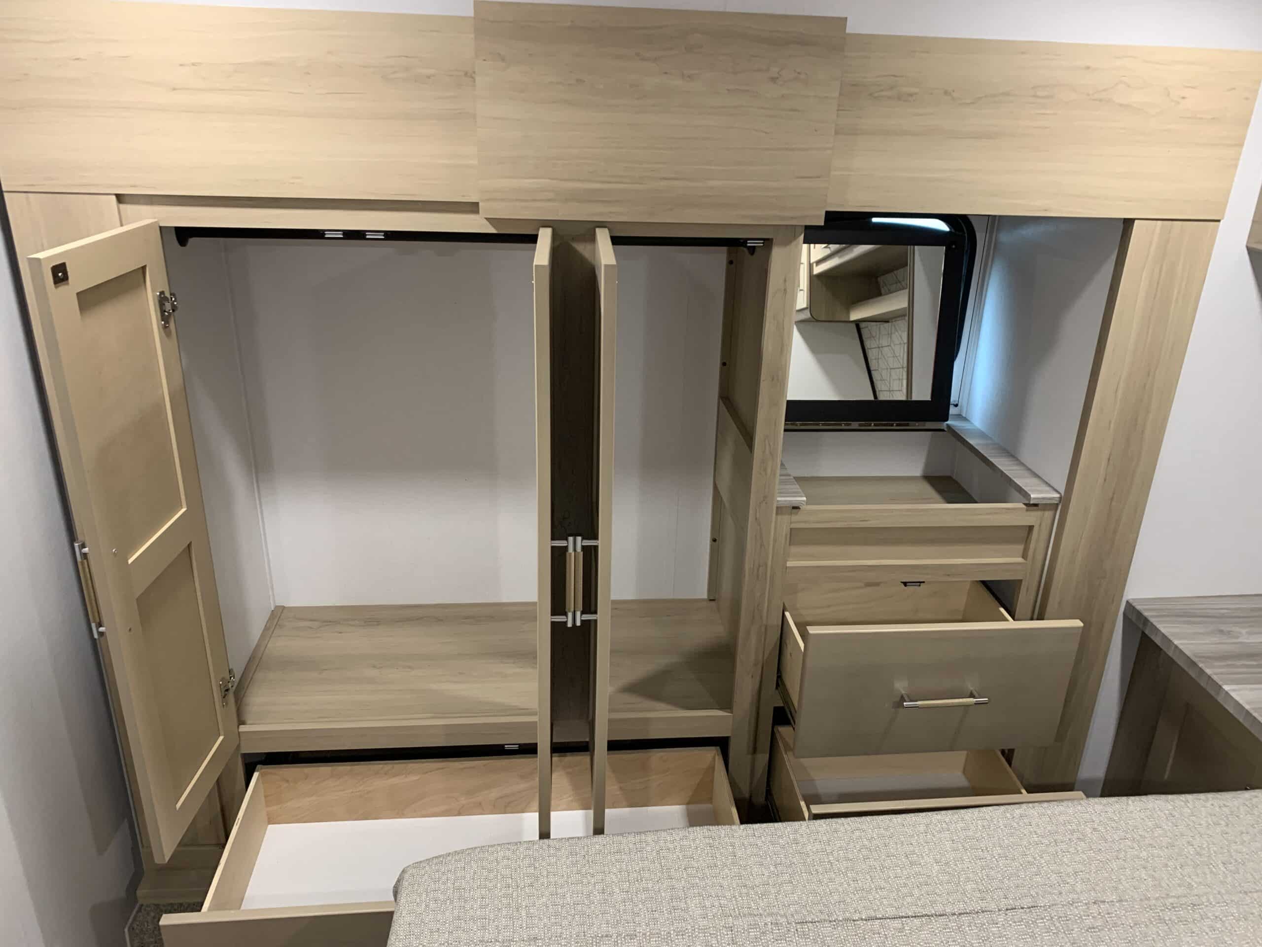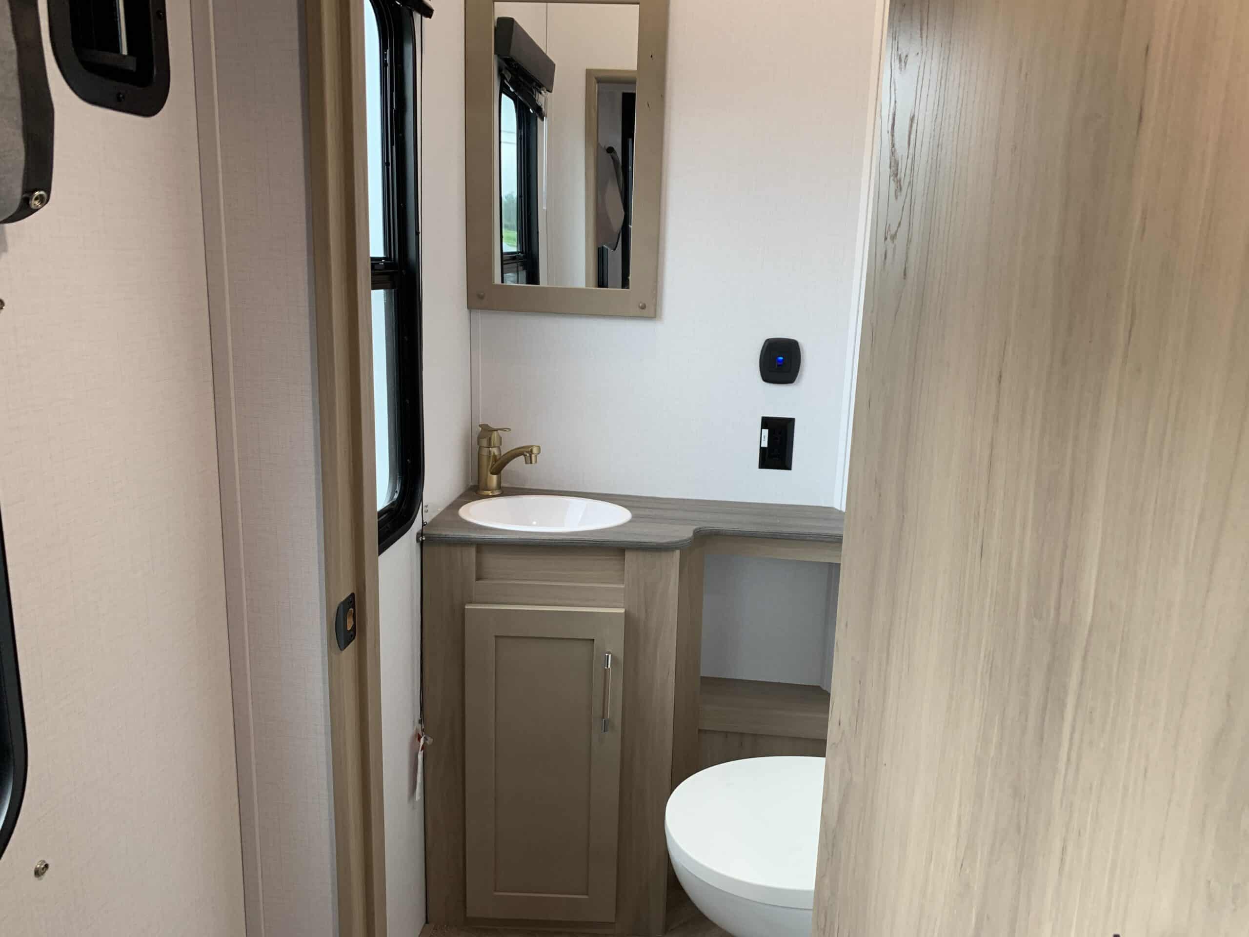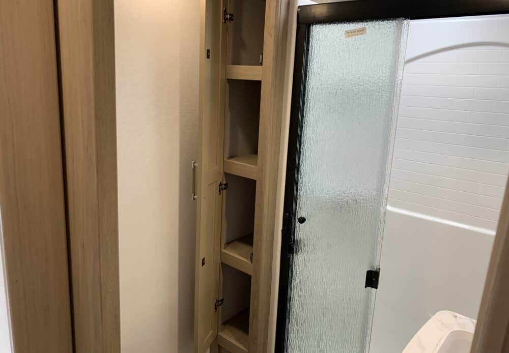 D’abord cette roulotte a un garage fermé de 13 pieds. Grâce à son auvent de 15 pieds et sa douche, vous profiterez de l’extérieur sans soucis. Ensuite, elle est muni d’une prise 50 ampères pour une meilleure qualité de courant ainsi qu’un panneau solaire.