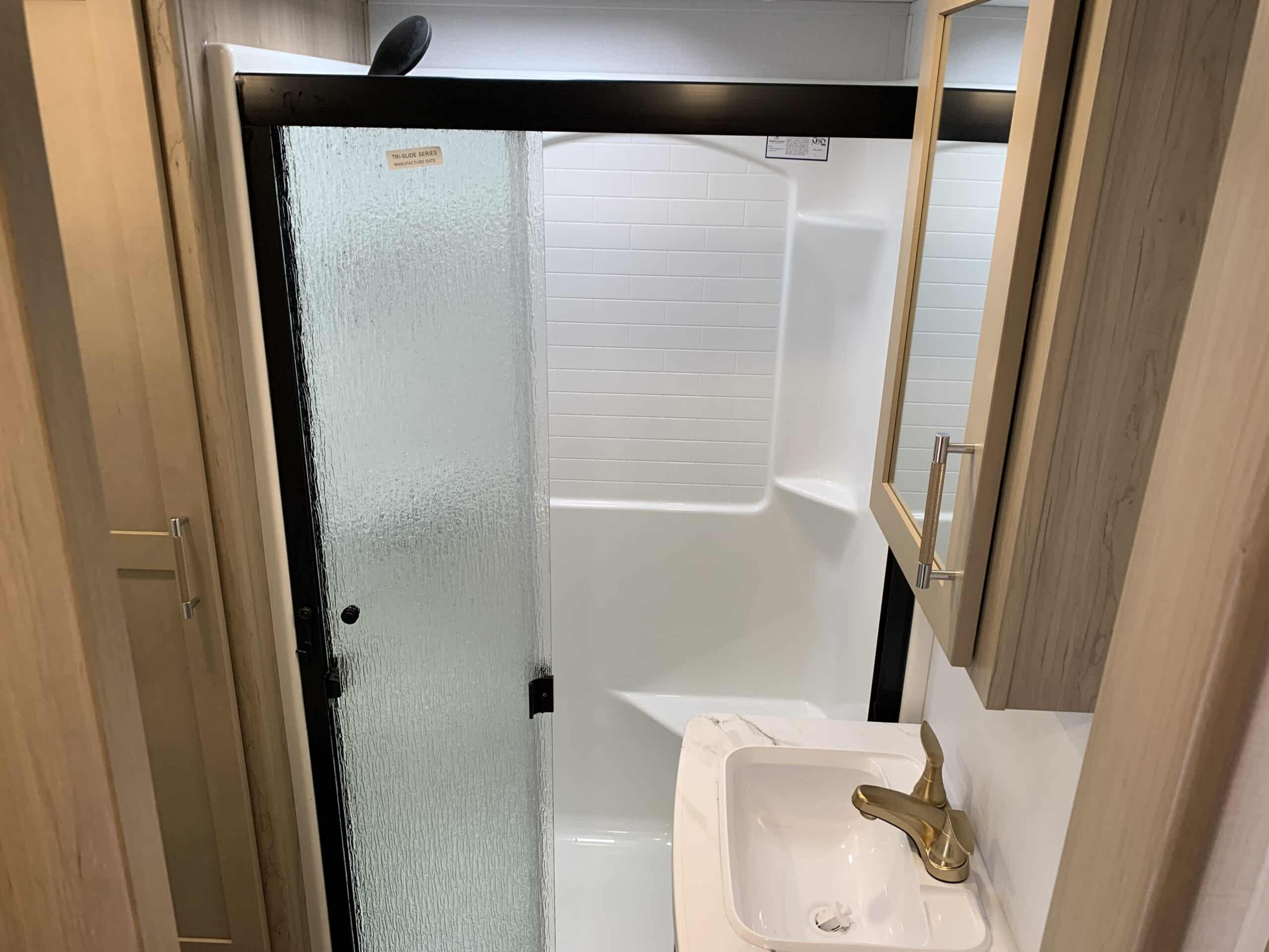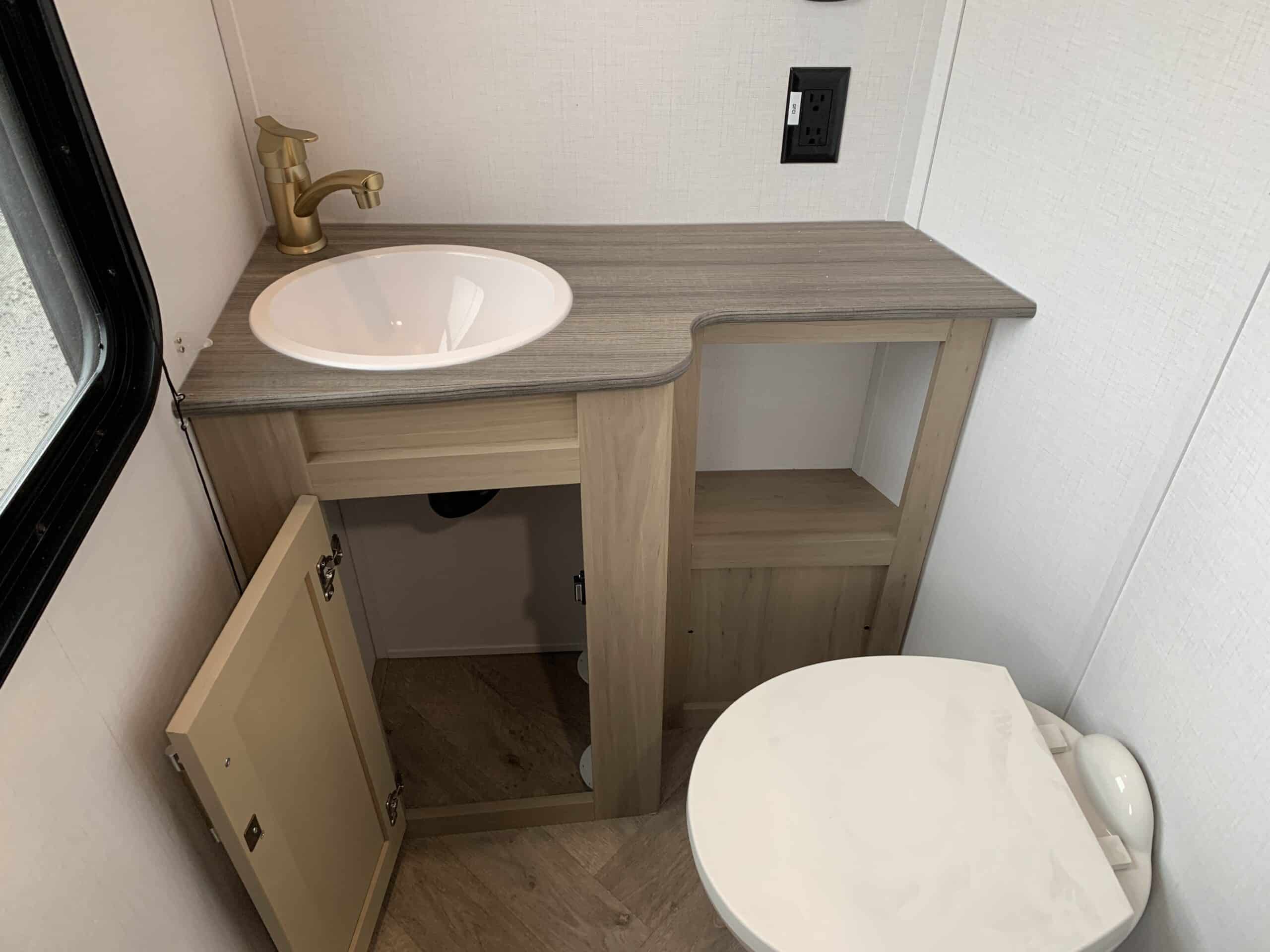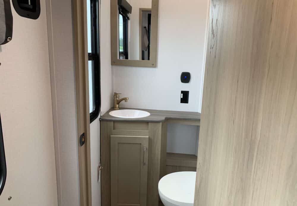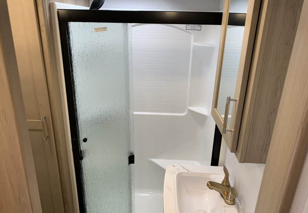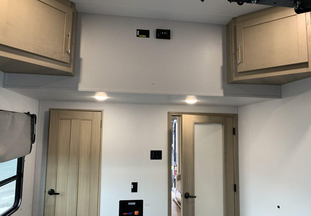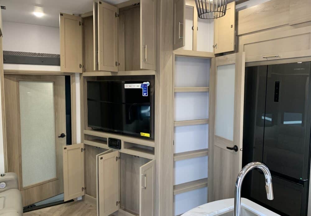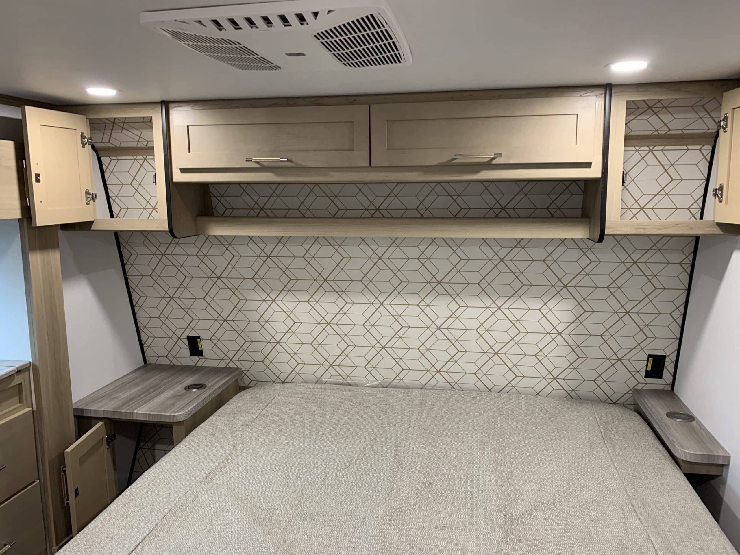 D’abord cette roulotte a un garage fermé de 13 pieds. Grâce à son auvent de 15 pieds et sa douche, vous profiterez de l’extérieur sans soucis. Ensuite, elle est muni d’une prise 50 ampères pour une meilleure qualité de courant ainsi qu’un panneau solaire.