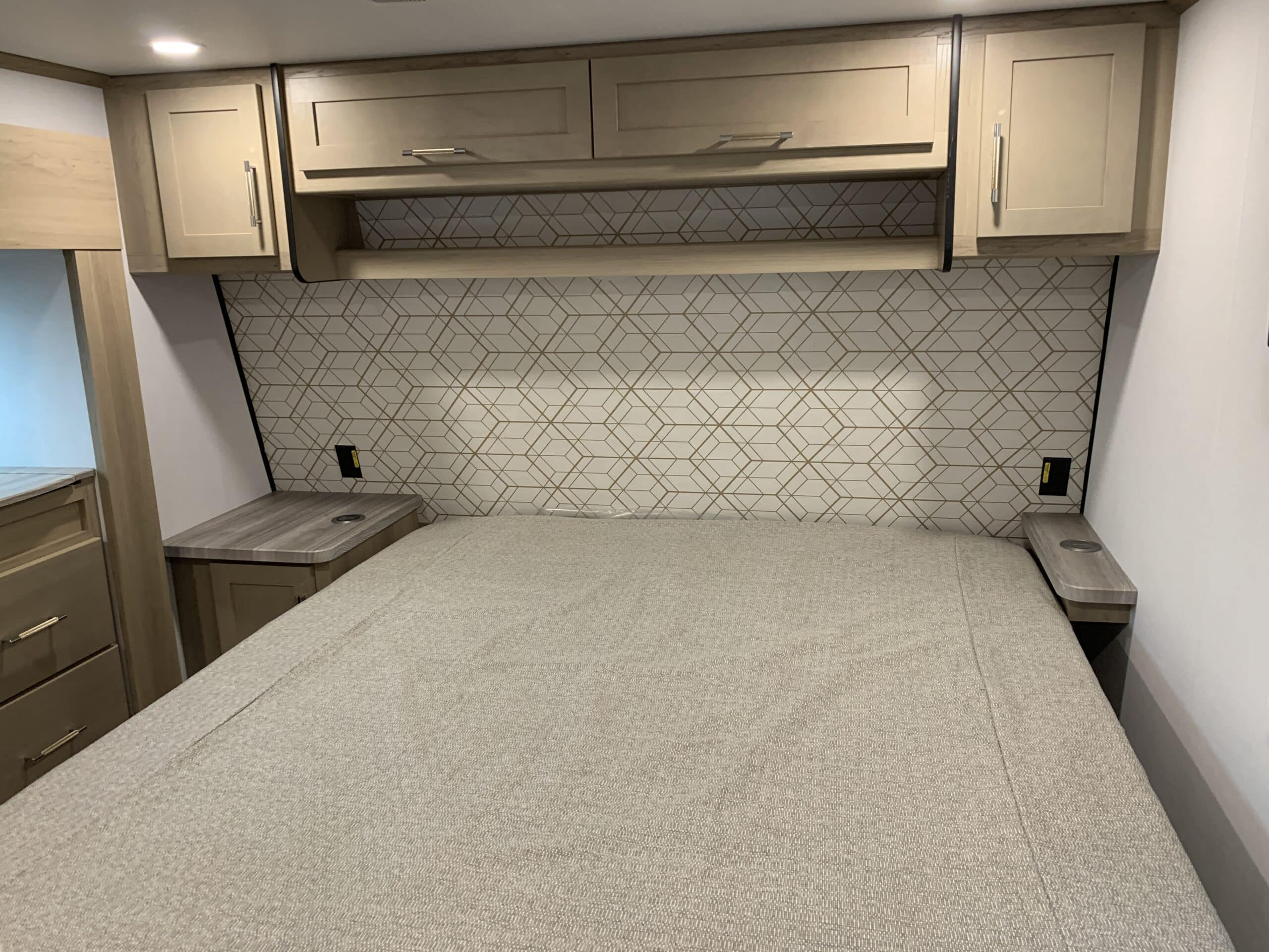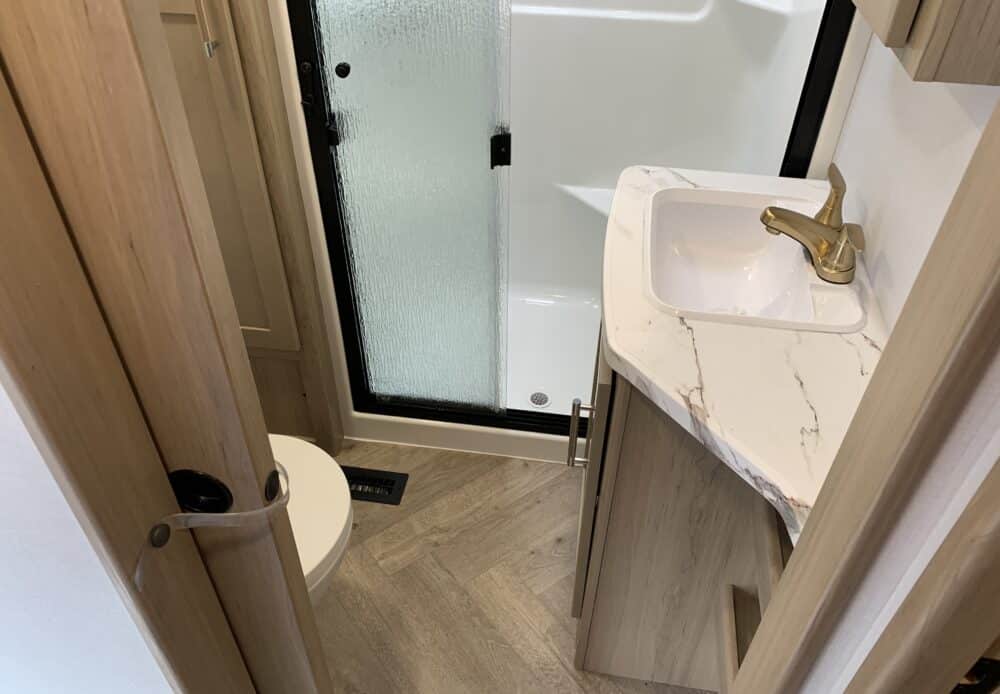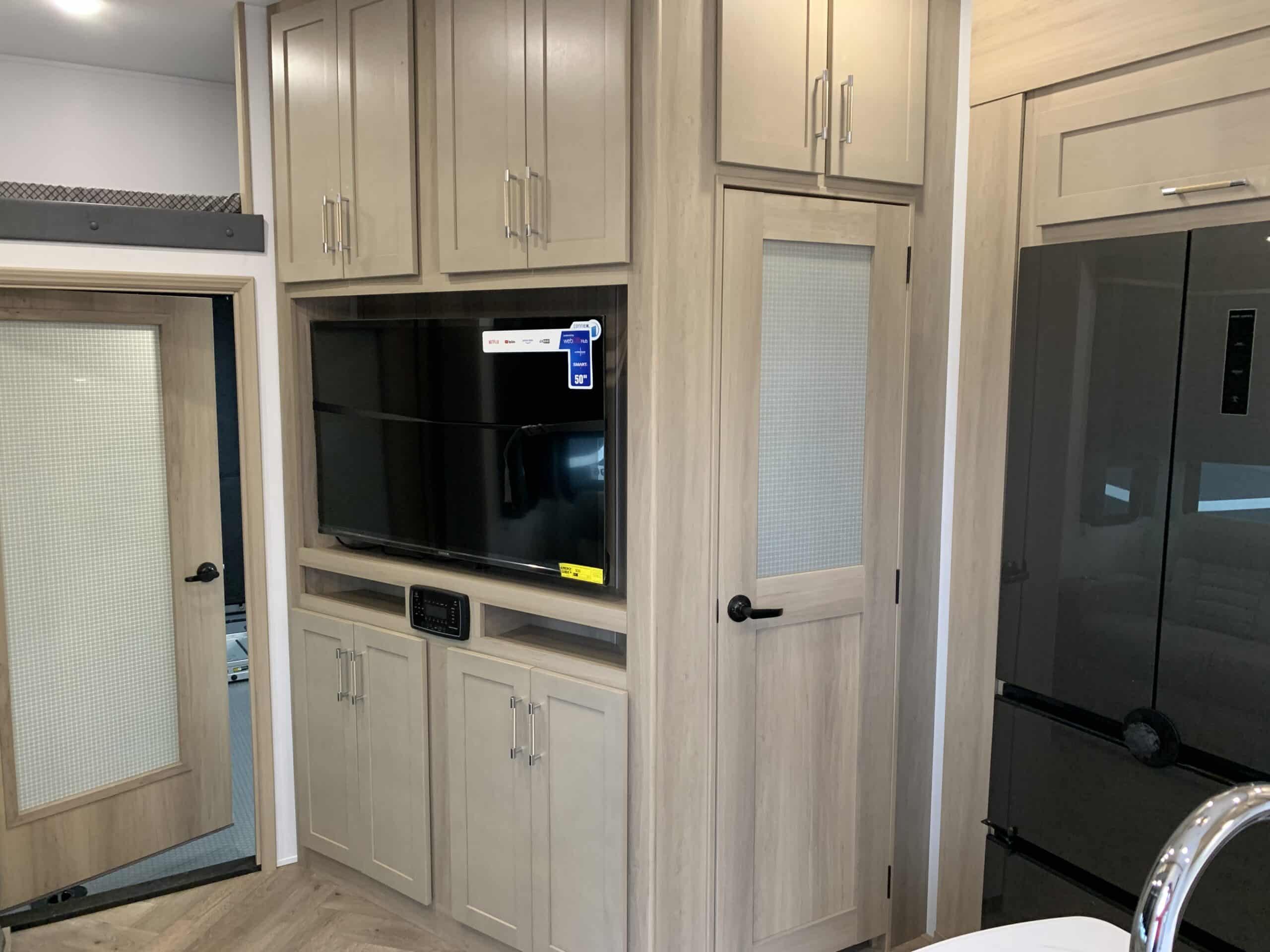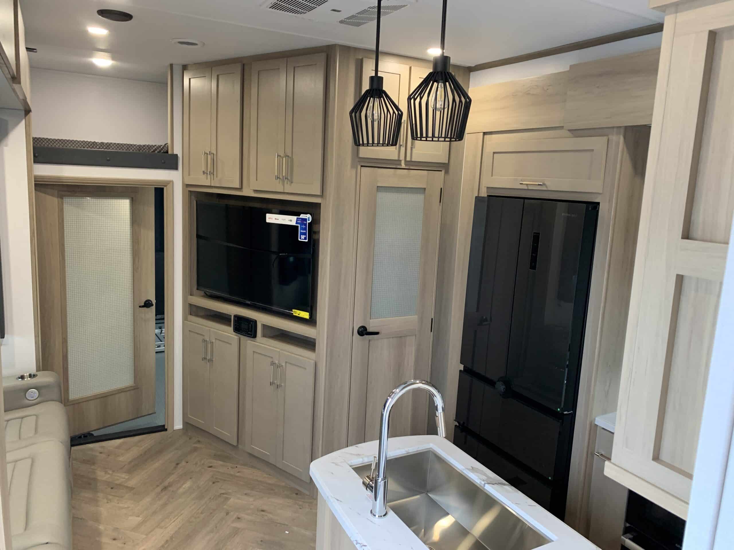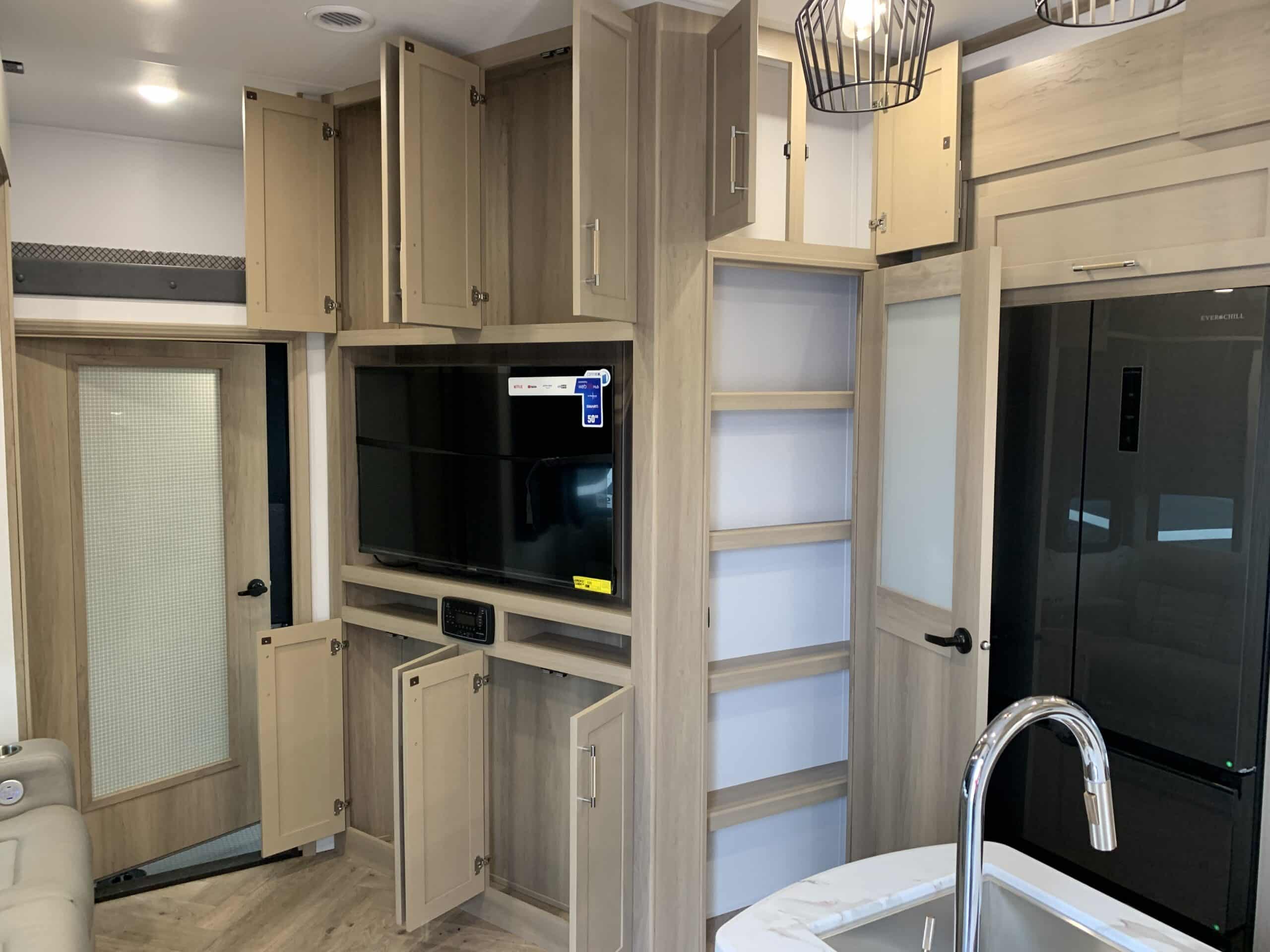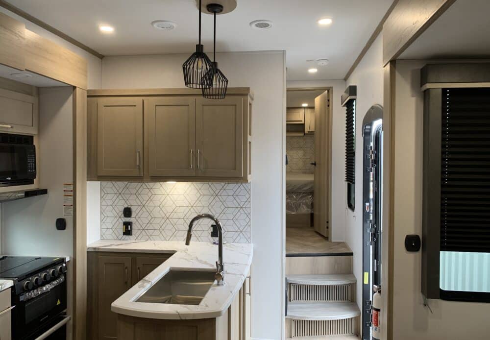 D’abord cette roulotte a un garage fermé de 13 pieds. Grâce à son auvent de 15 pieds et sa douche, vous profiterez de l’extérieur sans soucis. Ensuite, elle est muni d’une prise 50 ampères pour une meilleure qualité de courant ainsi qu’un panneau solaire.