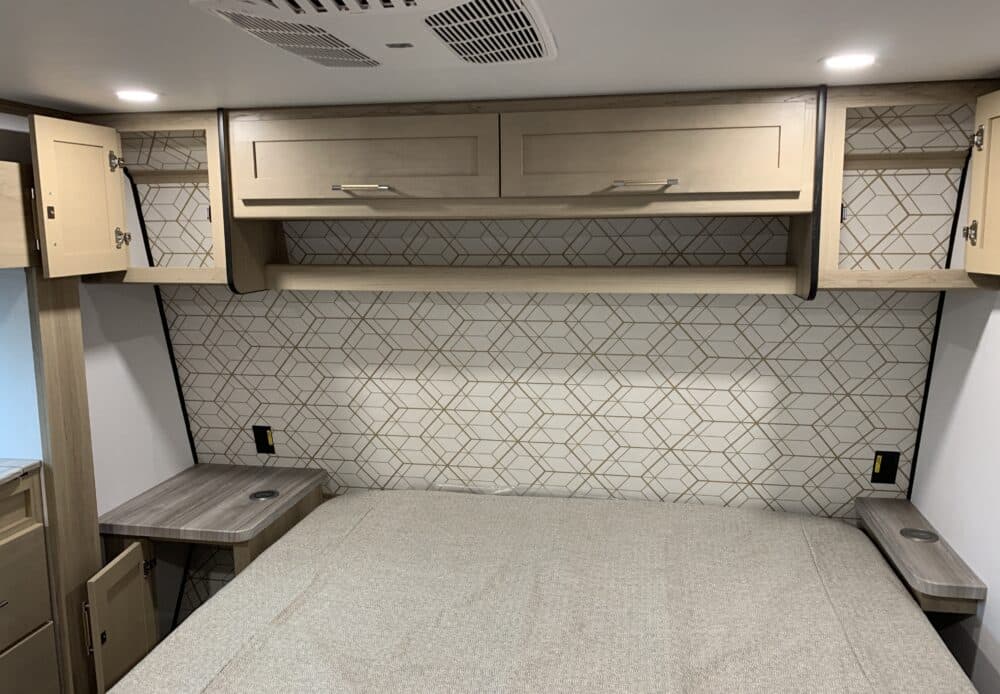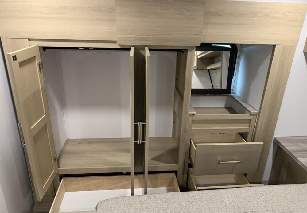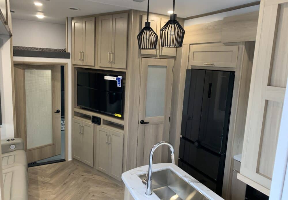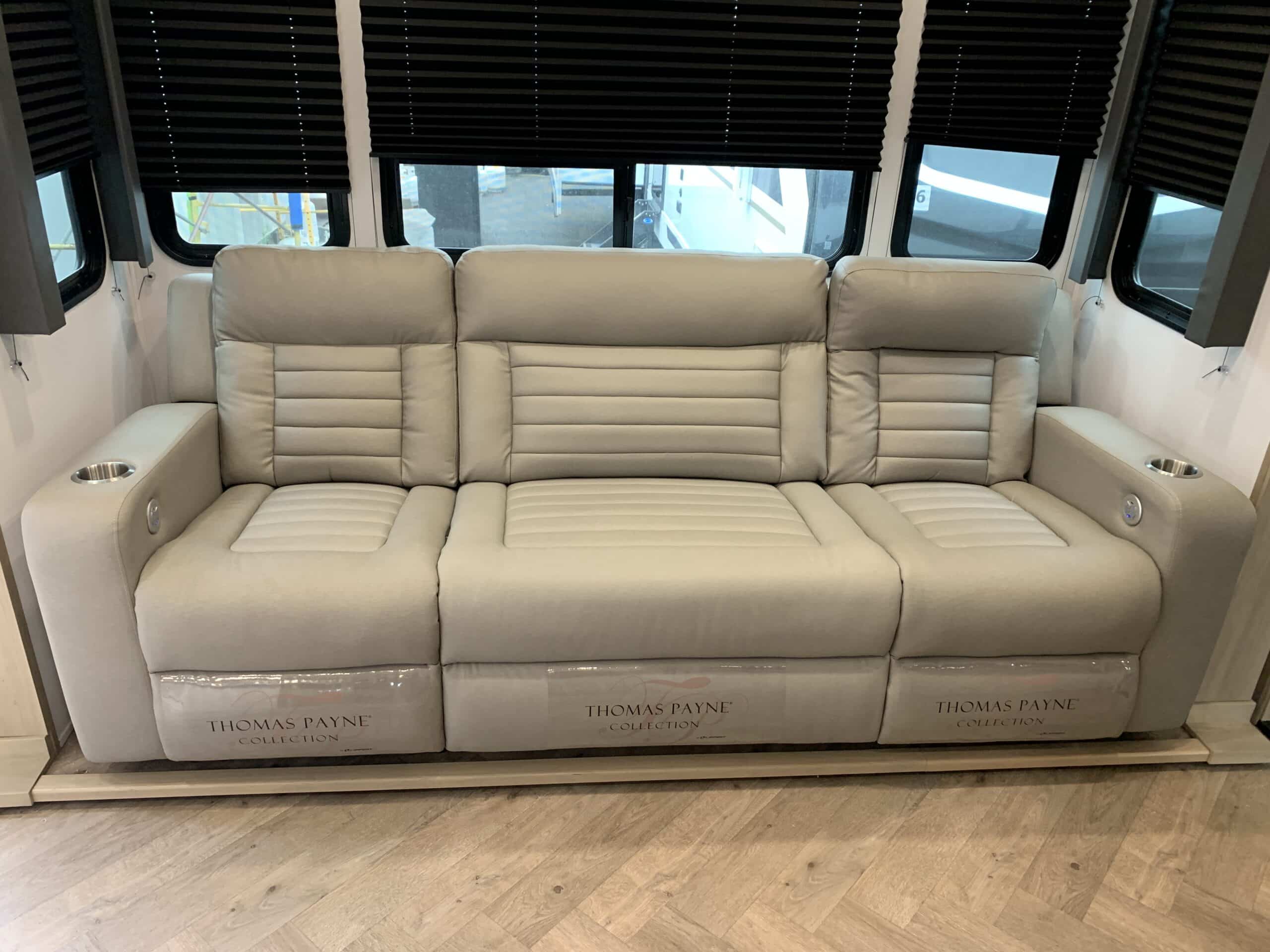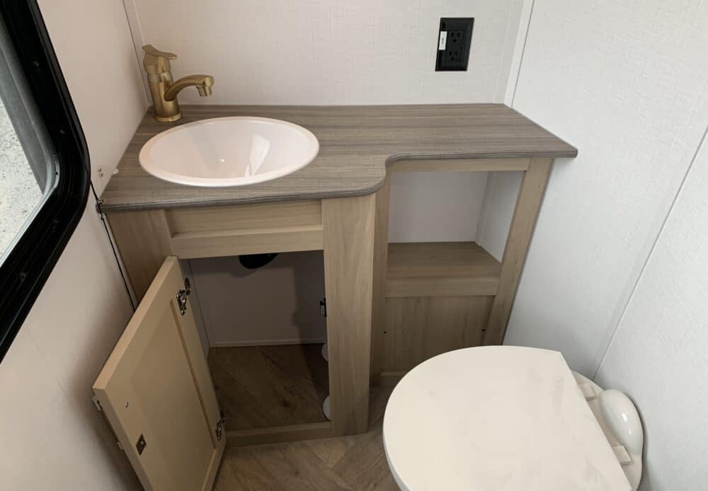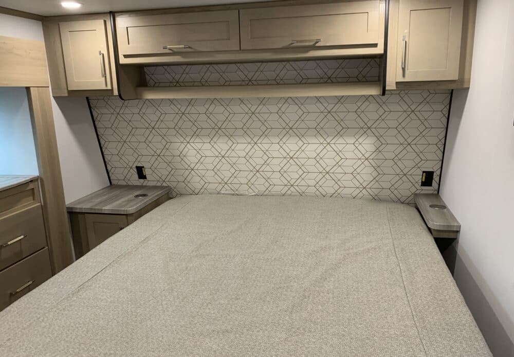 D’abord cette roulotte a un garage fermé de 13 pieds. Grâce à son auvent de 15 pieds et sa douche, vous profiterez de l’extérieur sans soucis. Ensuite, elle est muni d’une prise 50 ampères pour une meilleure qualité de courant ainsi qu’un panneau solaire.