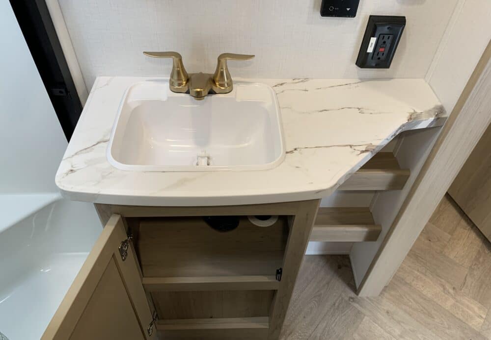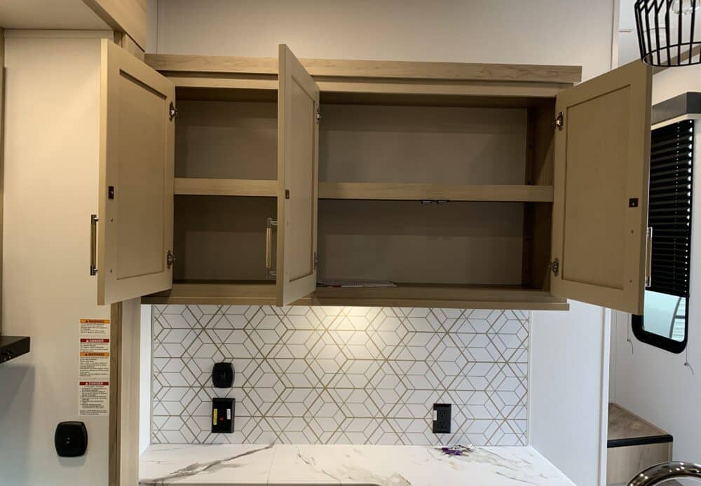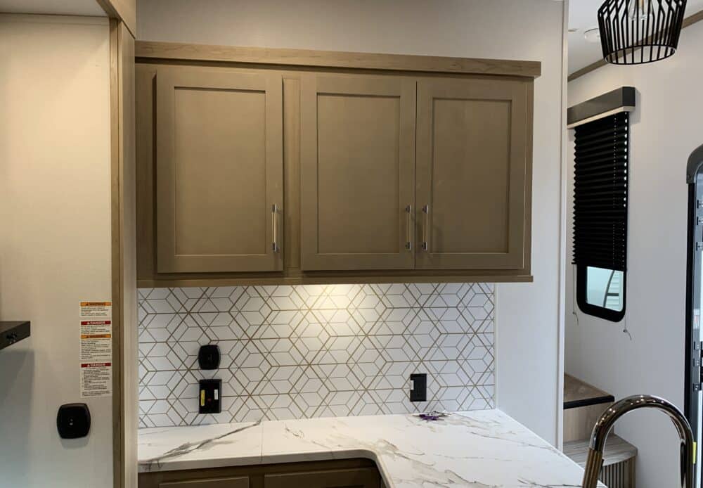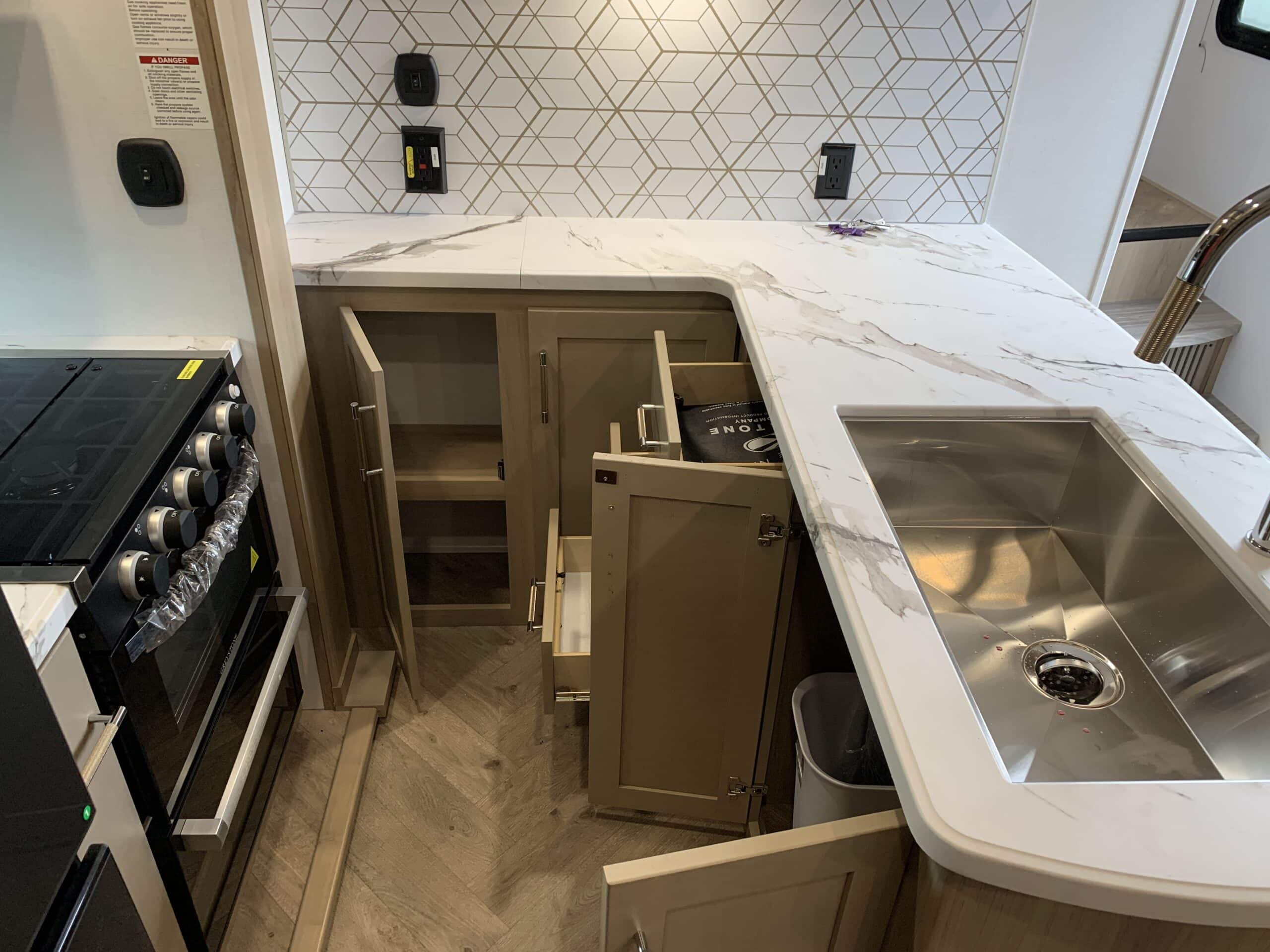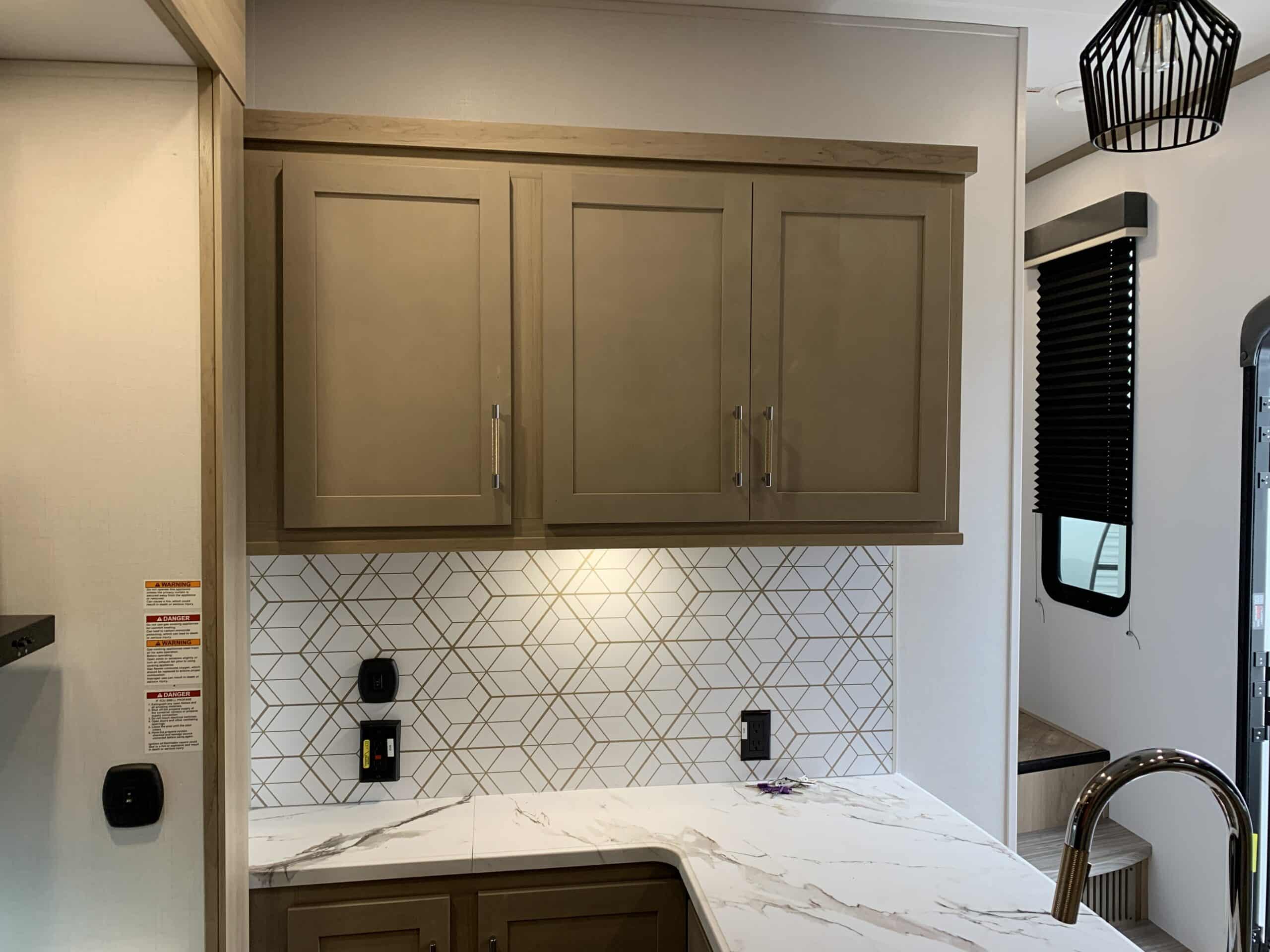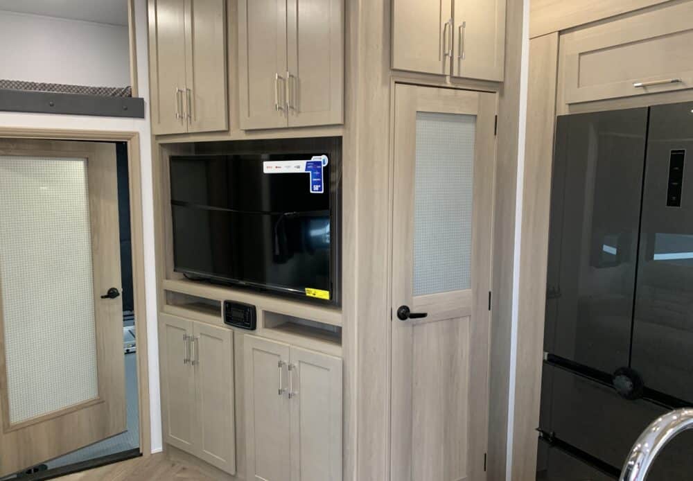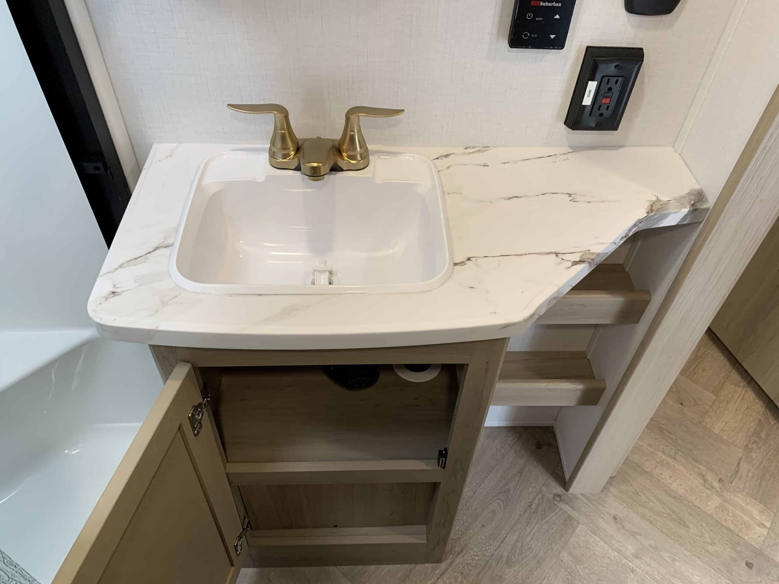 D’abord cette roulotte a un garage fermé de 13 pieds. Grâce à son auvent de 15 pieds et sa douche, vous profiterez de l’extérieur sans soucis. Ensuite, elle est muni d’une prise 50 ampères pour une meilleure qualité de courant ainsi qu’un panneau solaire.