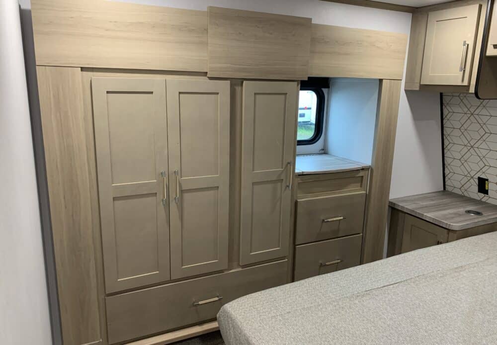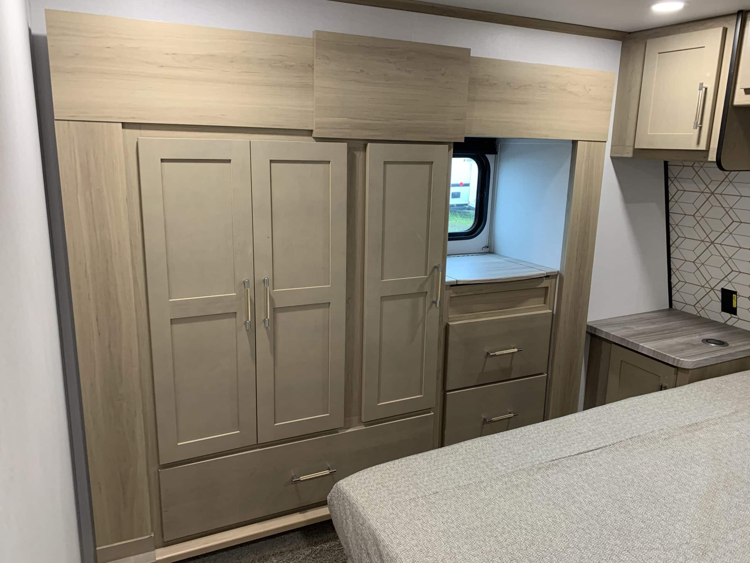 Dans la chambre fermée, il y a un lit king, un grand garde-robe avec tiroirs et vanité pour madame.