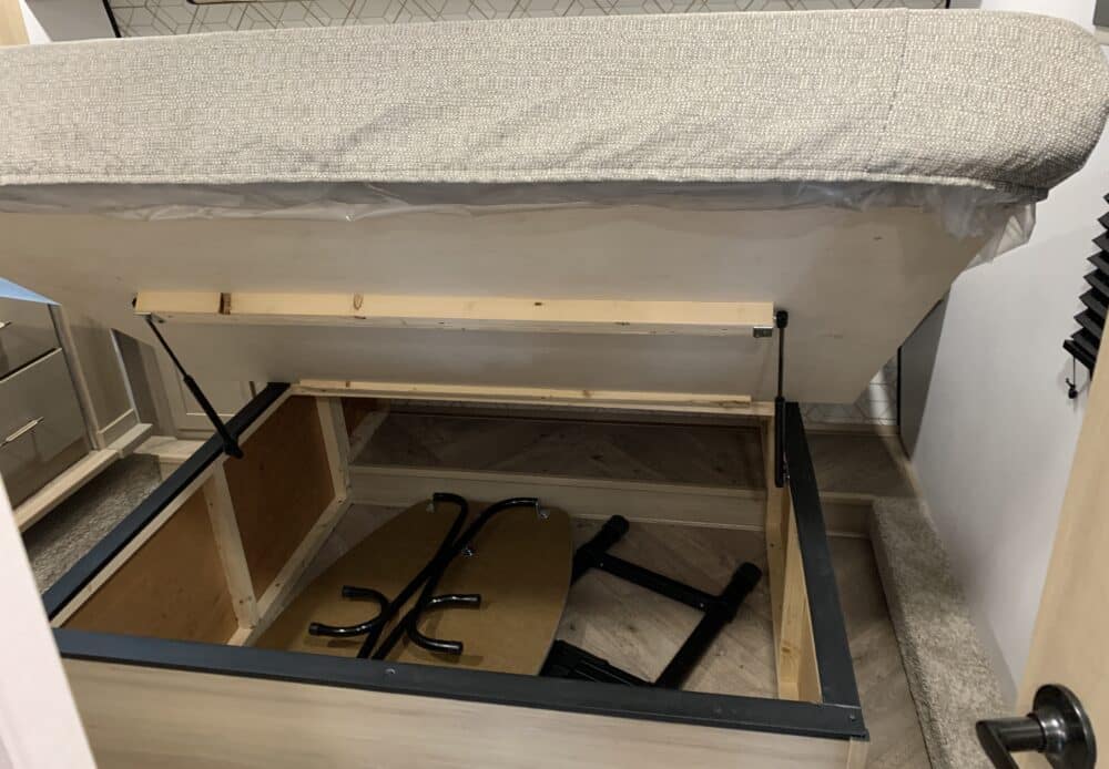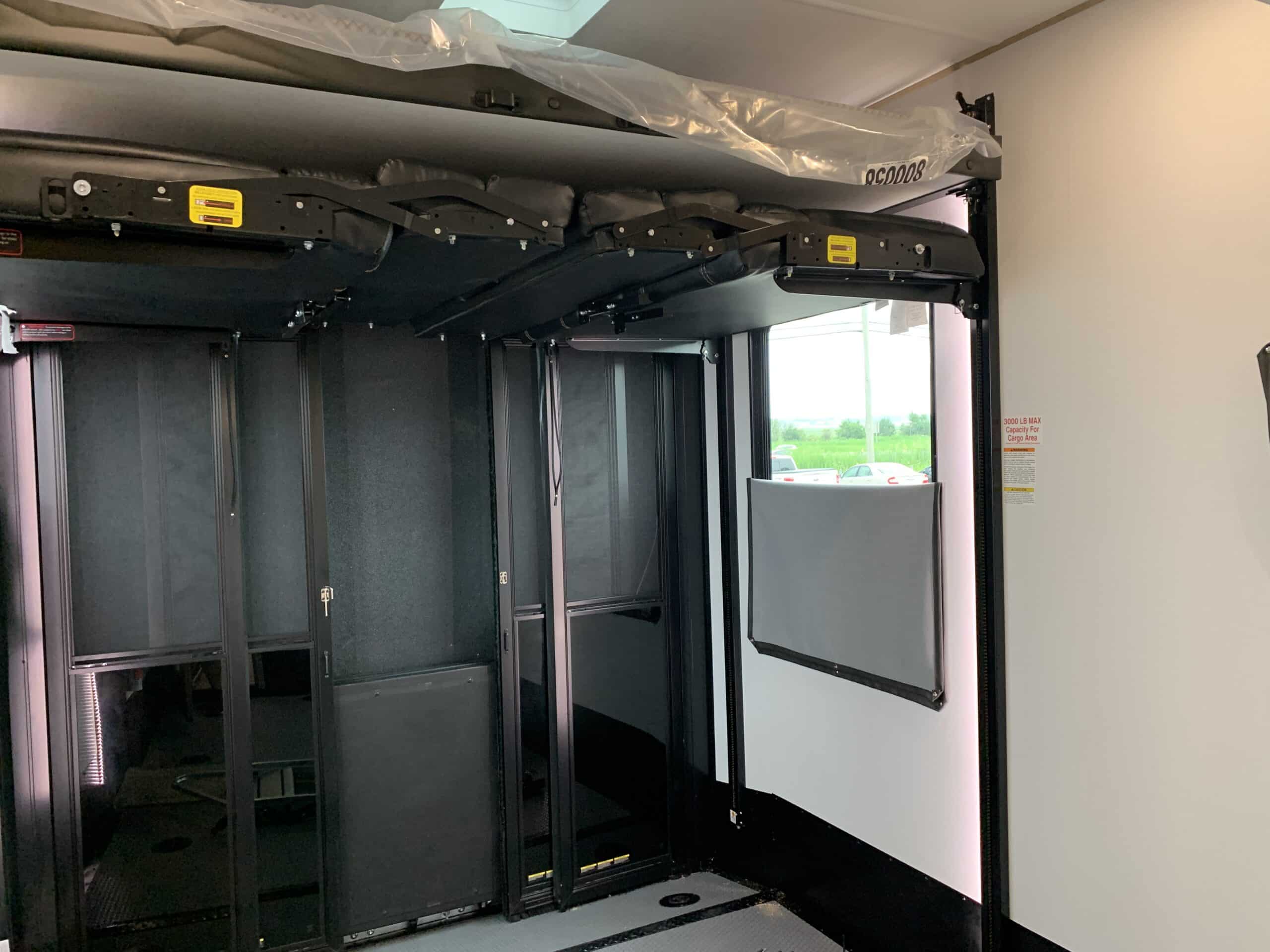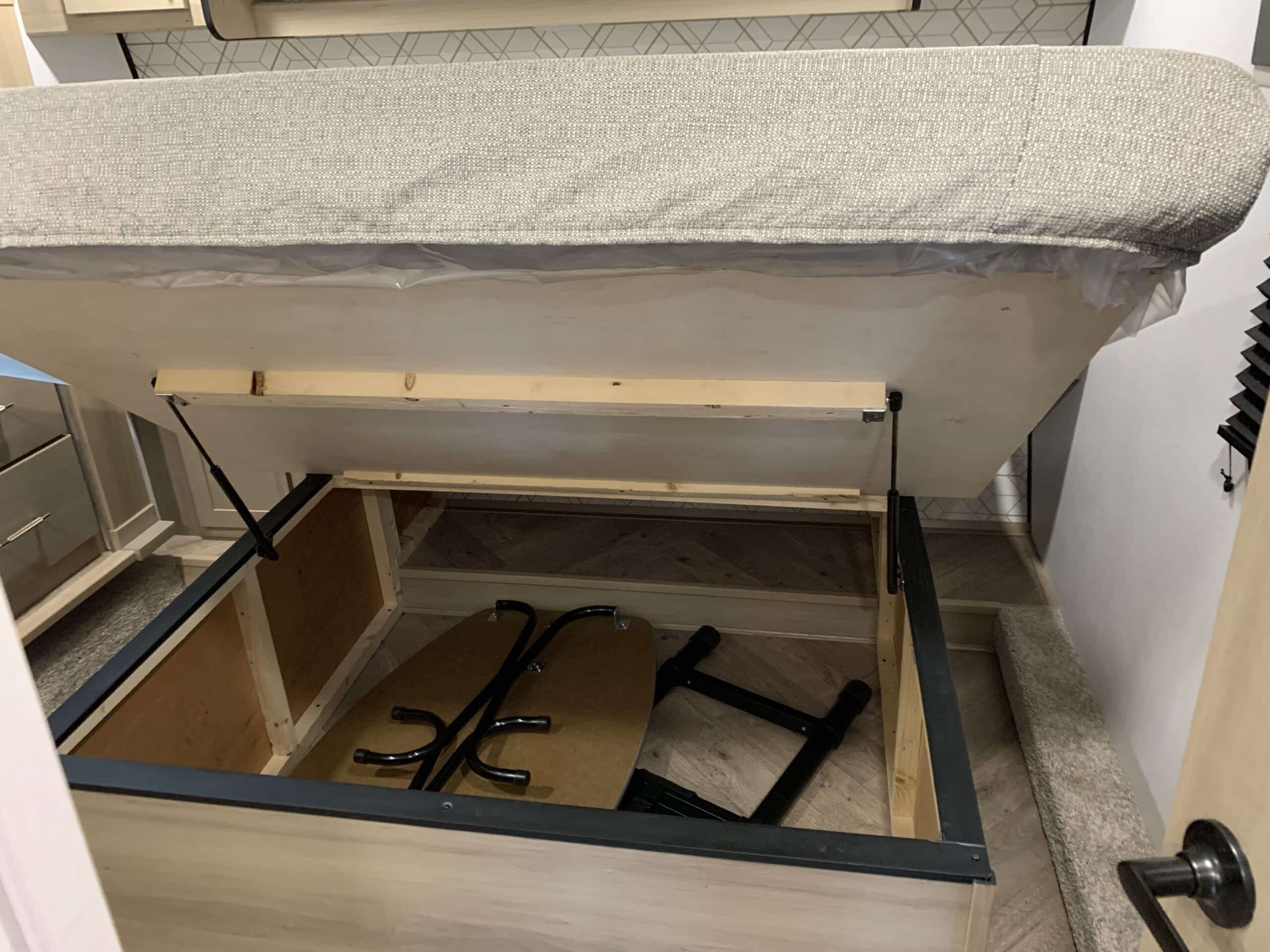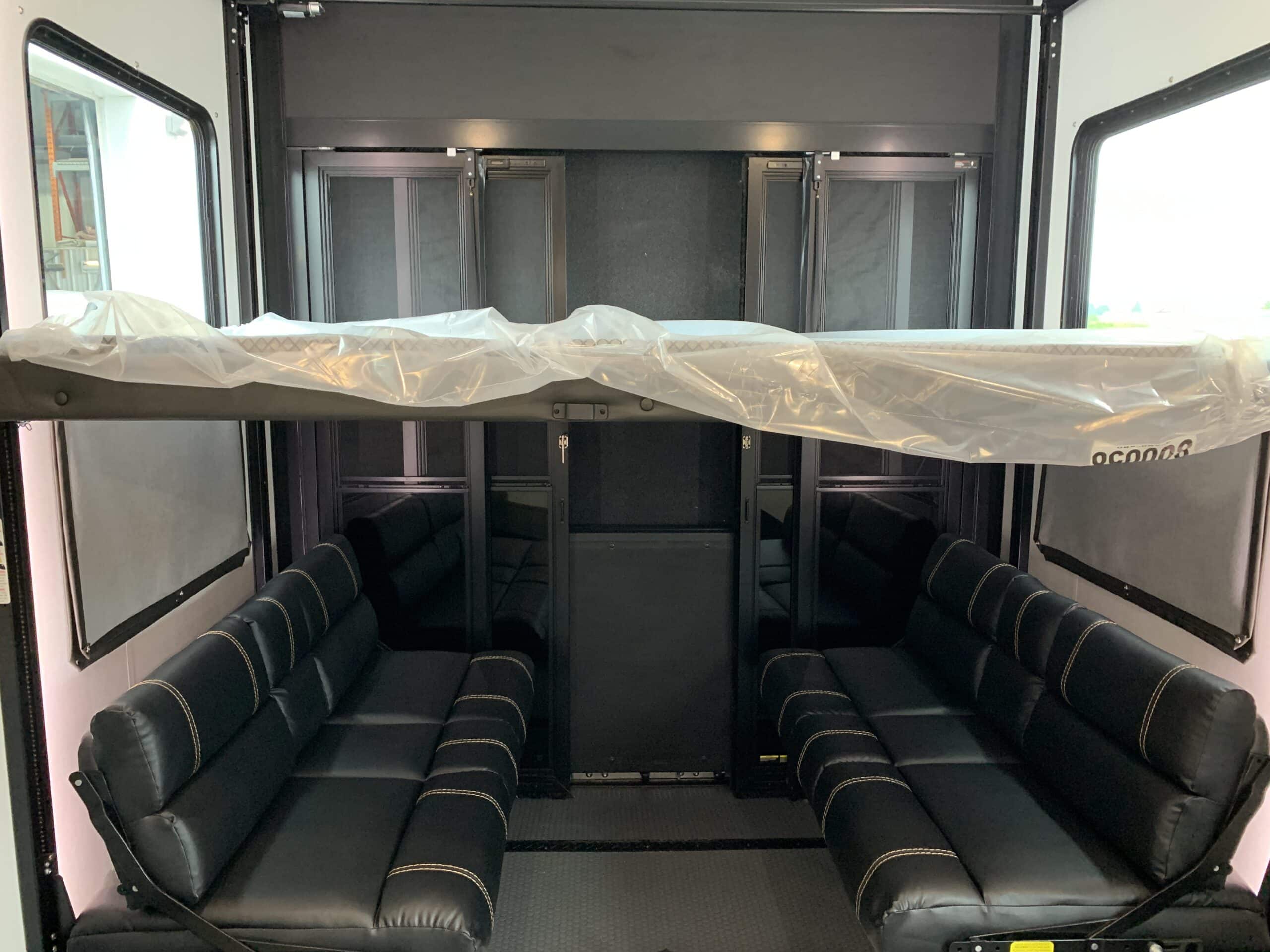 Dans le garage, il y a un lit superposé motorisé et 2 sofas, une salle d’eau et l’entrée pour laveuse/sécheuse.