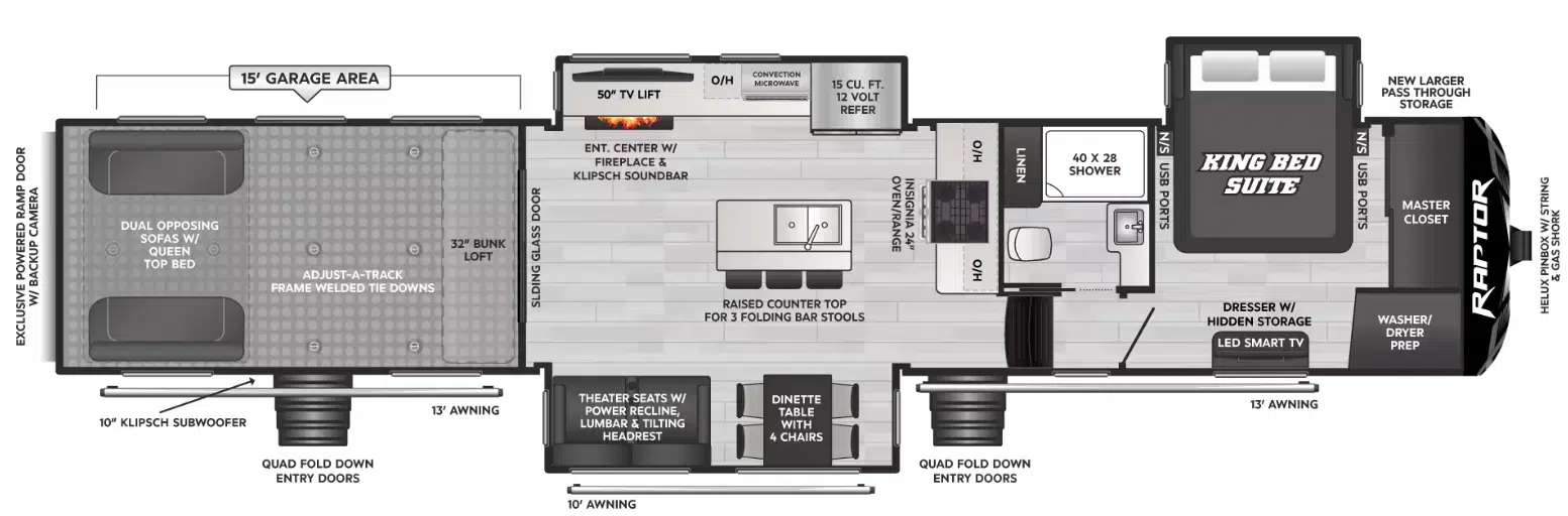 De plus, la Raptor 430 a 3 airs climatisés qui tempéreront l’ambiance désirée. Par ailleurs, la cuisine a un poêle avec dessus en verre, un frigo 12 volts et un micro-ondes. Aussi une causeuse inclinable et une table et chaises. Enfin, son système audio vous permettra d’écouter votre musique préférée.