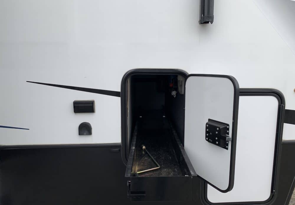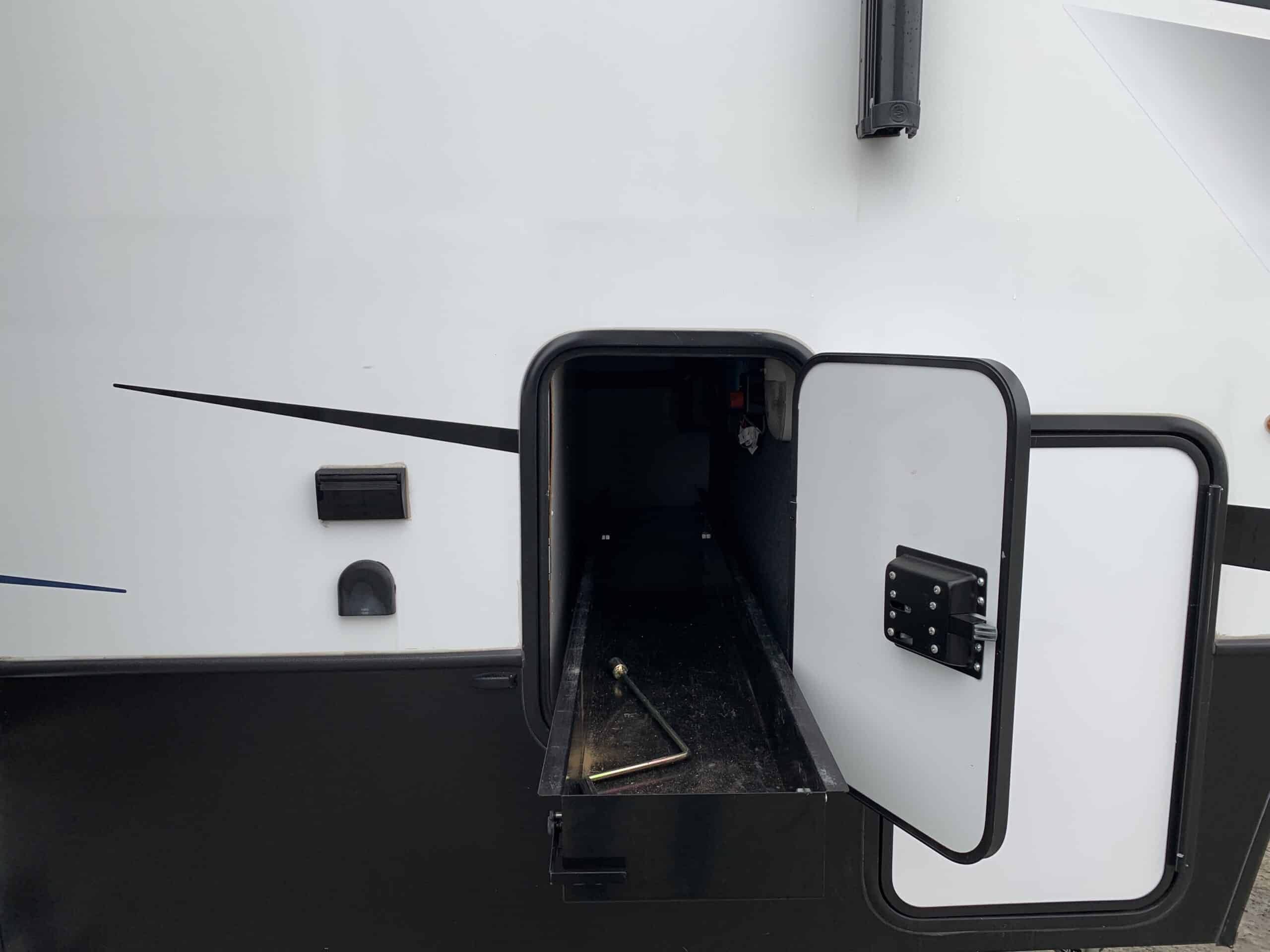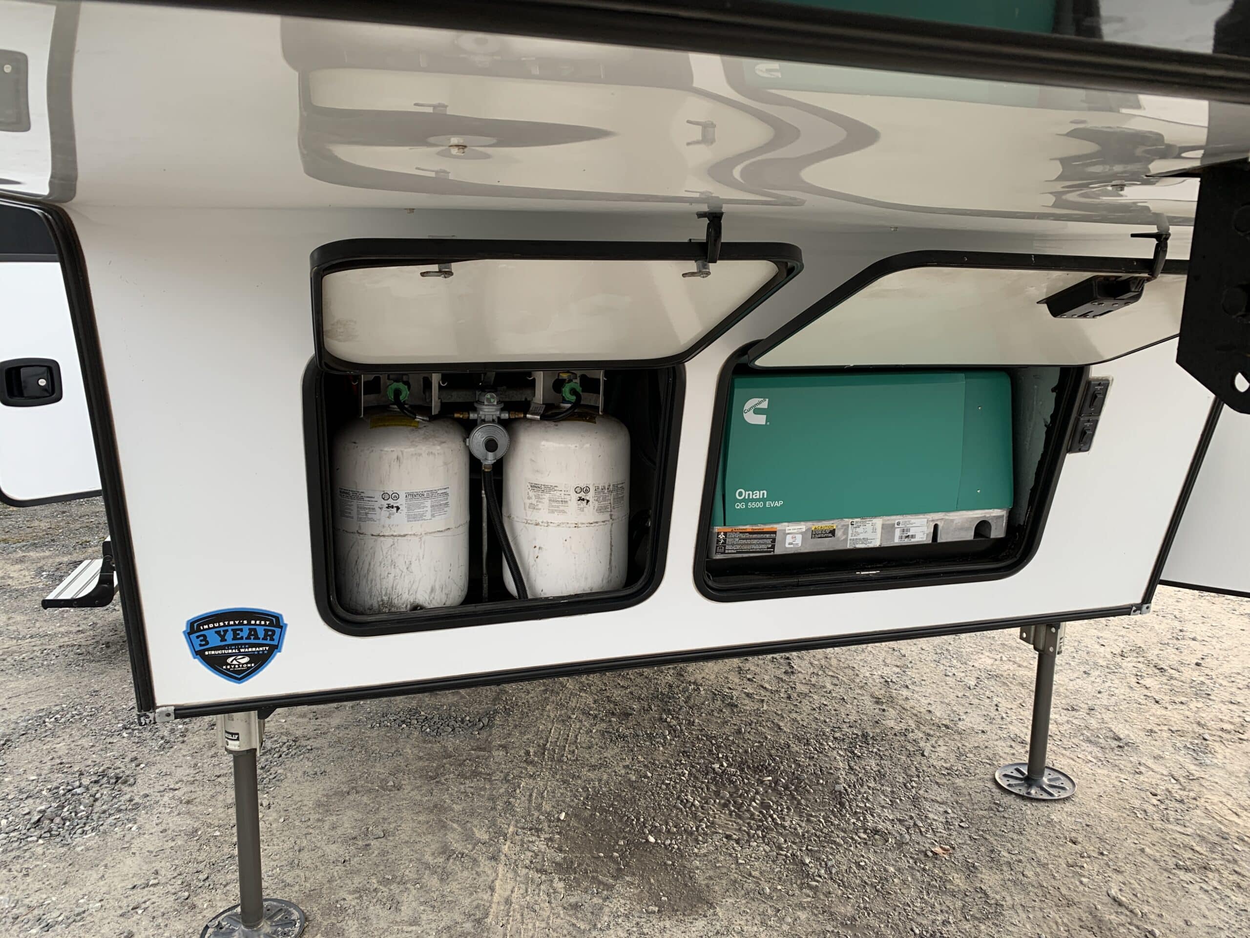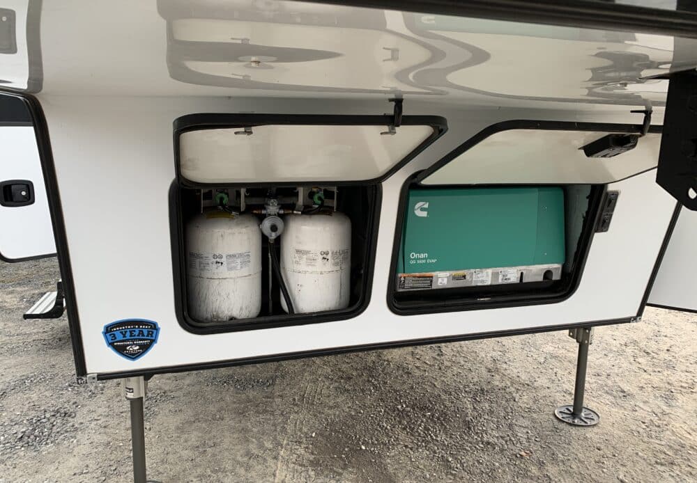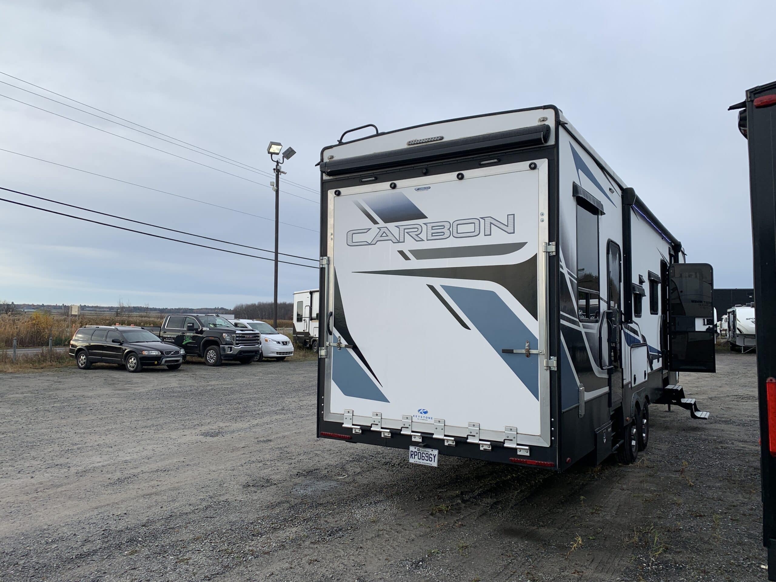 D’abord cette roulotte a un garage fermé de 10 pieds. Grâce à son auvent de 18 pieds, sa douche et son frigo vous profiterez de l’extérieur sans soucis. Elle est muni d’une prise 50 ampère, un panneau solaire et une génératrice Onan 5.5.