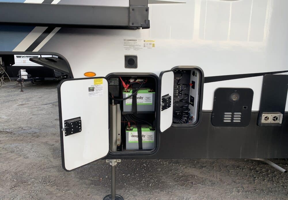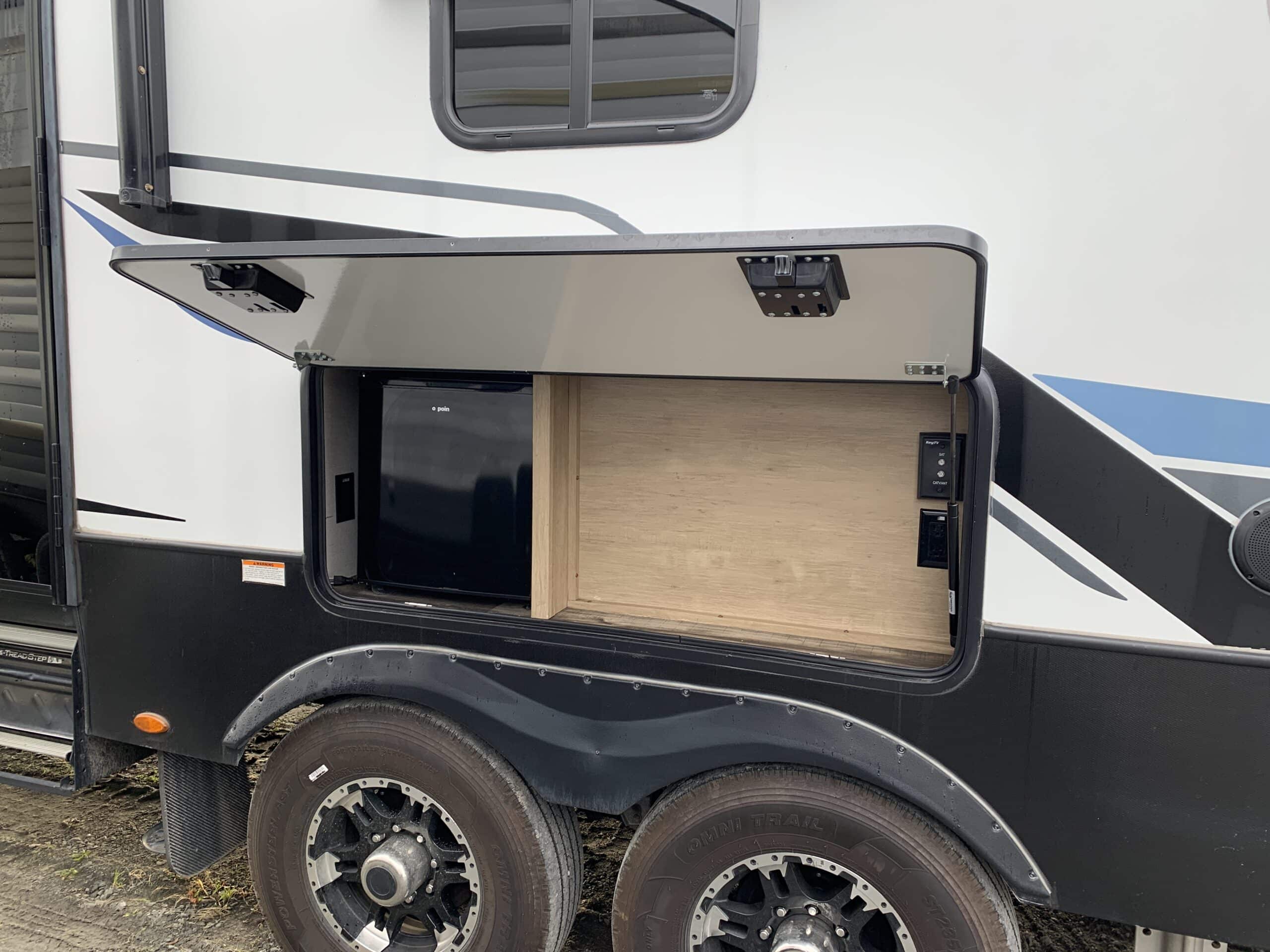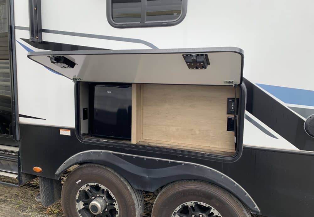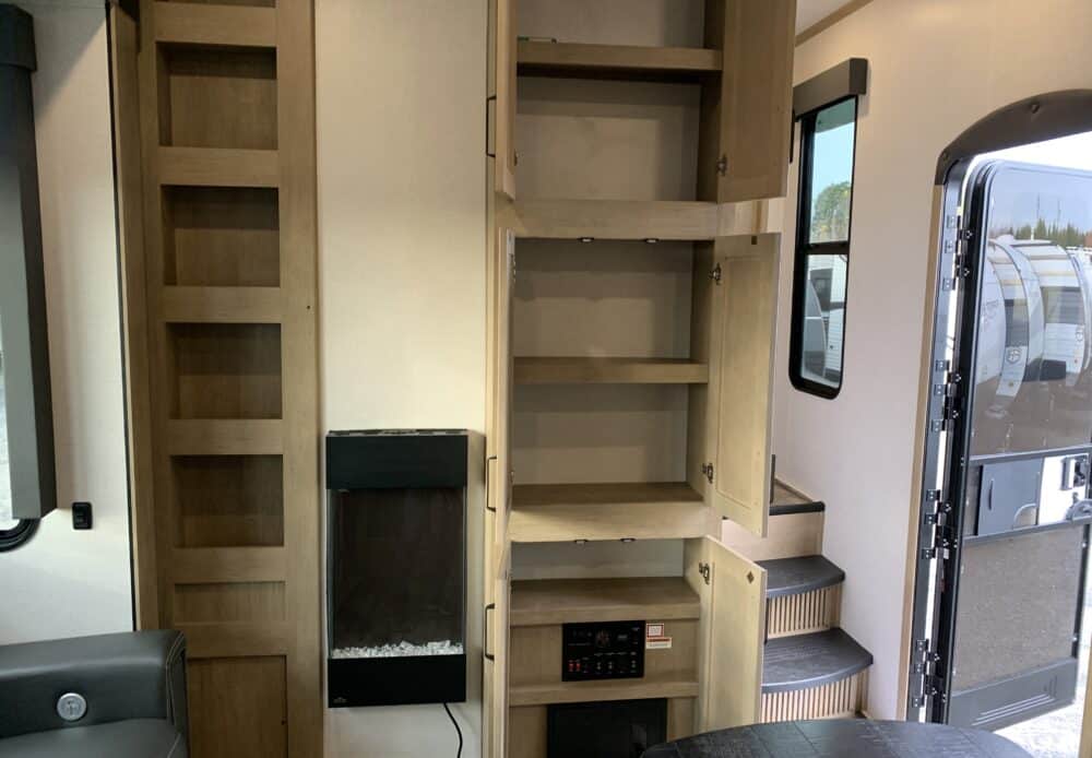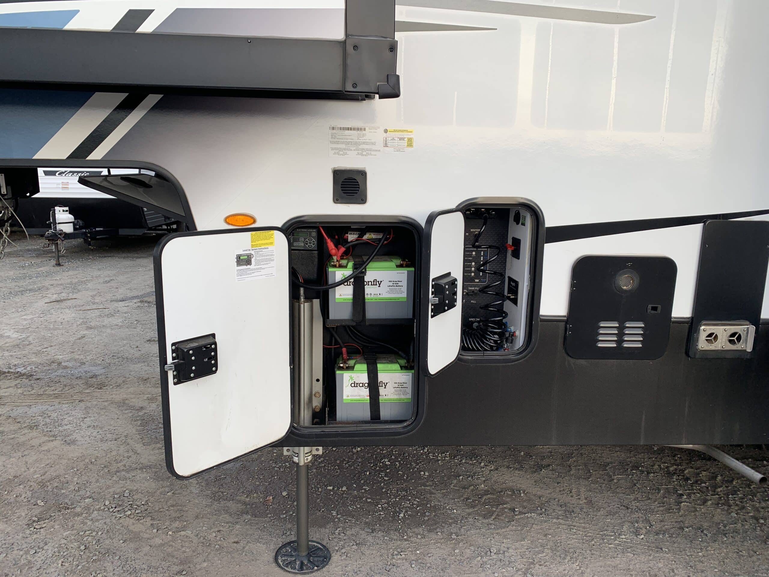 D’abord cette roulotte a un garage fermé de 10 pieds. Grâce à son auvent de 18 pieds, sa douche et son frigo vous profiterez de l’extérieur sans soucis. Elle est muni d’une prise 50 ampère, un panneau solaire et une génératrice Onan 5.5.