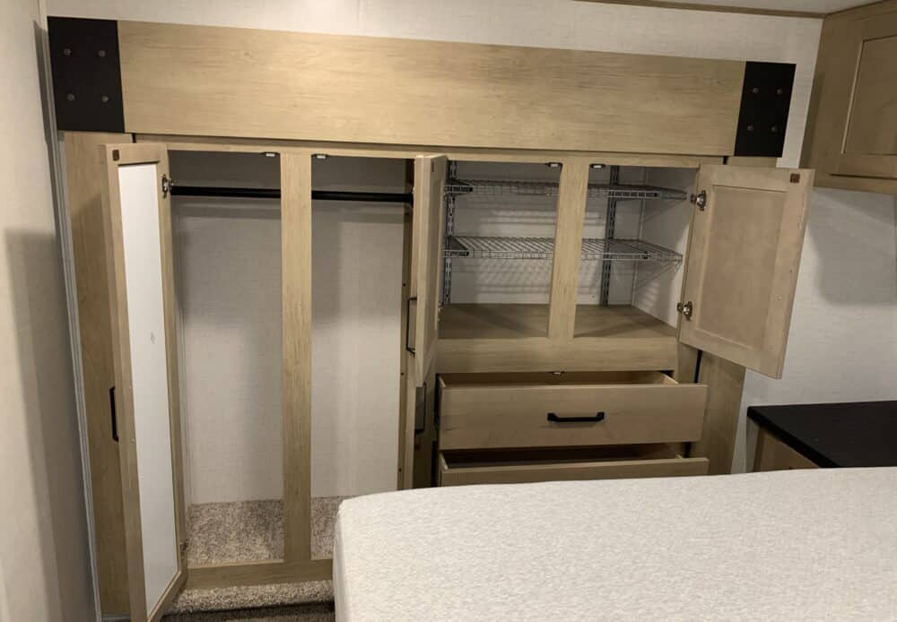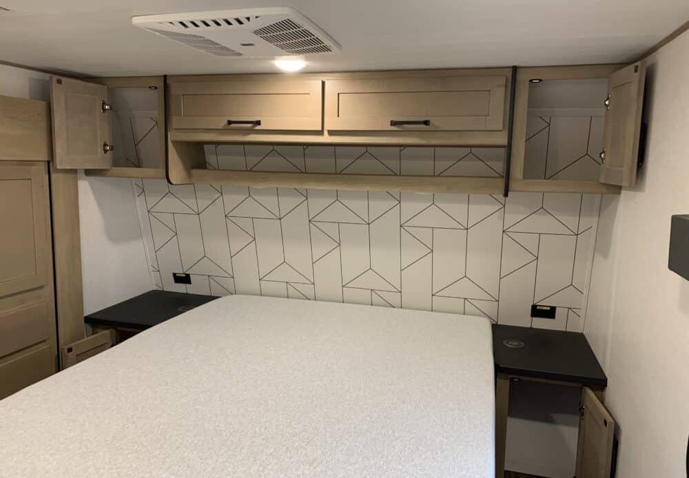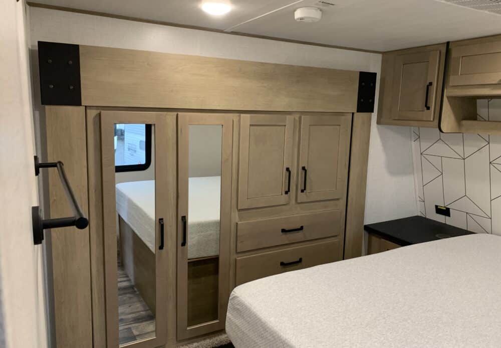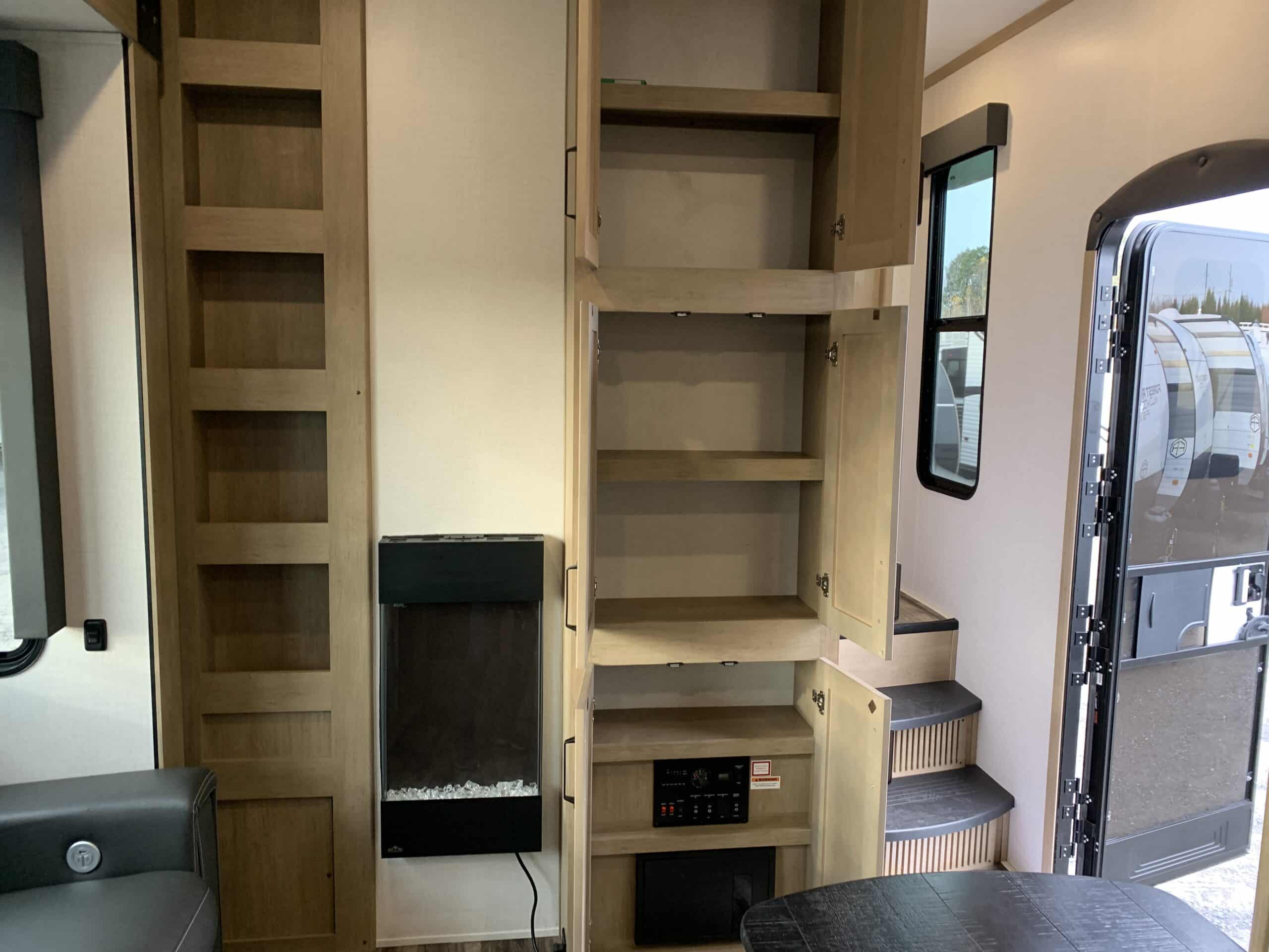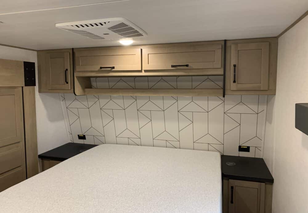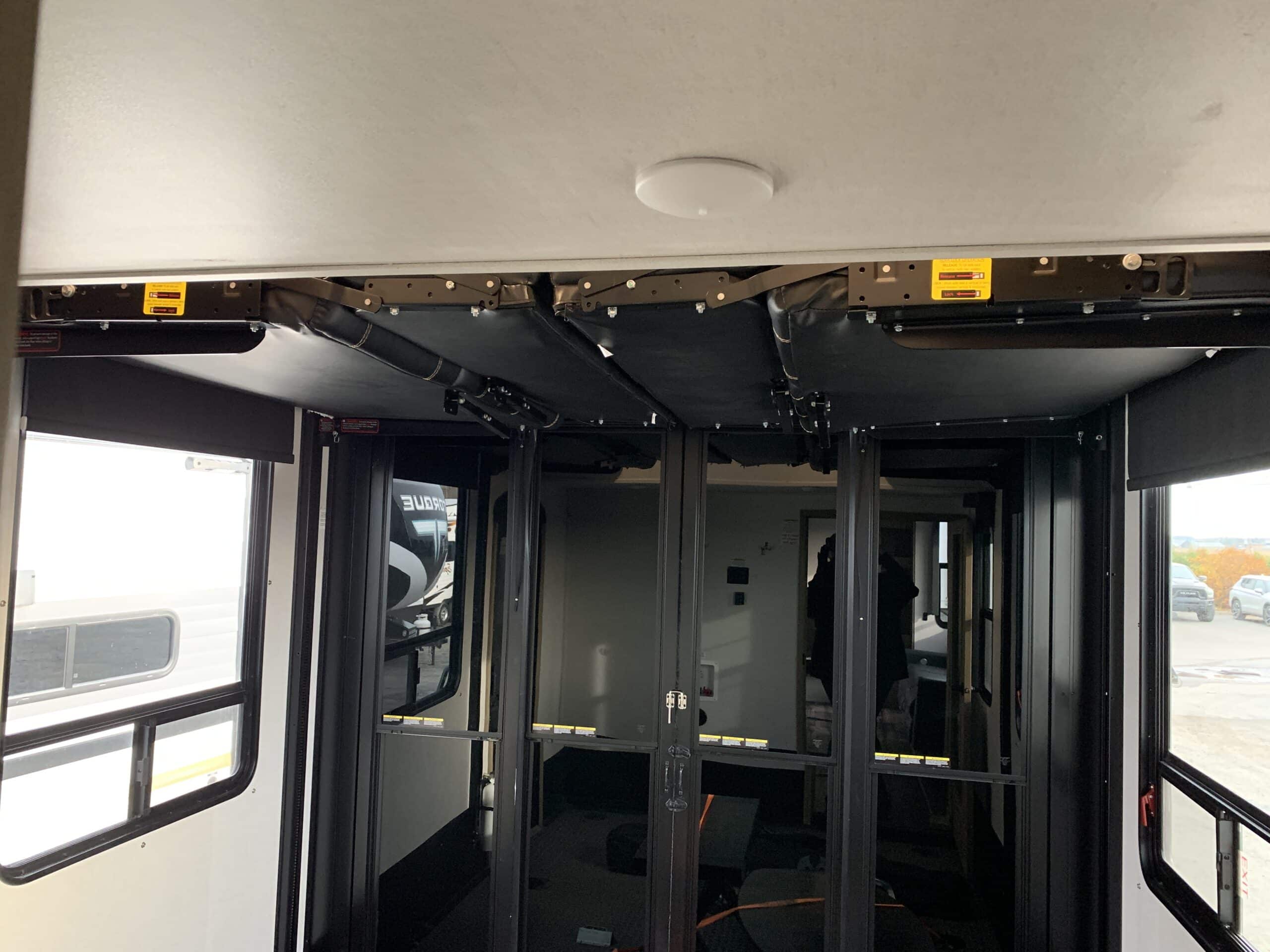 D’abord cette roulotte a un garage fermé de 10 pieds. Grâce à son auvent de 18 pieds, sa douche et son frigo vous profiterez de l’extérieur sans soucis. Elle est muni d’une prise 50 ampère, un panneau solaire et une génératrice Onan 5.5.