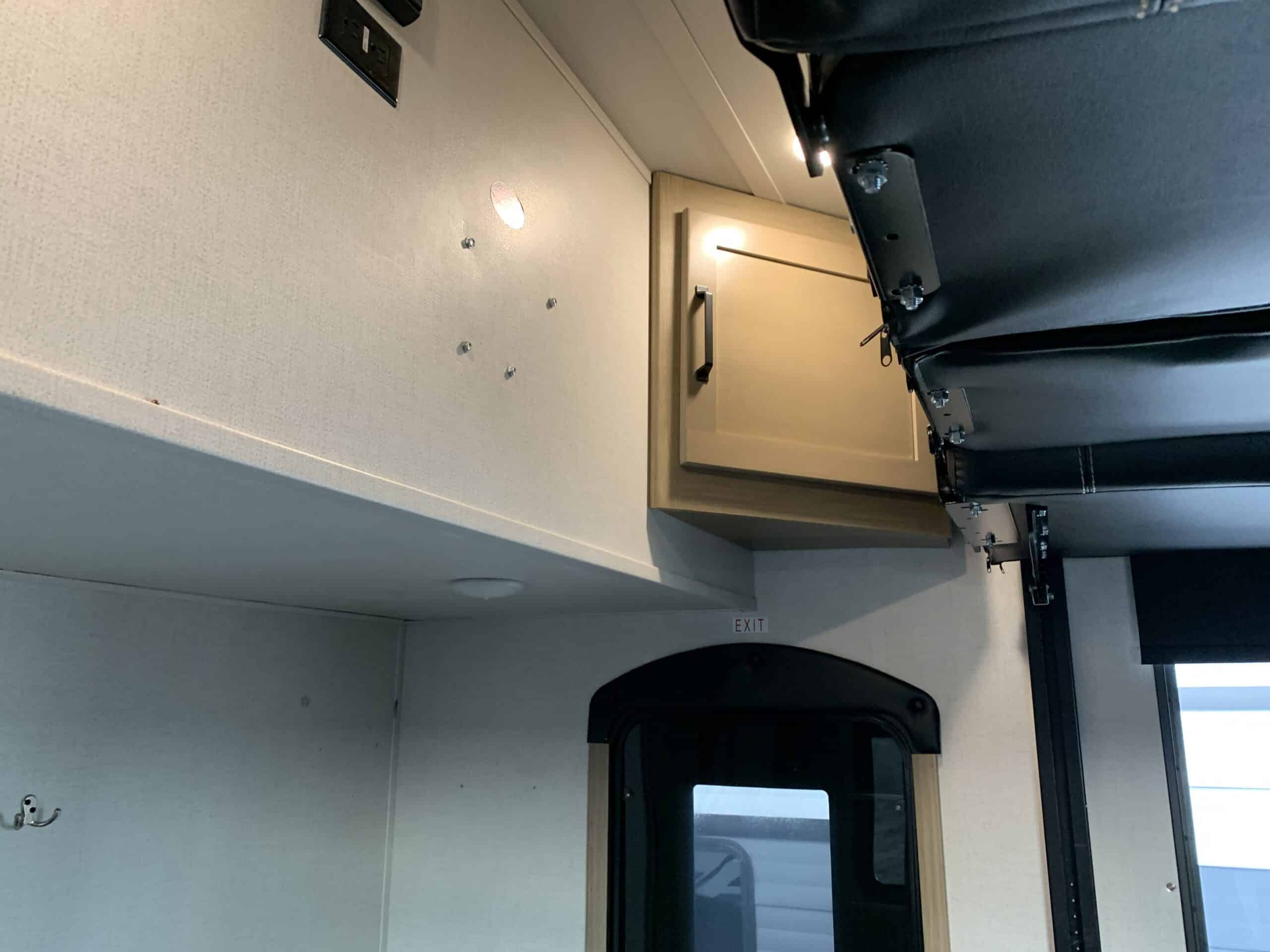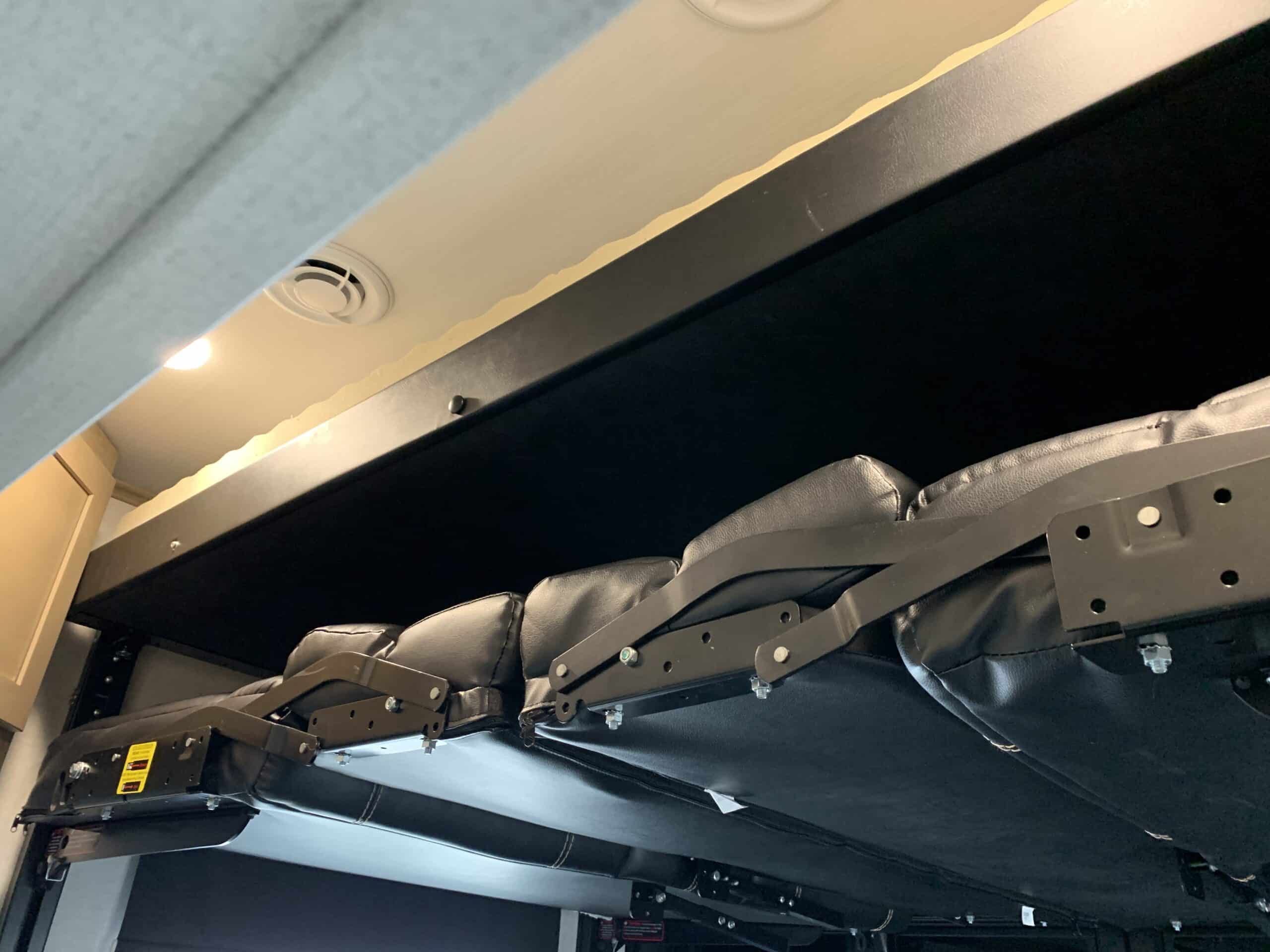 Dans le garage, il y a un lit superposé motorisé et 2 sofas et l’entrée pour laveuse/sécheuse.
