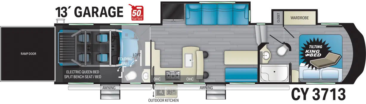 De plus, la Cyclone 3713a 2 airs climatisés qui tempéreront l’ambiance désirée. Par ailleurs, la cuisine a un poêle, un frigo et un micro-ondes à convection. Aussi un sofa inclinable à 4 places et une table avec banquette. Enfin, son système audio vous permettra d’écouter votre musique préférée.