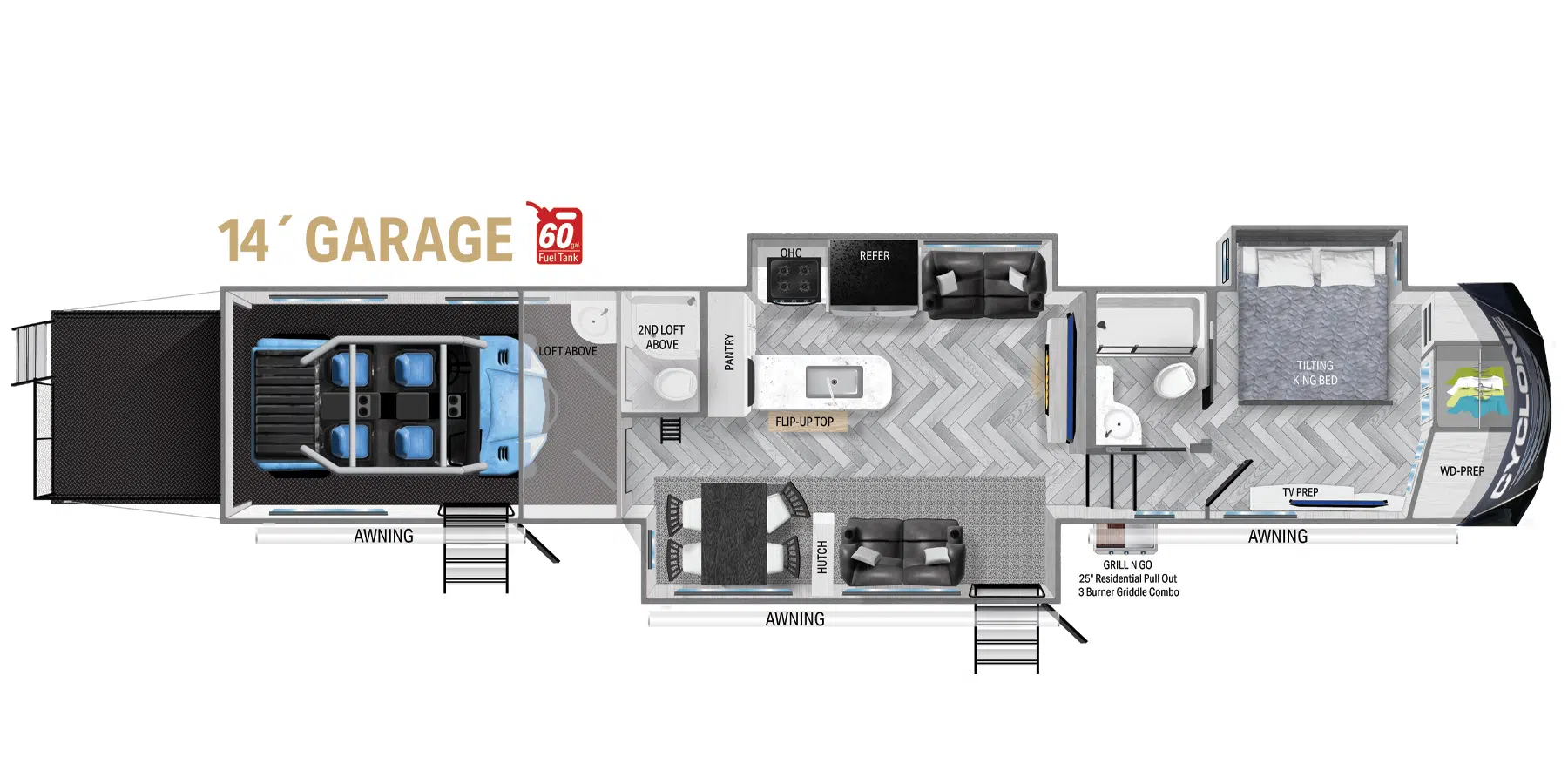 De plus la Cyclone 4014C a 2 airs climatisés qui tempéreront l’ambiance désirée. Par ailleurs, la cuisine a un poêle, un micro-ondes à convection, un réfrigérateur 20p.c. 12 volts.et une table et chaises pour le coin repas. Grâce à 2 causeuses inclinable, vous pourrez relaxer après une journée en plein-air. Enfin, son système audio vous permettra d’écouter votre musique préférée.