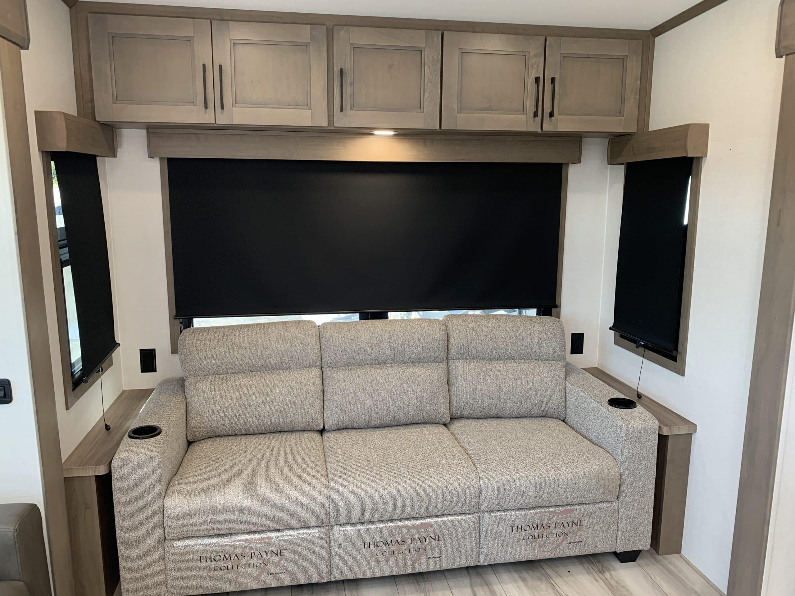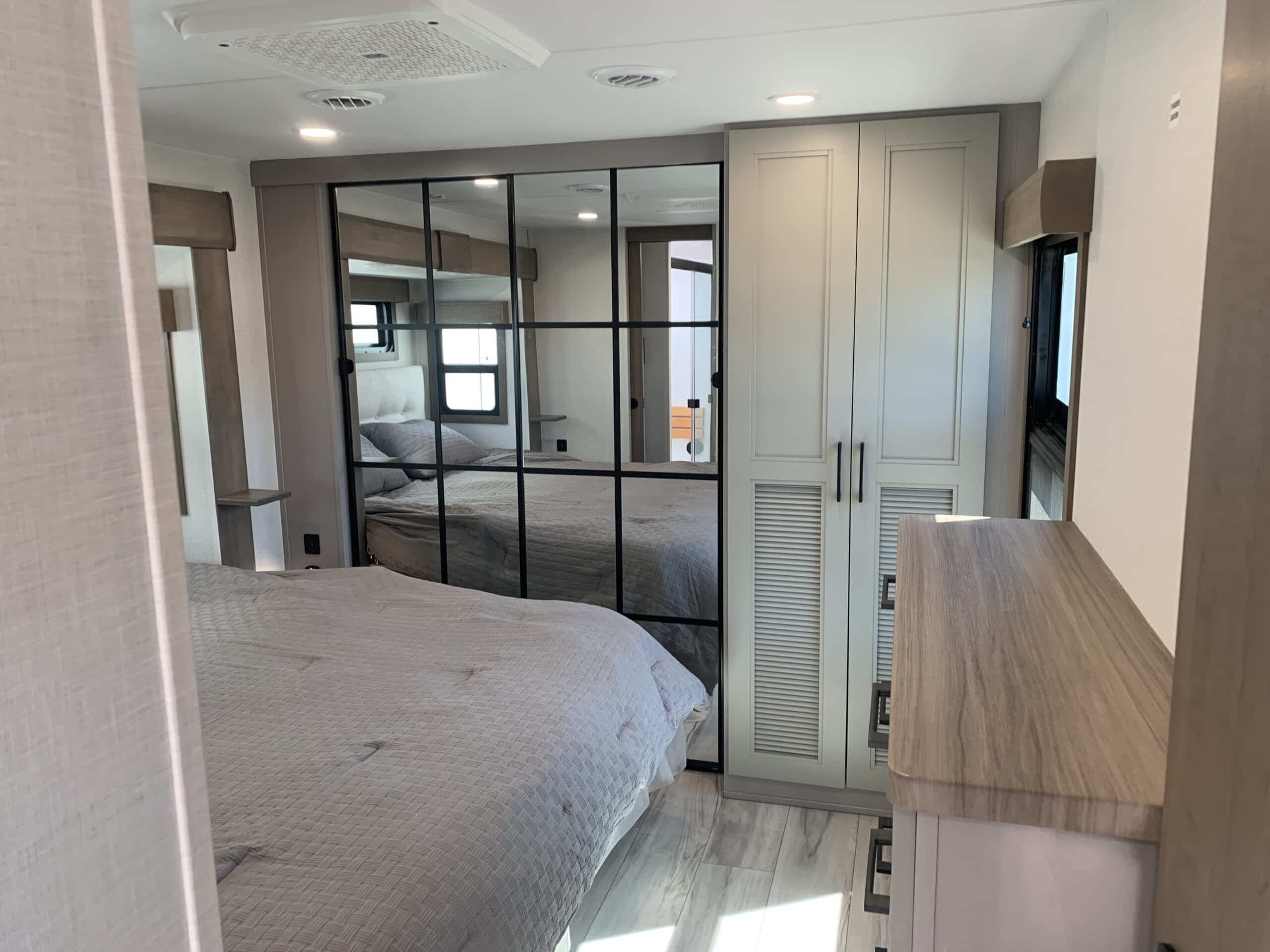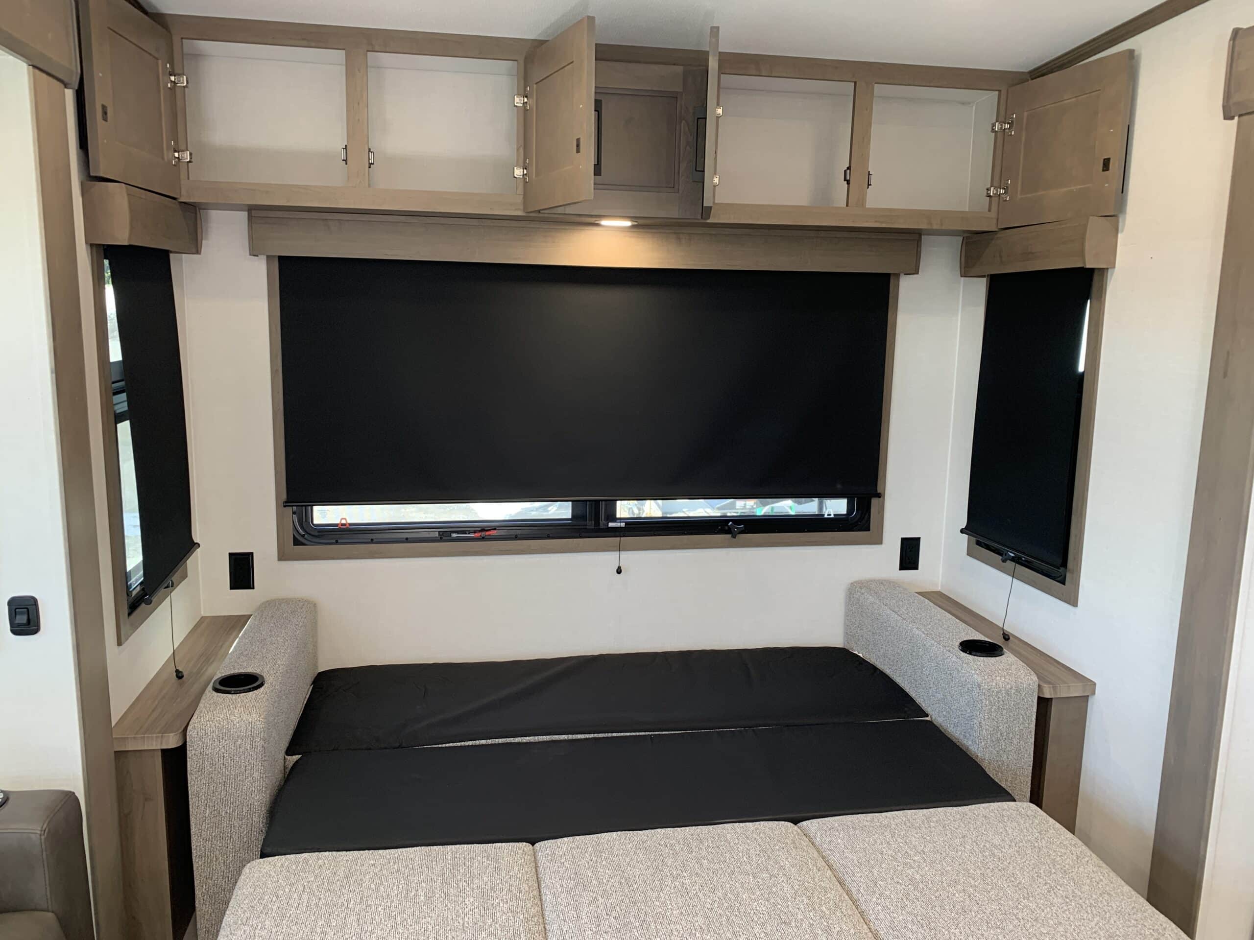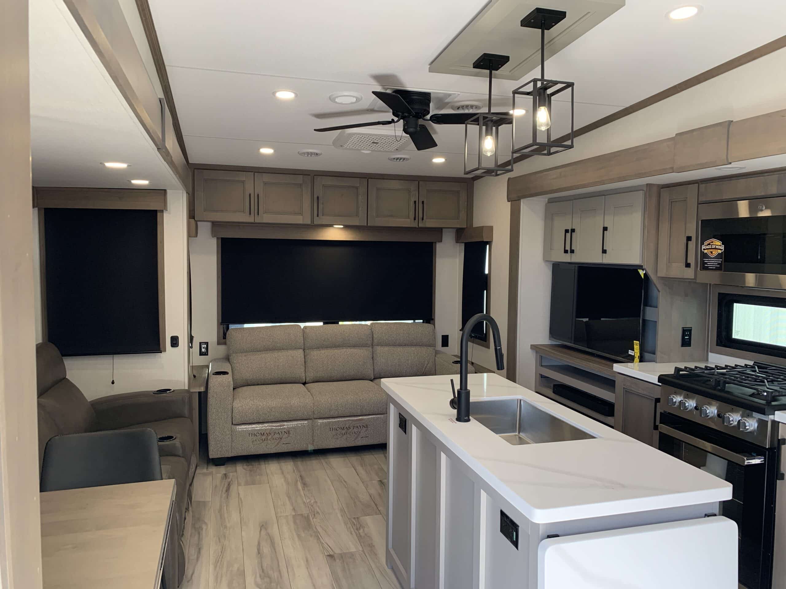 Dotée de trois extensions (slide-outs), elle offre un intérieur vaste et lumineux, idéal pour les longs séjours ou même une utilisation saisonnière.