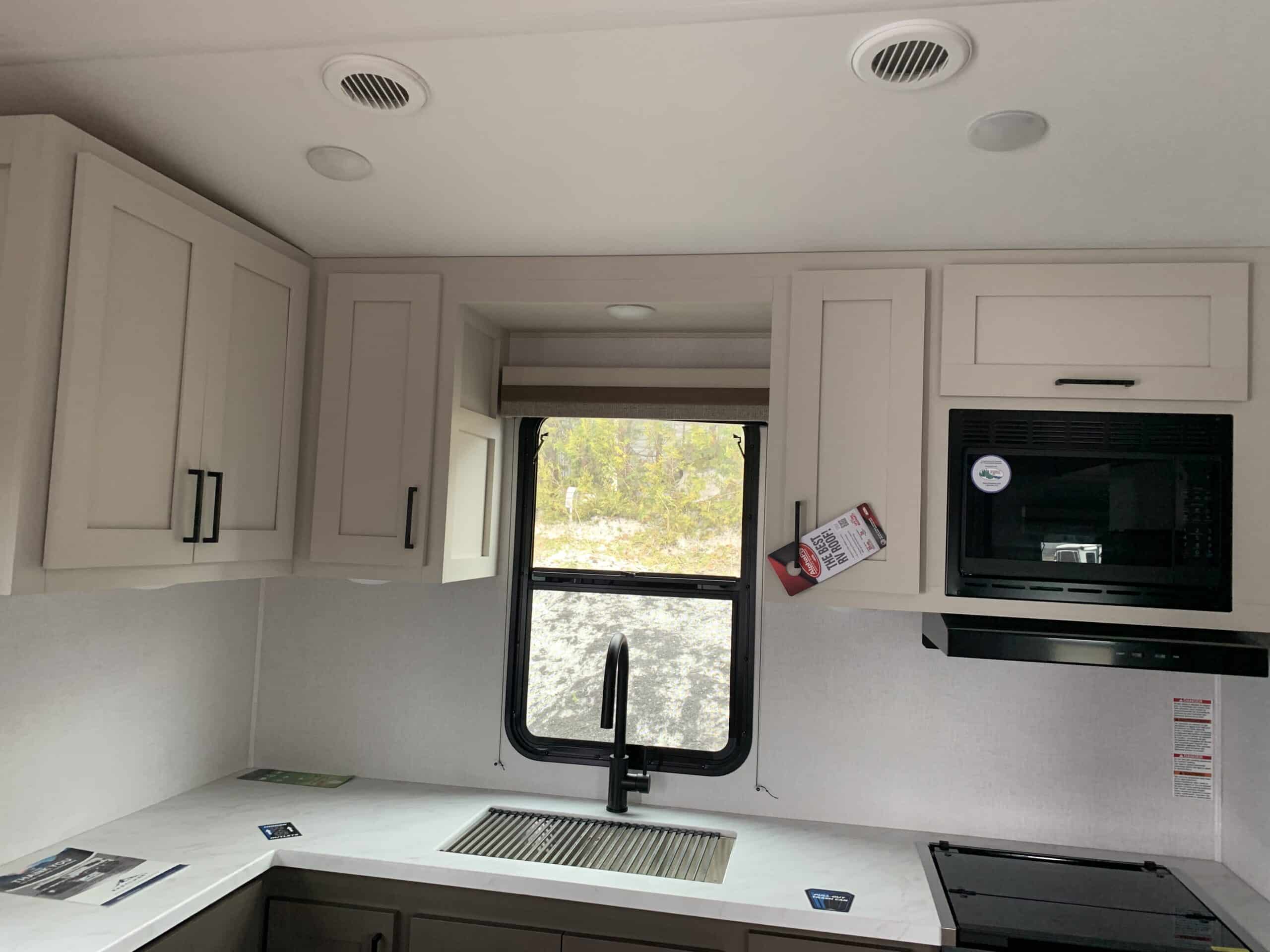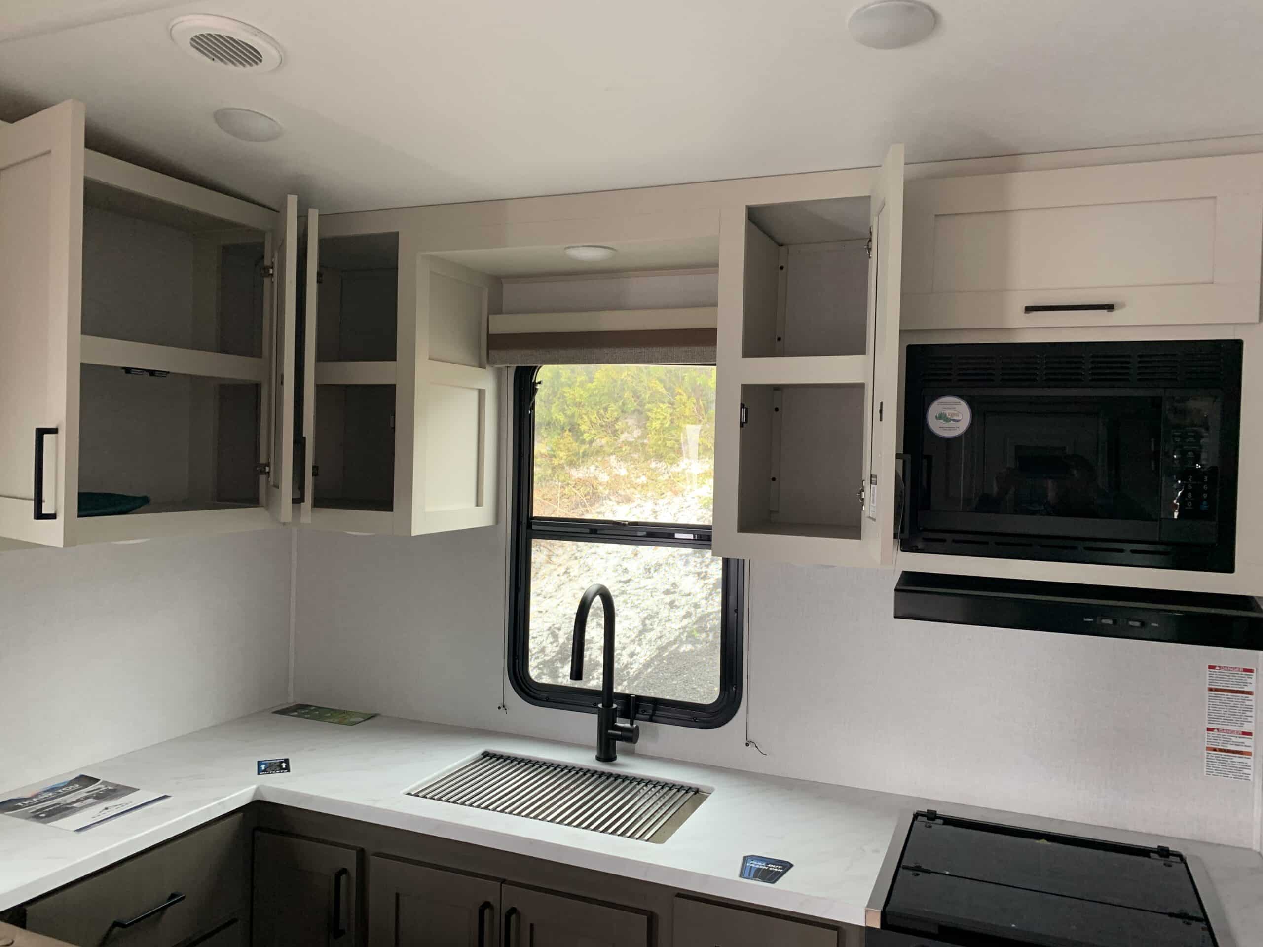 Cuisine arrière spacieuse avec grand comptoir en L, évier double, cuisinière 4 brûleurs et réfrigérateur 12V