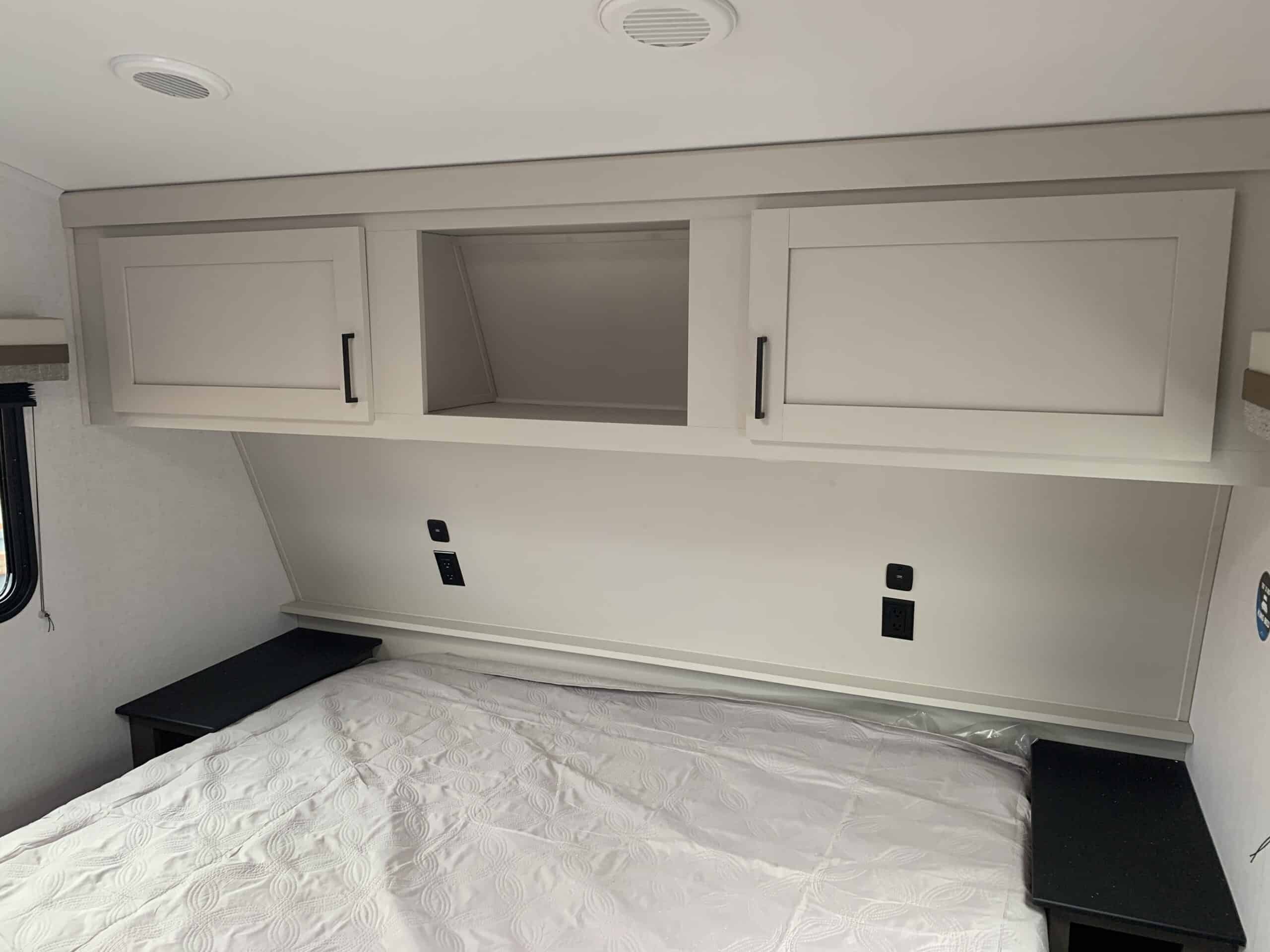 Chambre avant fermée avec lit king 70″ x 80″, rangements et prises USB