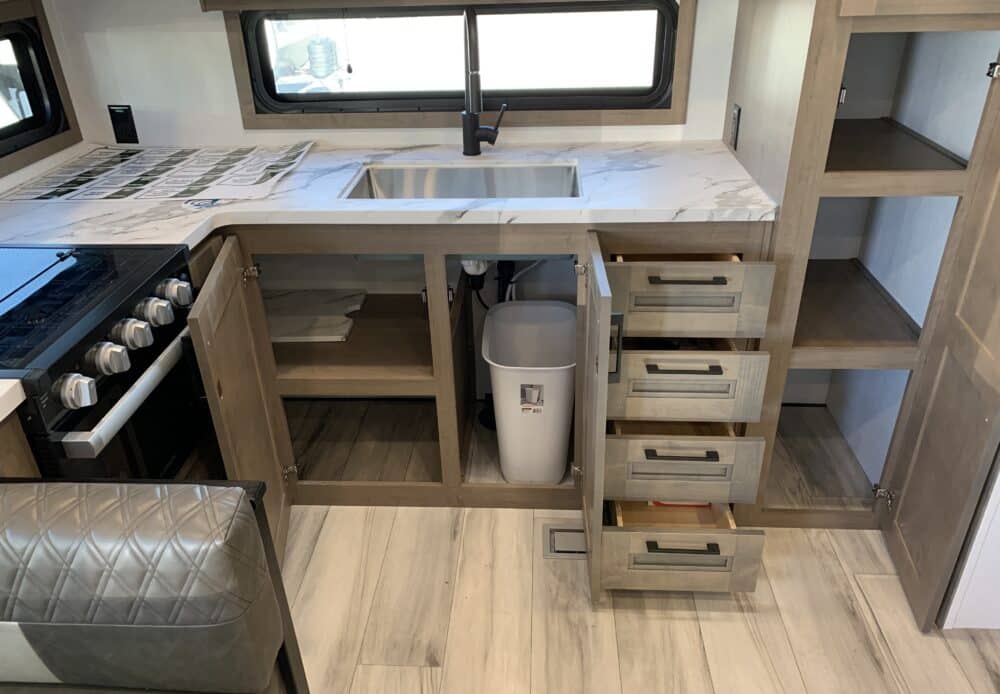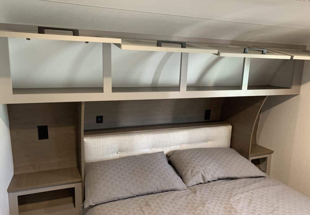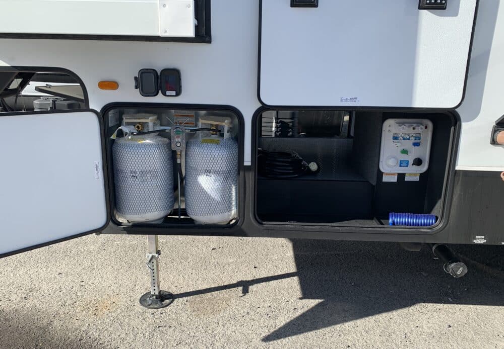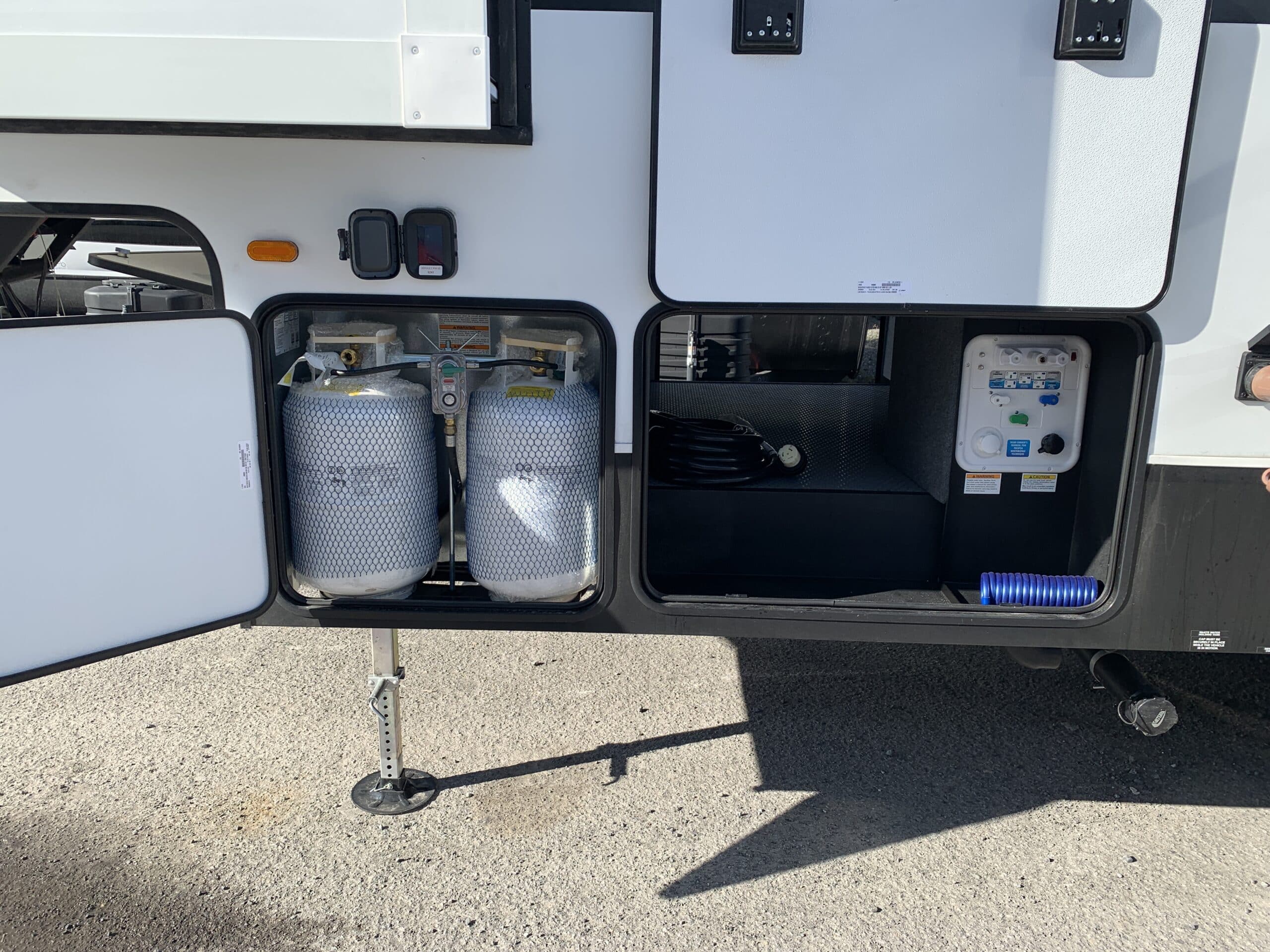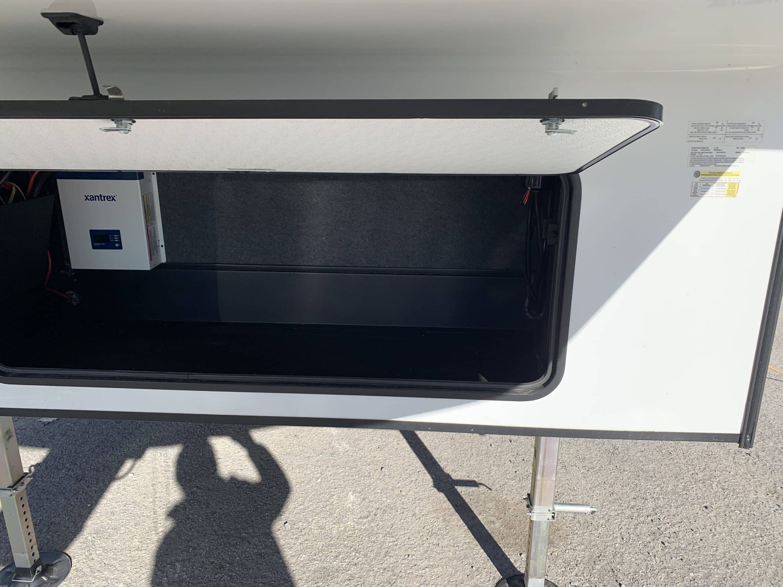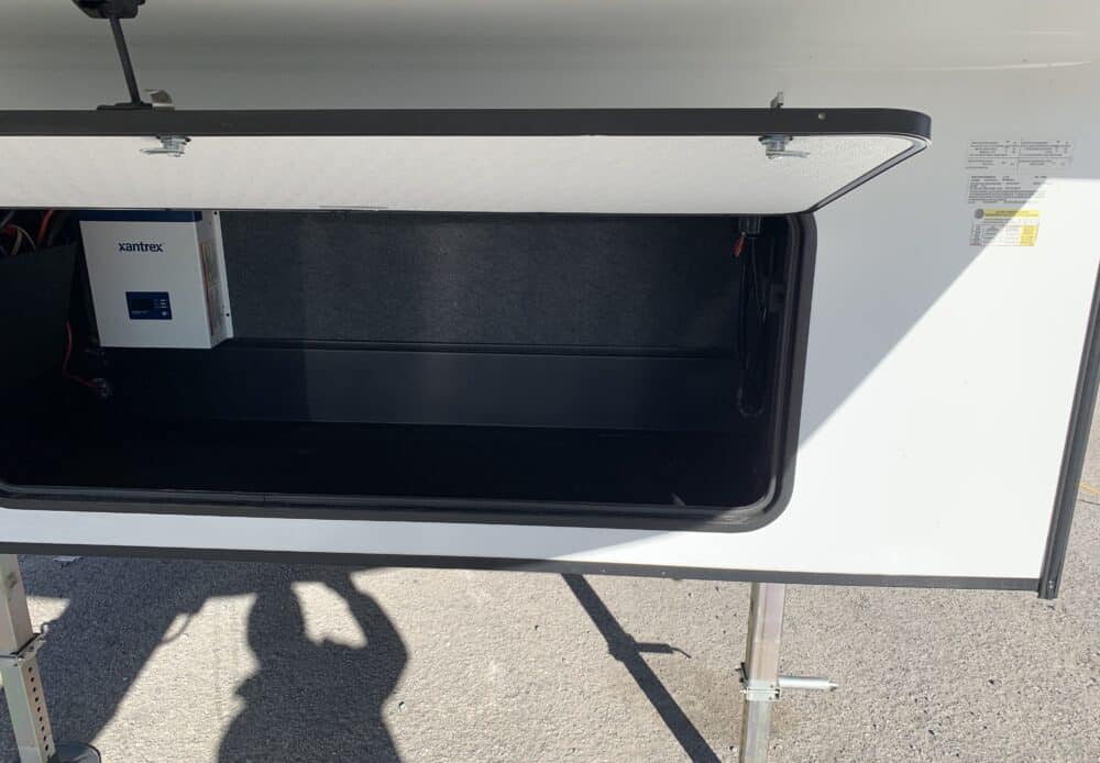 D’abord cette roulotte a un auvent de 16 pieds pour profiter de l’extérieur sans soucis. Puisque ses marches sont ajustables et très stables vous aurez un accès facile à l’intérieur. Elle est muni d’une échelle pour faciliter l’accès au toit. Elle a également une prise 50 ampères pour une meilleure qualité de courant. Les coffres ont également un bel espace de rangement.