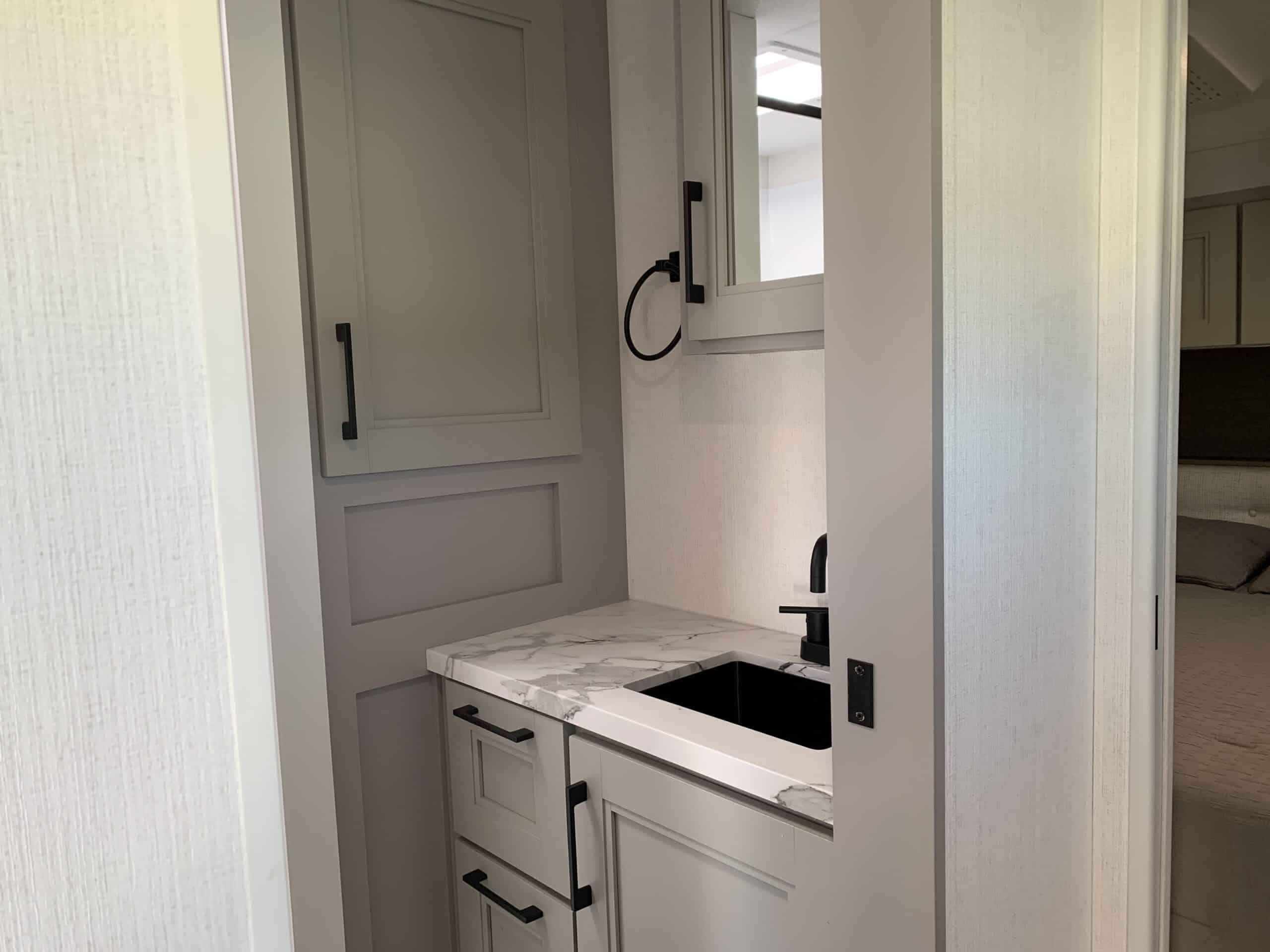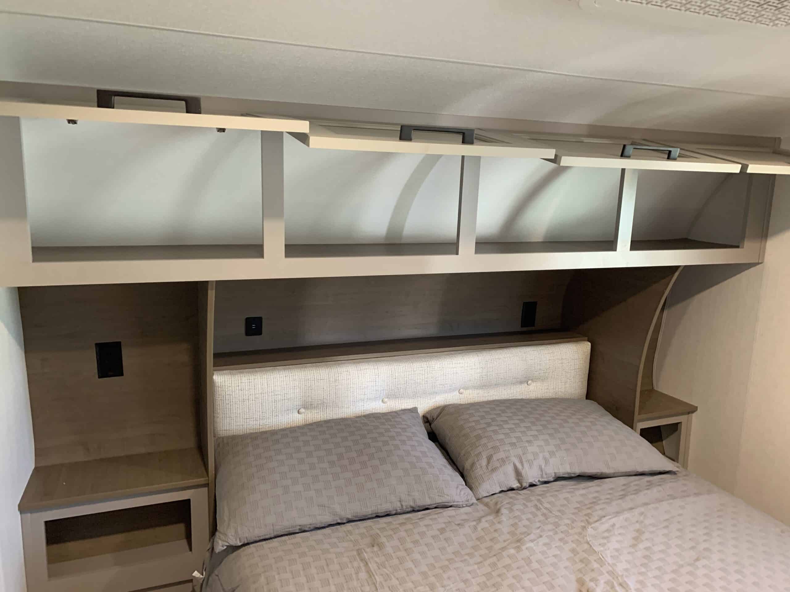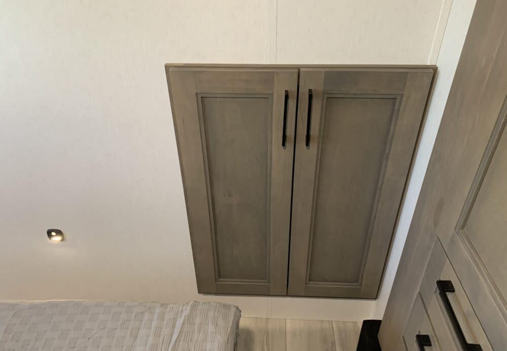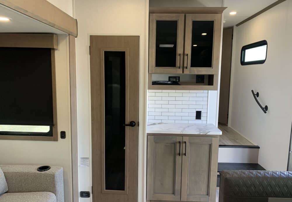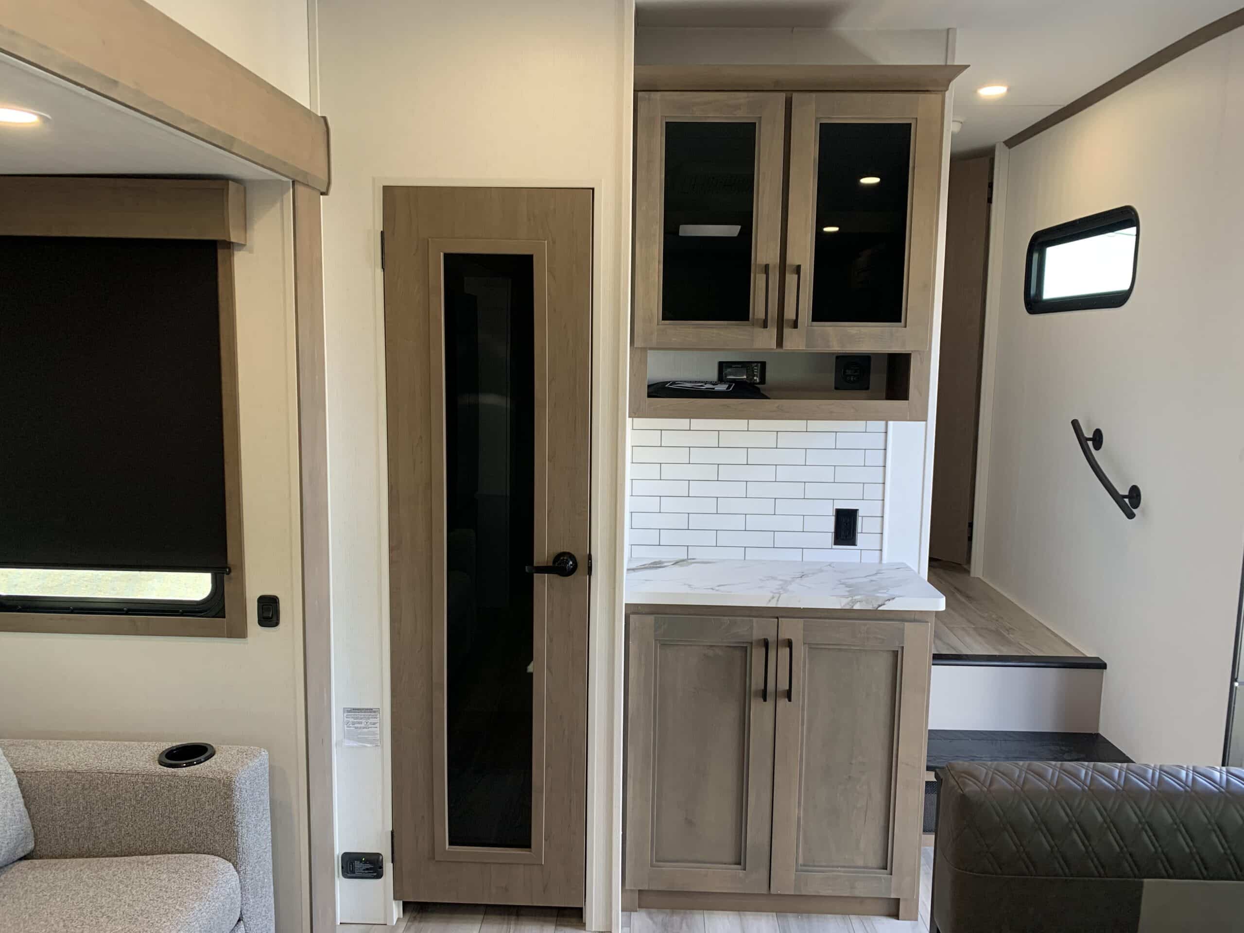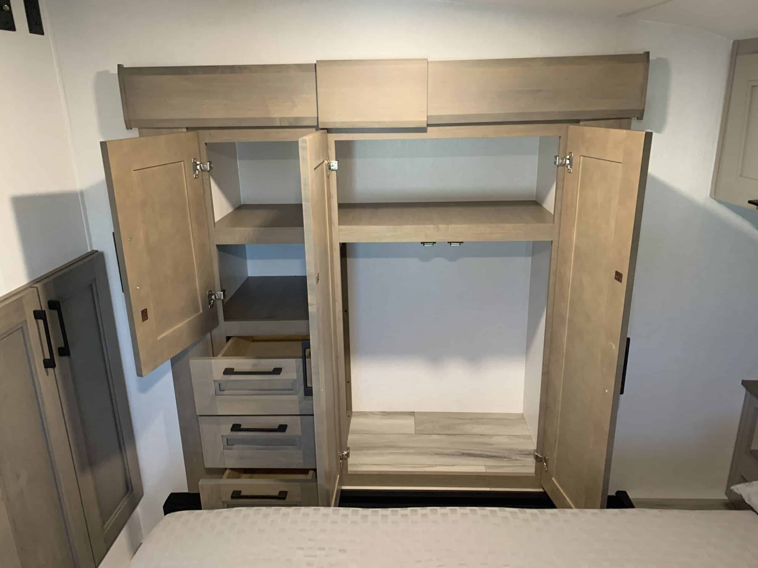 Cette roulotte est prête à recevoir une laveuse/sécheuse dans la chambre à coucher.