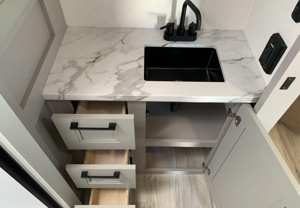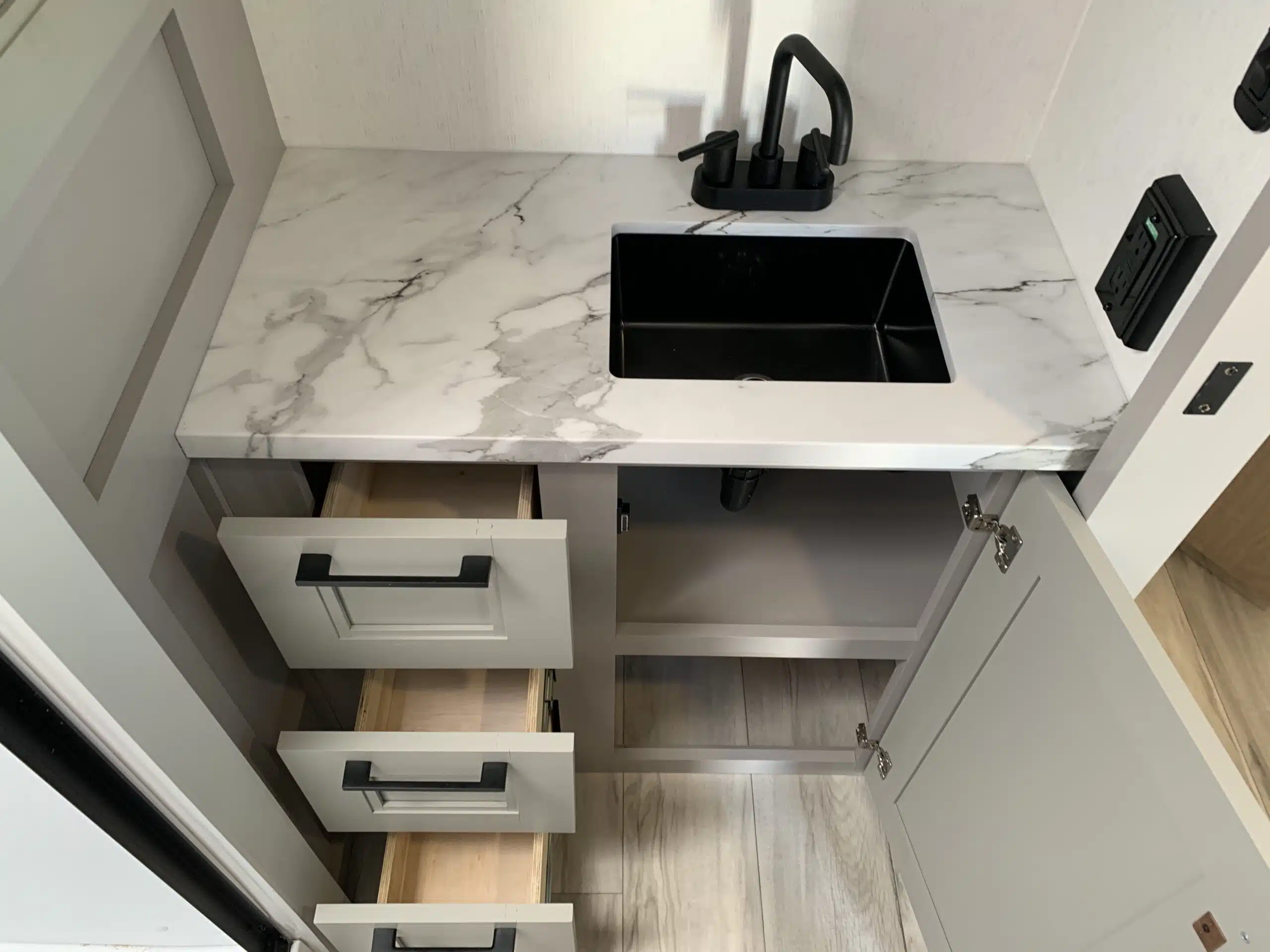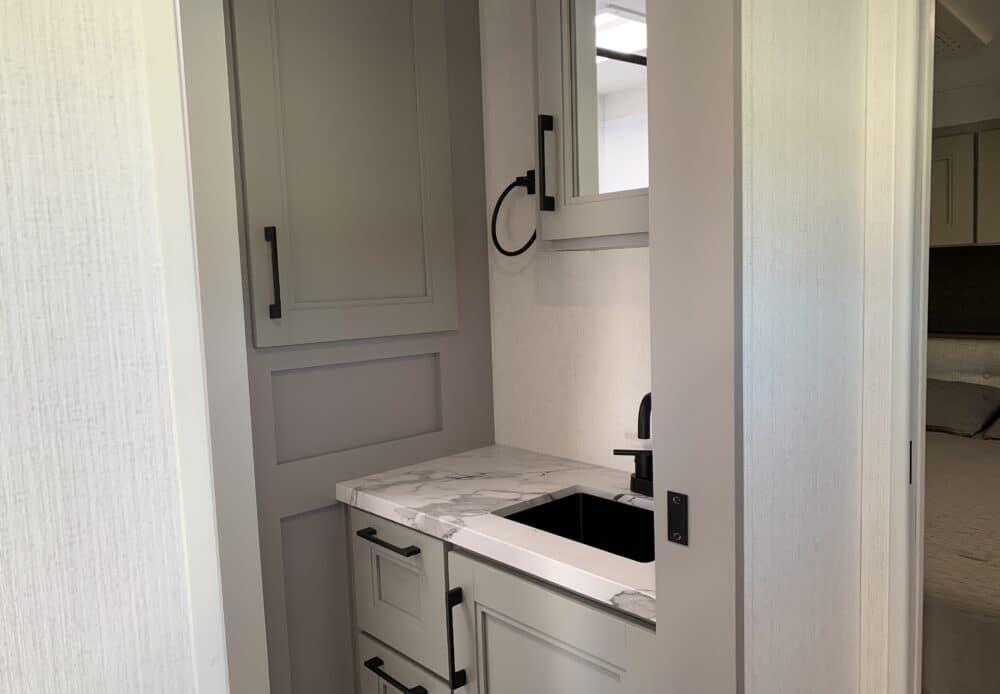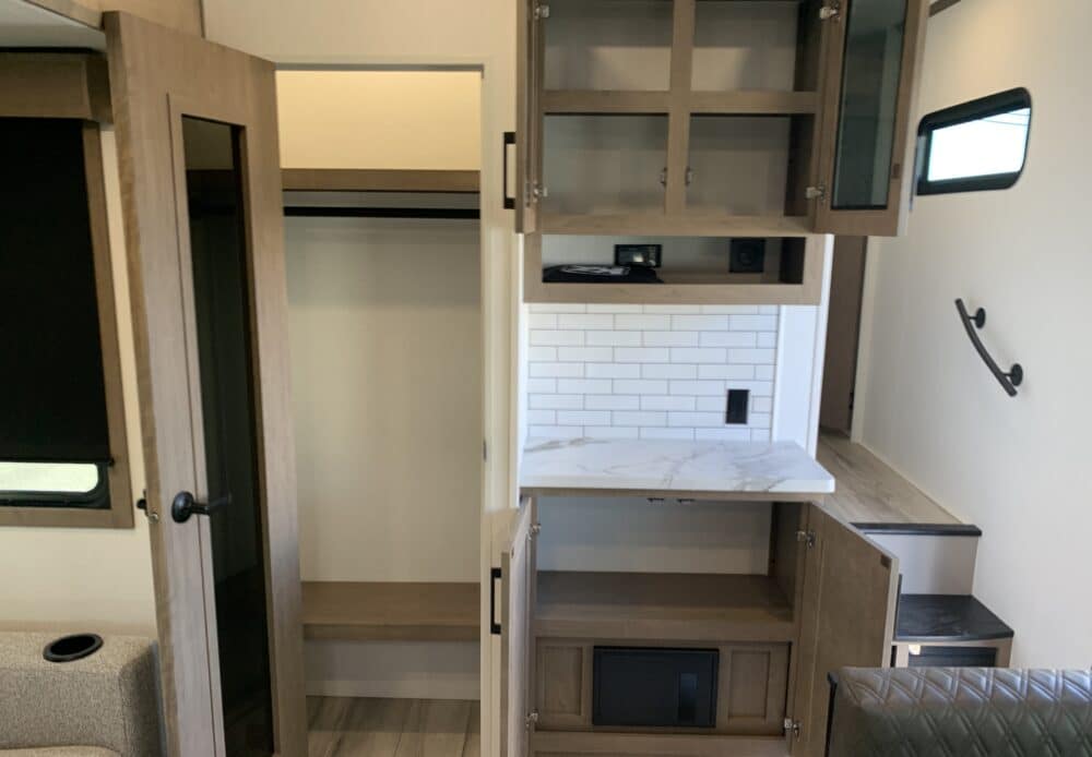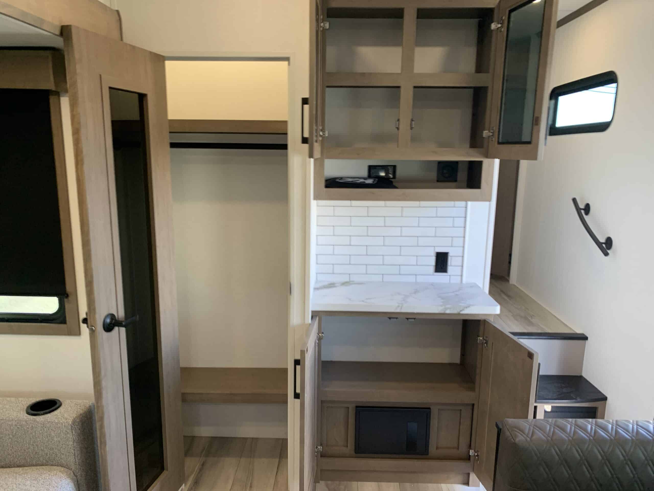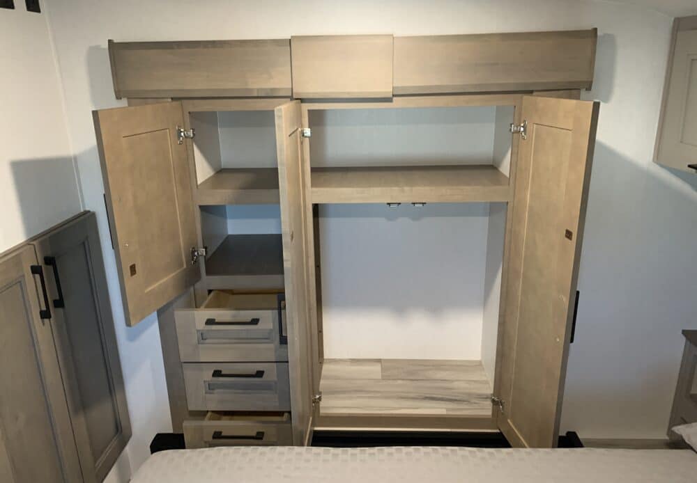 Cette roulotte est prête à recevoir une laveuse/sécheuse dans la chambre à coucher.