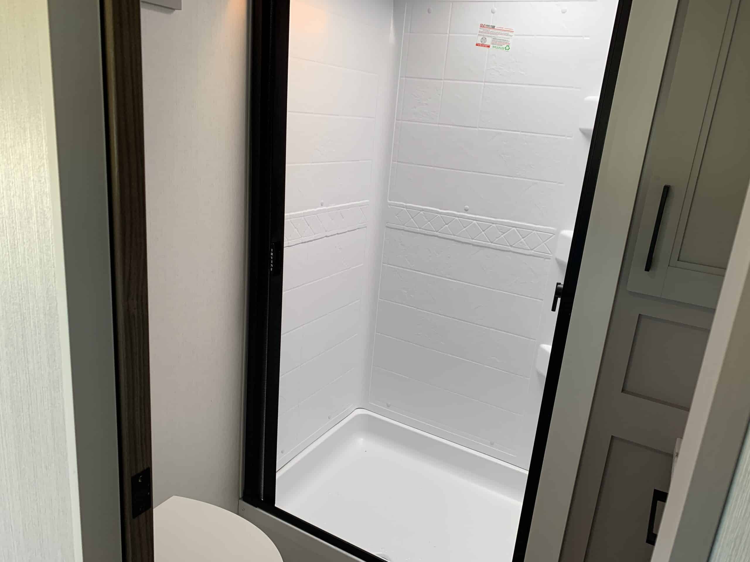 Sans oublier la salle de bain avec douche, toilette et meuble lavabo.