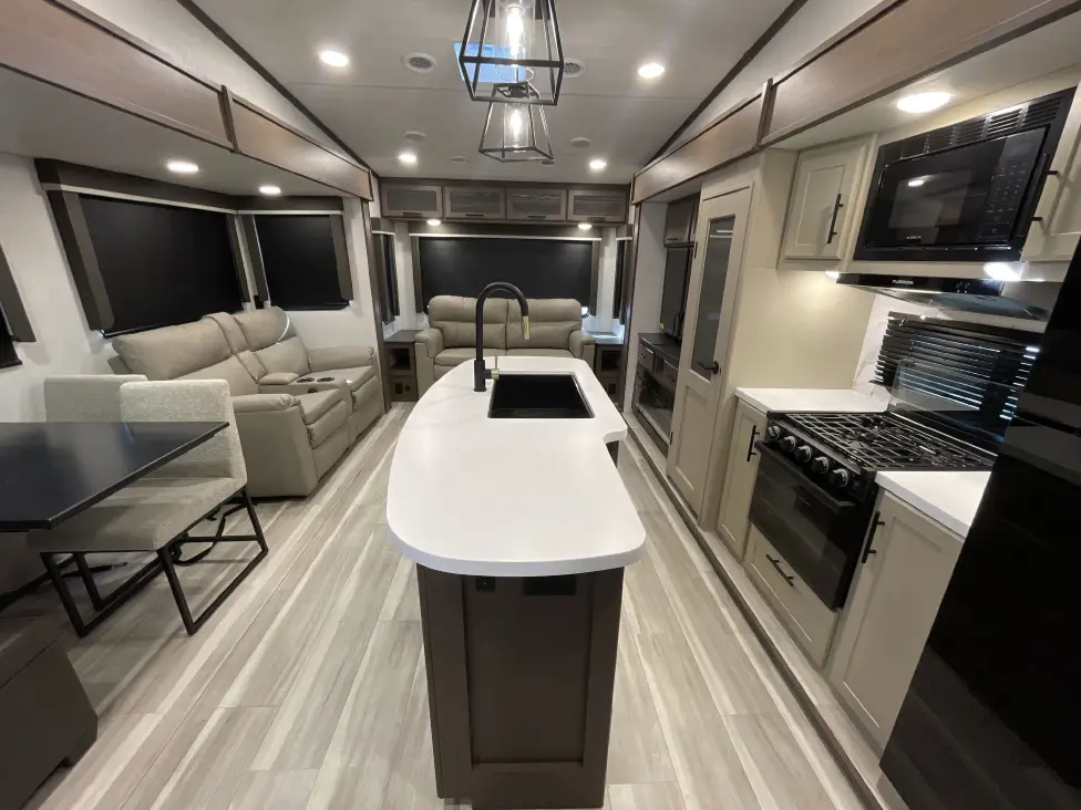 Cuisine :Îlot central, garde-manger spacieux, réfrigérateur 12V de 10,4 pi³ et cuisinière à 3 brûleurs.