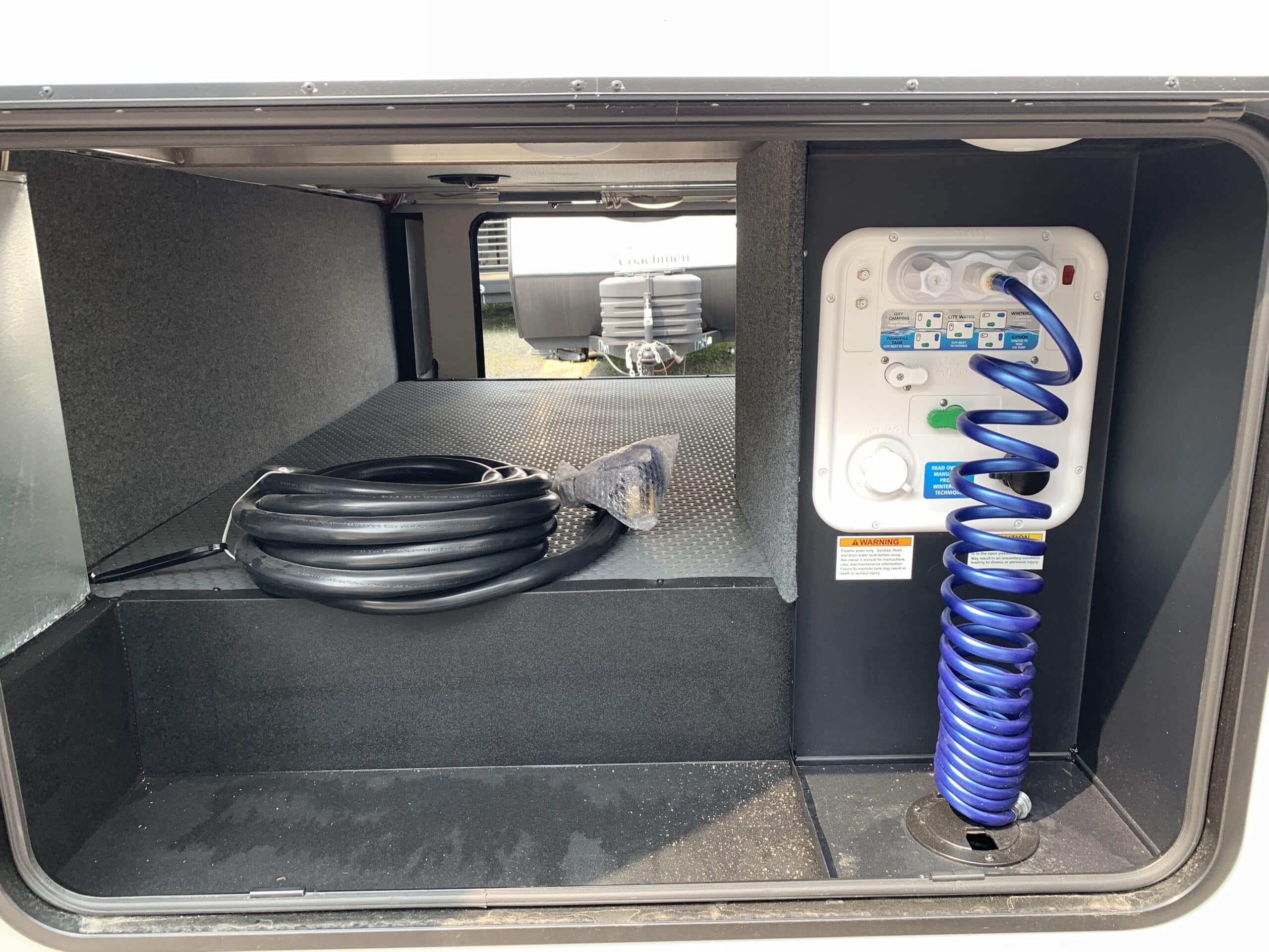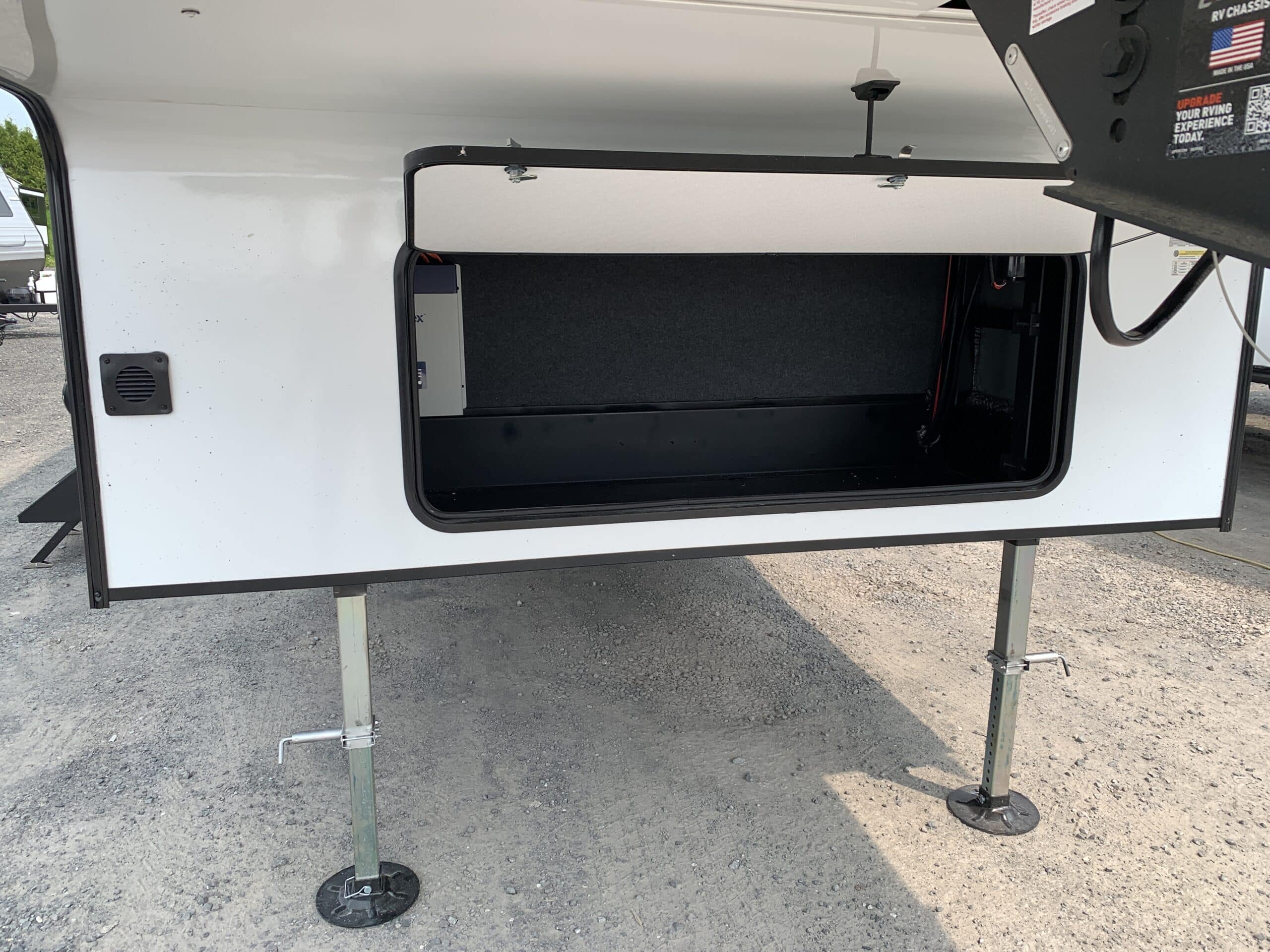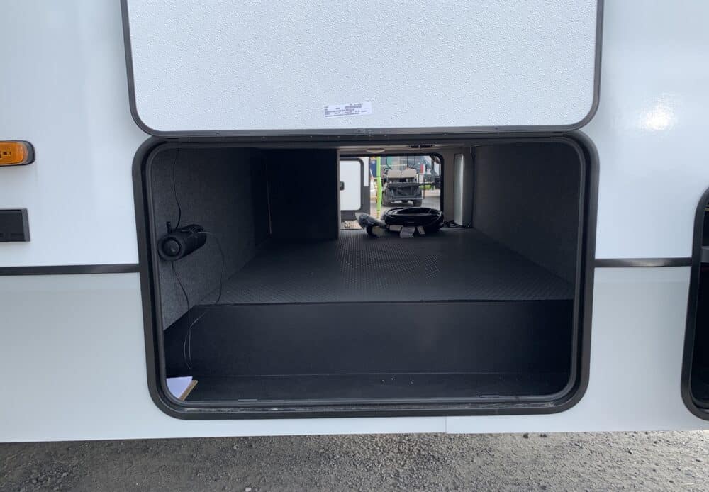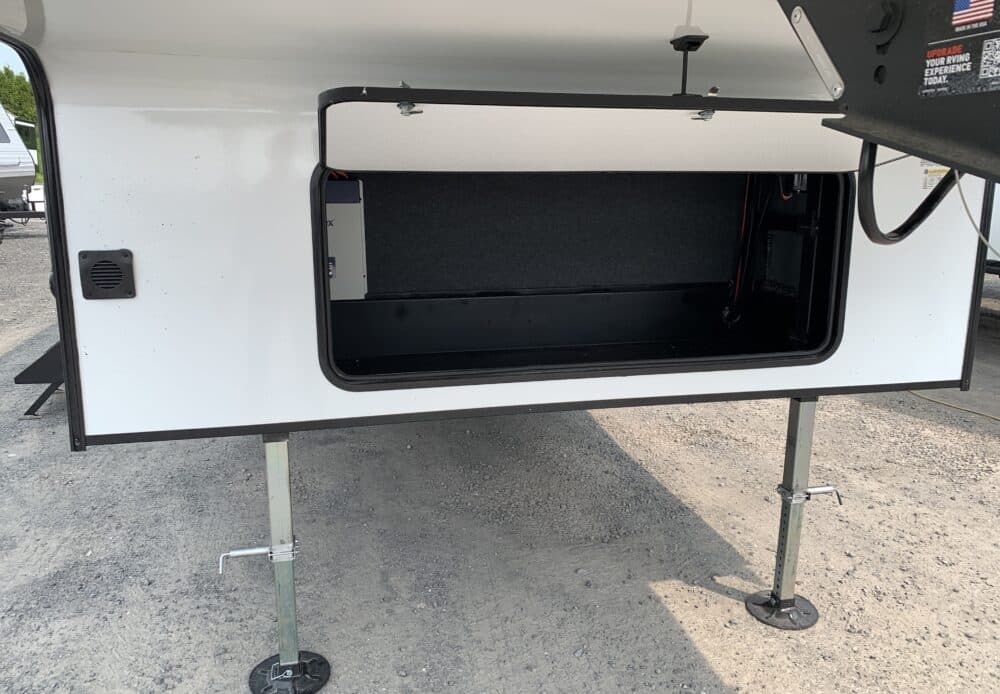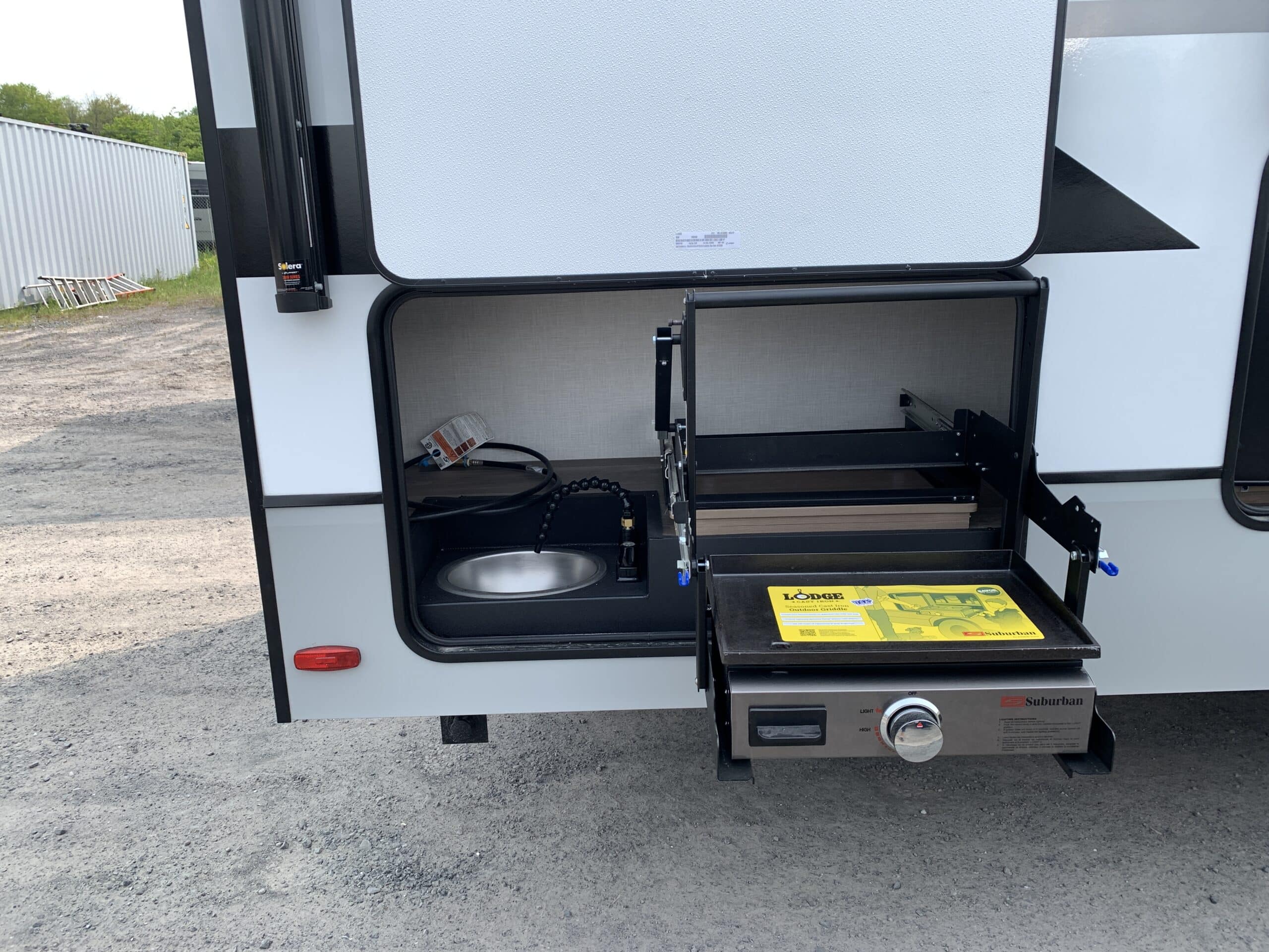 D’abord cette roulotte a 2 auvents de 17 et 11 pieds, une douche et une cuisine pour profiter de l’extérieur sans soucis. Puisque ses marches sont ajustables et très stables vous aurez un accès facile à l’intérieur. Ensuite, elle est muni d’une échelle pour faciliter l’accès au toit. Elle a également une prise 50 ampères pour une meilleure qualité de courant. Les coffres ont également un bel espace de rangement.