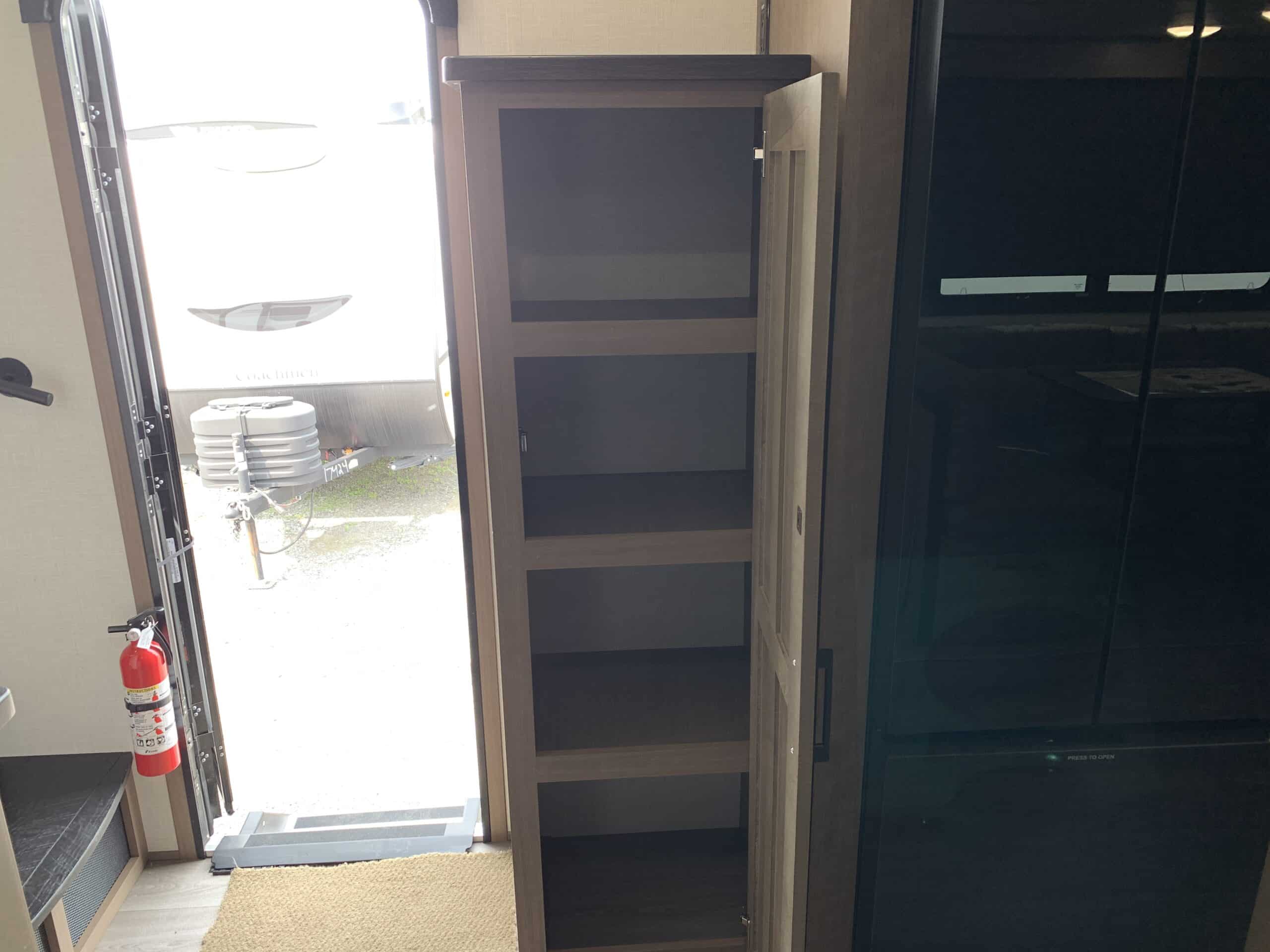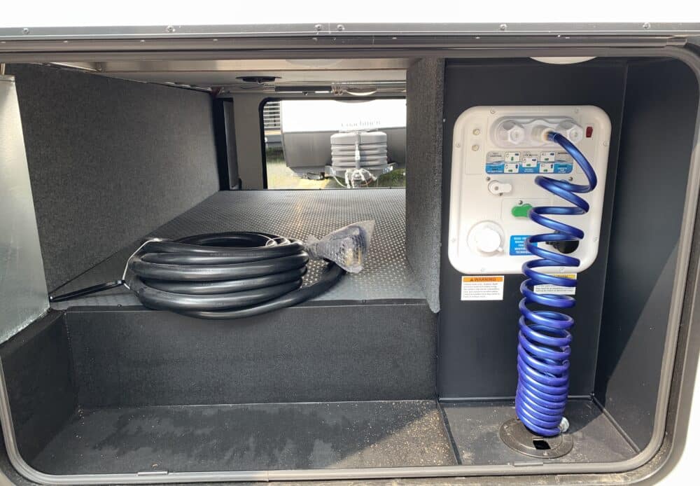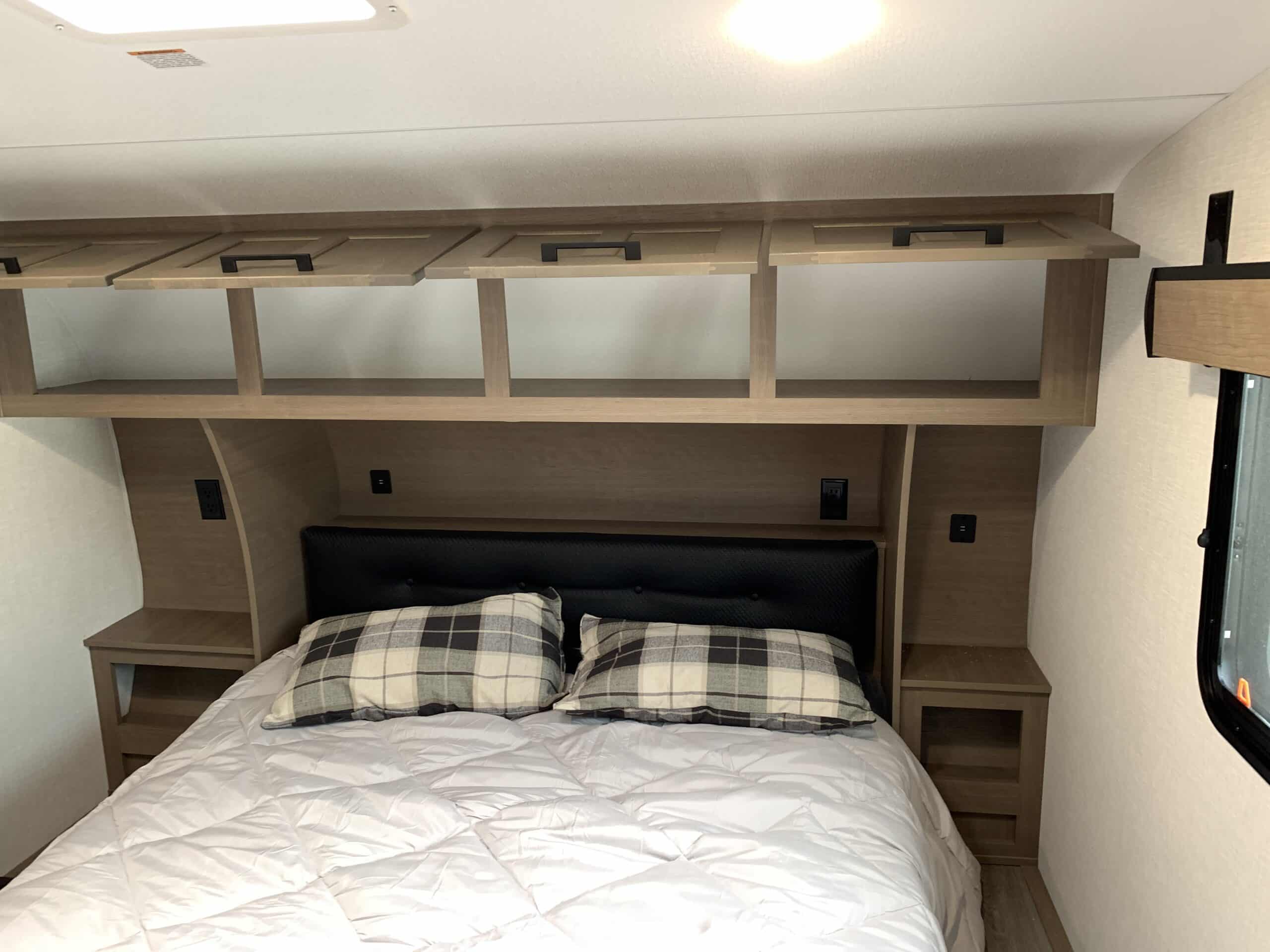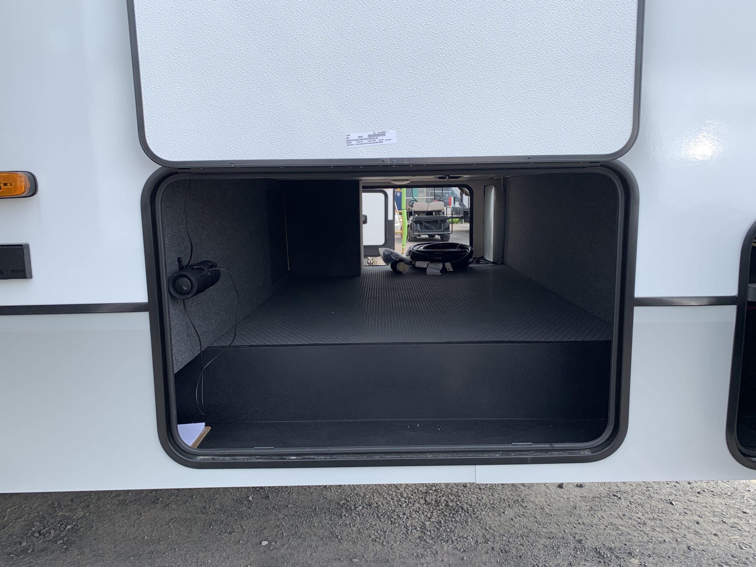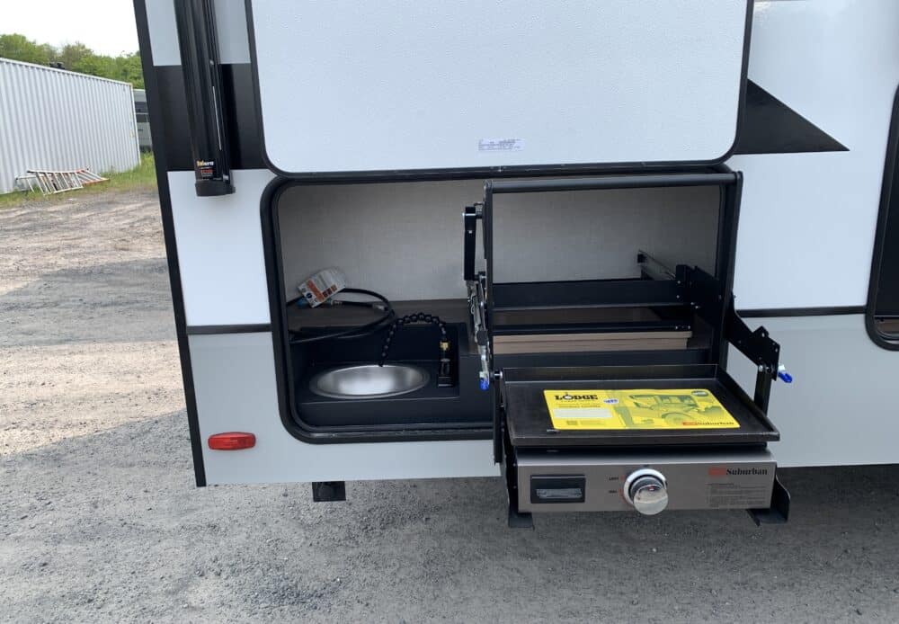 D’abord cette roulotte a 2 auvents de 17 et 11 pieds, une douche et une cuisine pour profiter de l’extérieur sans soucis. Puisque ses marches sont ajustables et très stables vous aurez un accès facile à l’intérieur. Ensuite, elle est muni d’une échelle pour faciliter l’accès au toit. Elle a également une prise 50 ampères pour une meilleure qualité de courant. Les coffres ont également un bel espace de rangement.