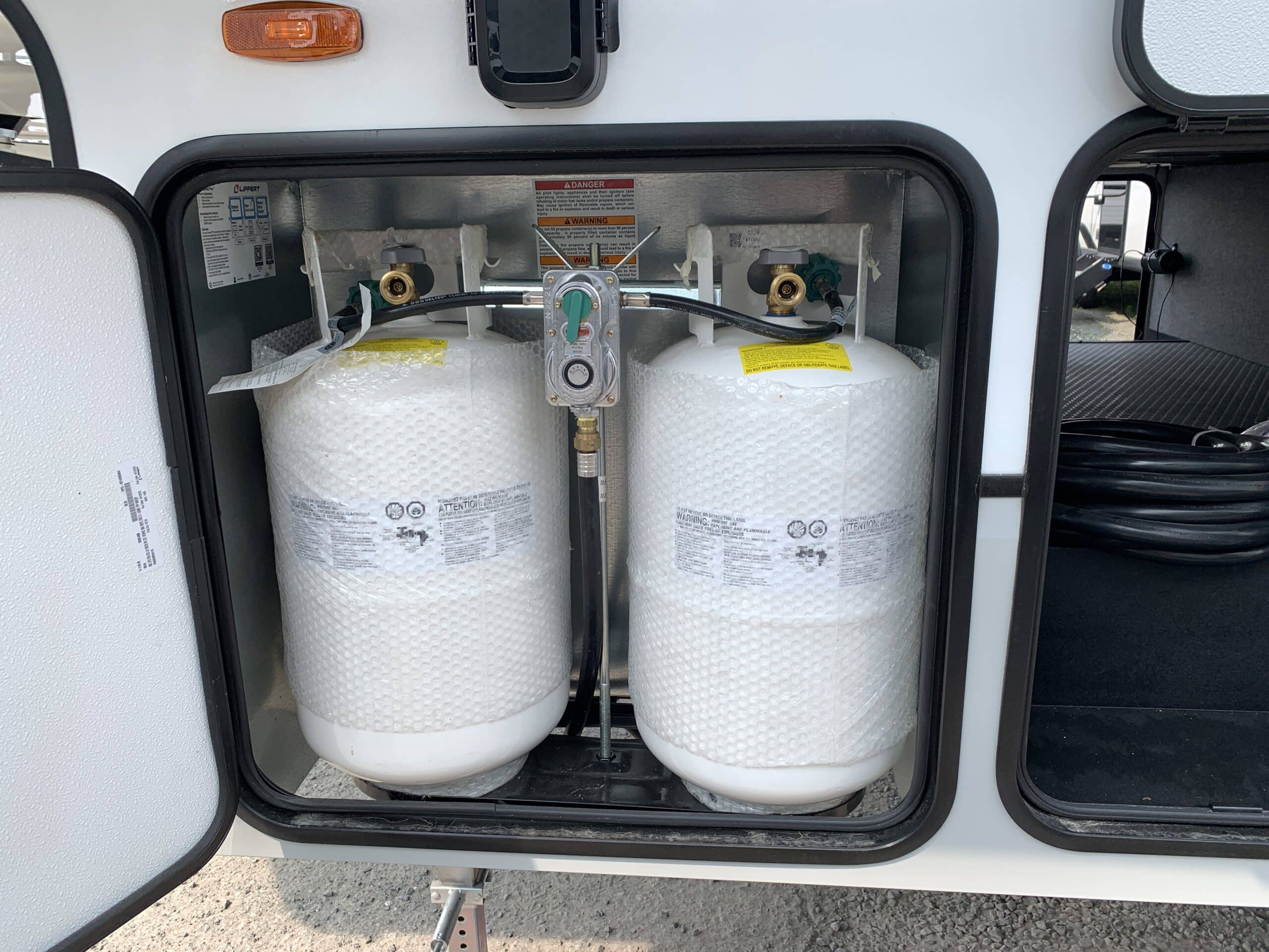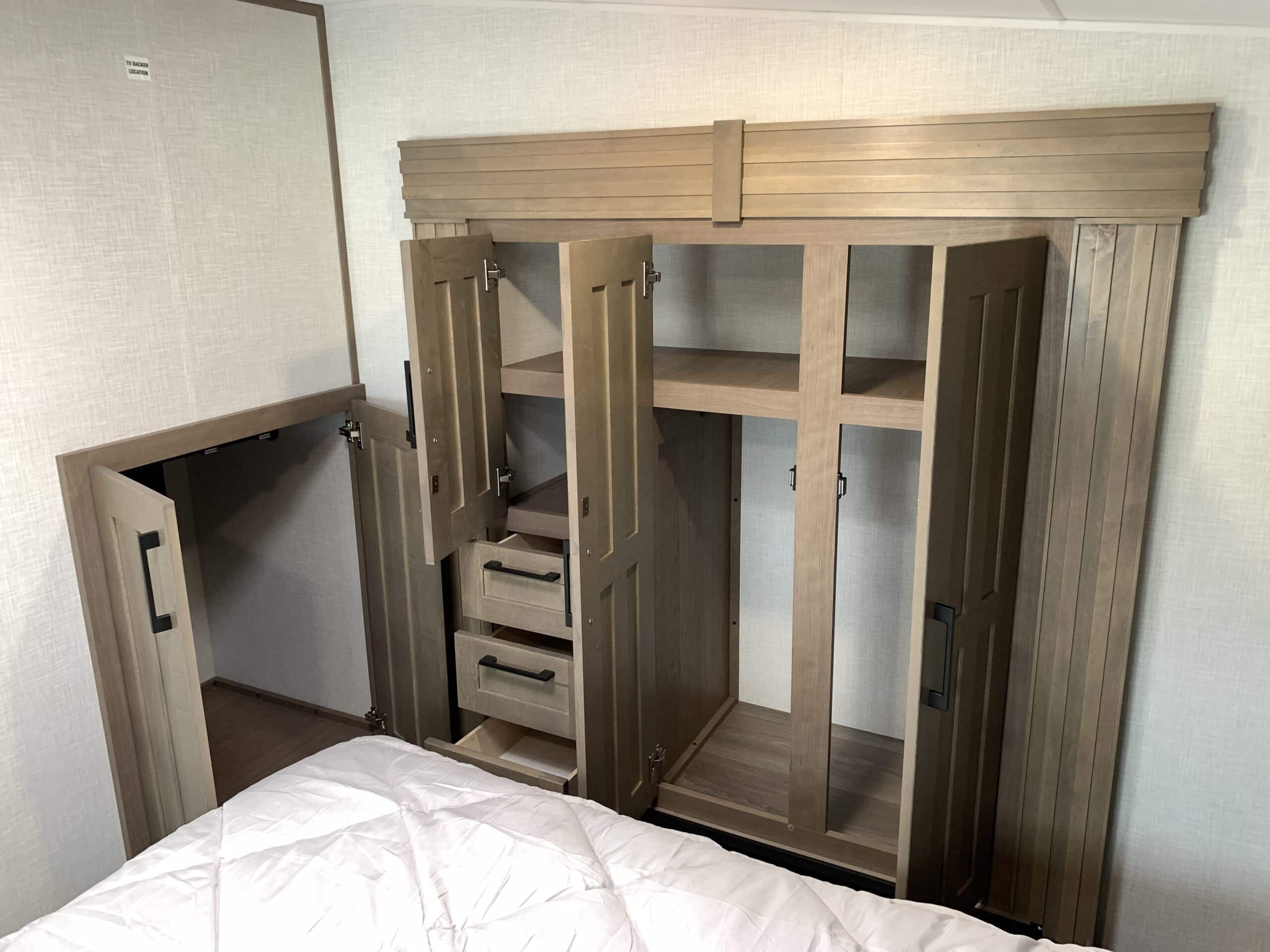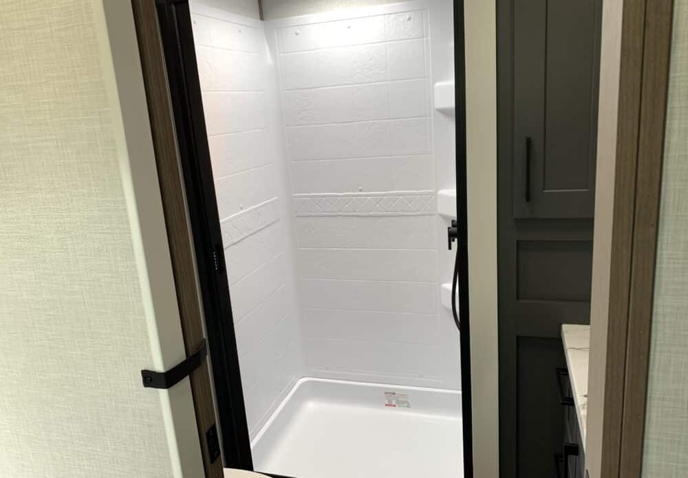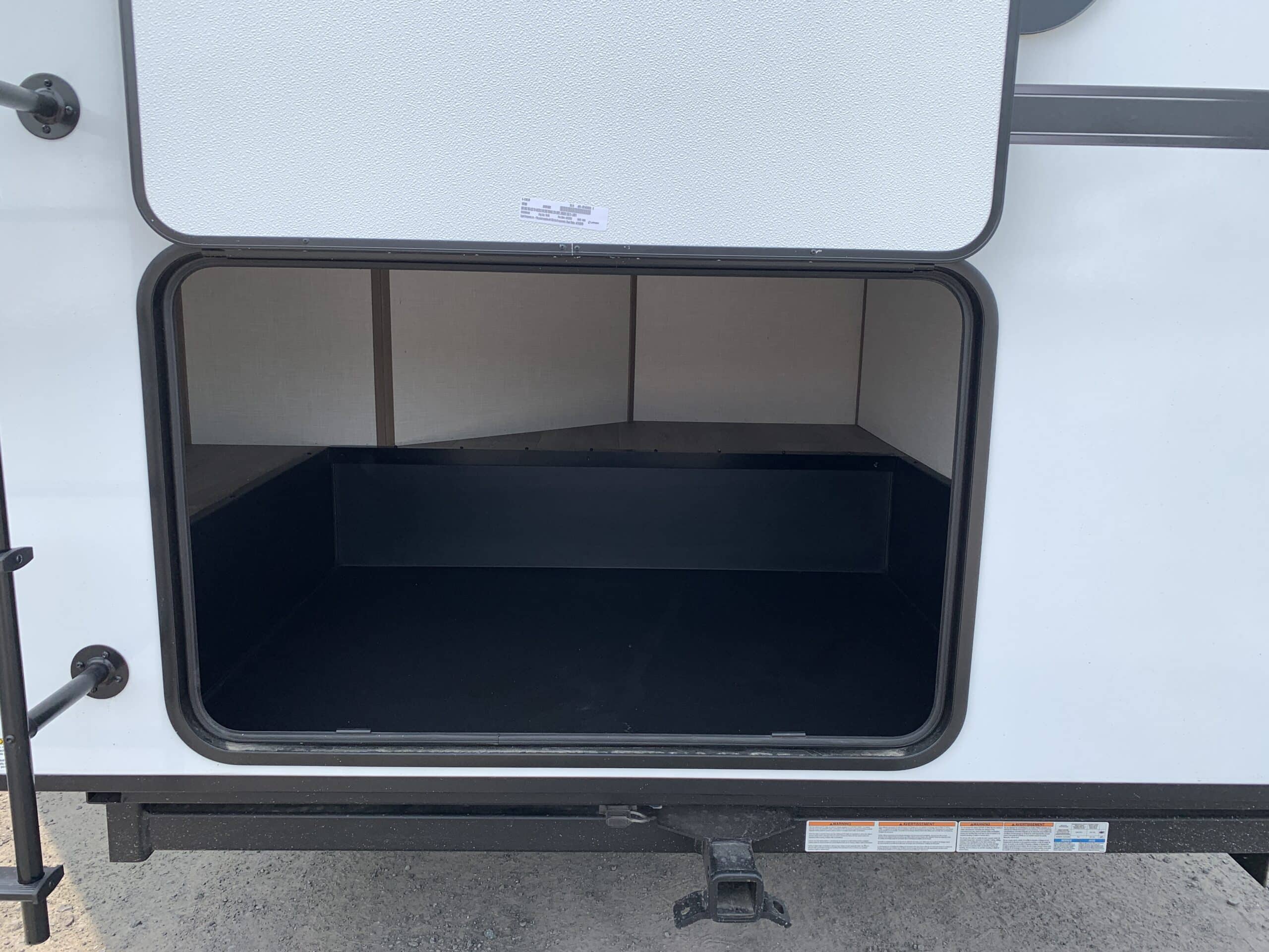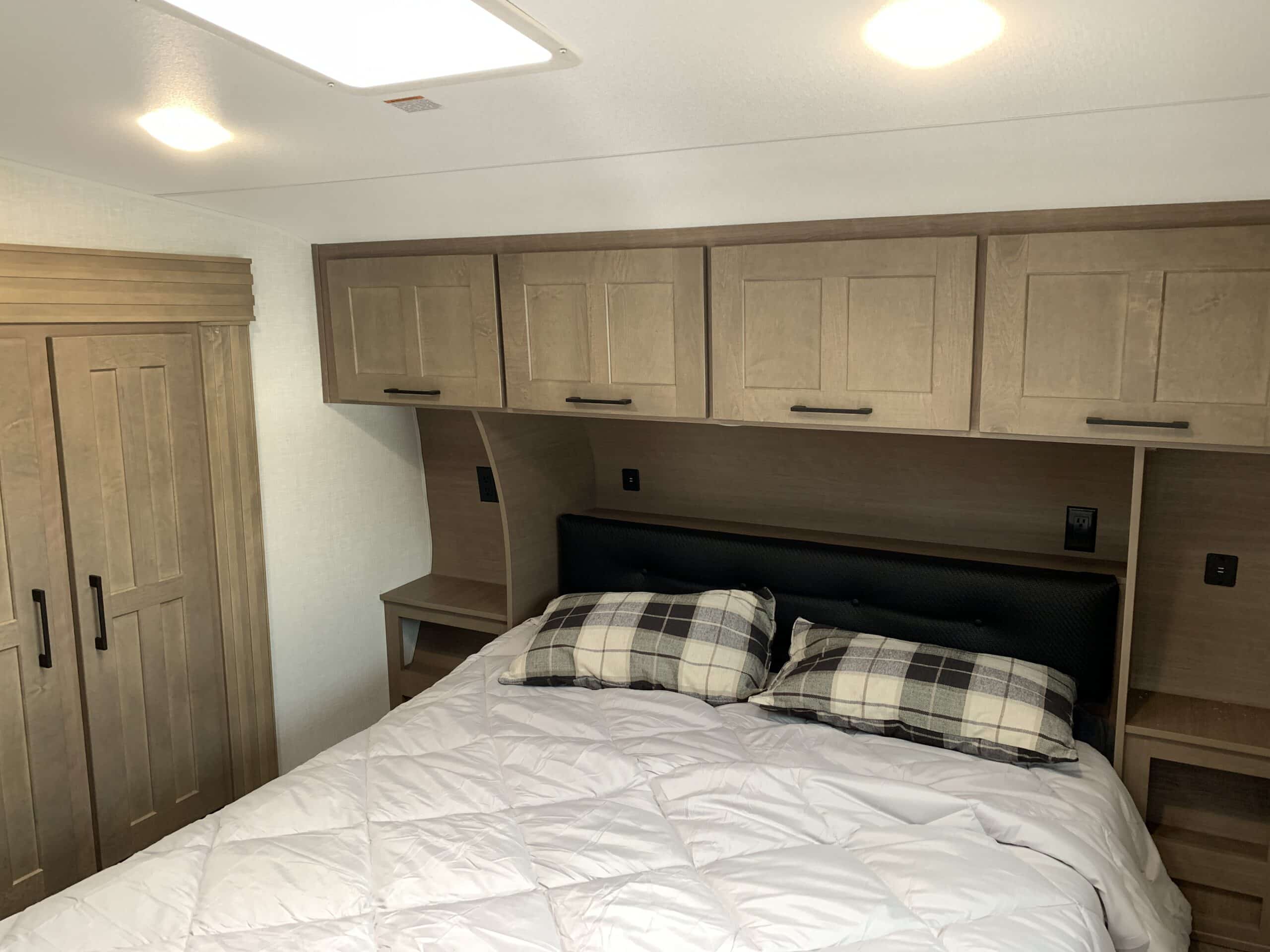 D’abord cette roulotte a 2 auvents de 17 et 11 pieds, une douche et une cuisine pour profiter de l’extérieur sans soucis. Puisque ses marches sont ajustables et très stables vous aurez un accès facile à l’intérieur. Ensuite, elle est muni d’une échelle pour faciliter l’accès au toit. Elle a également une prise 50 ampères pour une meilleure qualité de courant. Les coffres ont également un bel espace de rangement.