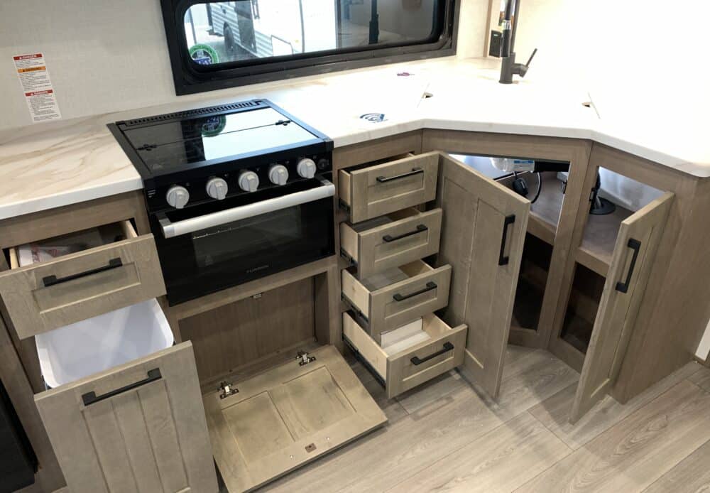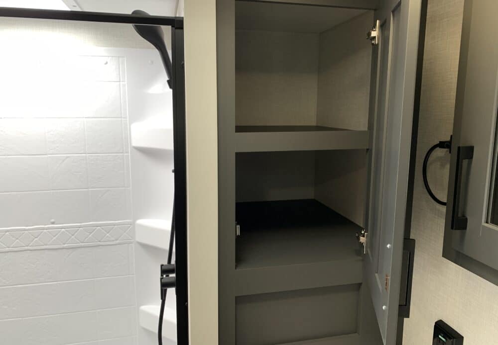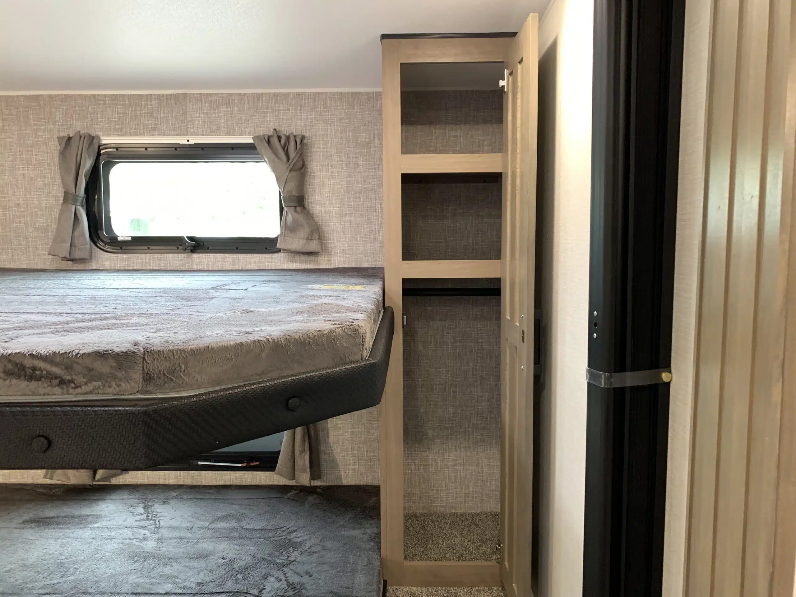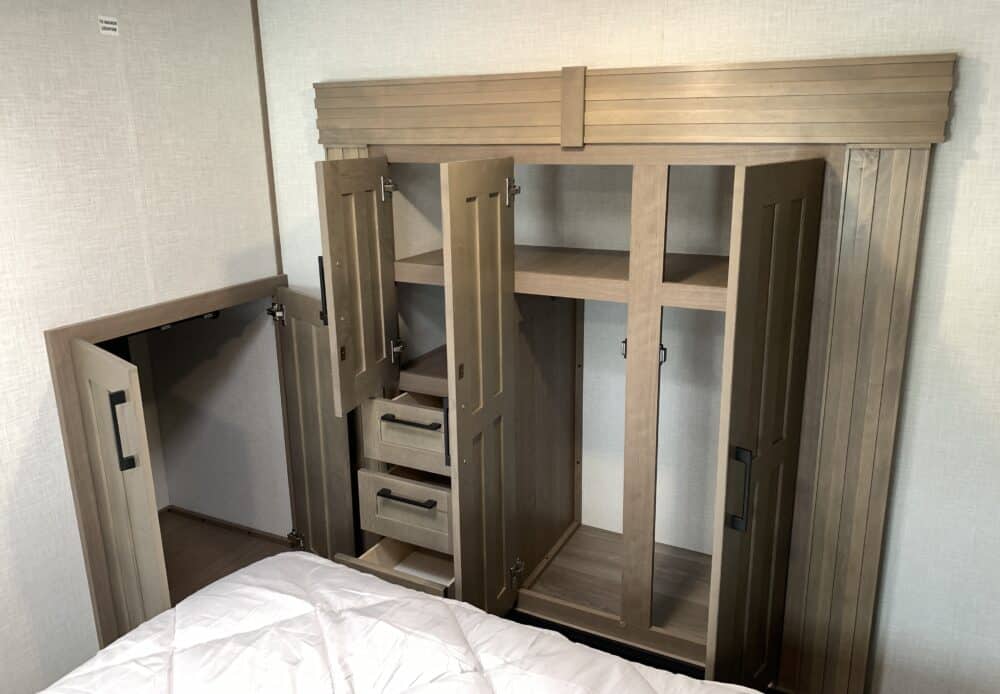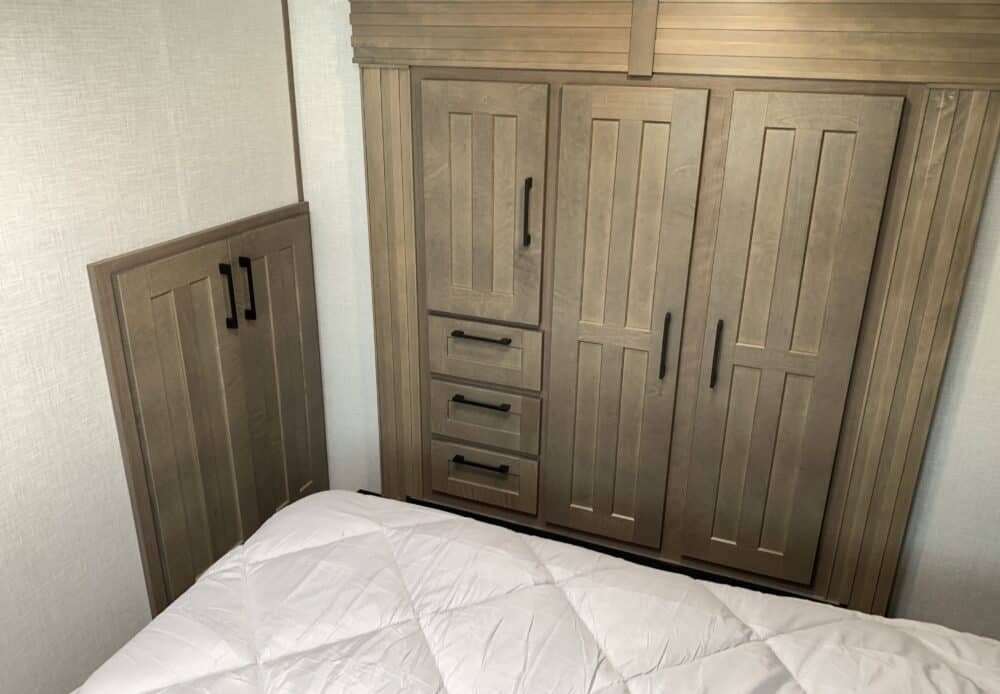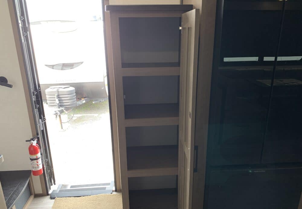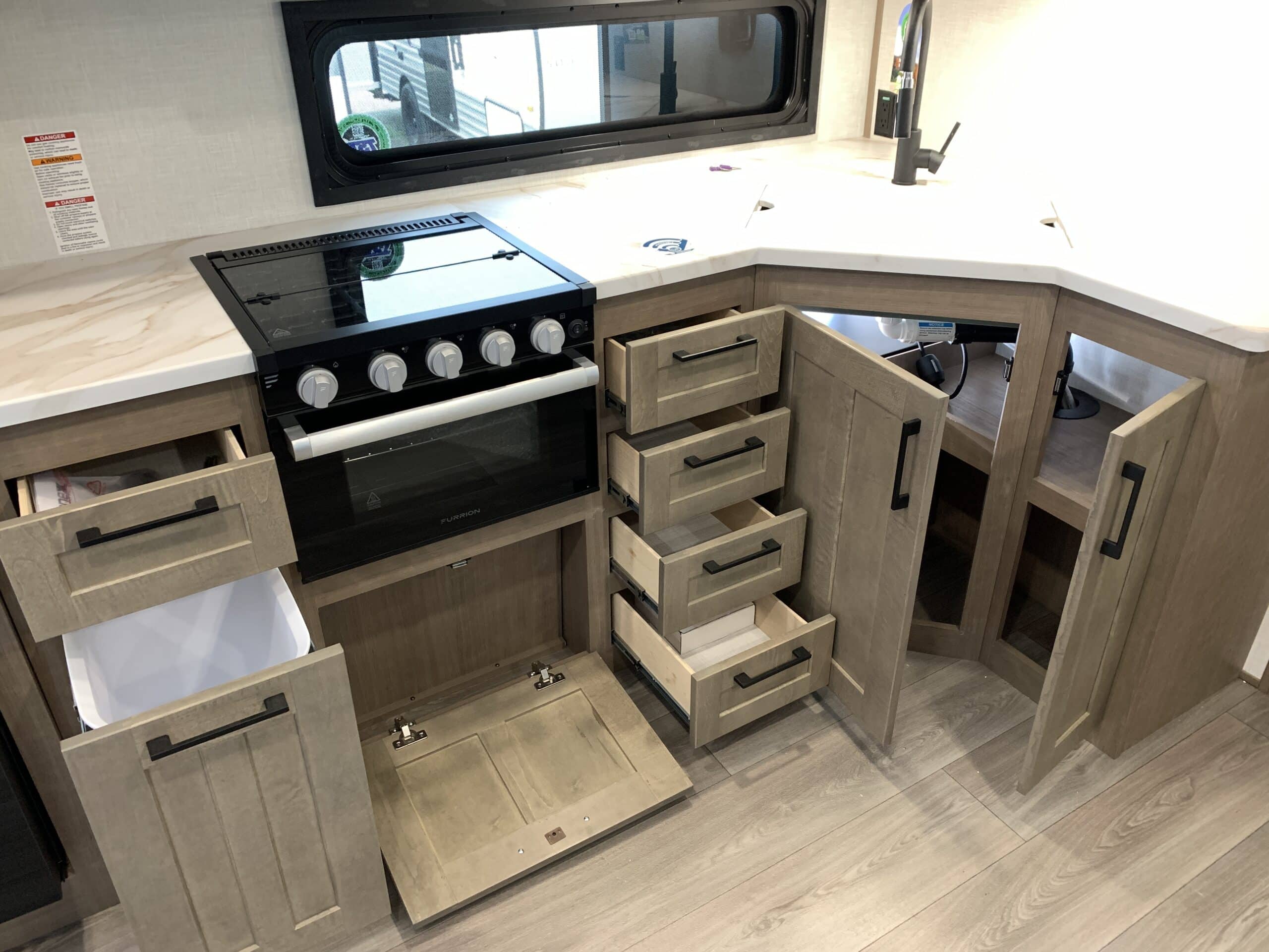 D’abord cette roulotte a 2 auvents de 17 et 11 pieds, une douche et une cuisine pour profiter de l’extérieur sans soucis. Puisque ses marches sont ajustables et très stables vous aurez un accès facile à l’intérieur. Ensuite, elle est muni d’une échelle pour faciliter l’accès au toit. Elle a également une prise 50 ampères pour une meilleure qualité de courant. Les coffres ont également un bel espace de rangement.