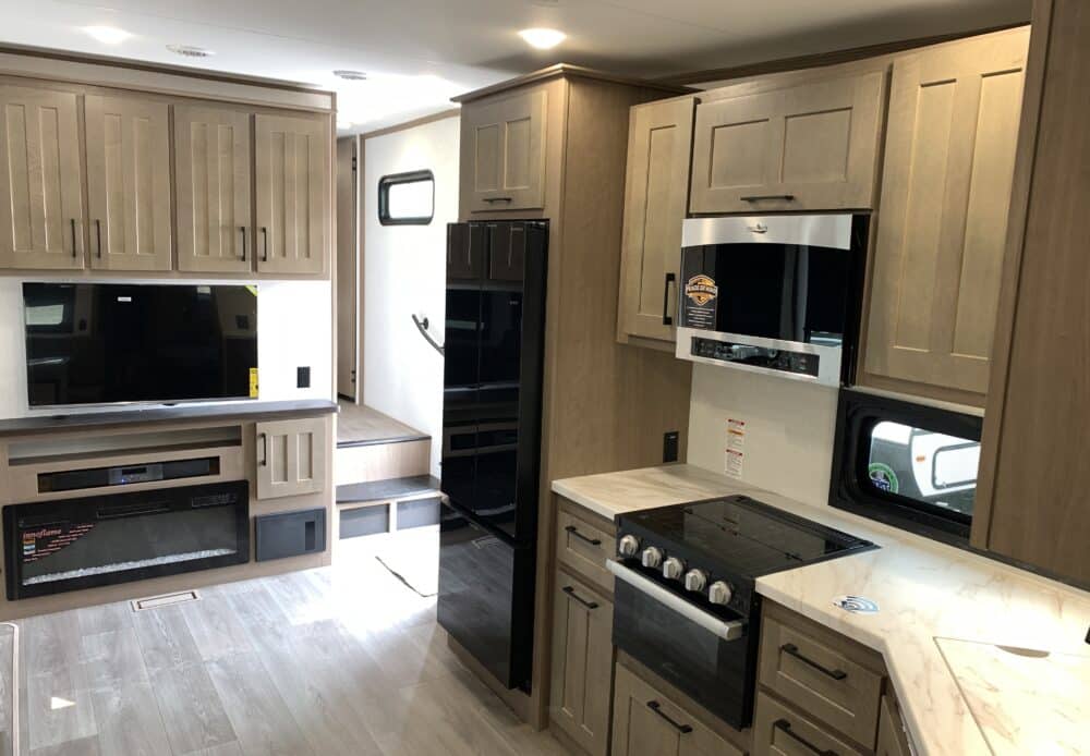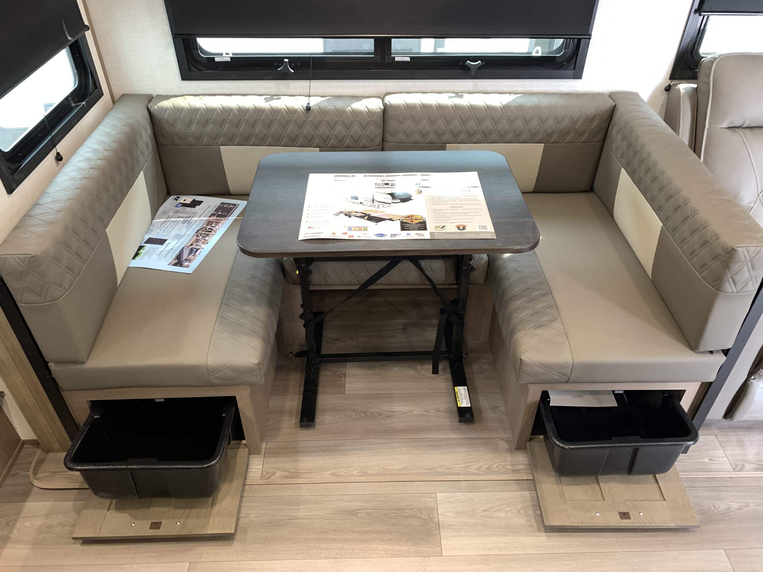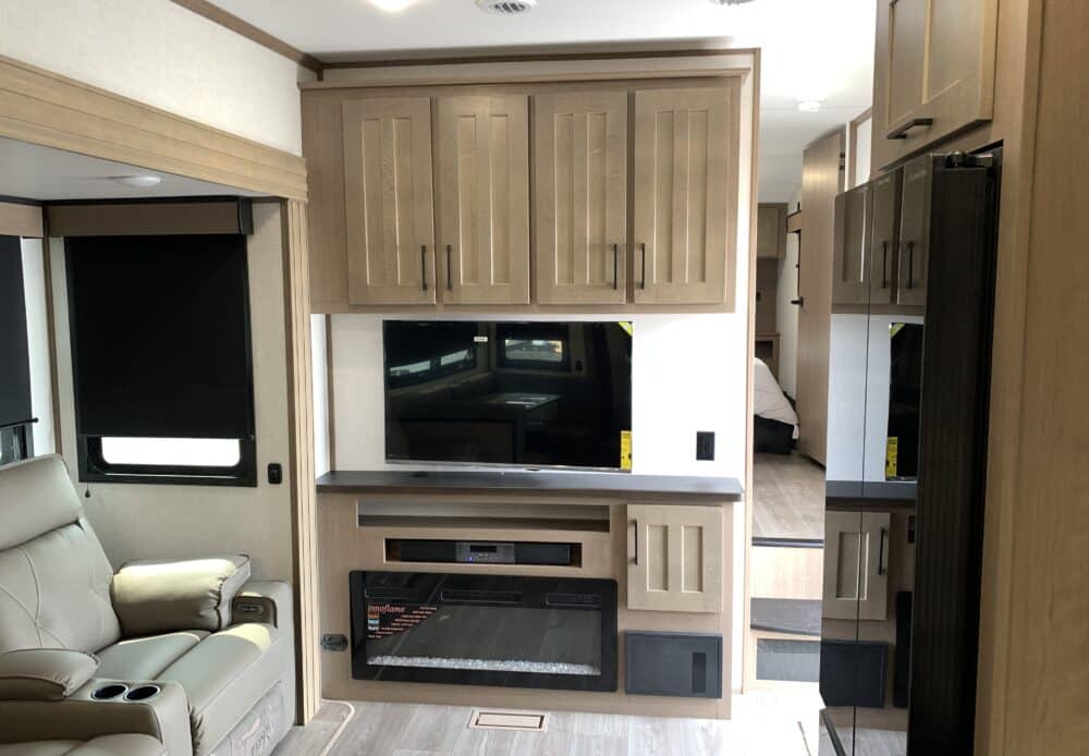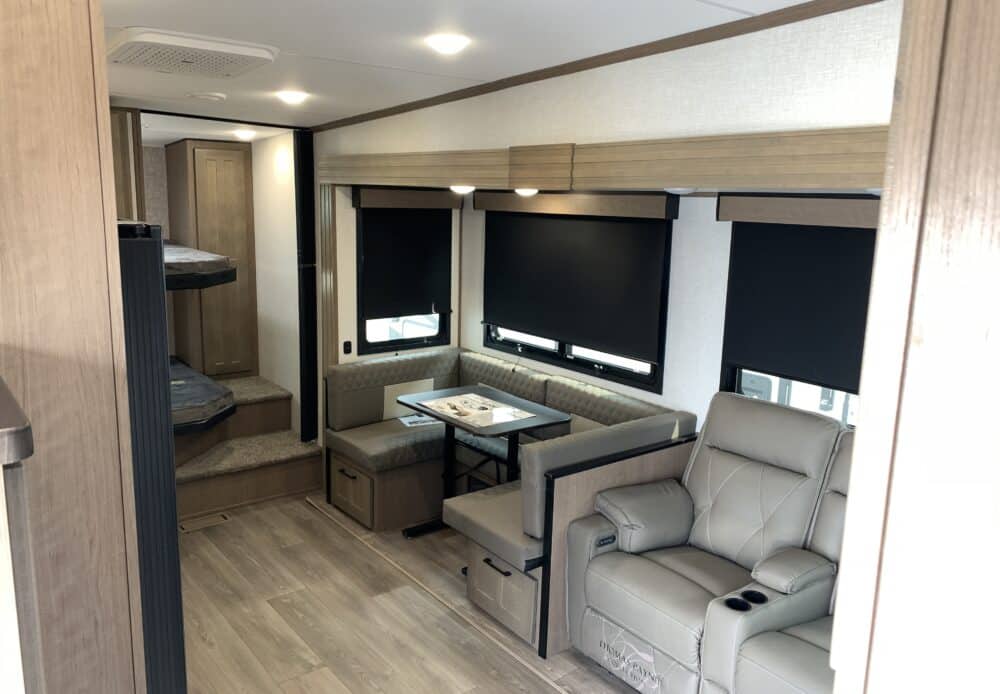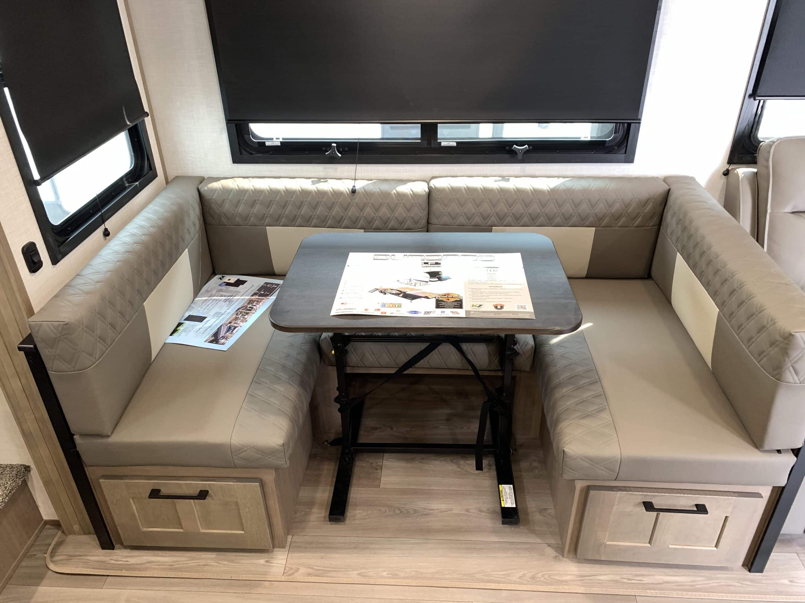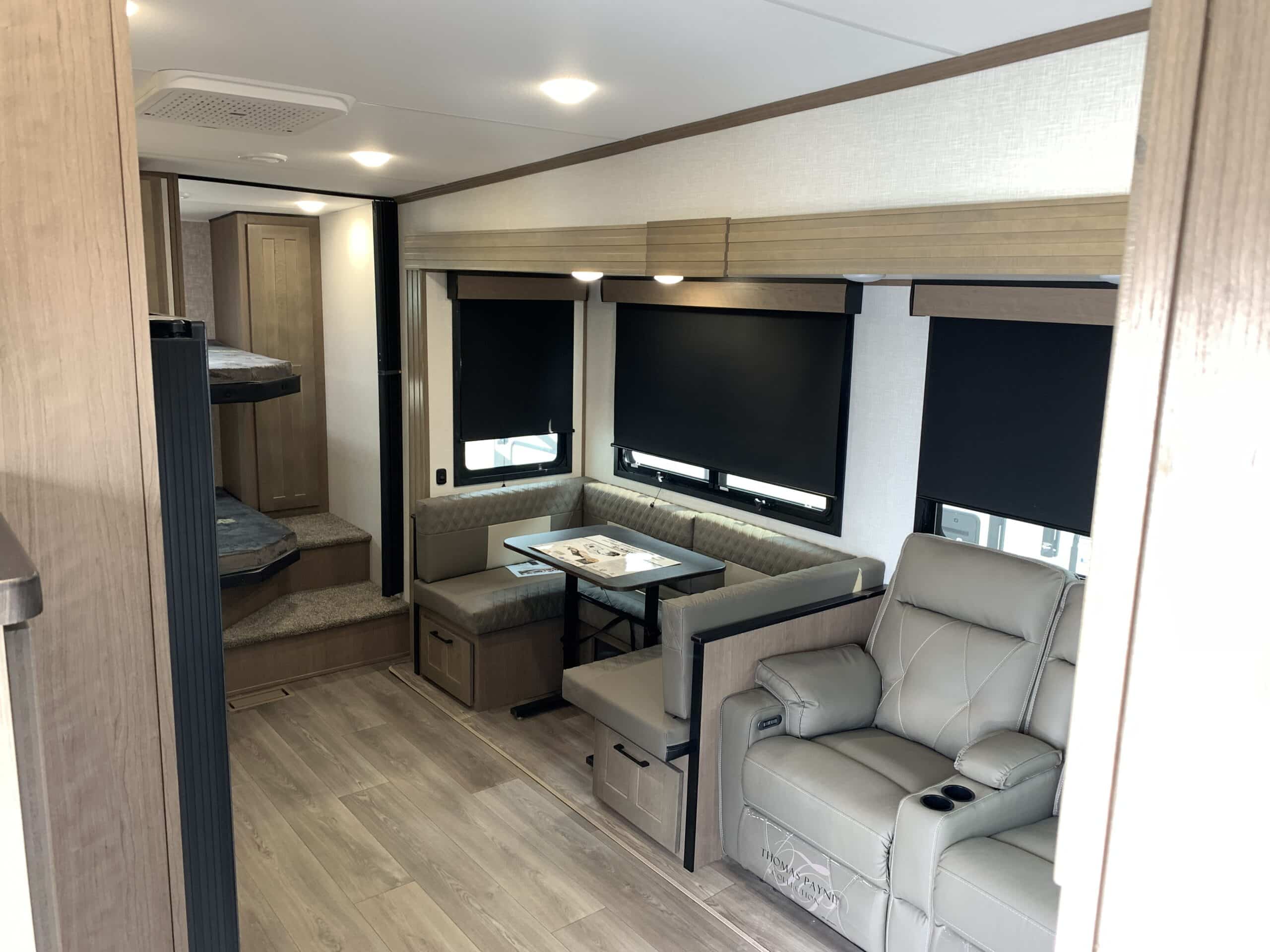 De plus, la Durango 286BHD a 2 airs climatisés de 15000 btu. et un foyer qui tempéreront  l’ambiance désirée. Par ailleurs, la cuisine a un micro-ondes, un poêle avec dessus en verre et un réfrigérateur 12 volts. Vous trouverez également une table banquette et une causeuse inclinable. Enfin le système audio vous permettra d’écouter votre musique préférée.