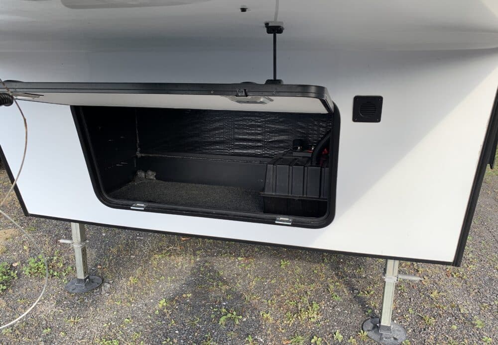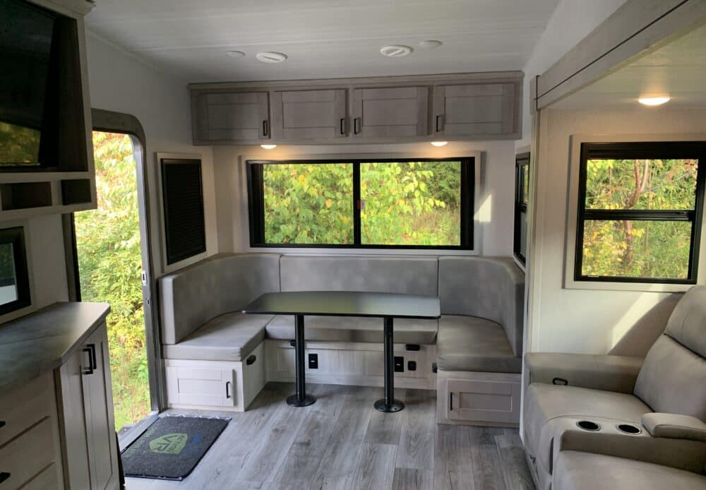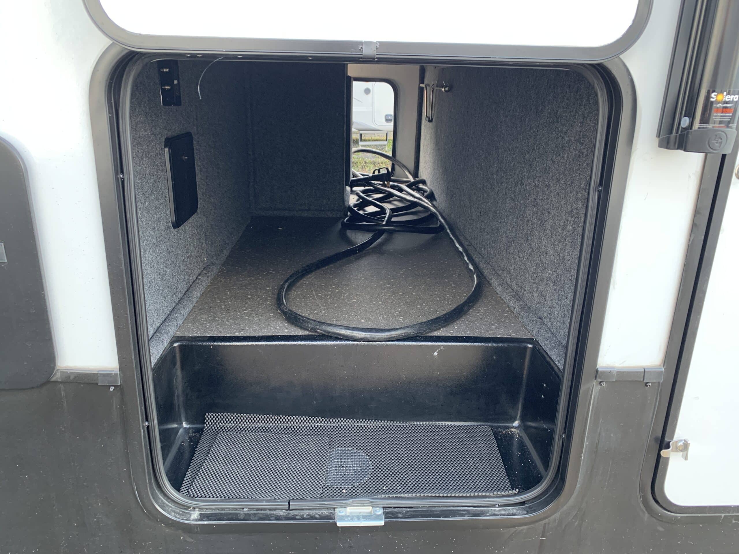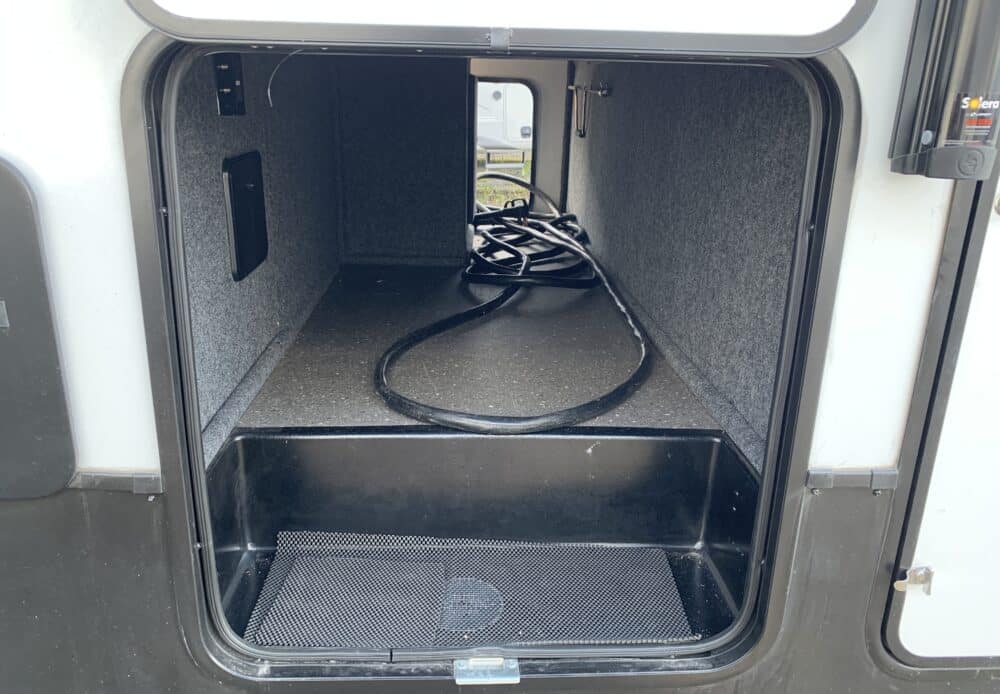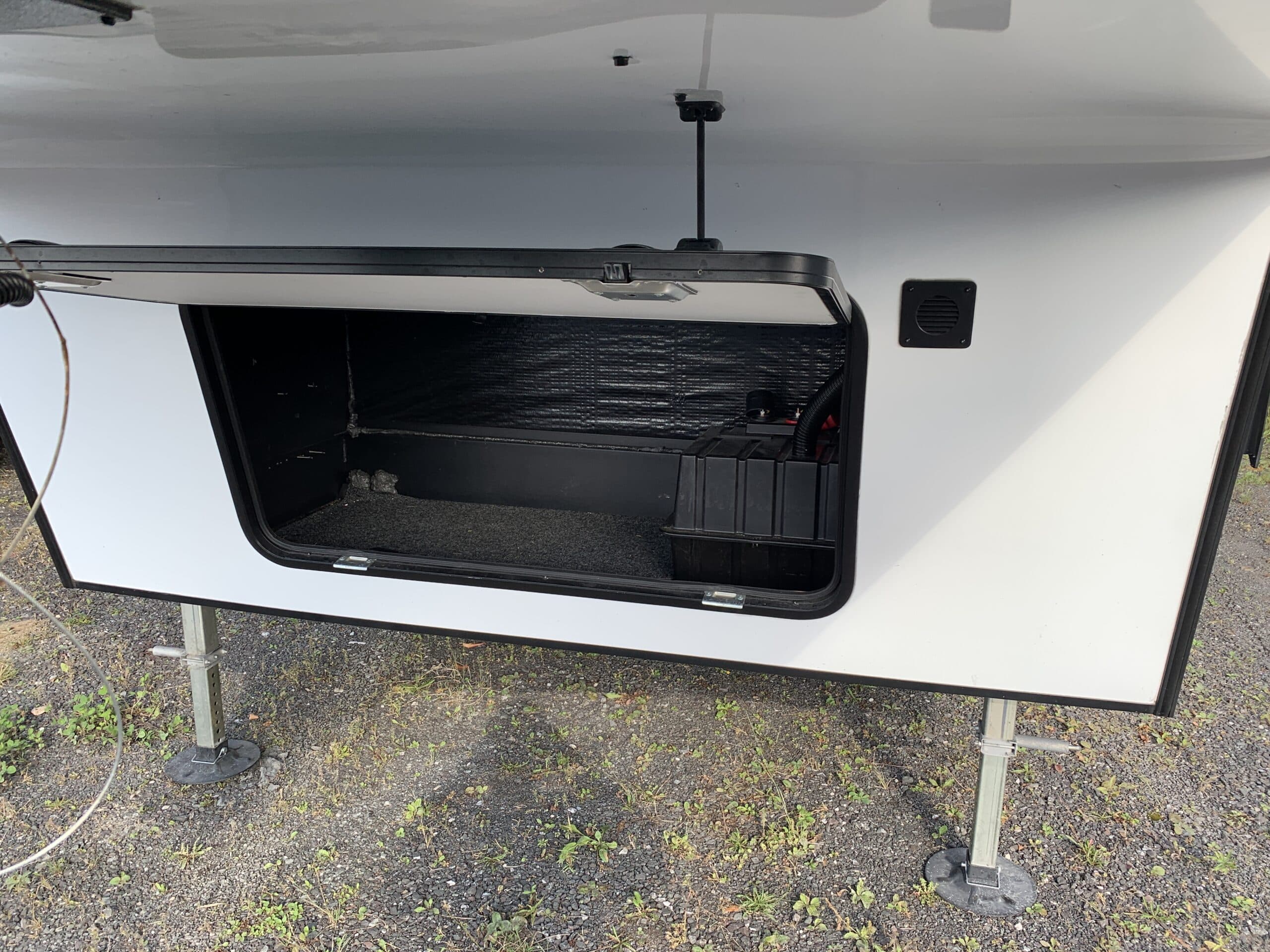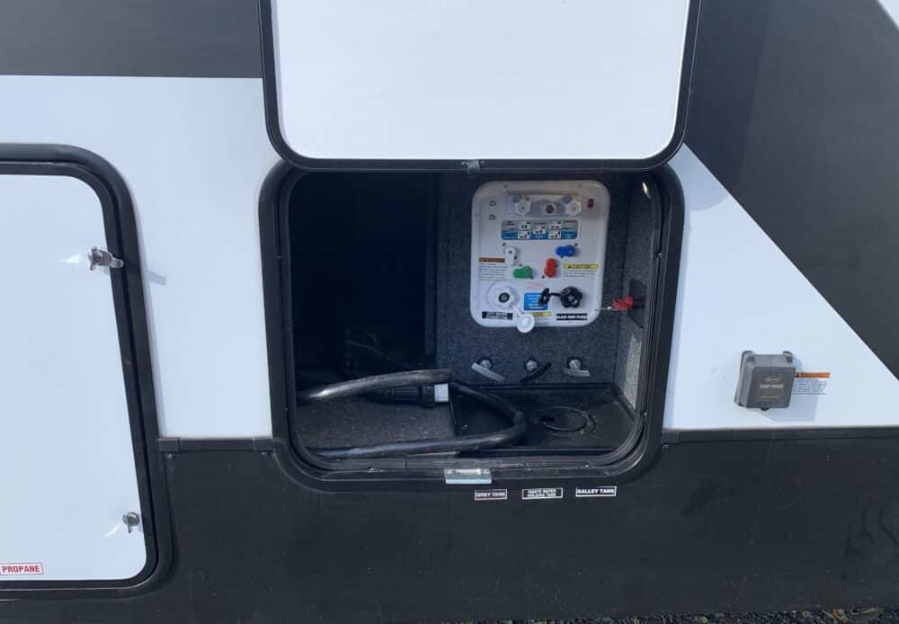 D’abord cette roulotte a un auvent de 20 pieds et une douche pour profiter de l’extérieur sans soucis. Elle vient avec un panneau solaire de 440 watts. Puisque ses marches sont ajustables et très stables vous aurez un accès facile à l’intérieur. De plus une prise 50 ampères pour une meilleure qualité de courant. Les coffres ont également un bel espace de rangement.
