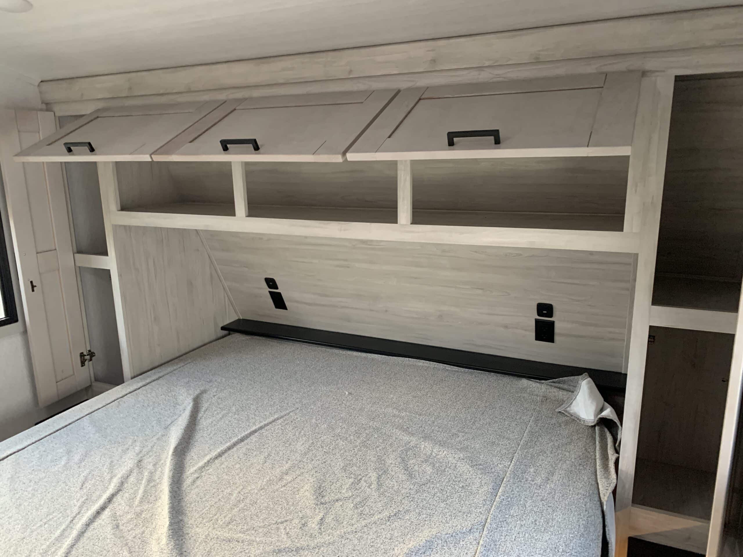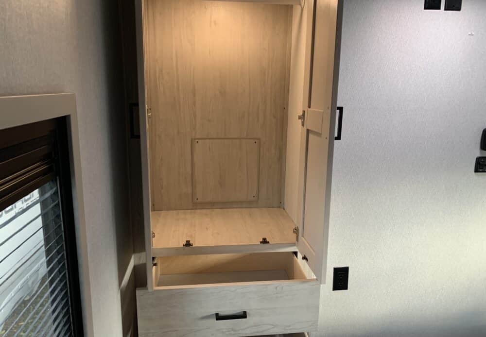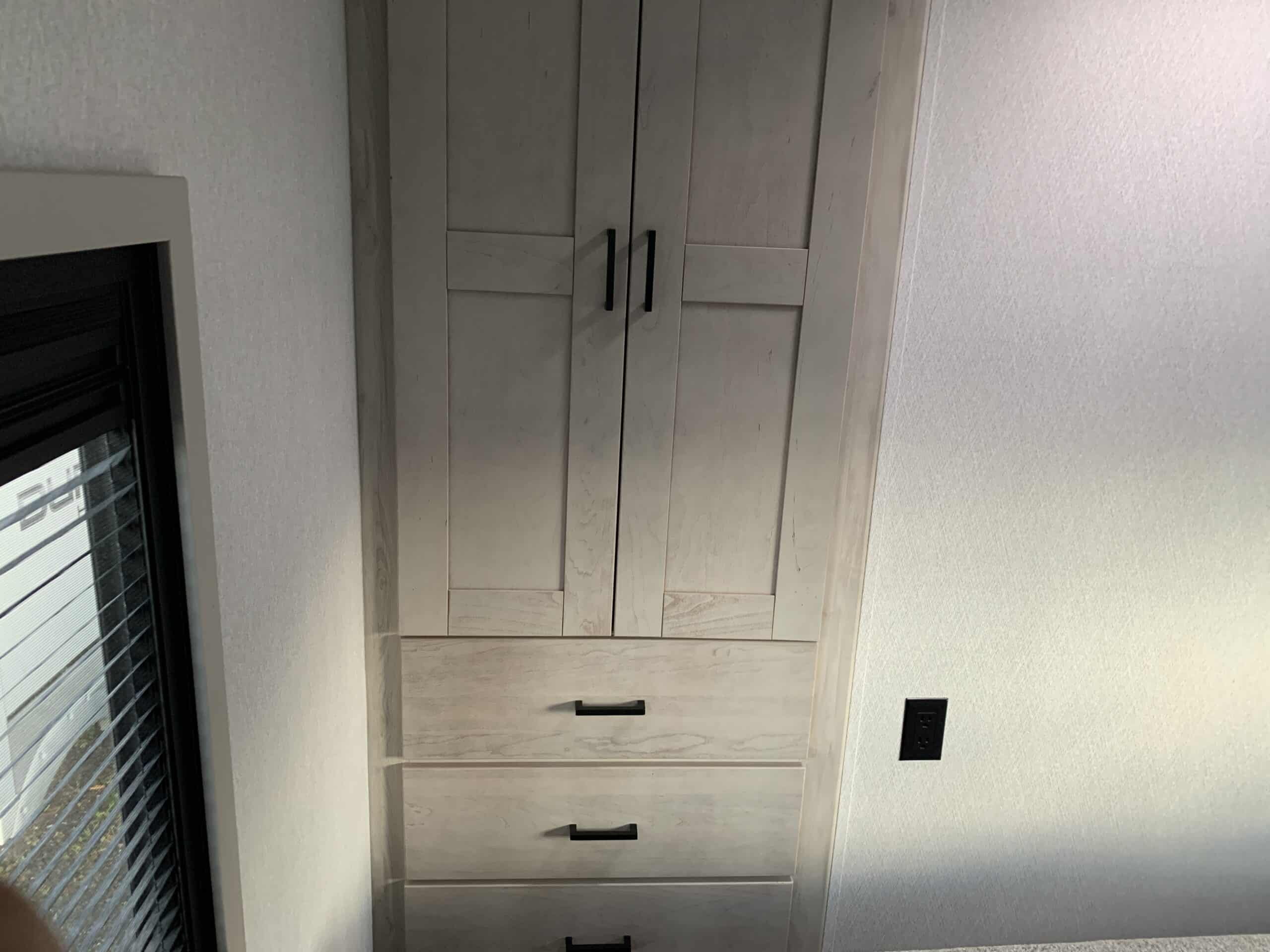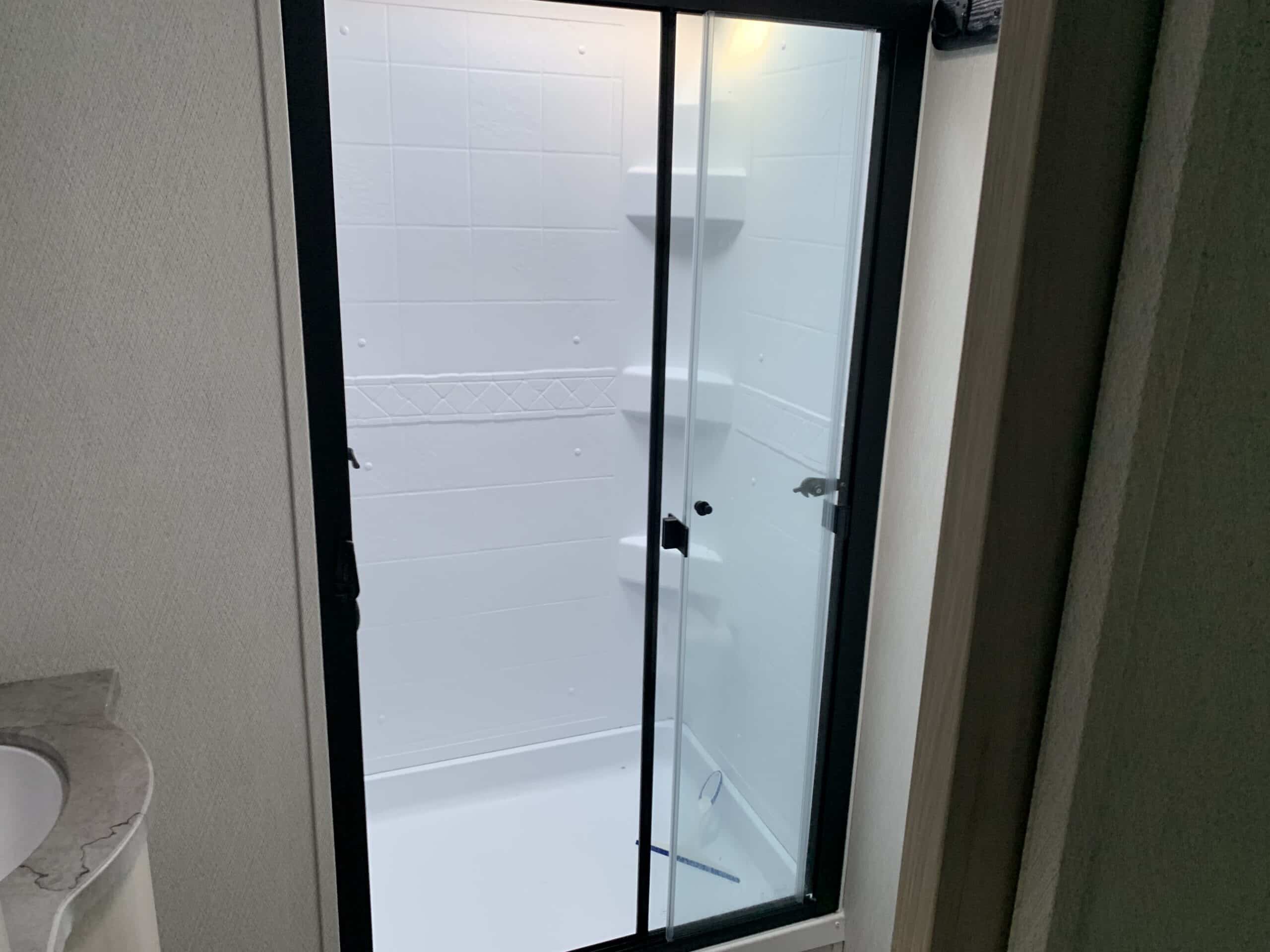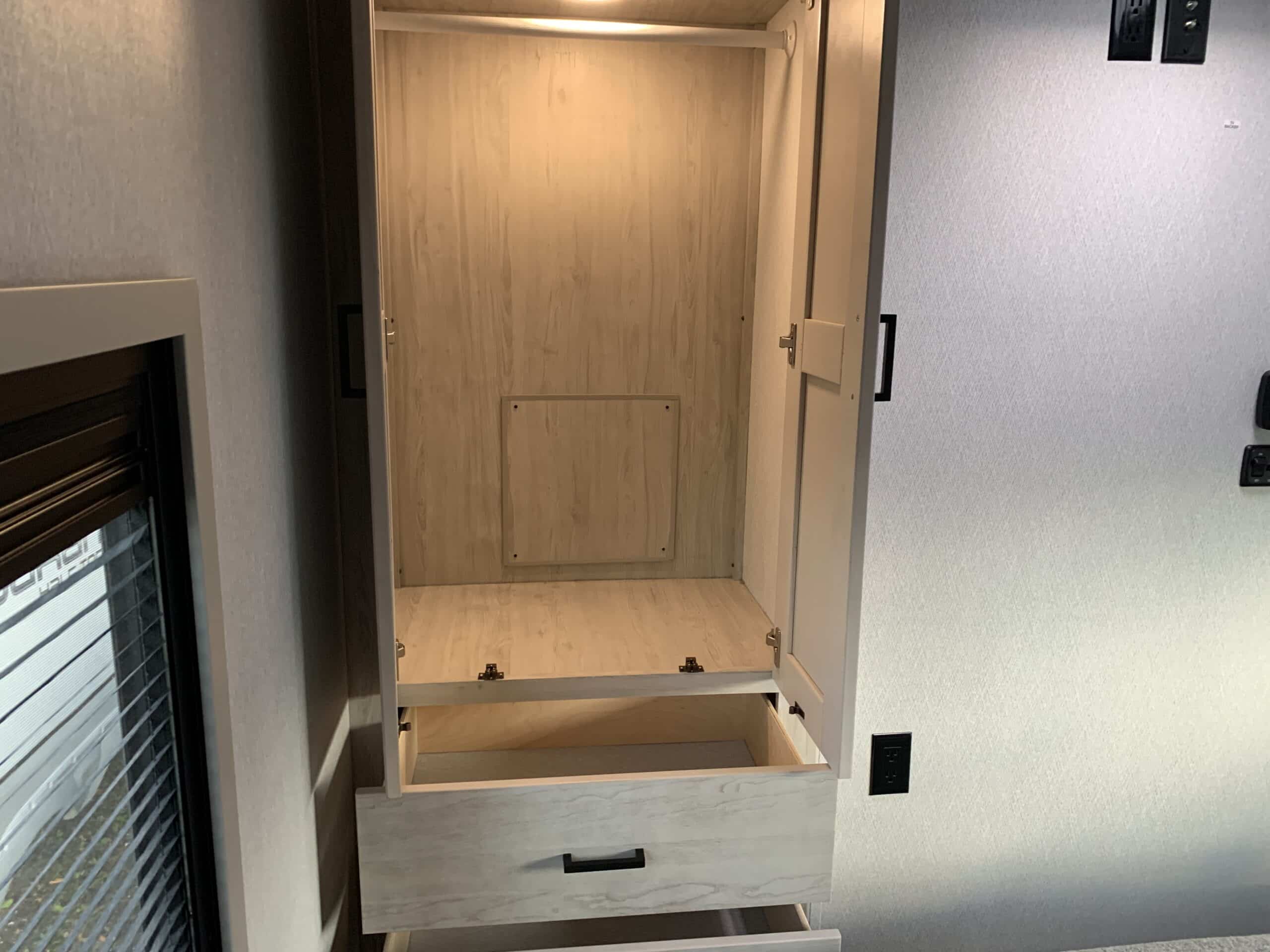 D’abord cette roulotte a un auvent de 20 pieds et une douche pour profiter de l’extérieur sans soucis. Elle vient avec un panneau solaire de 440 watts. Puisque ses marches sont ajustables et très stables vous aurez un accès facile à l’intérieur. De plus une prise 50 ampères pour une meilleure qualité de courant. Les coffres ont également un bel espace de rangement.