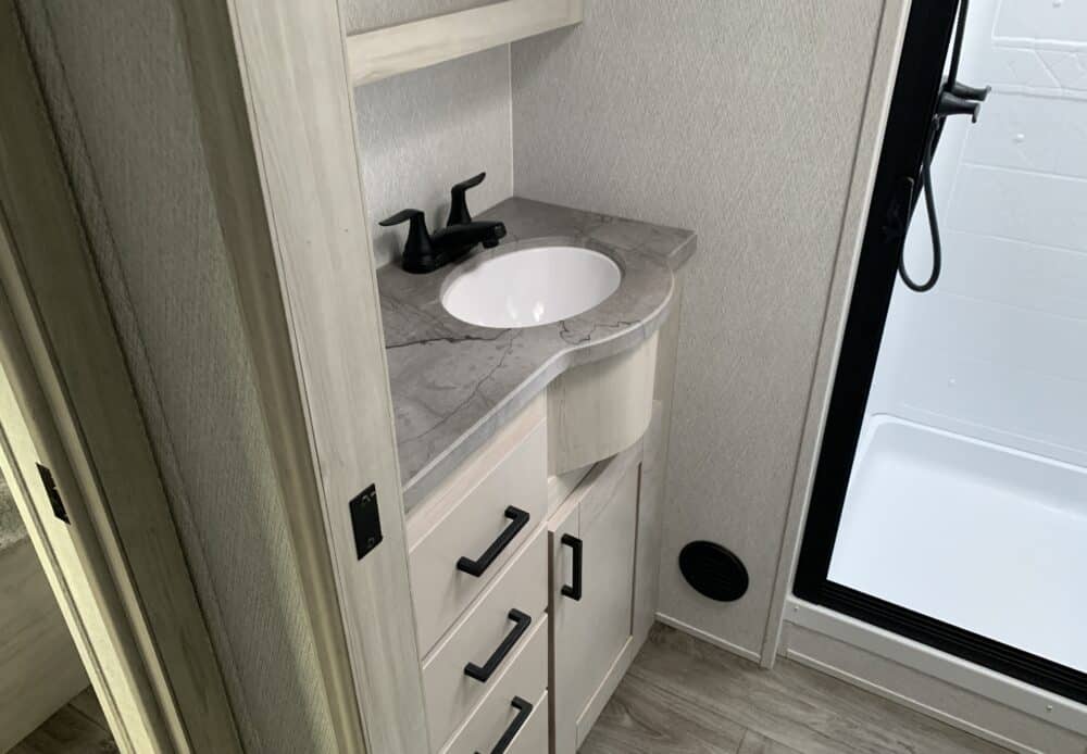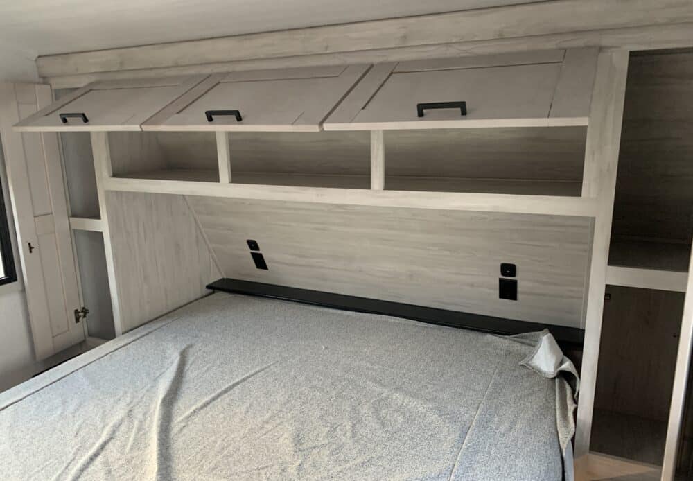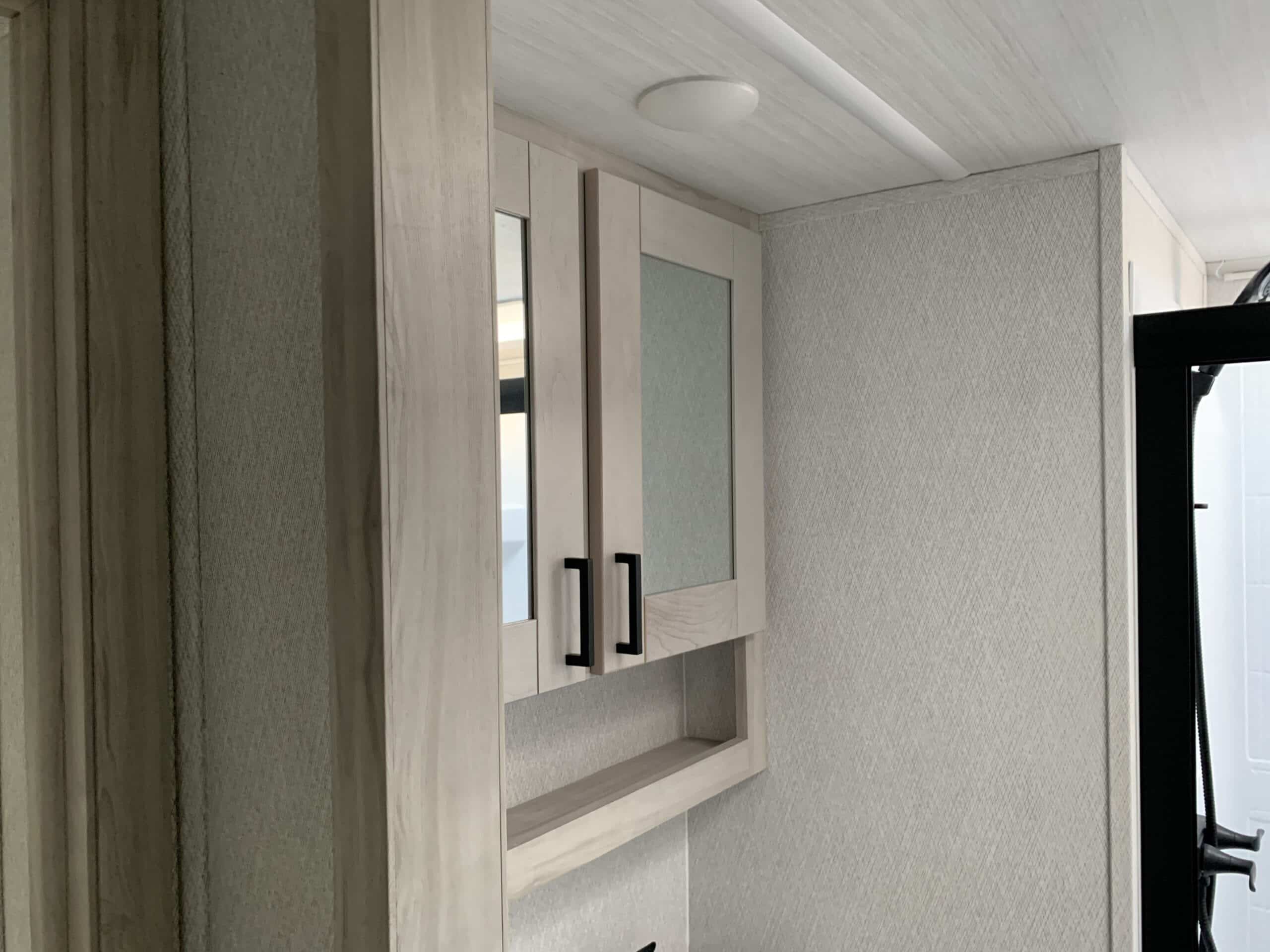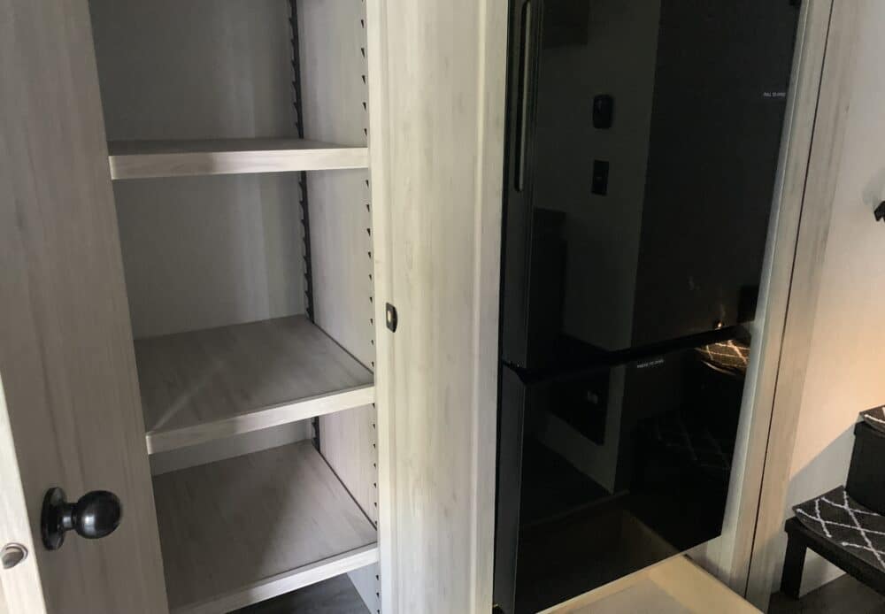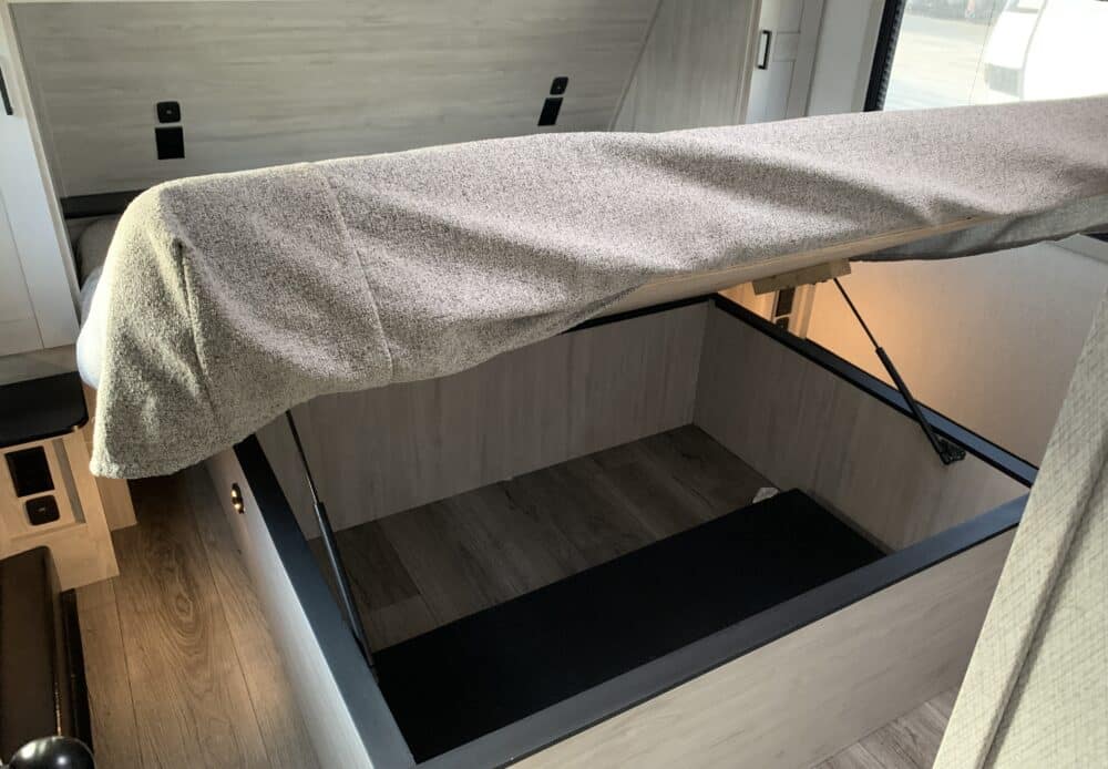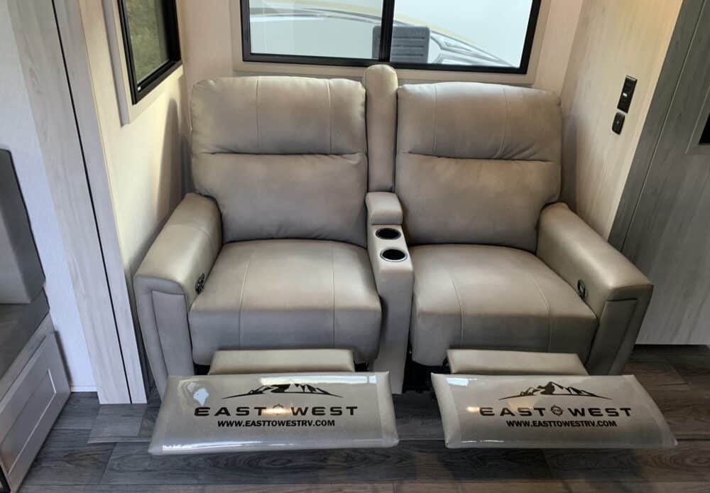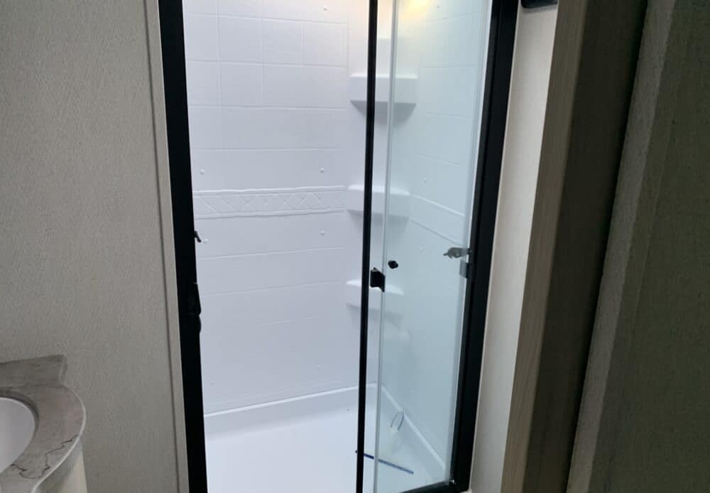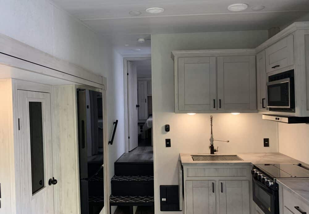 D’abord cette roulotte a un auvent de 20 pieds et une douche pour profiter de l’extérieur sans soucis. Elle vient avec un panneau solaire de 440 watts. Puisque ses marches sont ajustables et très stables vous aurez un accès facile à l’intérieur. De plus une prise 50 ampères pour une meilleure qualité de courant. Les coffres ont également un bel espace de rangement.