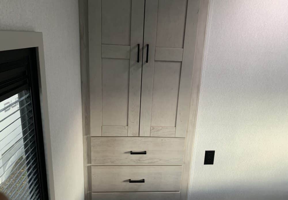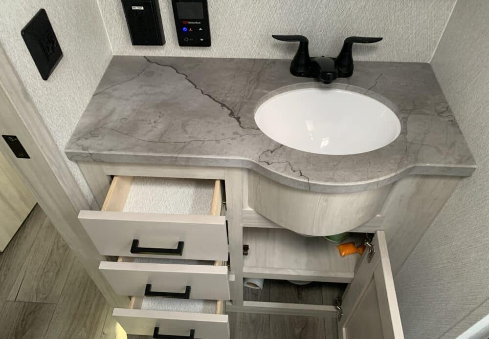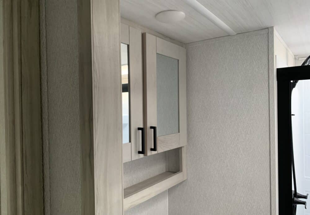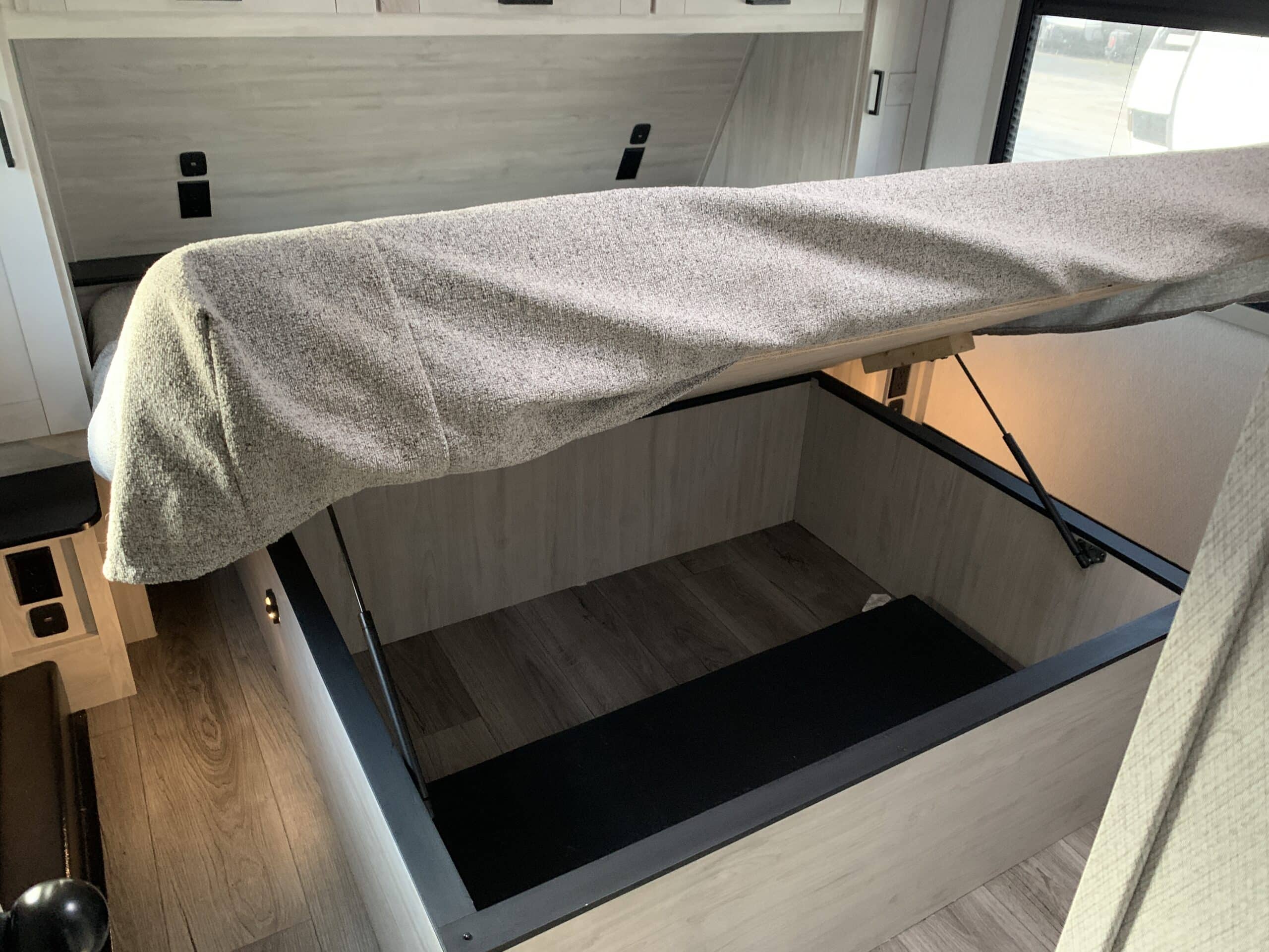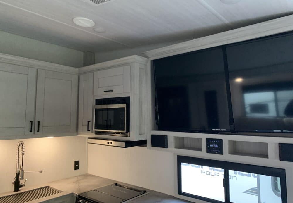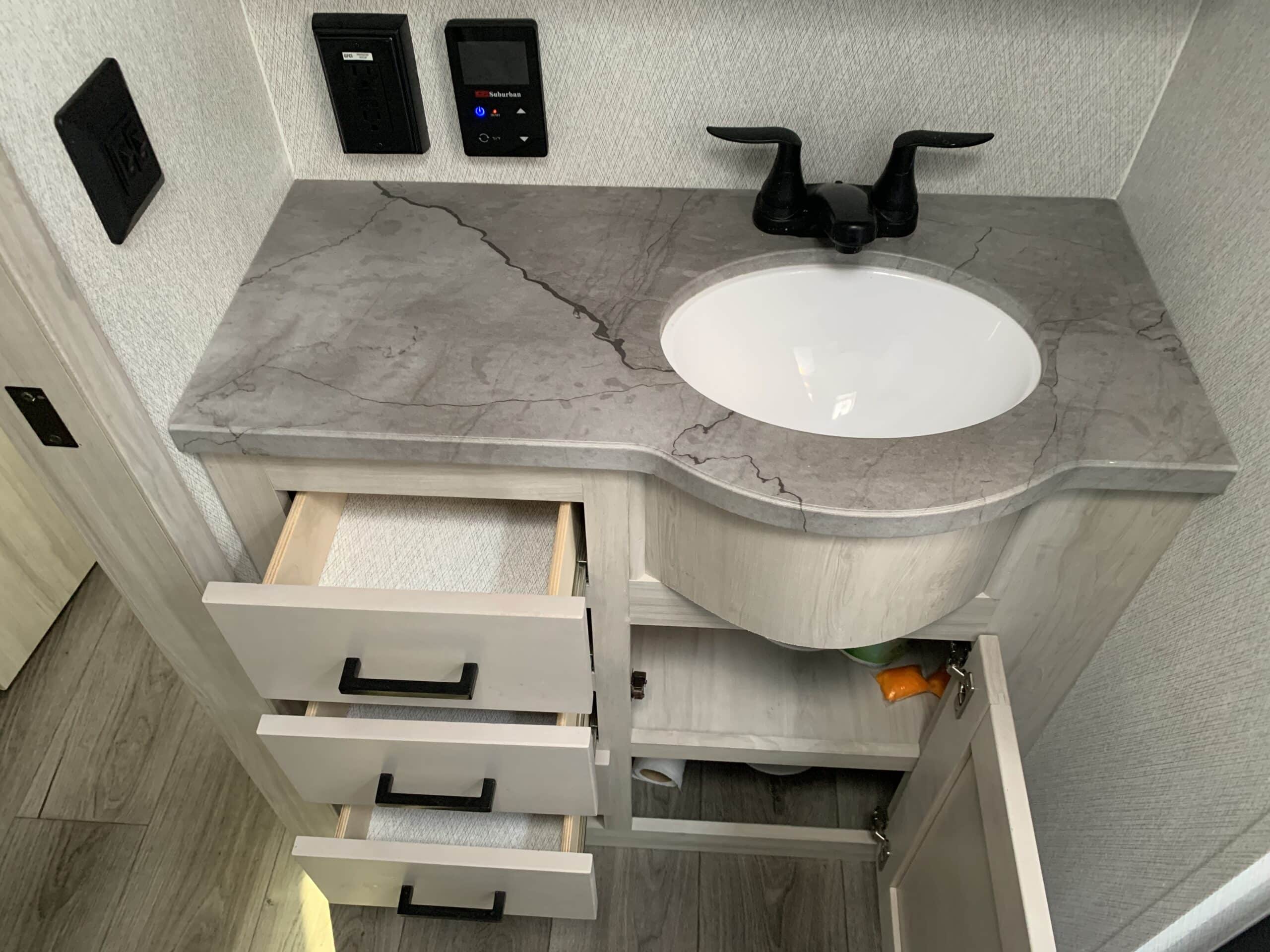 D’abord cette roulotte a un auvent de 20 pieds et une douche pour profiter de l’extérieur sans soucis. Elle vient avec un panneau solaire de 440 watts. Puisque ses marches sont ajustables et très stables vous aurez un accès facile à l’intérieur. De plus une prise 50 ampères pour une meilleure qualité de courant. Les coffres ont également un bel espace de rangement.