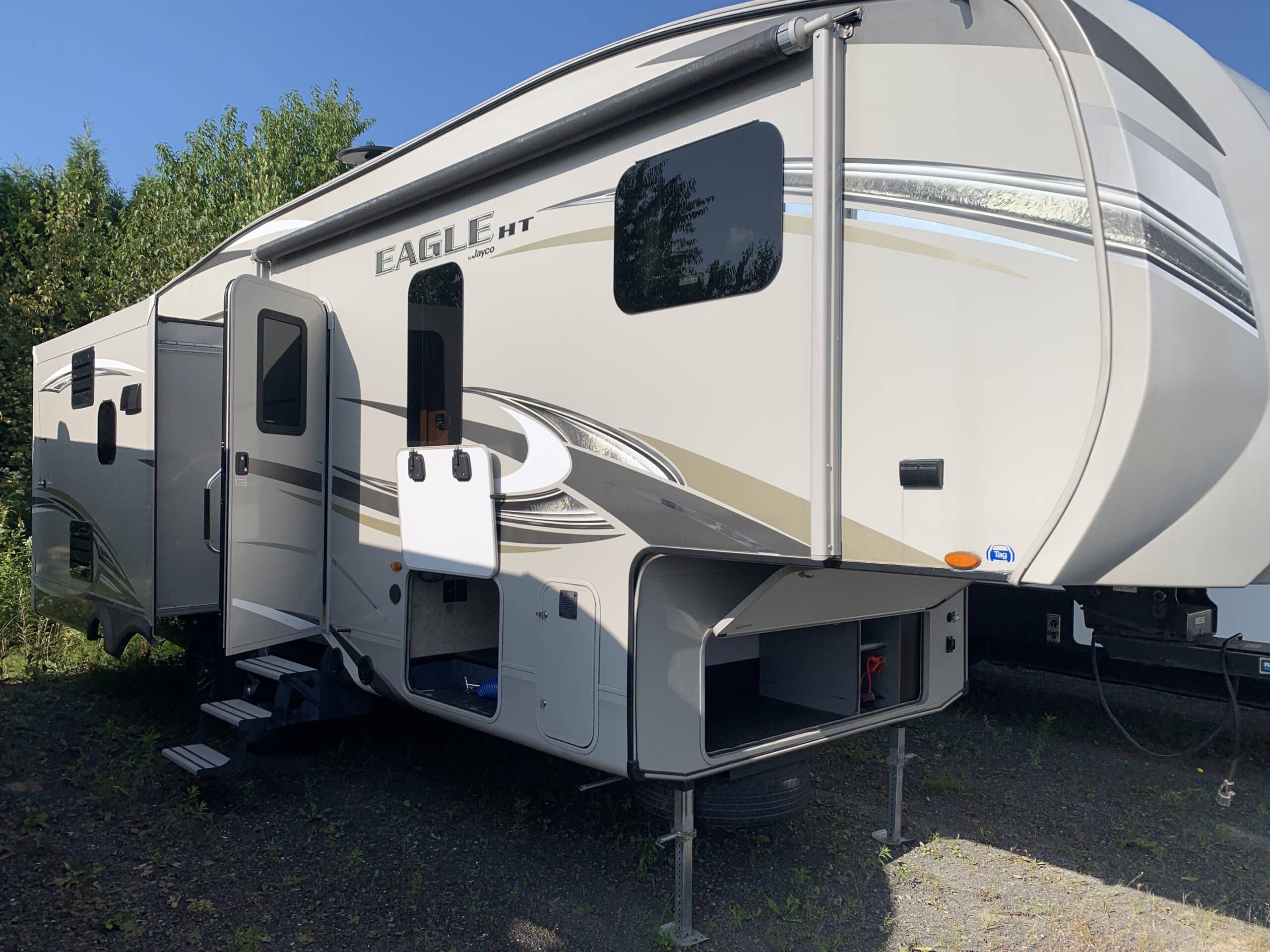 2018 Jayco 28.5R, roulotte à sellette pour couple de 33, à 9055 lbs avec 2 essieux, extérieur en fibre et 2 extensions.
