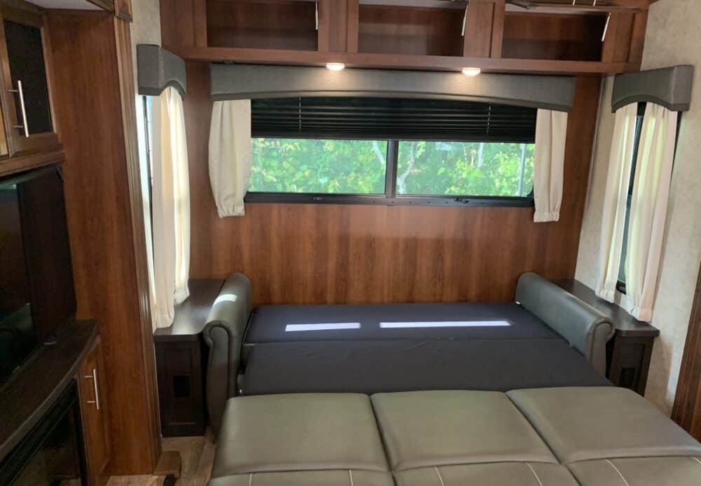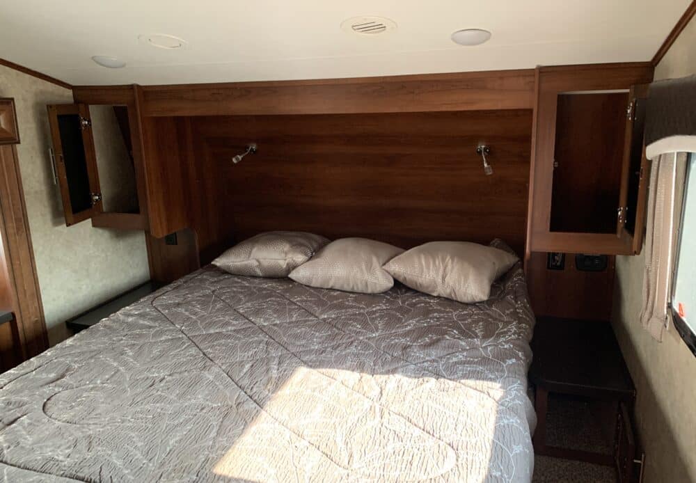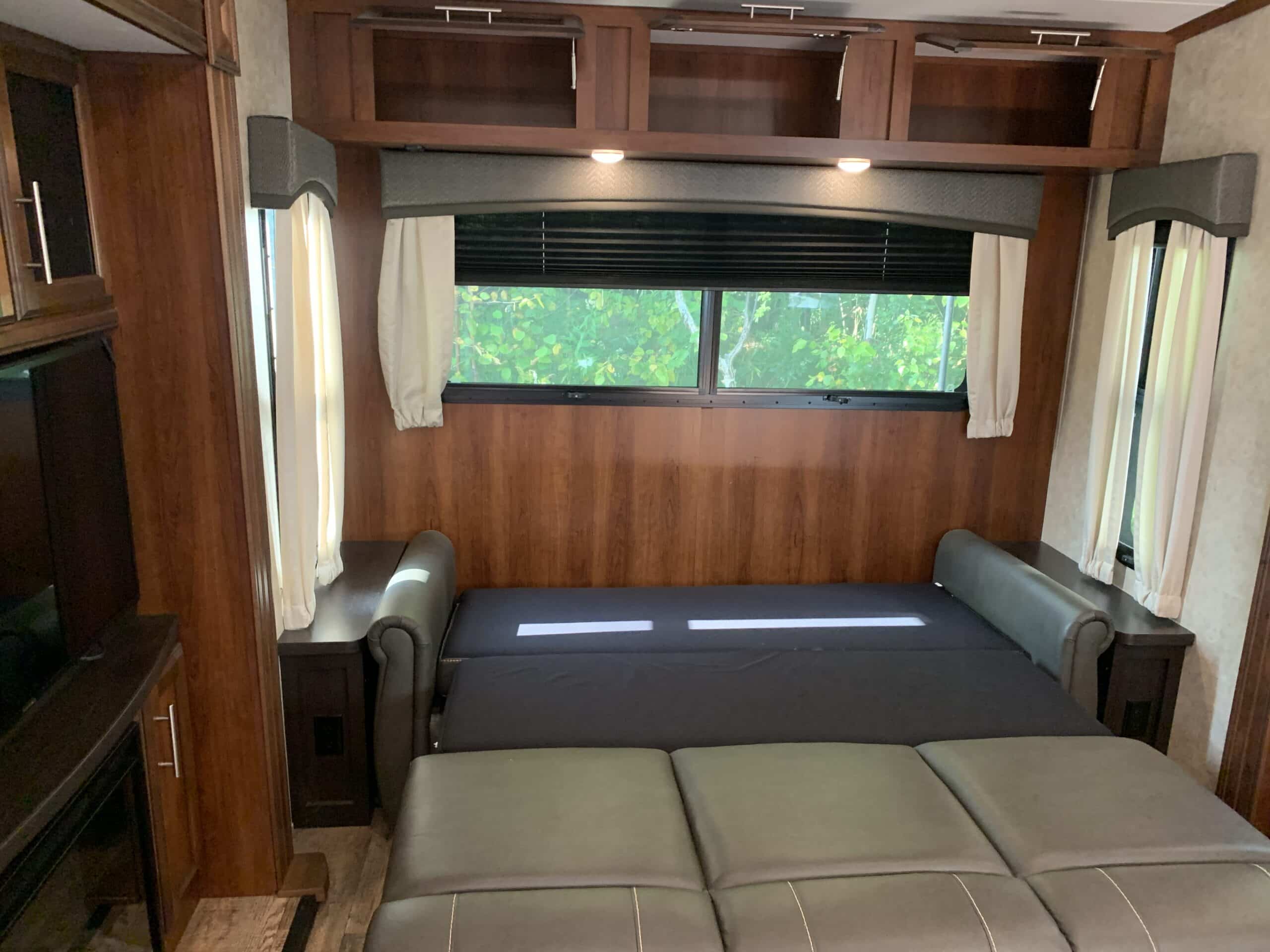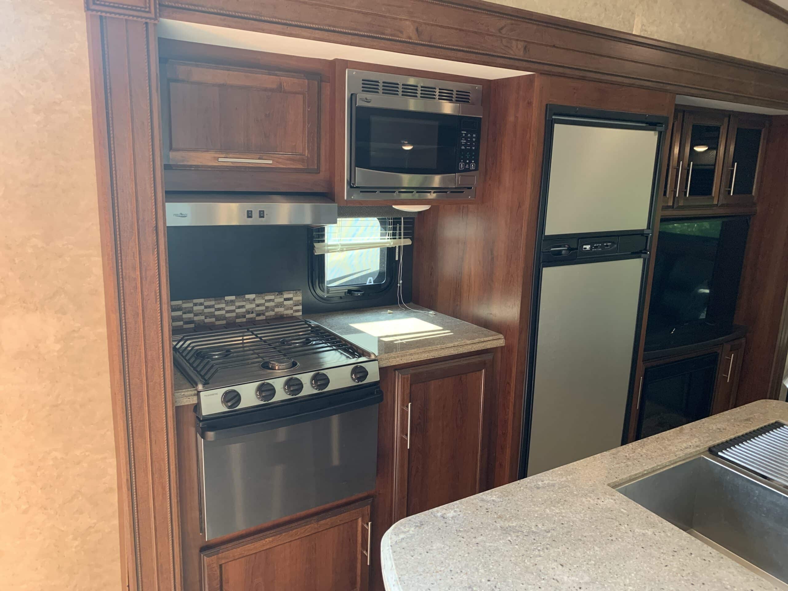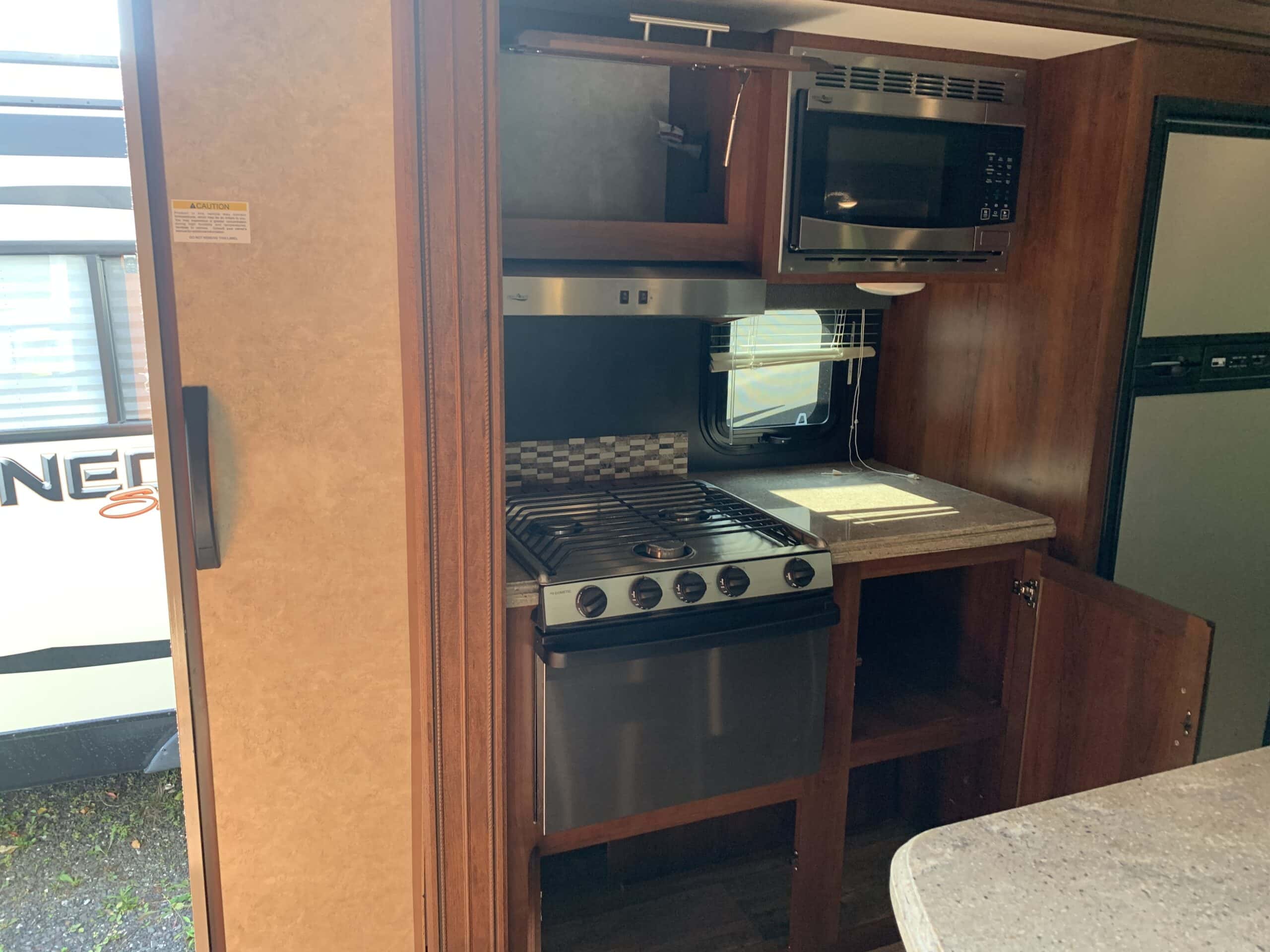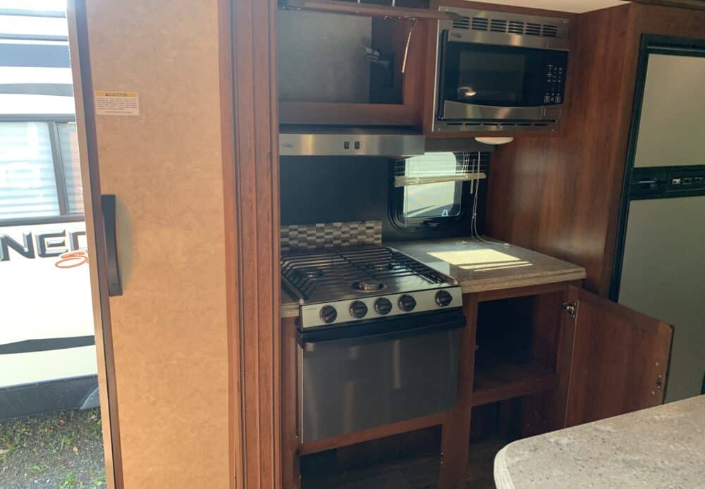 De plus, la Jayco 28.5R a un air climatisé de 15000 btu et un foyer qui tempéreront l’ambiance désirée. Par ailleurs, la cuisinière a un four et 3 brûleurs, un réfrigérateur gaz/électrique et un micro-ondes. De plus, il y a une table avec chaises, un sofa lit et une causeuse. Enfin, le système audio vous permettra d’écouter votre musique préférée.