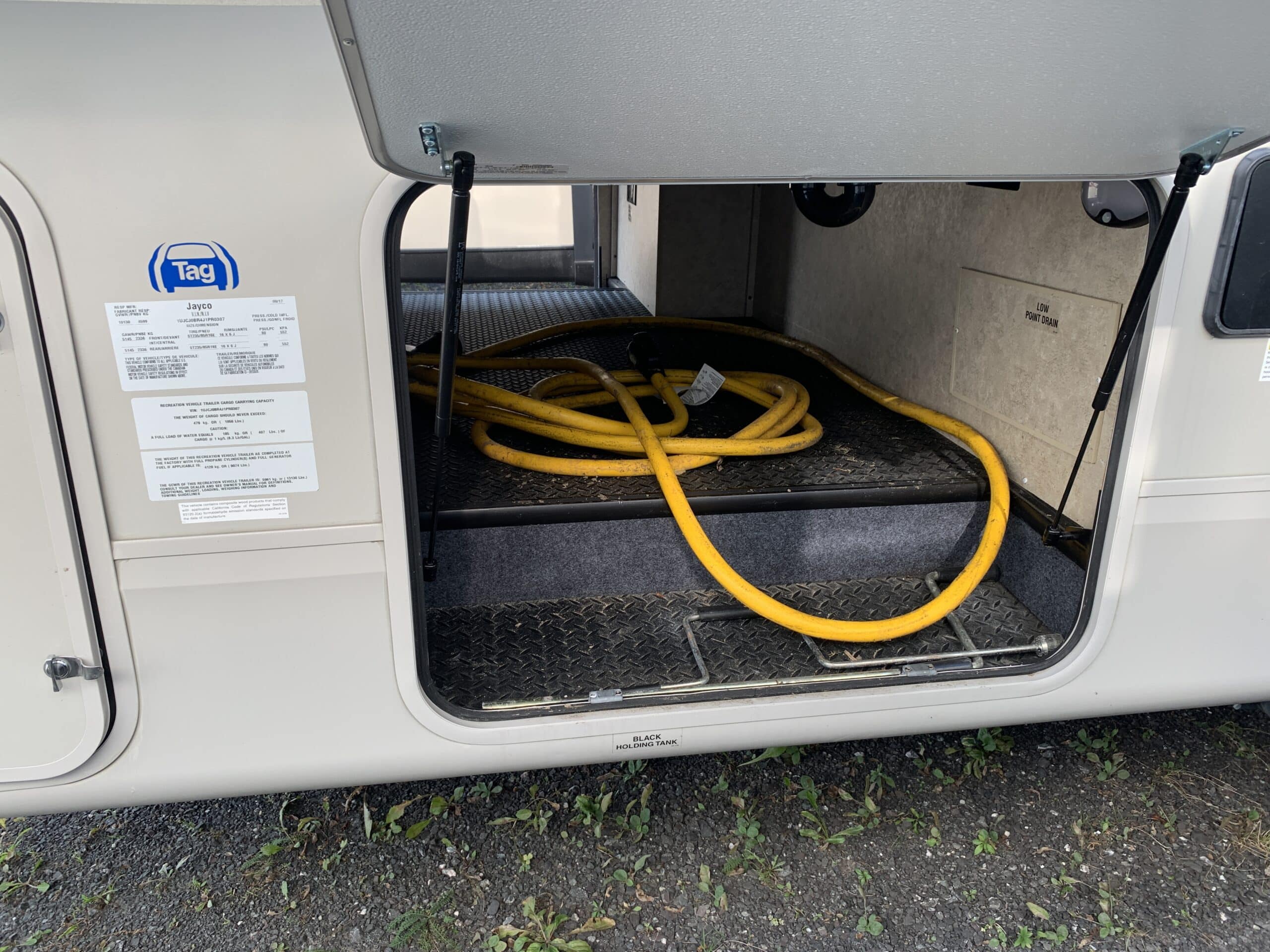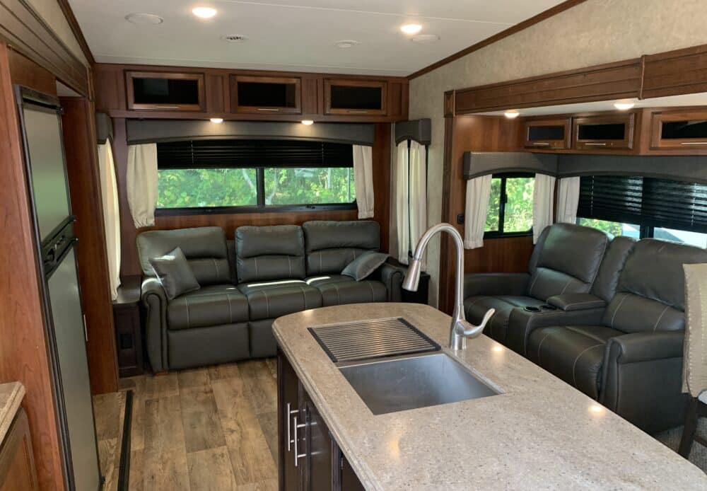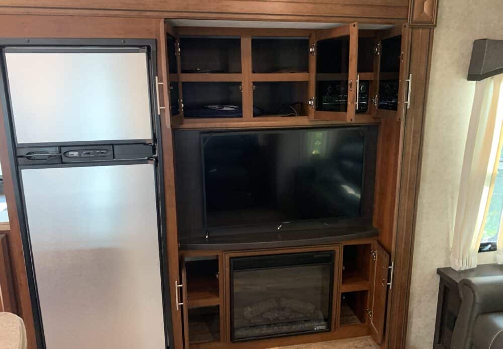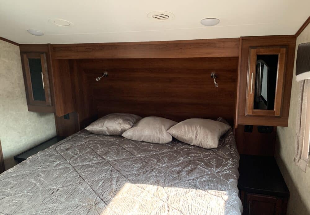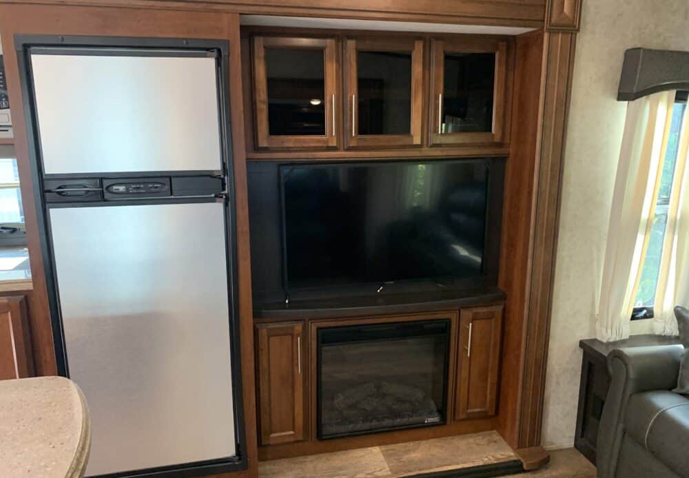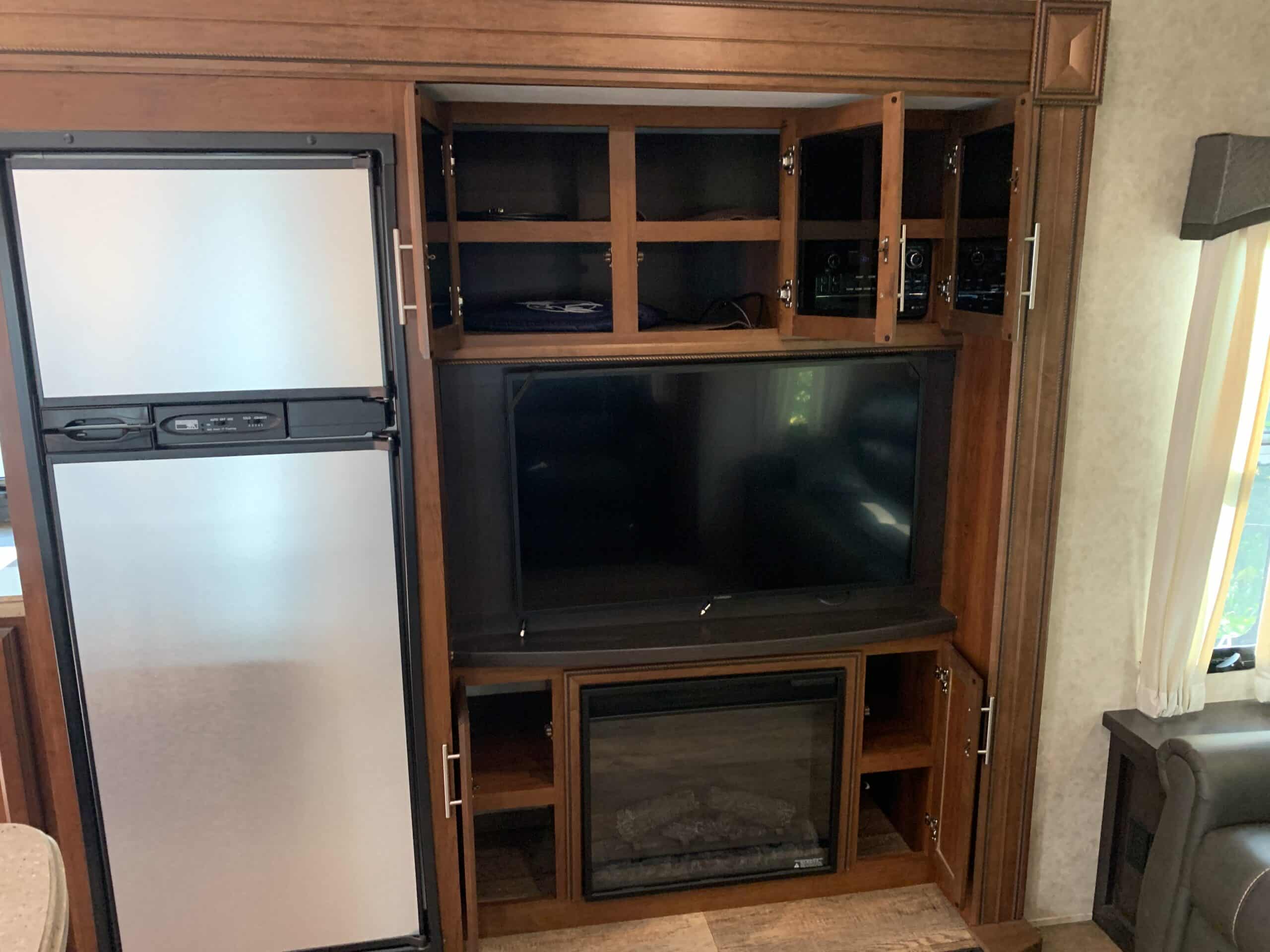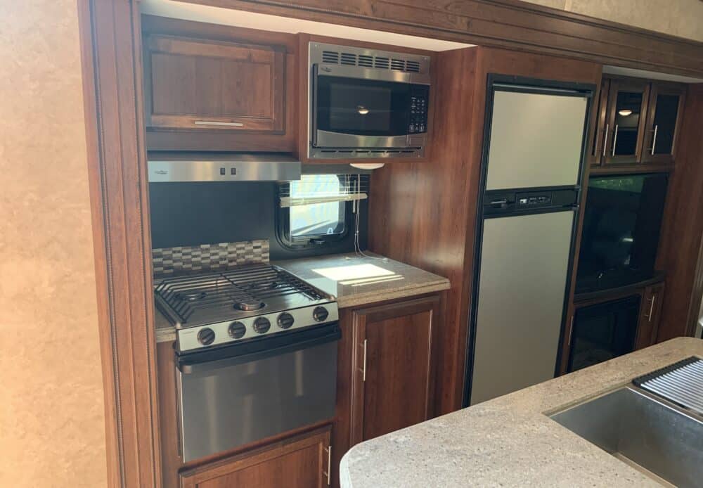 De plus, la Jayco 28.5R a un air climatisé de 15000 btu et un foyer qui tempéreront l’ambiance désirée. Par ailleurs, la cuisinière a un four et 3 brûleurs, un réfrigérateur gaz/électrique et un micro-ondes. De plus, il y a une table avec chaises, un sofa lit et une causeuse. Enfin, le système audio vous permettra d’écouter votre musique préférée.