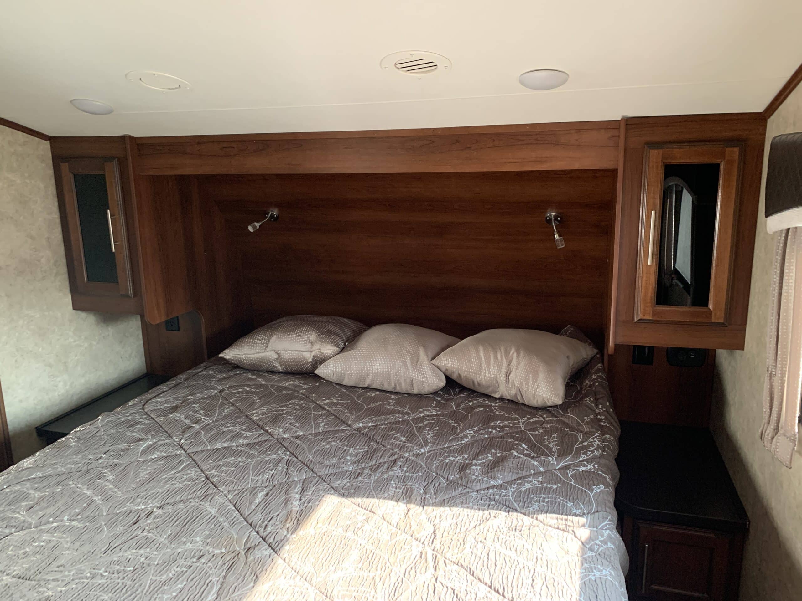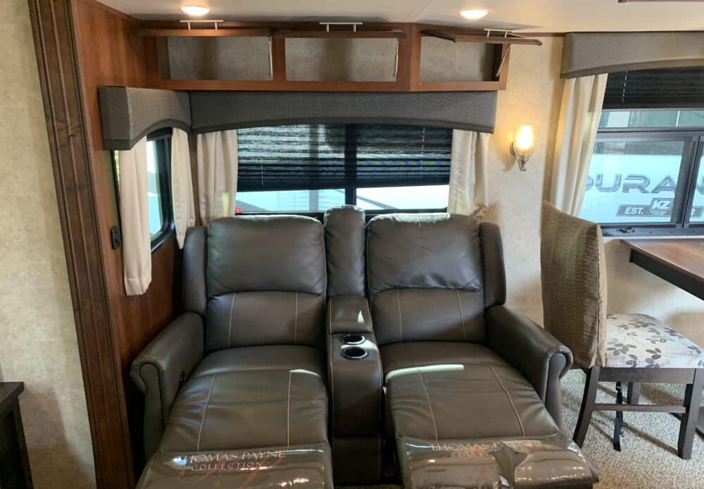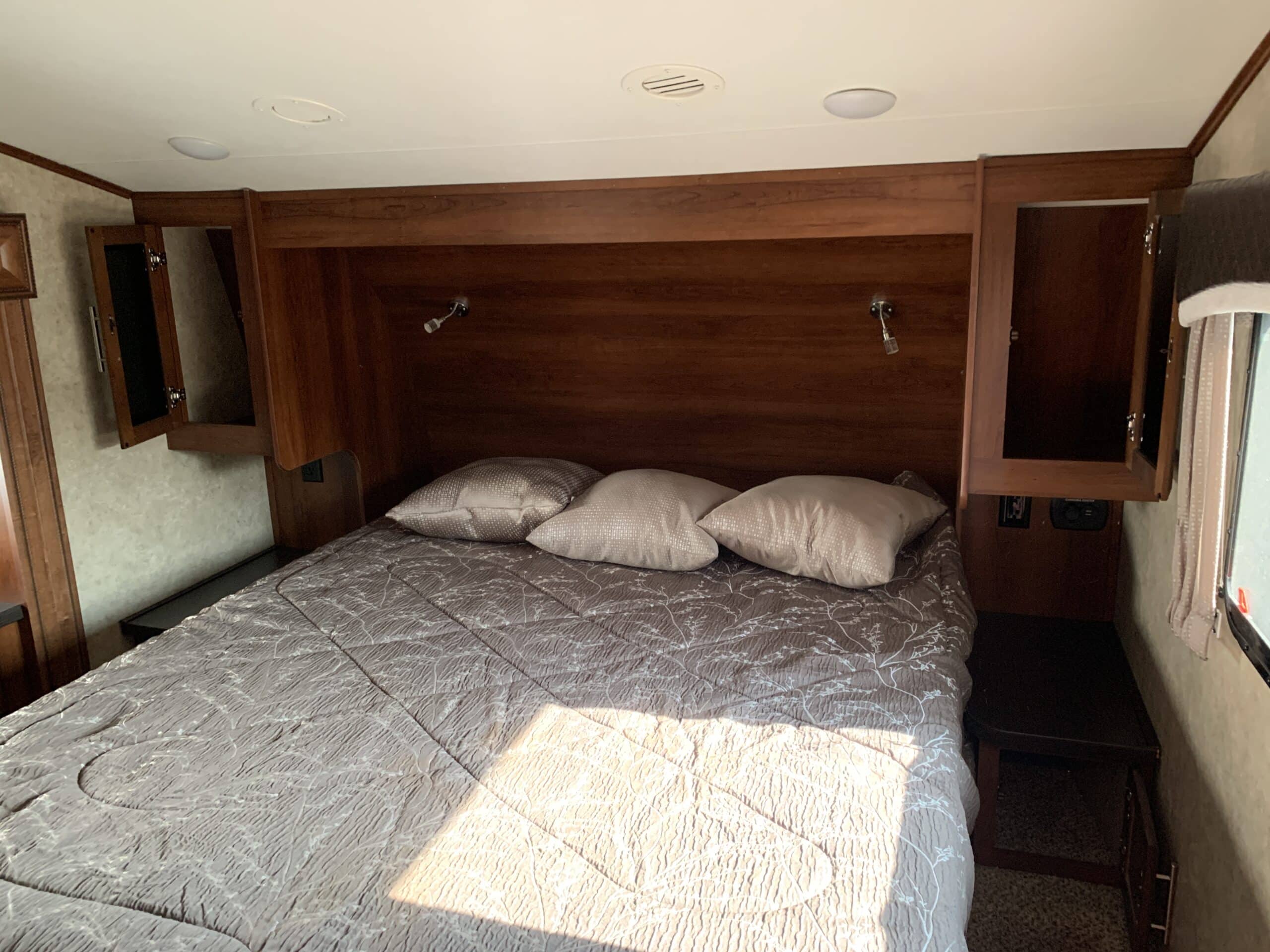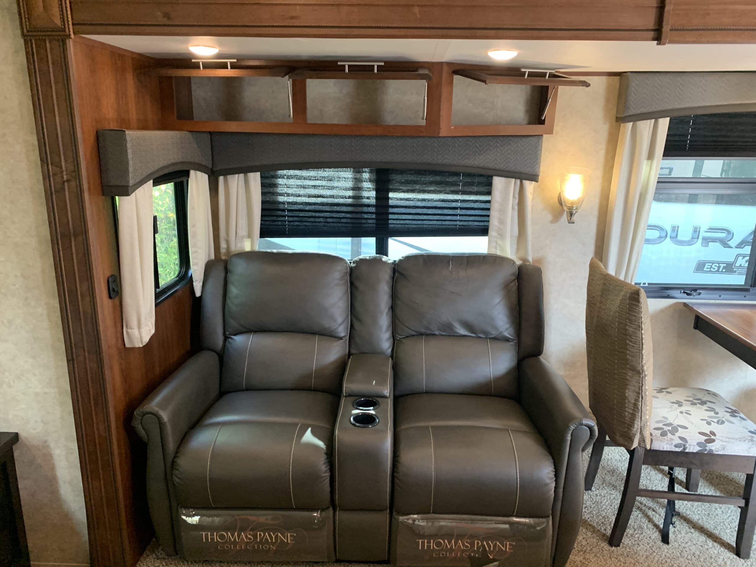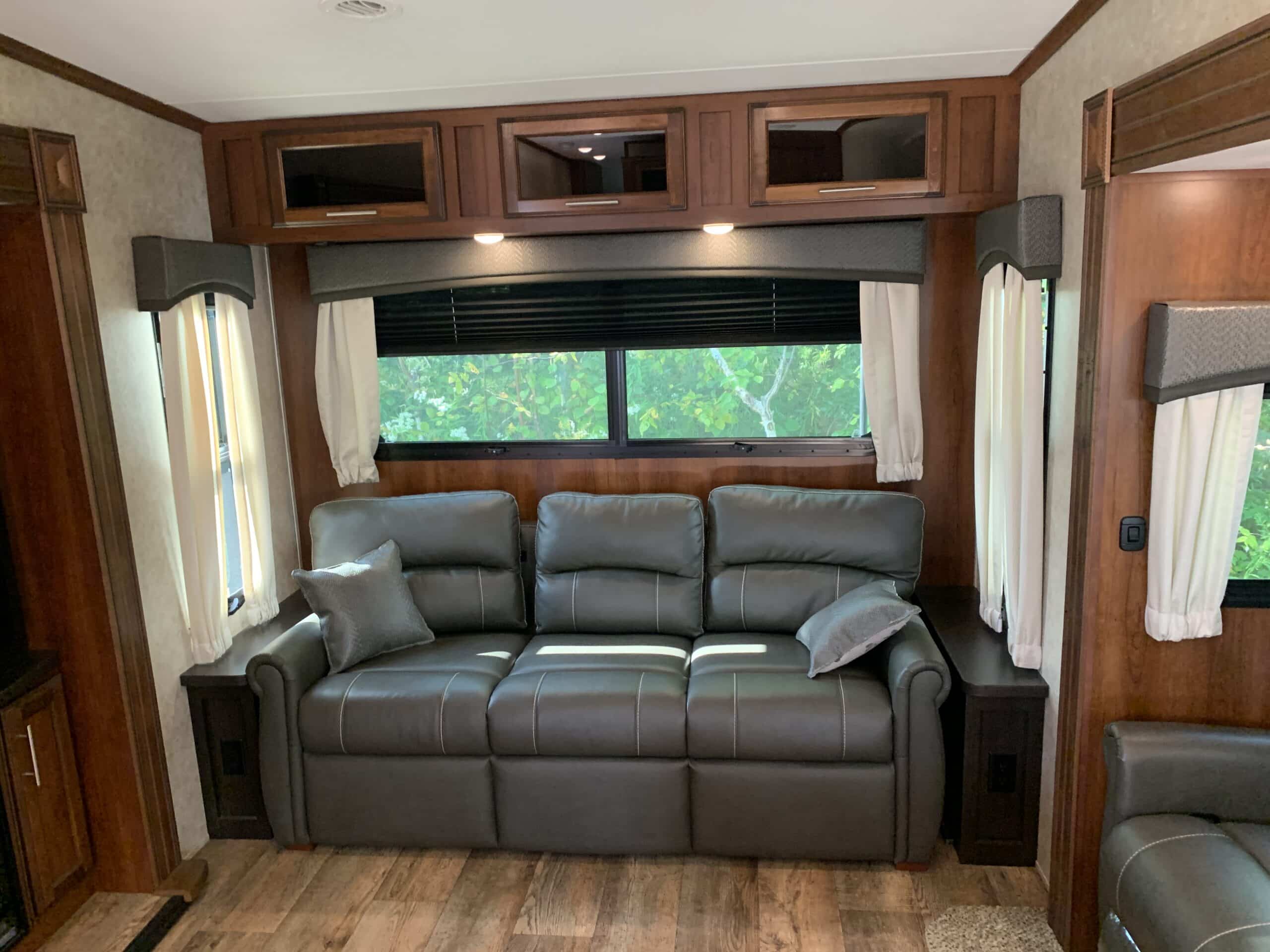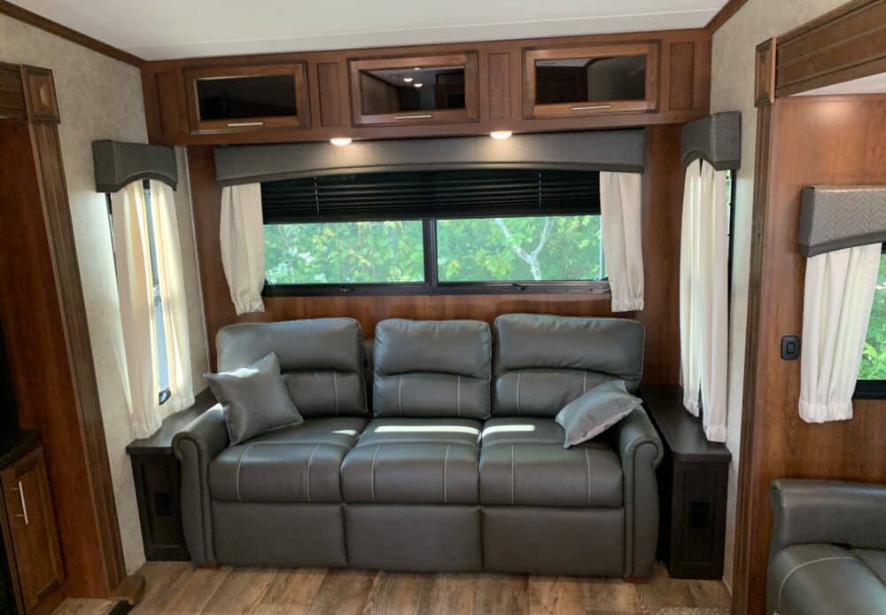 De plus, la Jayco 28.5R a un air climatisé de 15000 btu et un foyer qui tempéreront l’ambiance désirée. Par ailleurs, la cuisinière a un four et 3 brûleurs, un réfrigérateur gaz/électrique et un micro-ondes. De plus, il y a une table avec chaises, un sofa lit et une causeuse. Enfin, le système audio vous permettra d’écouter votre musique préférée.