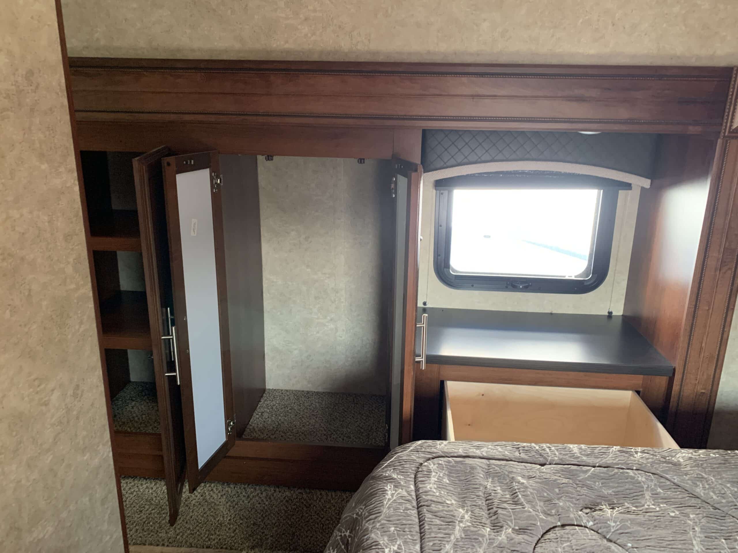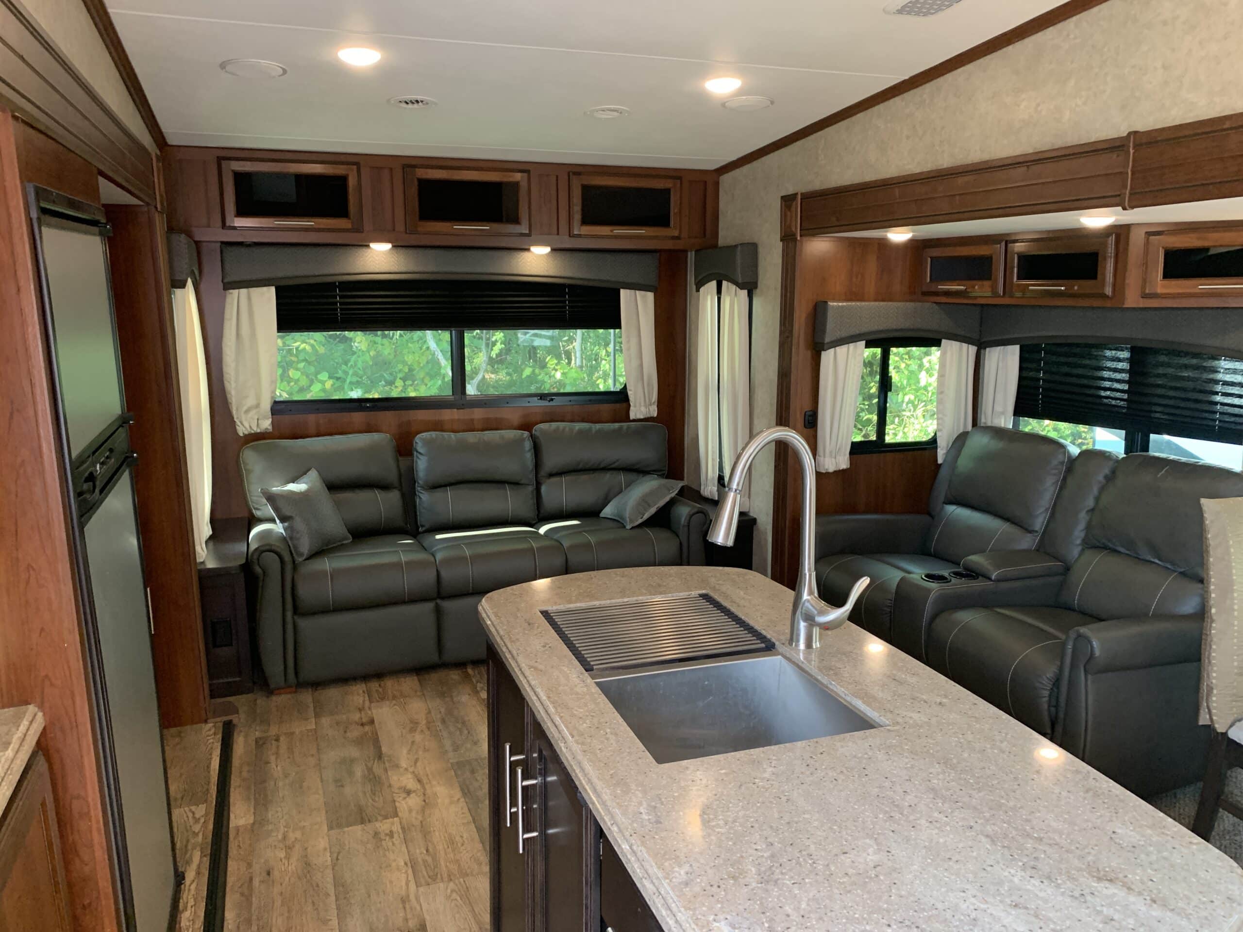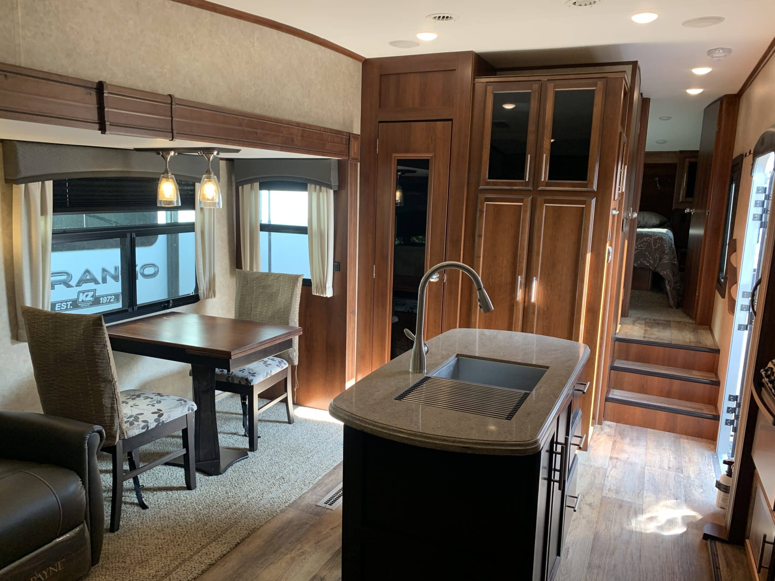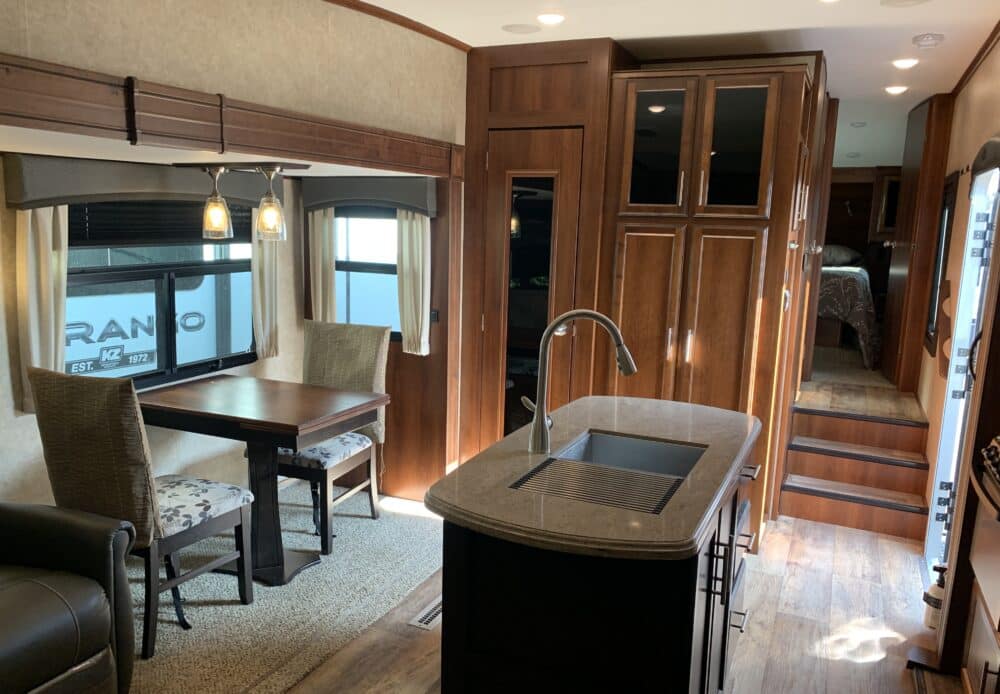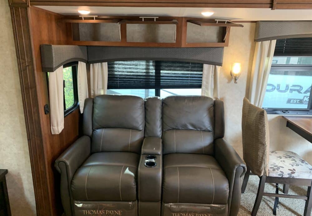 De plus, la Jayco 28.5R a un air climatisé de 15000 btu et un foyer qui tempéreront l’ambiance désirée. Par ailleurs, la cuisinière a un four et 3 brûleurs, un réfrigérateur gaz/électrique et un micro-ondes. De plus, il y a une table avec chaises, un sofa lit et une causeuse. Enfin, le système audio vous permettra d’écouter votre musique préférée.