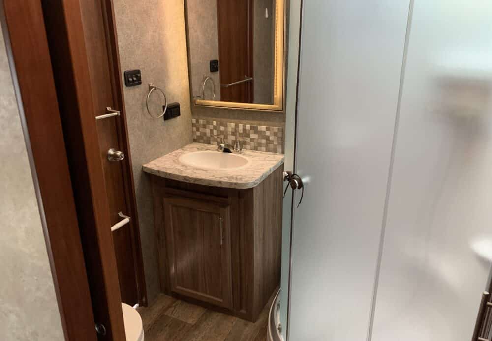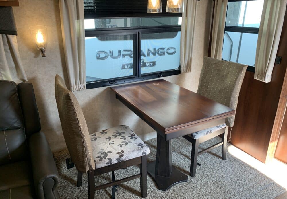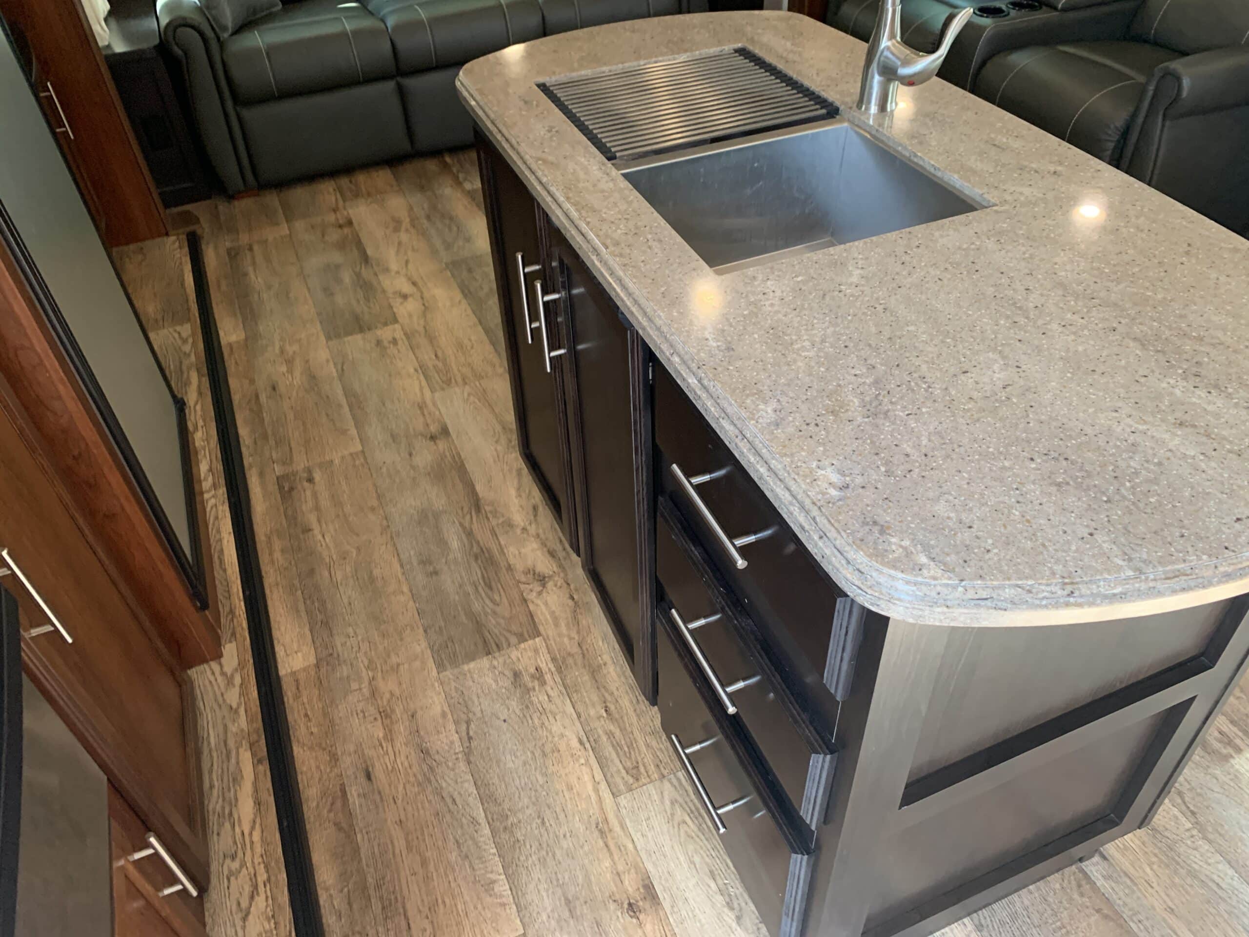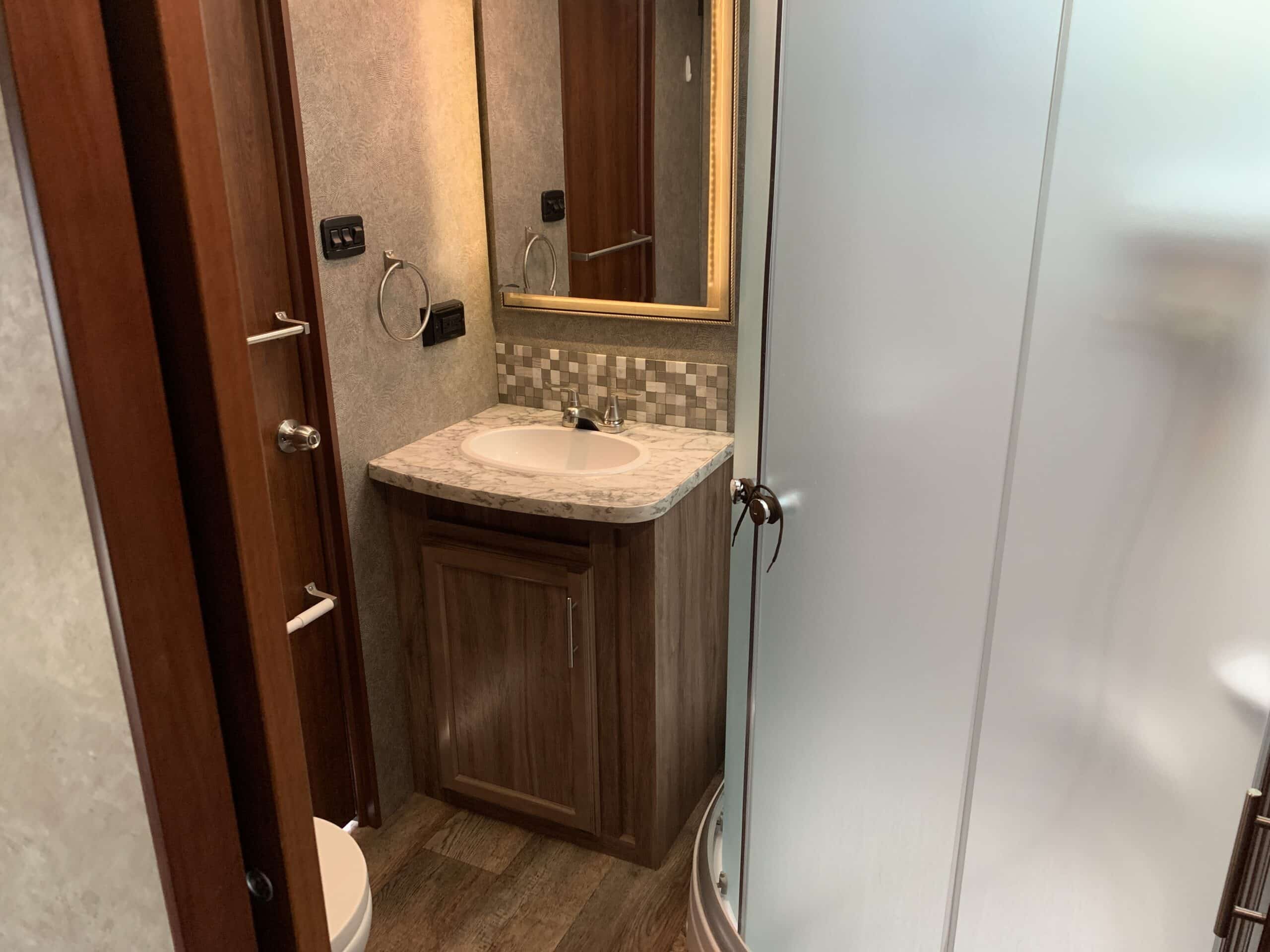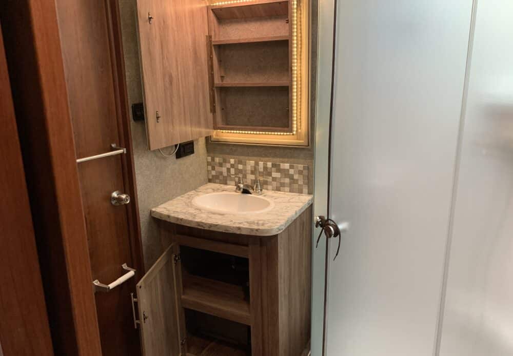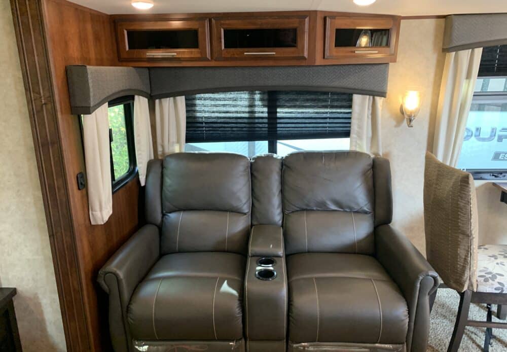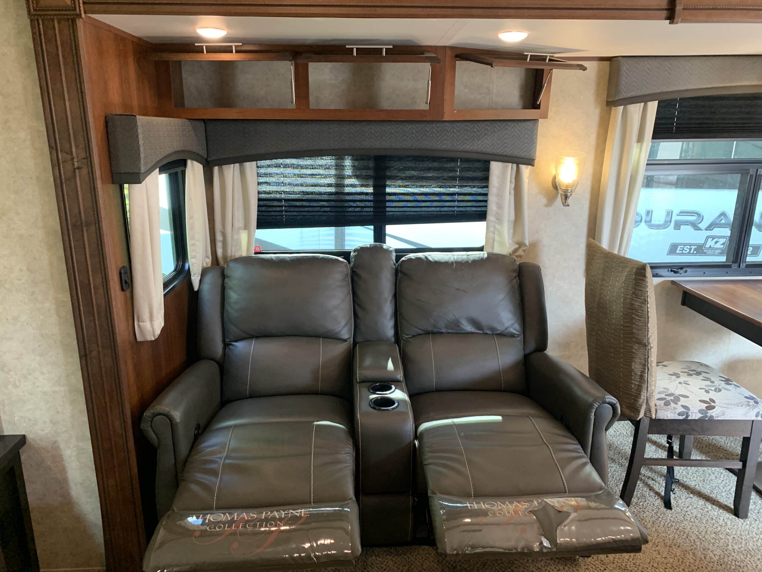 De plus, la Jayco 28.5R a un air climatisé de 15000 btu et un foyer qui tempéreront l’ambiance désirée. Par ailleurs, la cuisinière a un four et 3 brûleurs, un réfrigérateur gaz/électrique et un micro-ondes. De plus, il y a une table avec chaises, un sofa lit et une causeuse. Enfin, le système audio vous permettra d’écouter votre musique préférée.