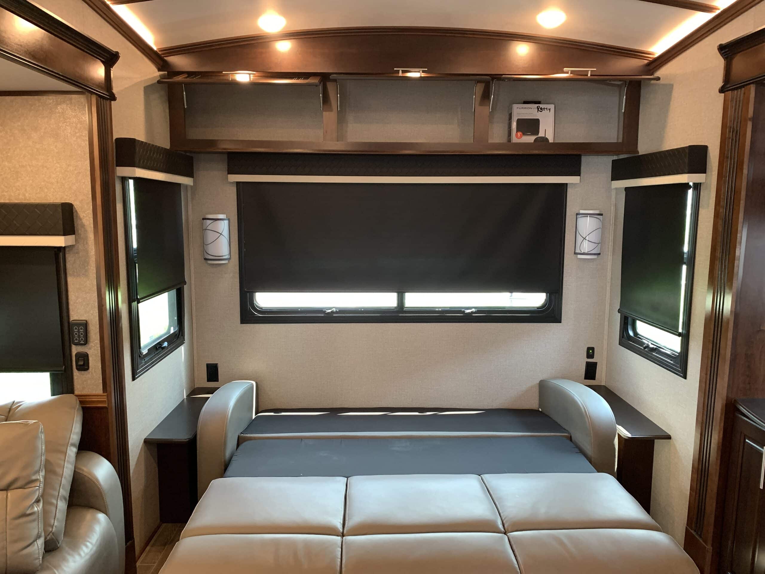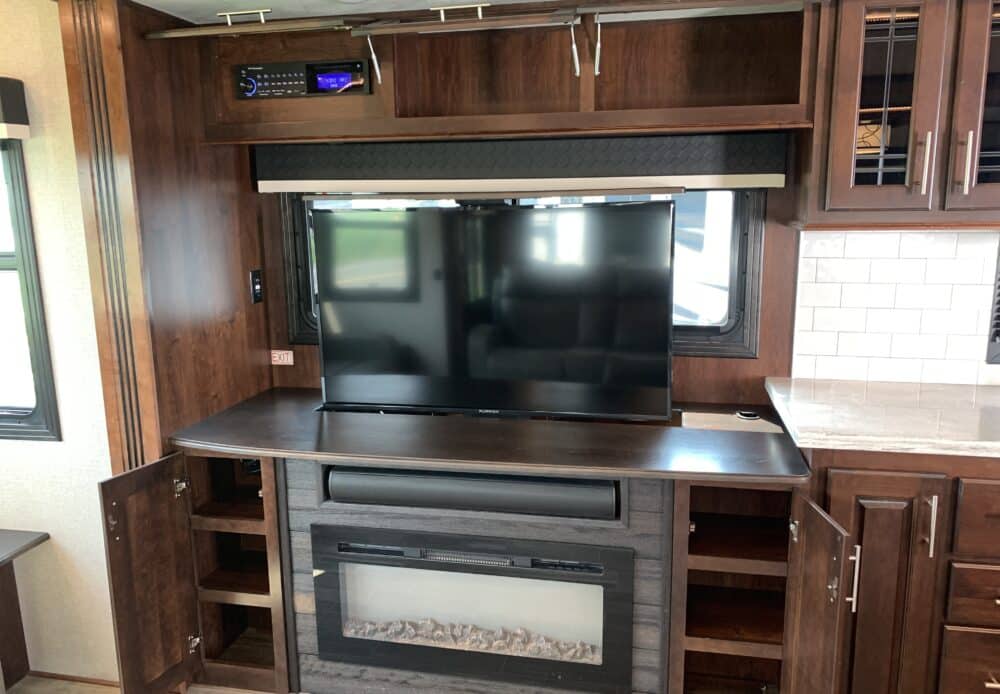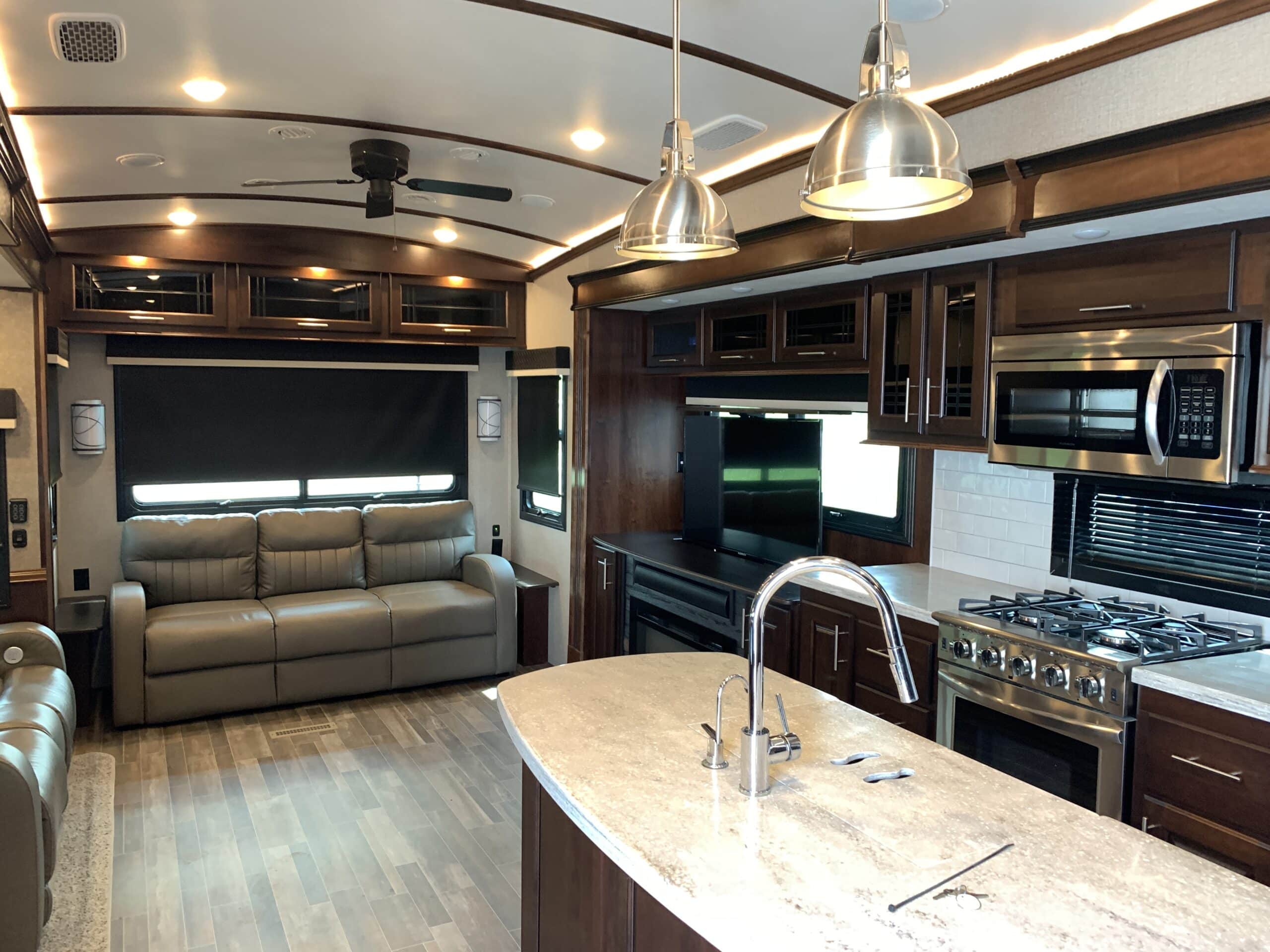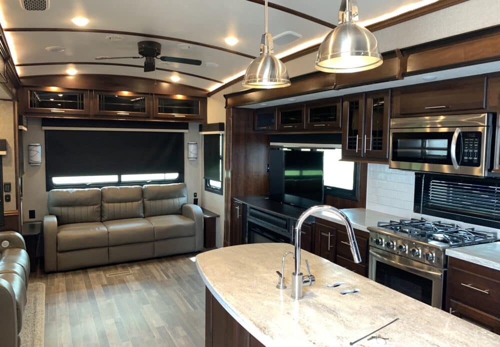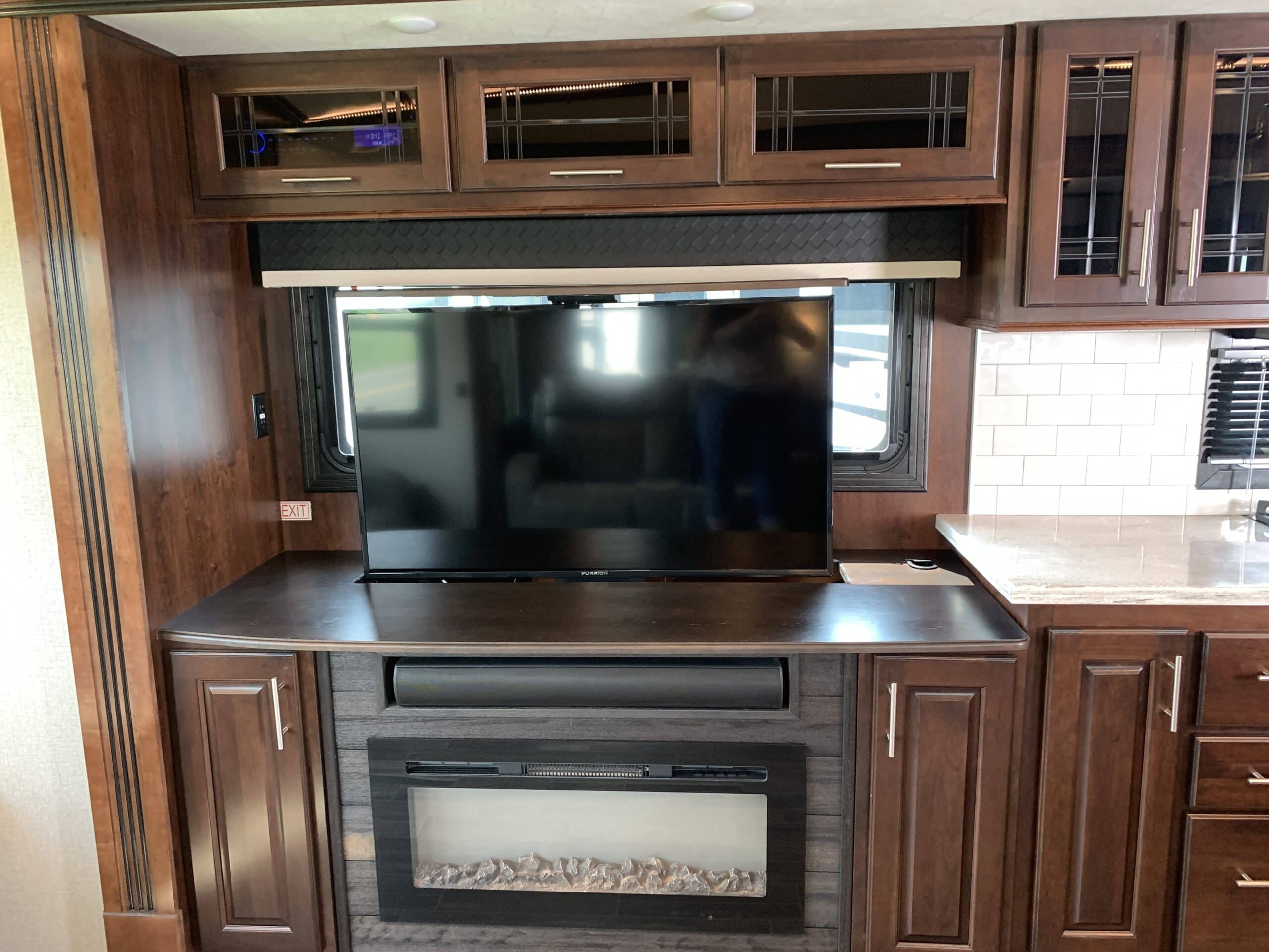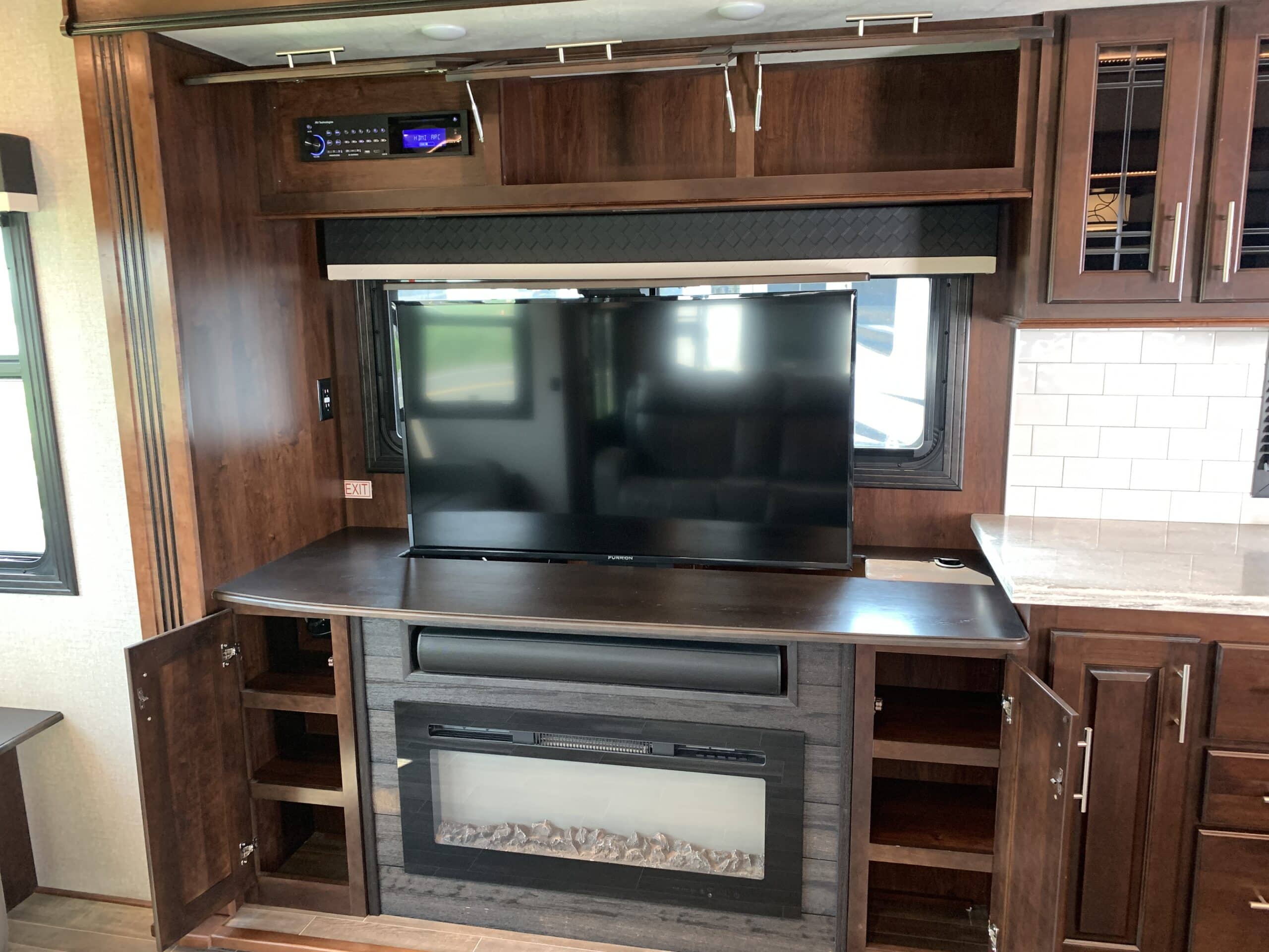 De plus, la Pinnacle 36PKTS a un air climatisé de 15000 btu. et un foyer électrique qui tempéreront l’ambiance désirée. L’aire principale avec son îlot central donne un bel espace de vie. Par ailleurs la cuisine a un micro-ondes, un poêle avec 4 brûleurs, un frigo et un très grand garde-manger. Aussi on y retrouve une table avec chaises. Enfin, le système audio vous permettra d’écouter votre musique préférée.