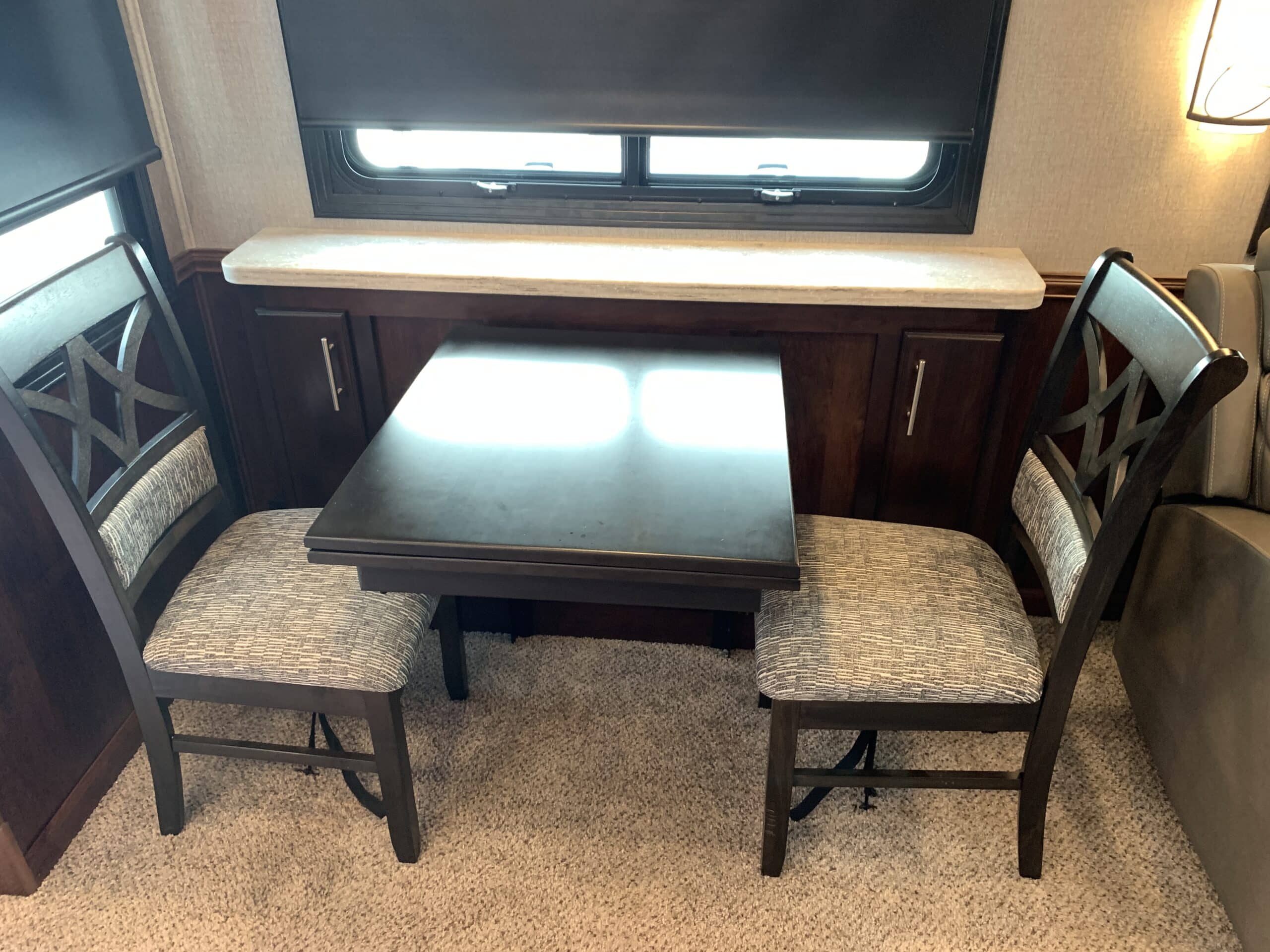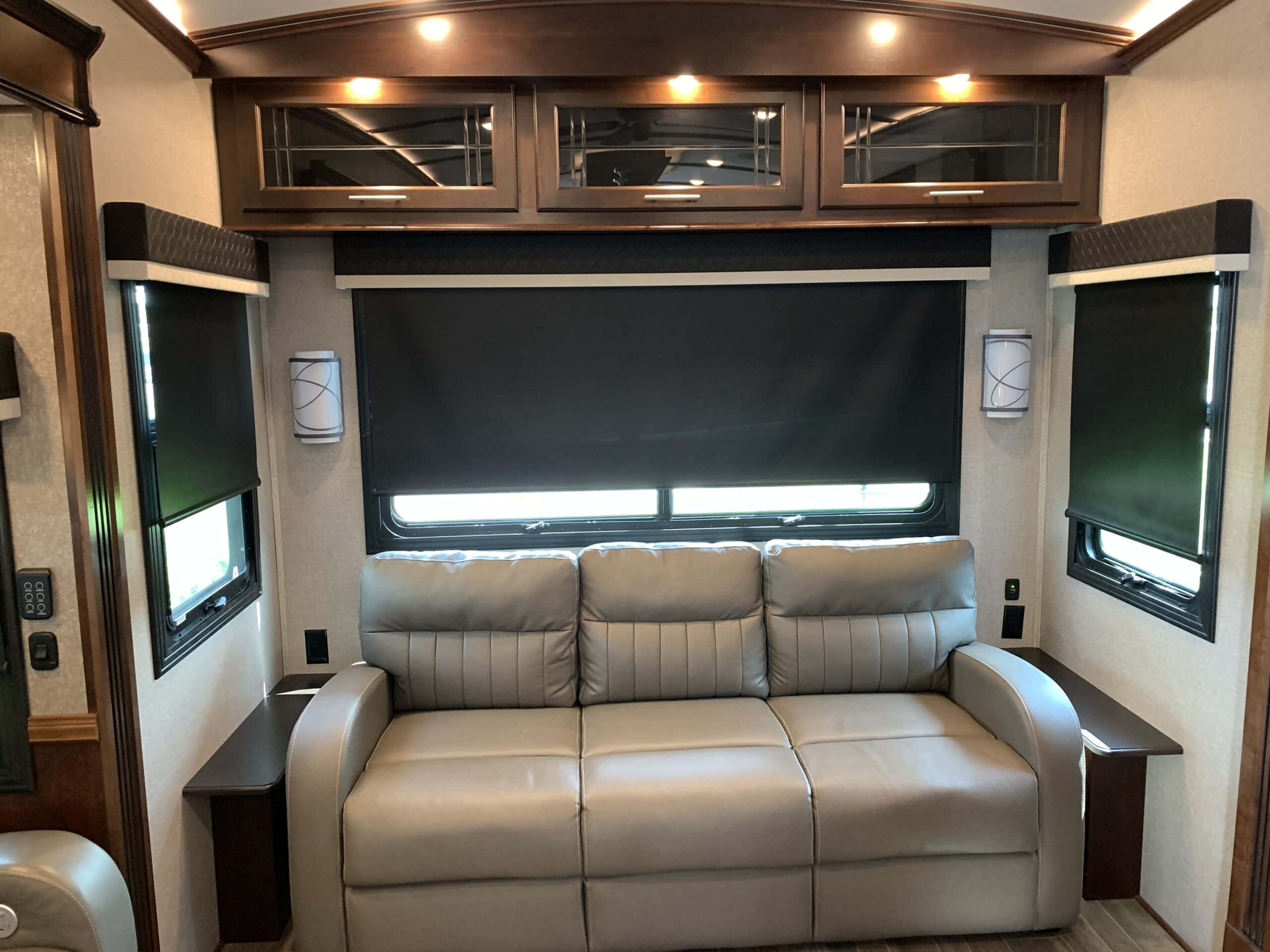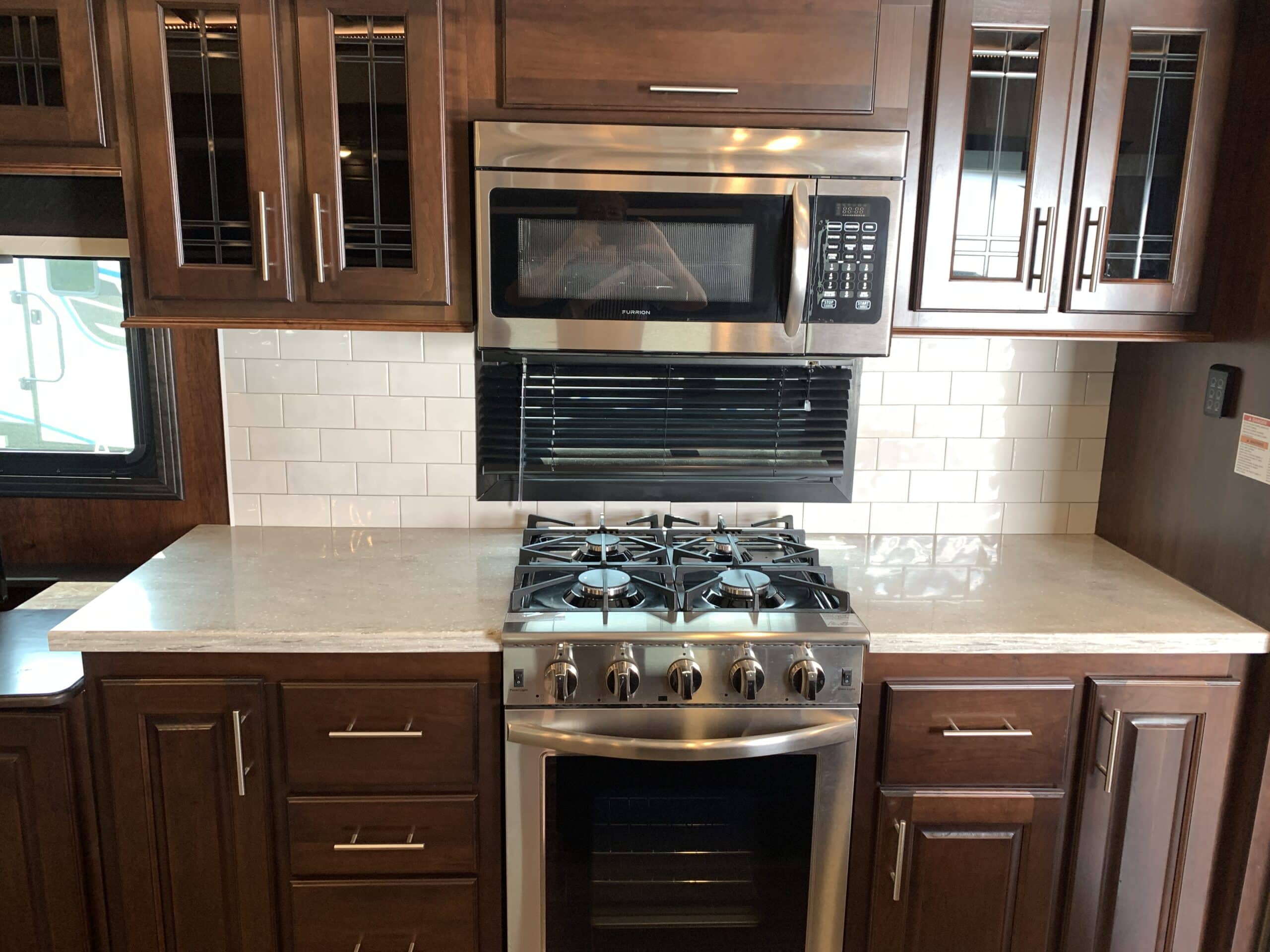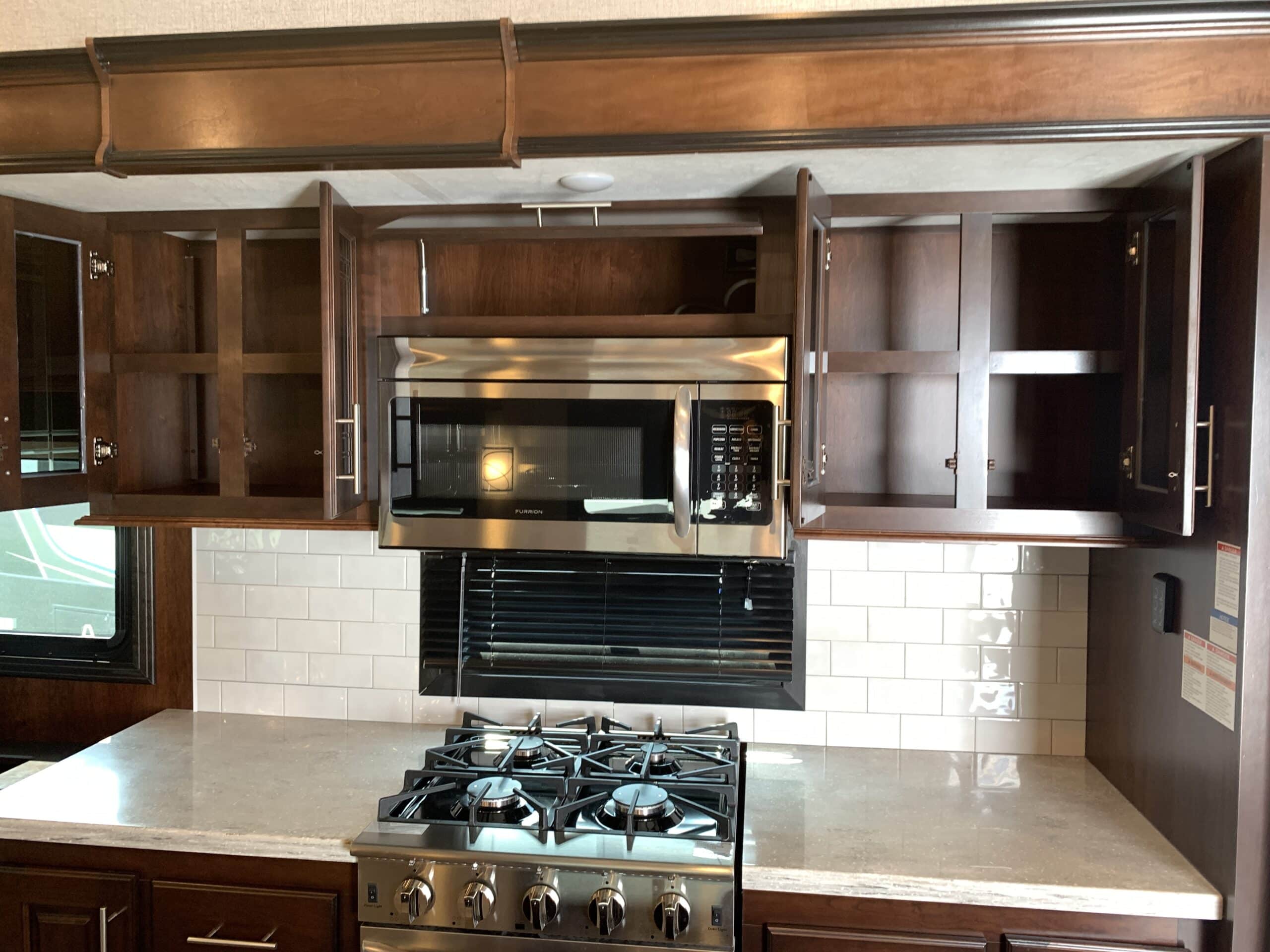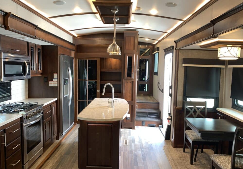 De plus, la Pinnacle 36PKTS a un air climatisé de 15000 btu. et un foyer électrique qui tempéreront l’ambiance désirée. L’aire principale avec son îlot central donne un bel espace de vie. Par ailleurs la cuisine a un micro-ondes, un poêle avec 4 brûleurs, un frigo et un très grand garde-manger. Aussi on y retrouve une table avec chaises. Enfin, le système audio vous permettra d’écouter votre musique préférée.