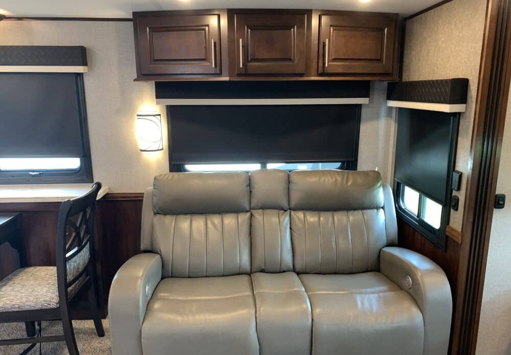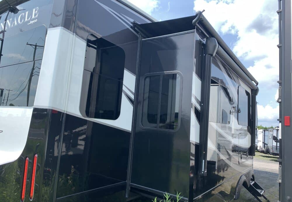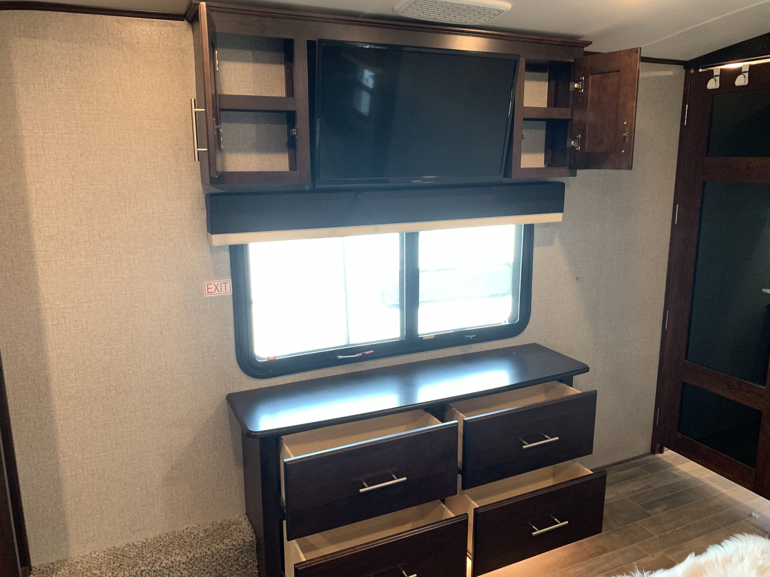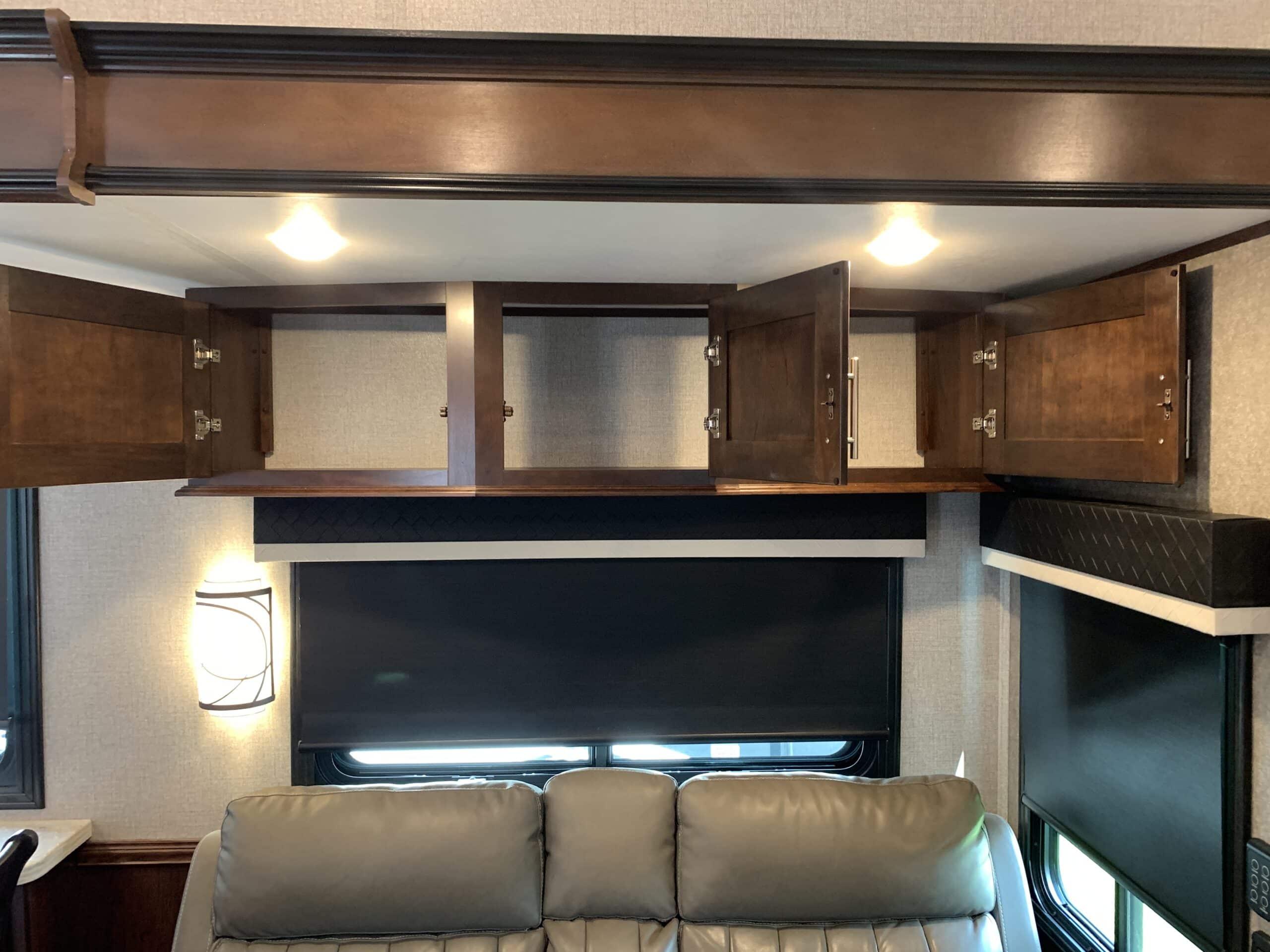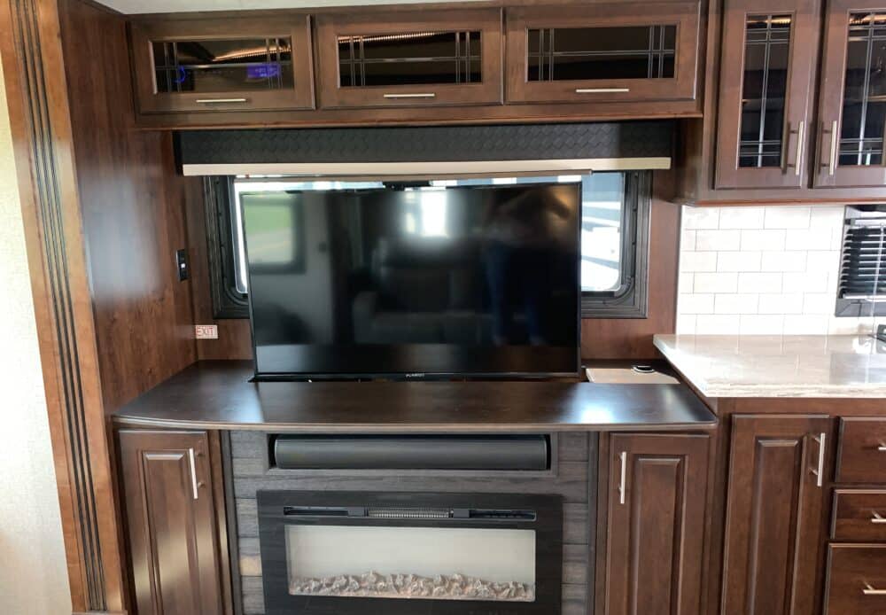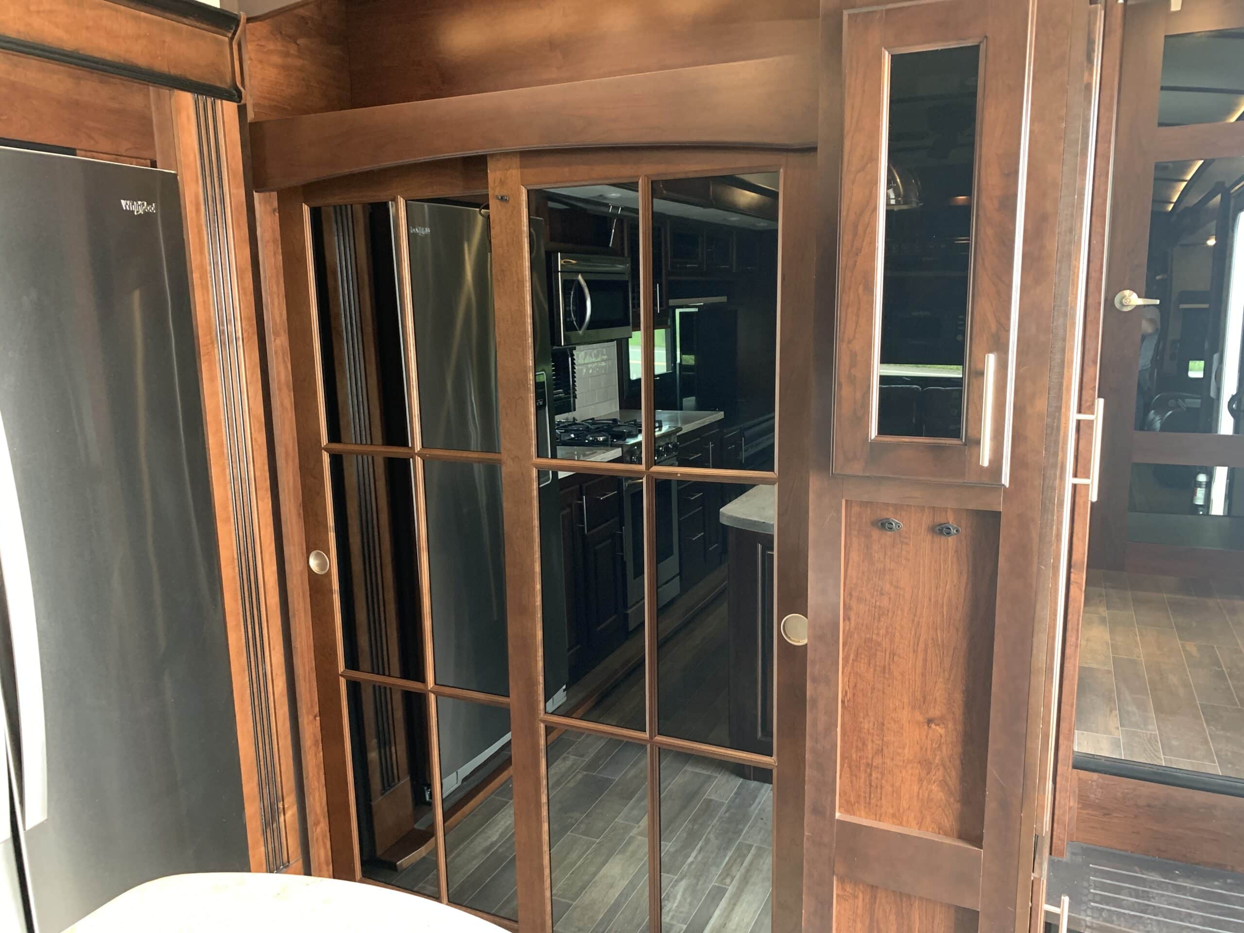 De plus, la Pinnacle 36PKTS a un air climatisé de 15000 btu. et un foyer électrique qui tempéreront l’ambiance désirée. L’aire principale avec son îlot central donne un bel espace de vie. Par ailleurs la cuisine a un micro-ondes, un poêle avec 4 brûleurs, un frigo et un très grand garde-manger. Aussi on y retrouve une table avec chaises. Enfin, le système audio vous permettra d’écouter votre musique préférée.