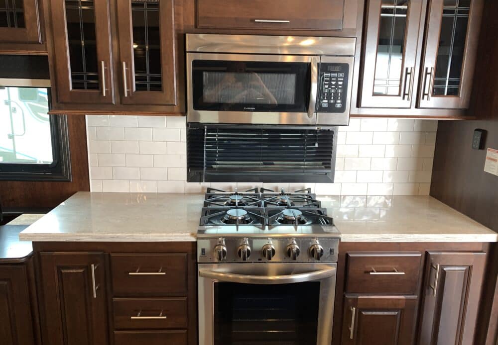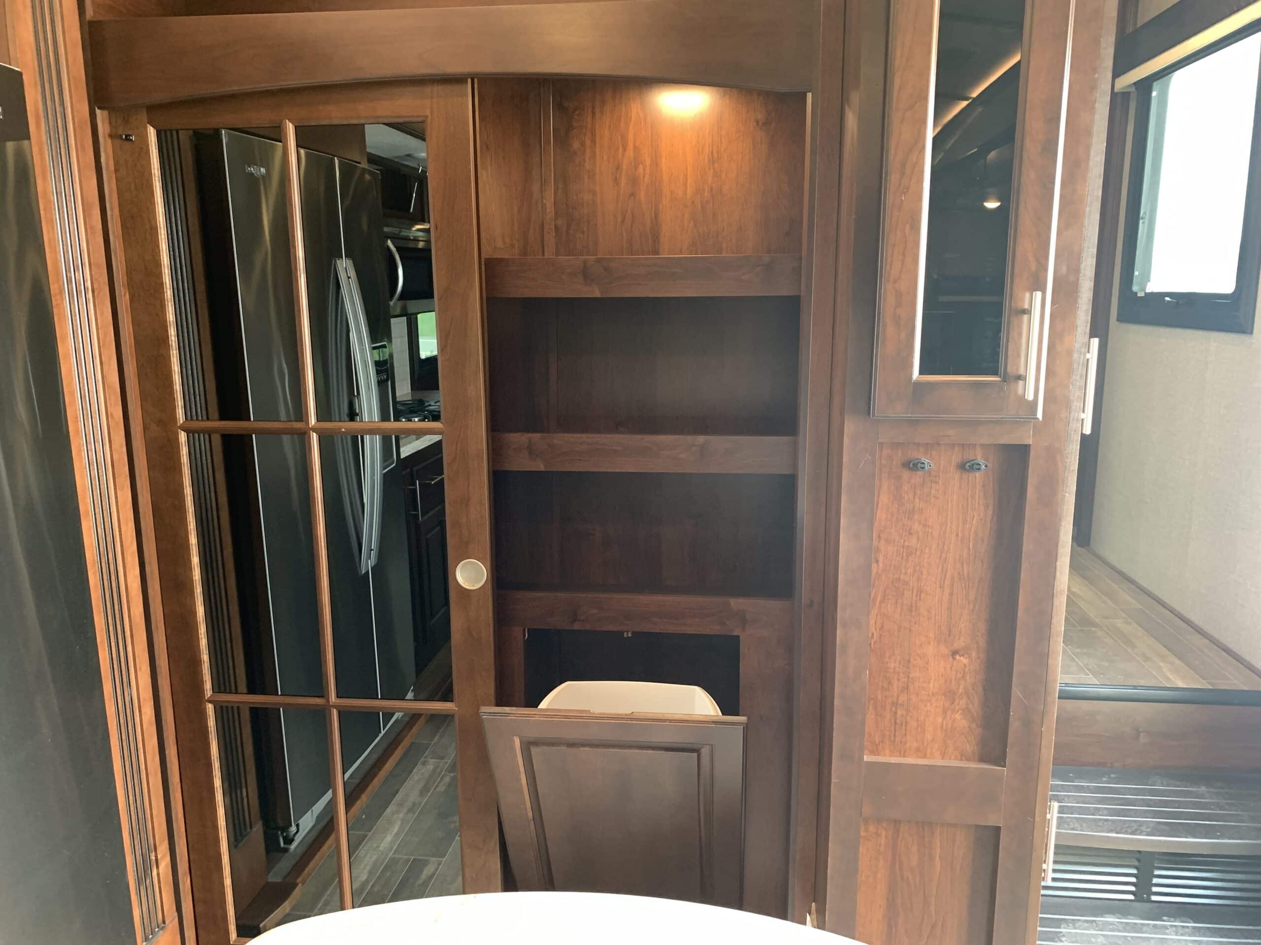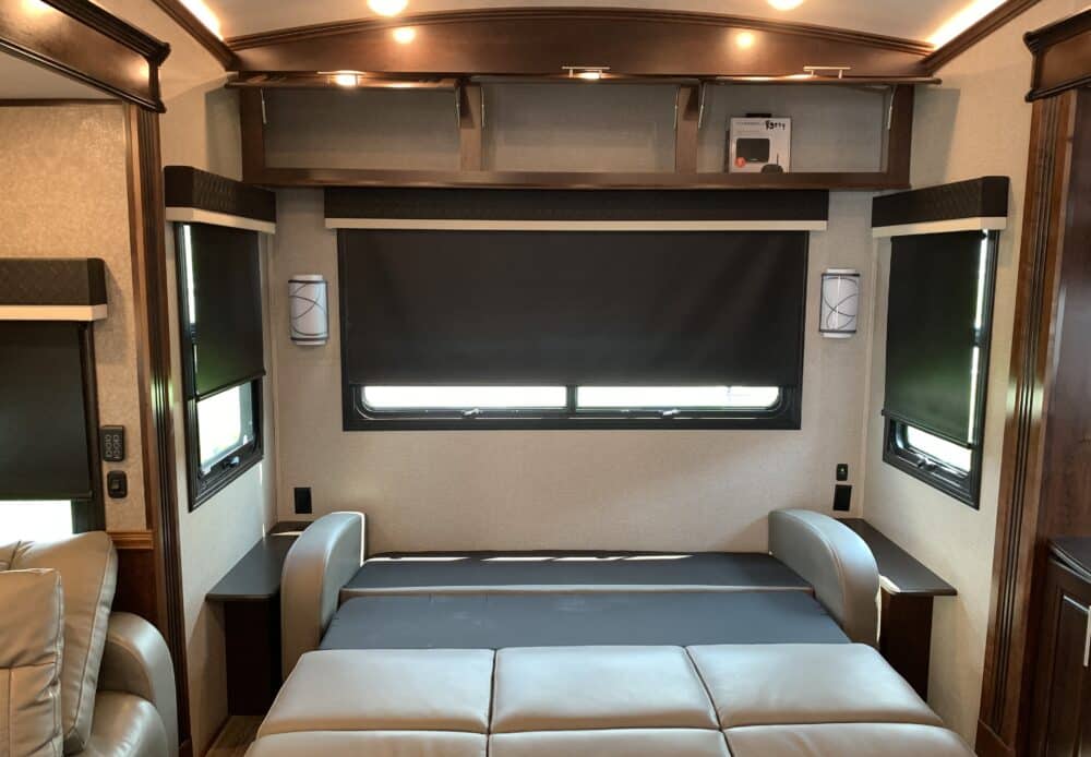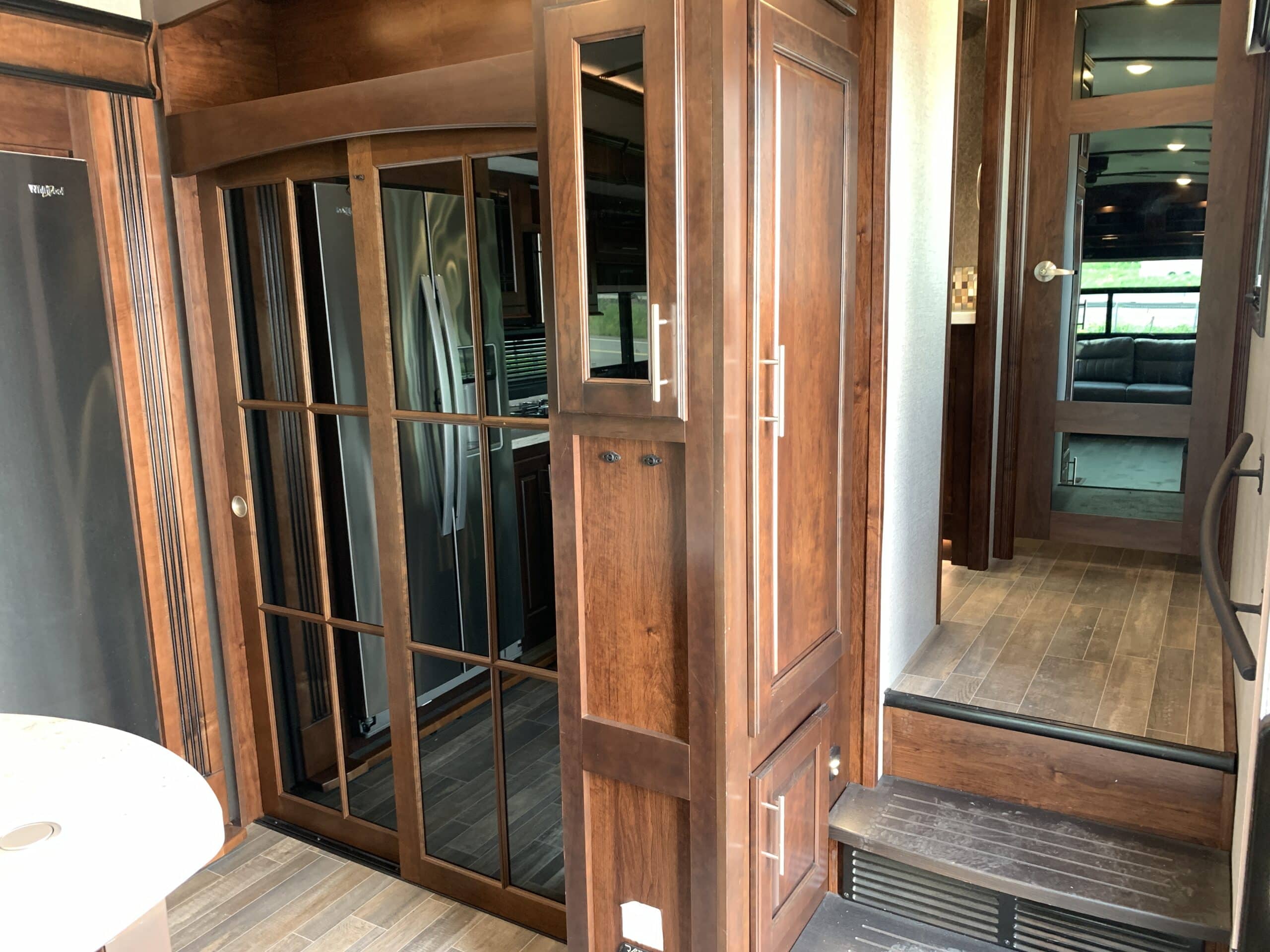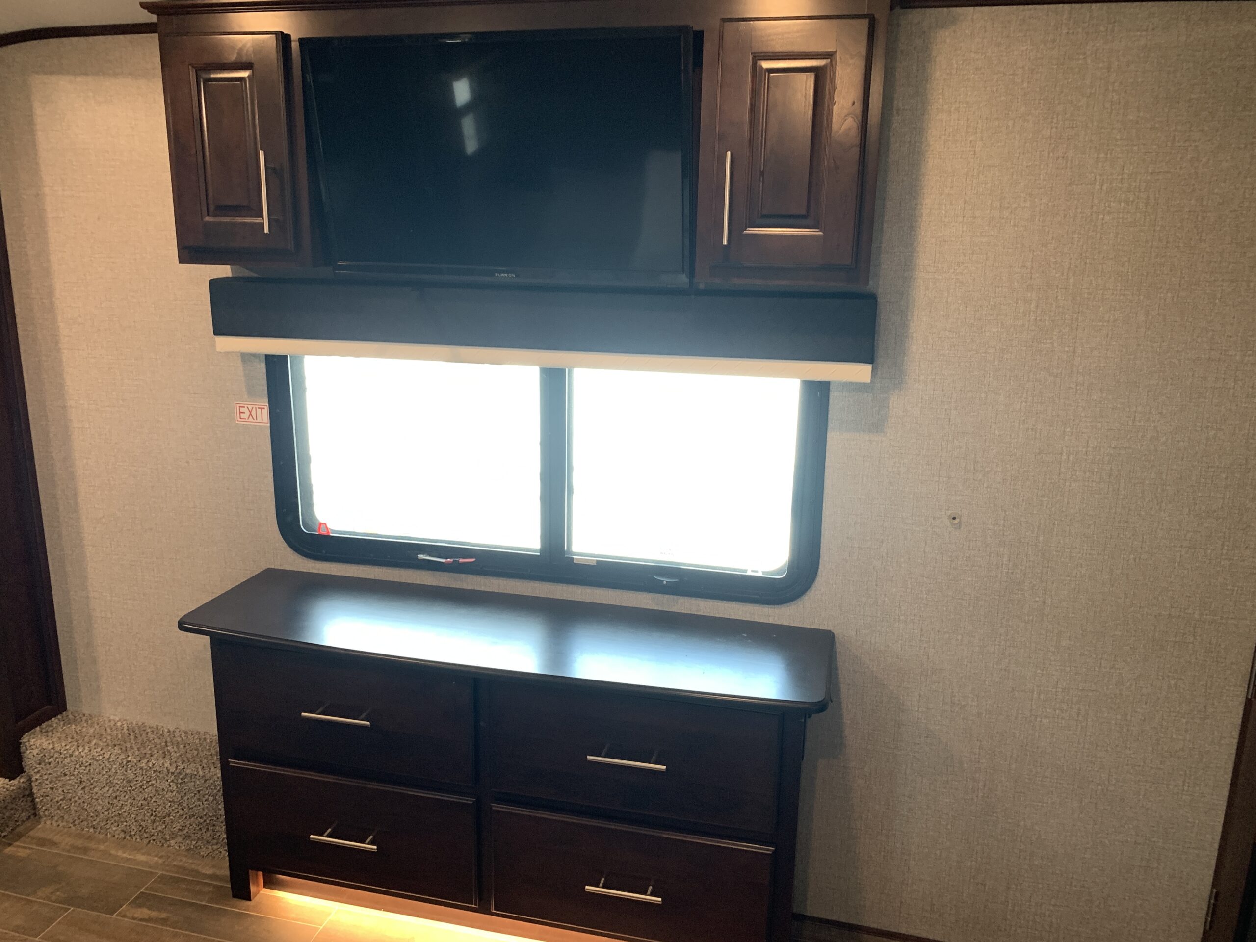De plus, la Pinnacle 36PKTS a un air climatisé de 15000 btu. et un foyer électrique qui tempéreront l’ambiance désirée. L’aire principale avec son îlot central donne un bel espace de vie. Par ailleurs la cuisine a un micro-ondes, un poêle avec 4 brûleurs, un frigo et un très grand garde-manger. Aussi on y retrouve une table avec chaises. Enfin, le système audio vous permettra d’écouter votre musique préférée.