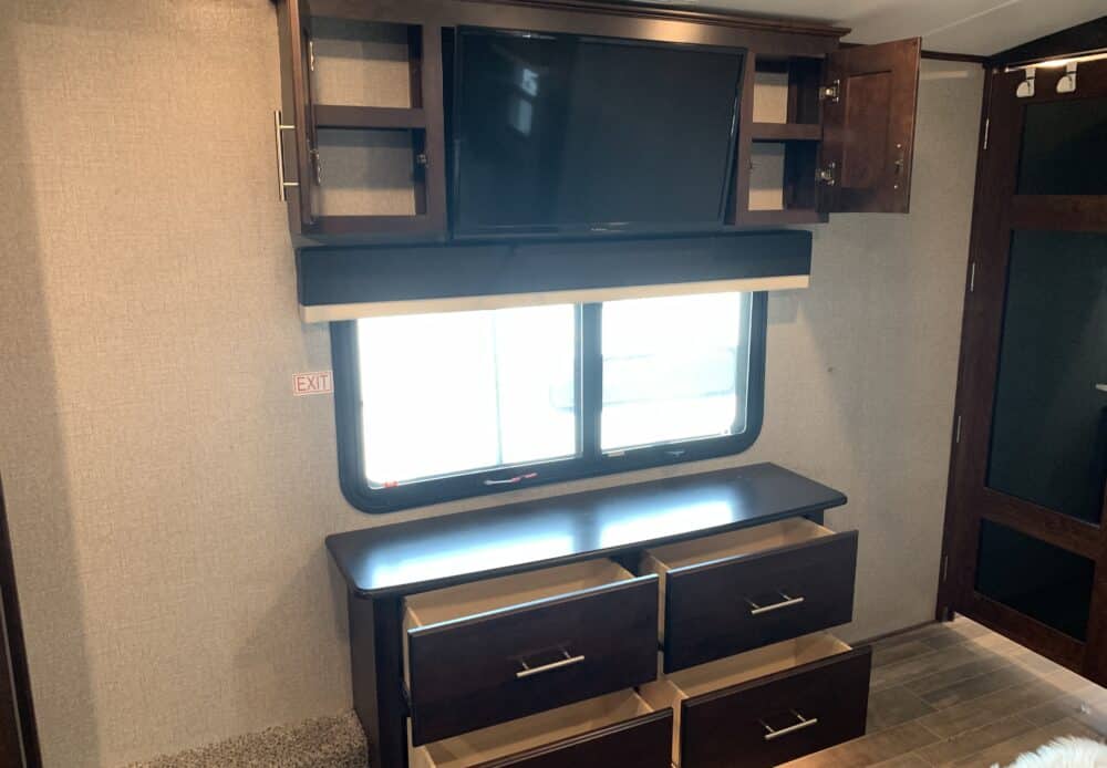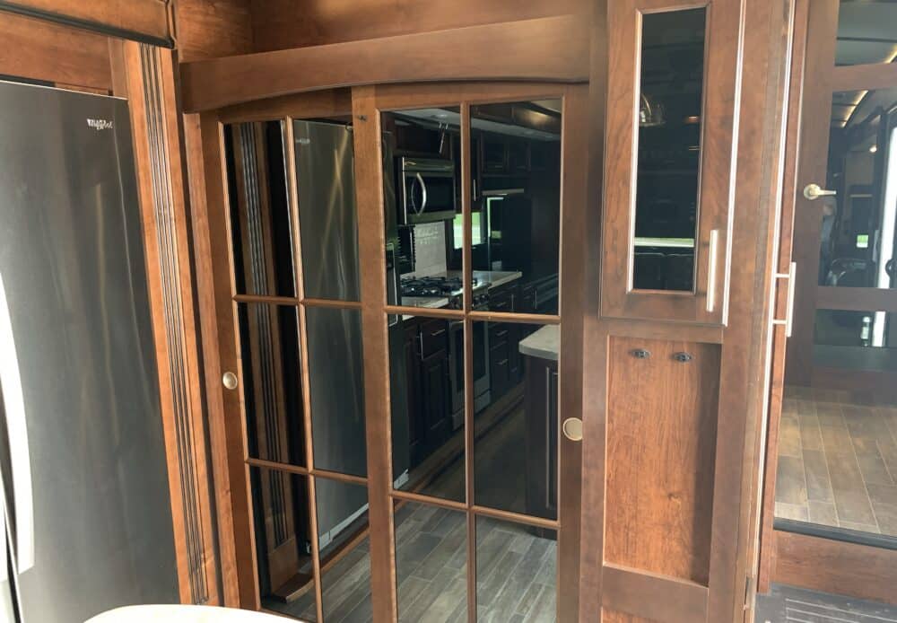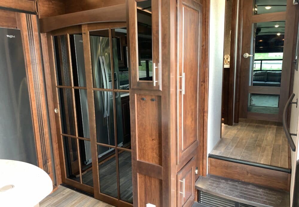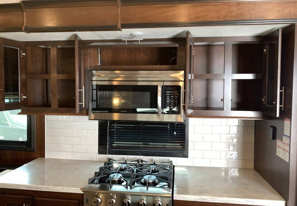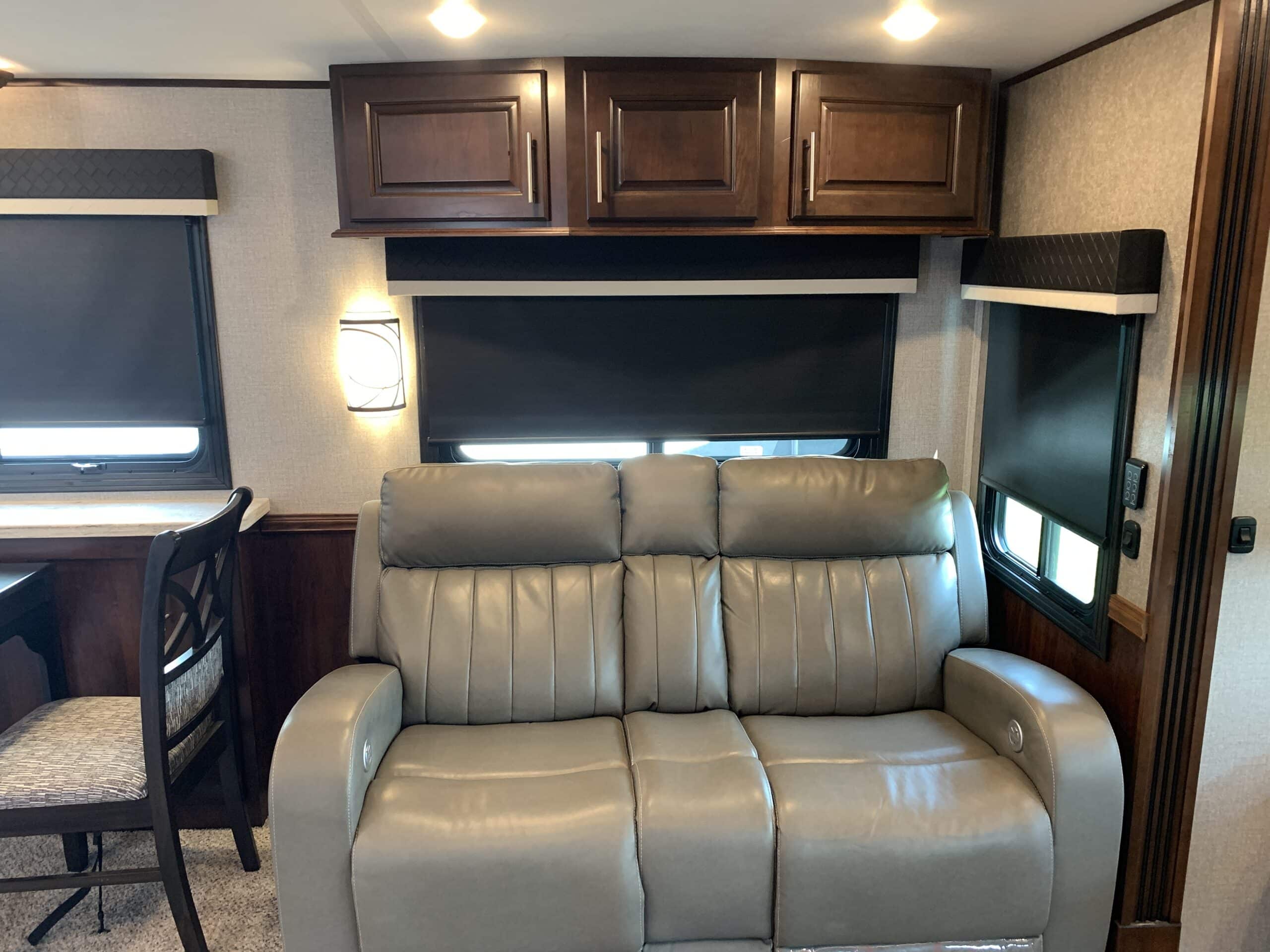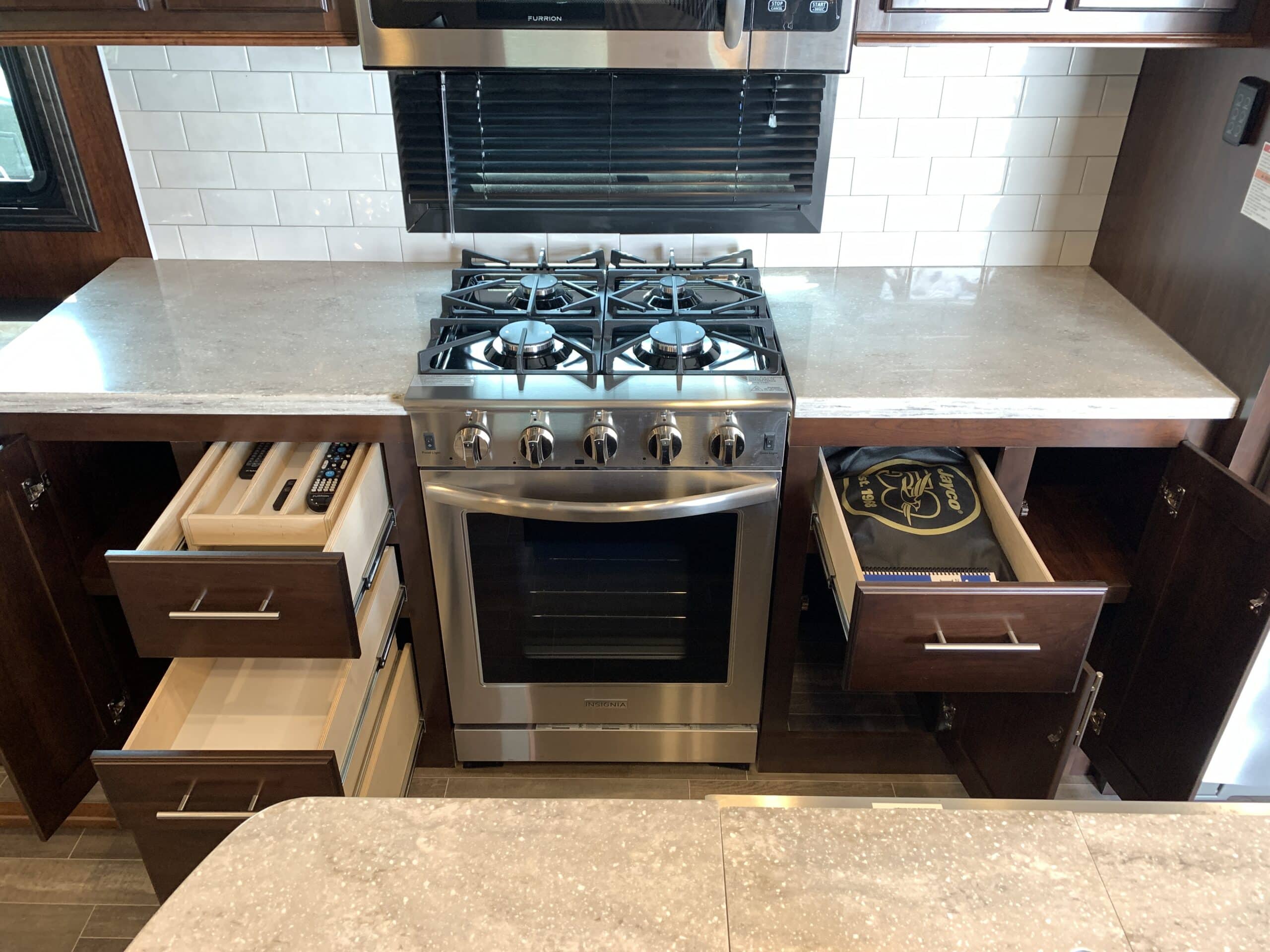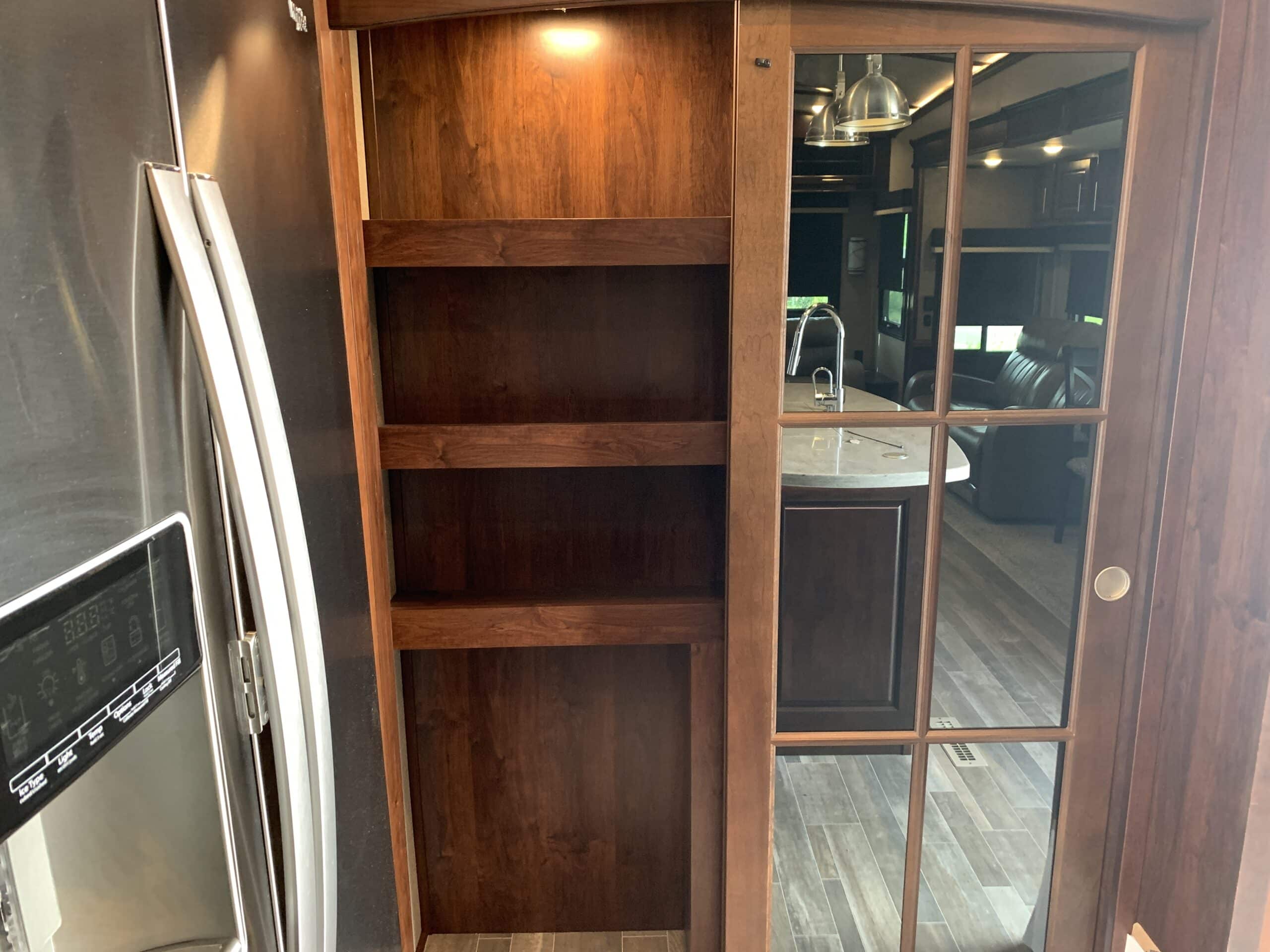 De plus, la Pinnacle 36PKTS a un air climatisé de 15000 btu. et un foyer électrique qui tempéreront l’ambiance désirée. L’aire principale avec son îlot central donne un bel espace de vie. Par ailleurs la cuisine a un micro-ondes, un poêle avec 4 brûleurs, un frigo et un très grand garde-manger. Aussi on y retrouve une table avec chaises. Enfin, le système audio vous permettra d’écouter votre musique préférée.