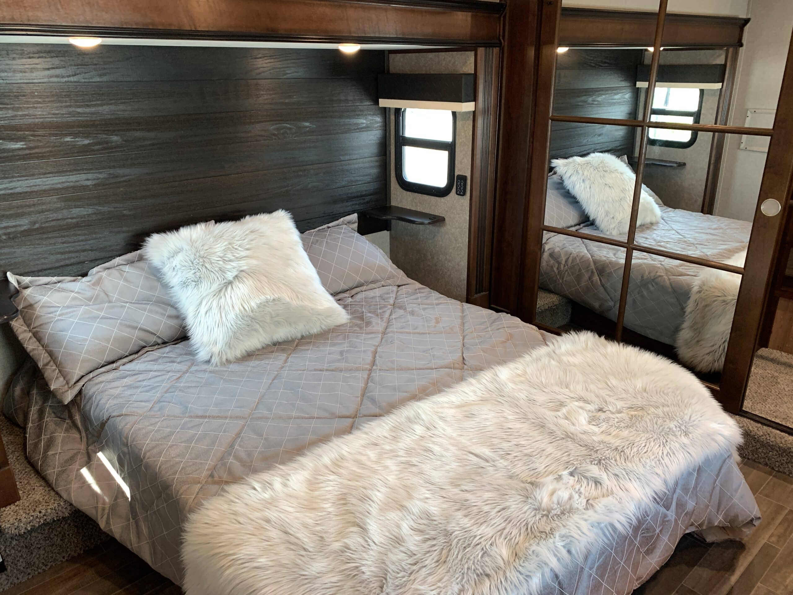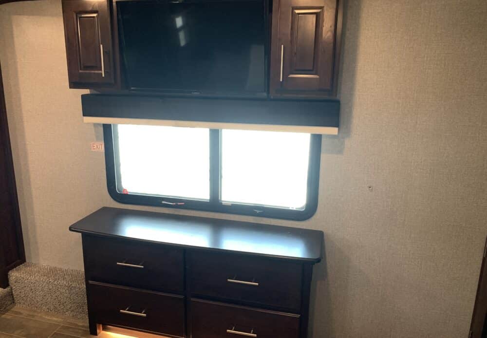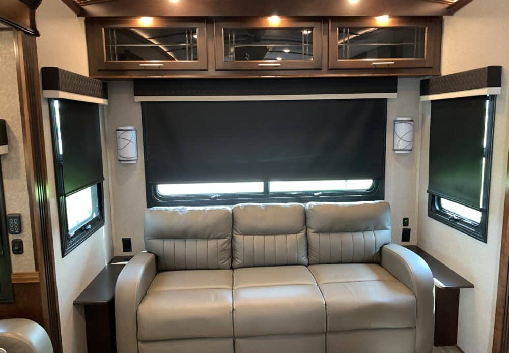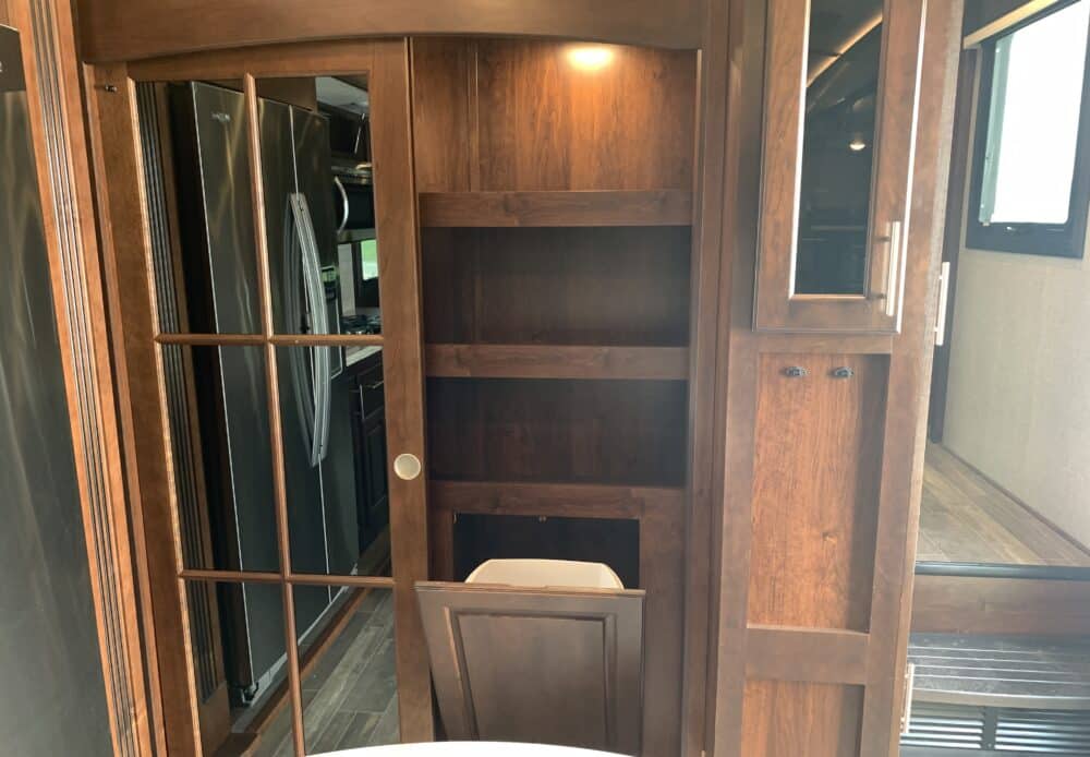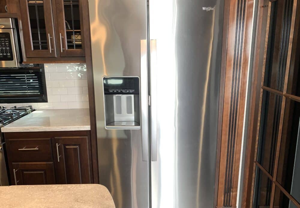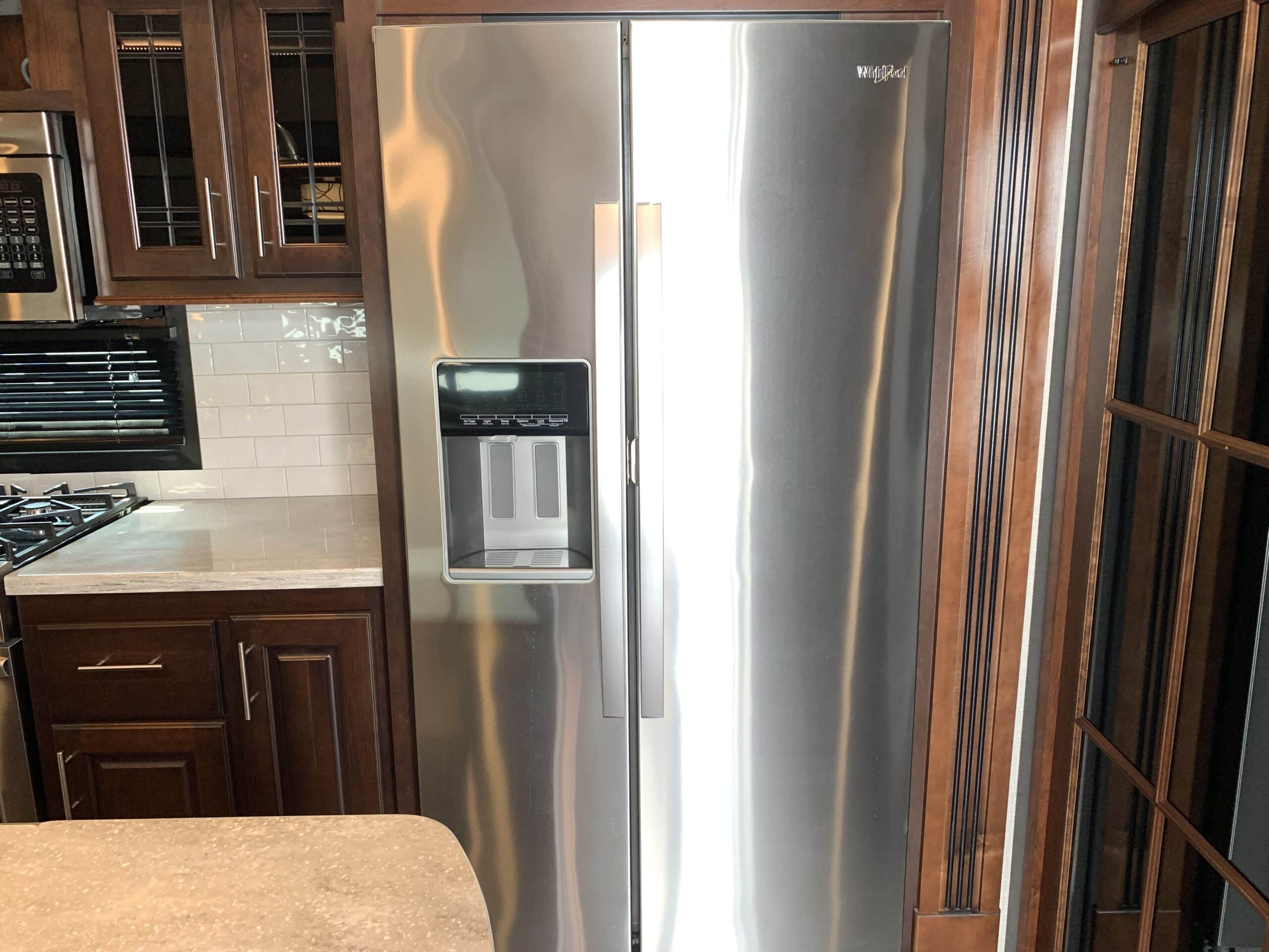 De plus, la Pinnacle 36PKTS a un air climatisé de 15000 btu. et un foyer électrique qui tempéreront l’ambiance désirée. L’aire principale avec son îlot central donne un bel espace de vie. Par ailleurs la cuisine a un micro-ondes, un poêle avec 4 brûleurs, un frigo et un très grand garde-manger. Aussi on y retrouve une table avec chaises. Enfin, le système audio vous permettra d’écouter votre musique préférée.