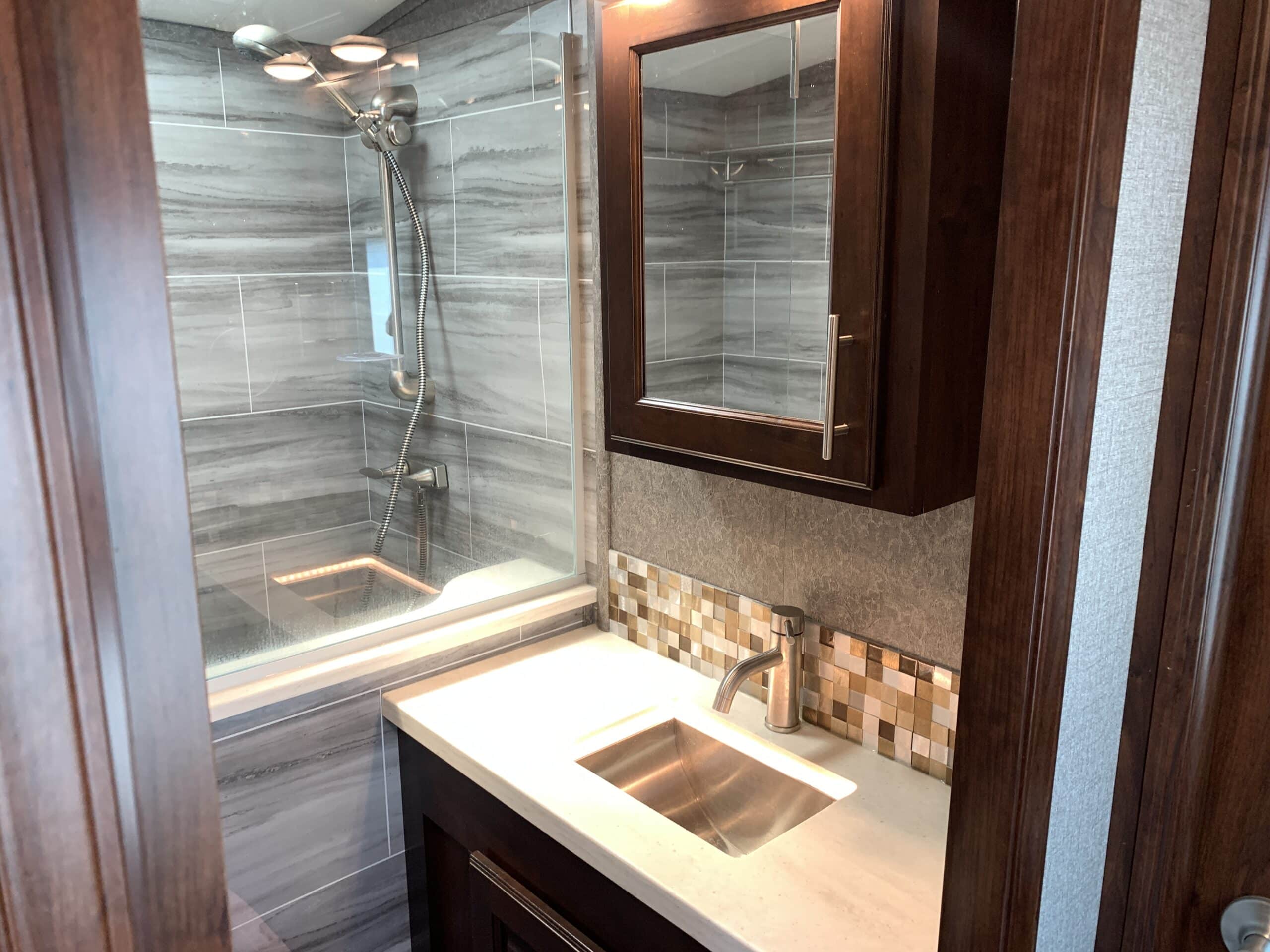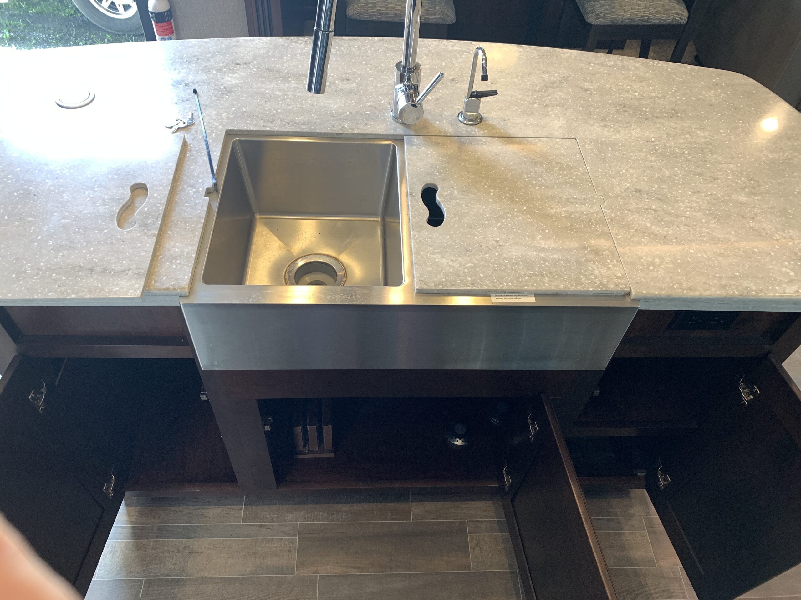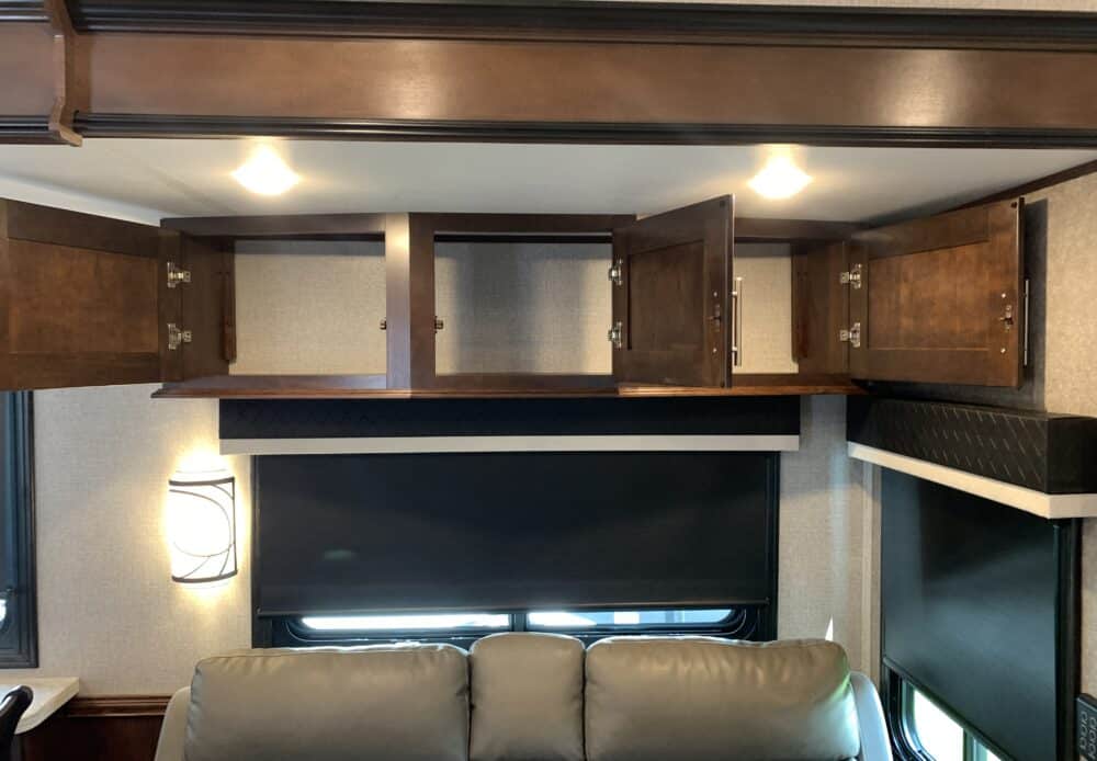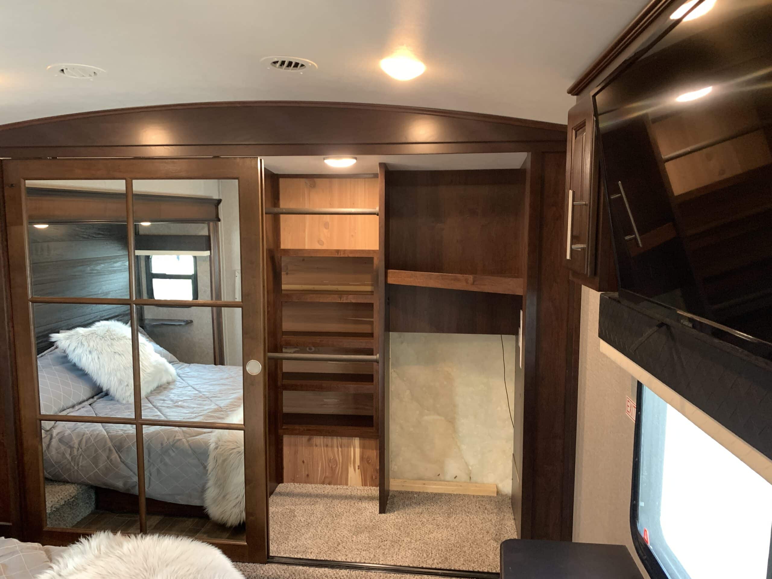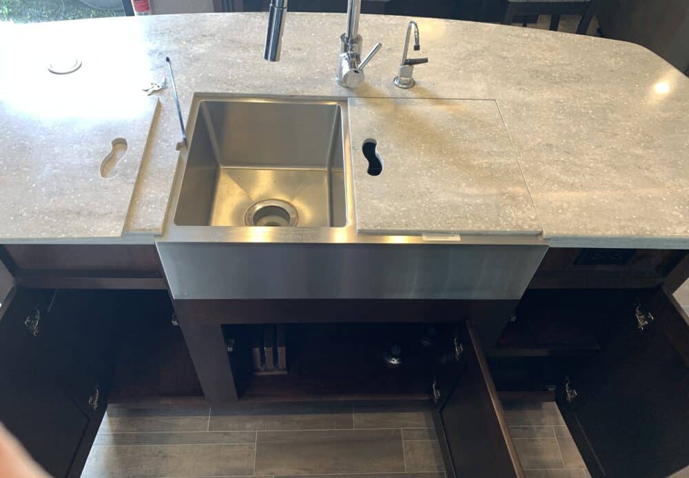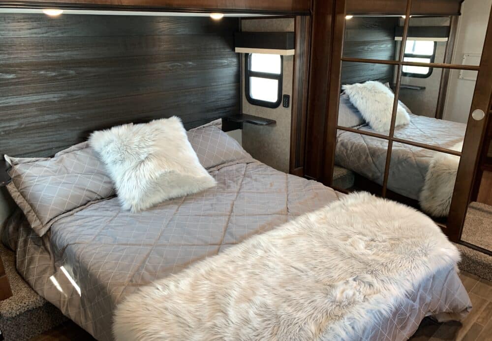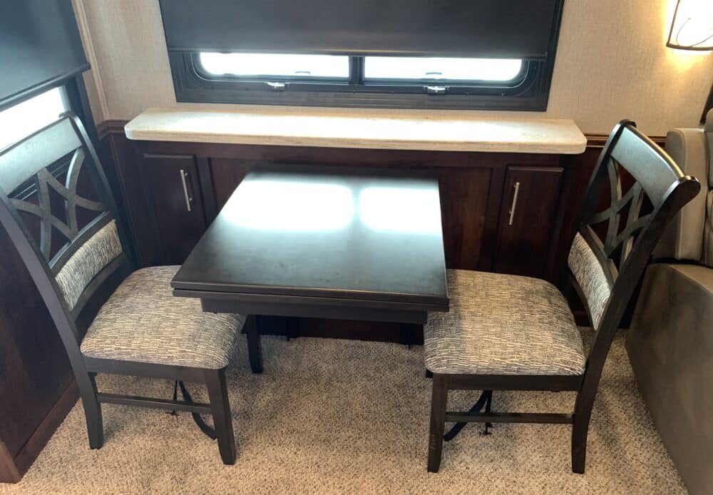 De plus, la Pinnacle 36PKTS a un air climatisé de 15000 btu. et un foyer électrique qui tempéreront l’ambiance désirée. L’aire principale avec son îlot central donne un bel espace de vie. Par ailleurs la cuisine a un micro-ondes, un poêle avec 4 brûleurs, un frigo et un très grand garde-manger. Aussi on y retrouve une table avec chaises. Enfin, le système audio vous permettra d’écouter votre musique préférée.