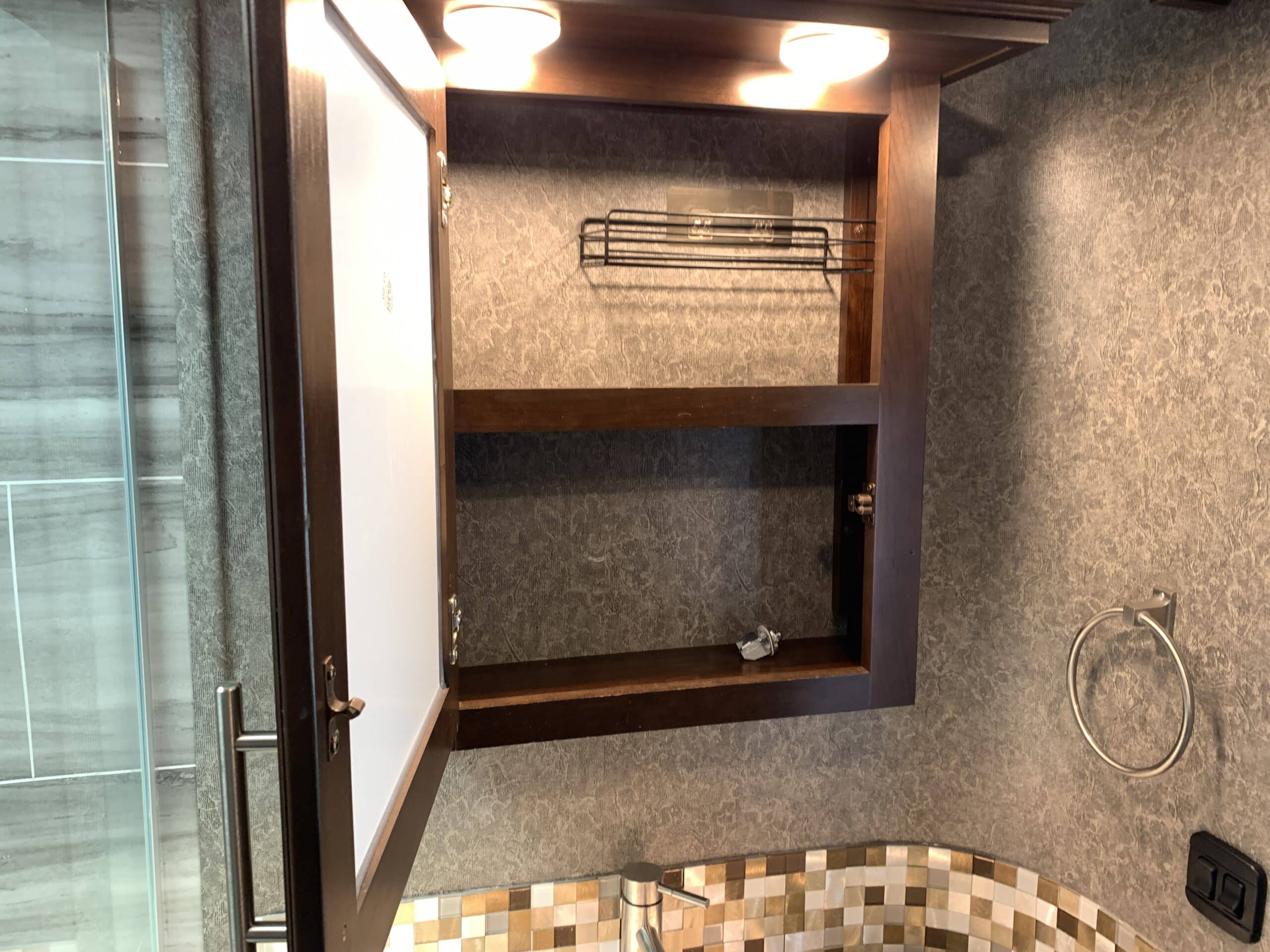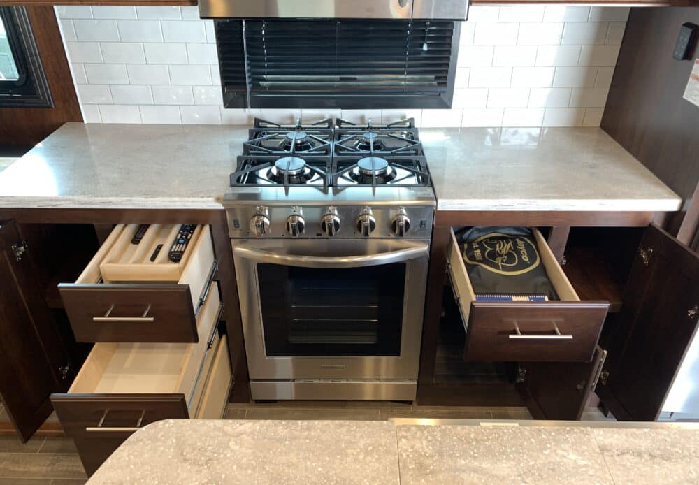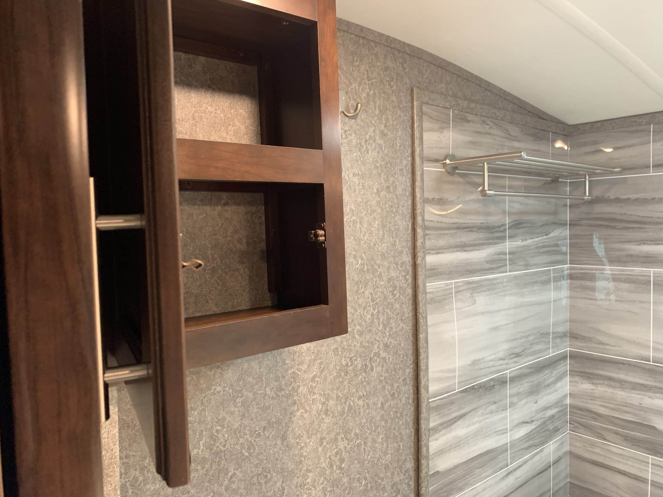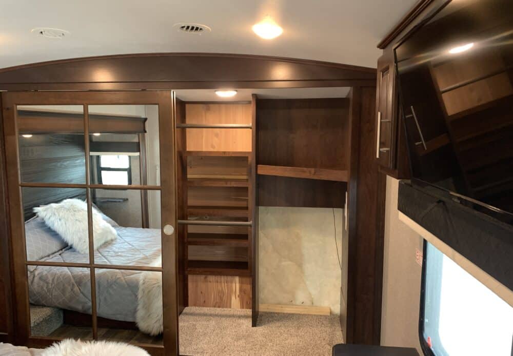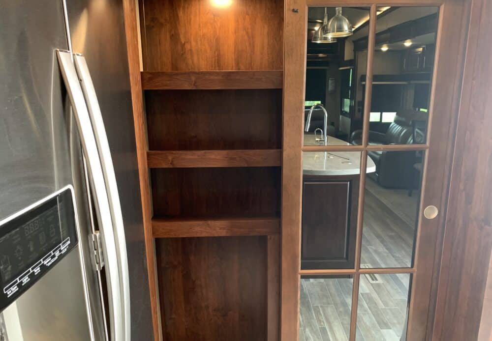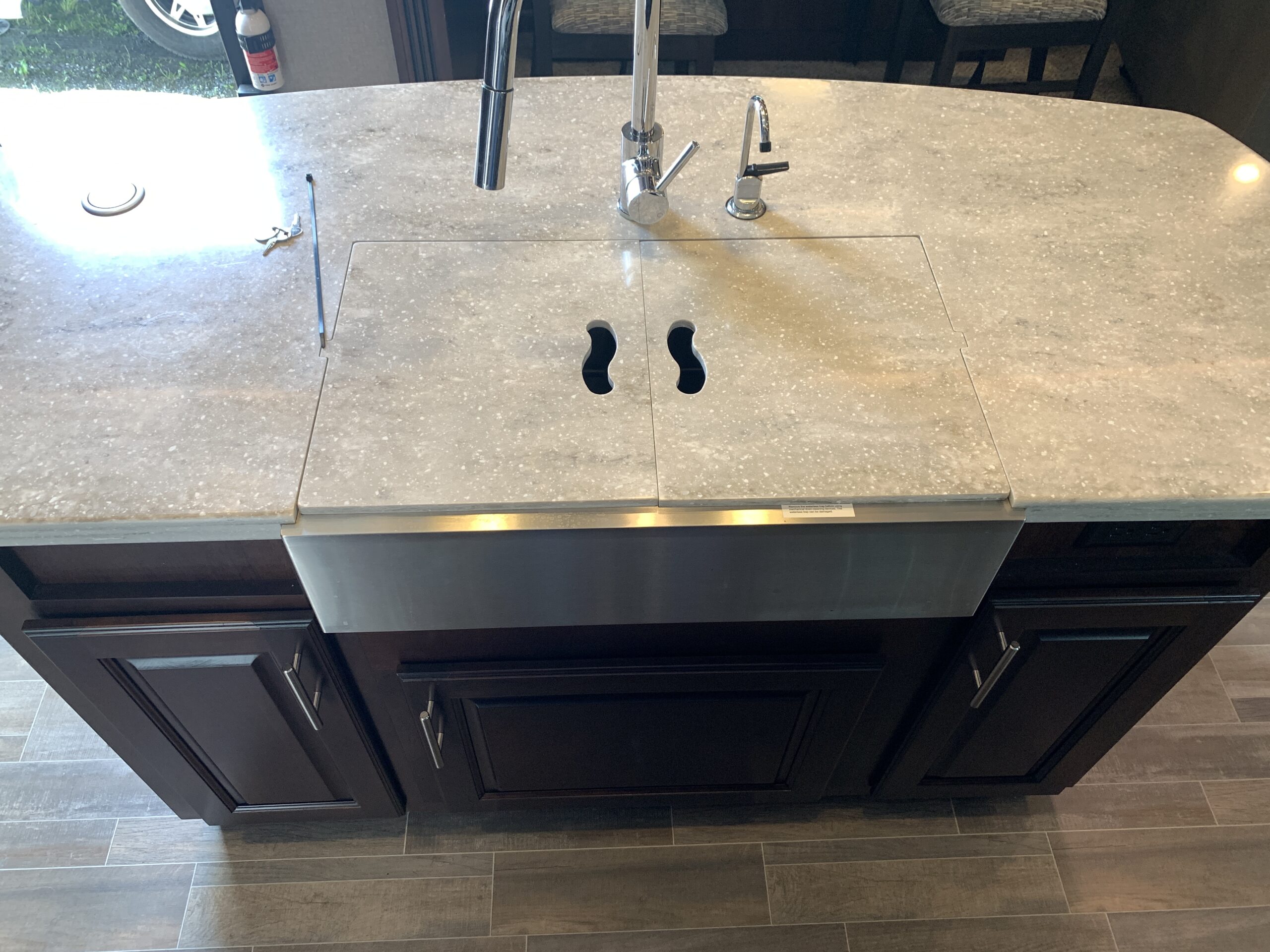 De plus, la Pinnacle 36PKTS a un air climatisé de 15000 btu. et un foyer électrique qui tempéreront l’ambiance désirée. L’aire principale avec son îlot central donne un bel espace de vie. Par ailleurs la cuisine a un micro-ondes, un poêle avec 4 brûleurs, un frigo et un très grand garde-manger. Aussi on y retrouve une table avec chaises. Enfin, le système audio vous permettra d’écouter votre musique préférée.