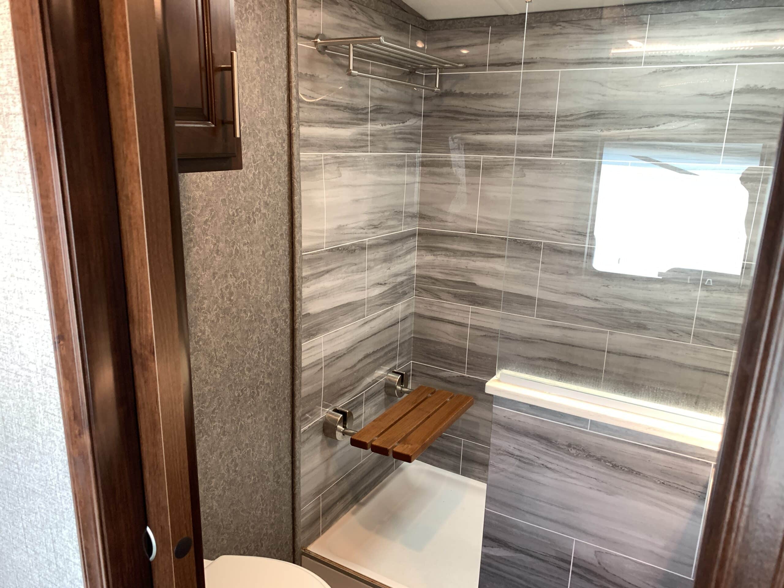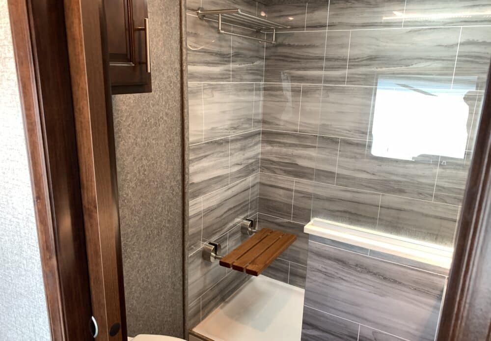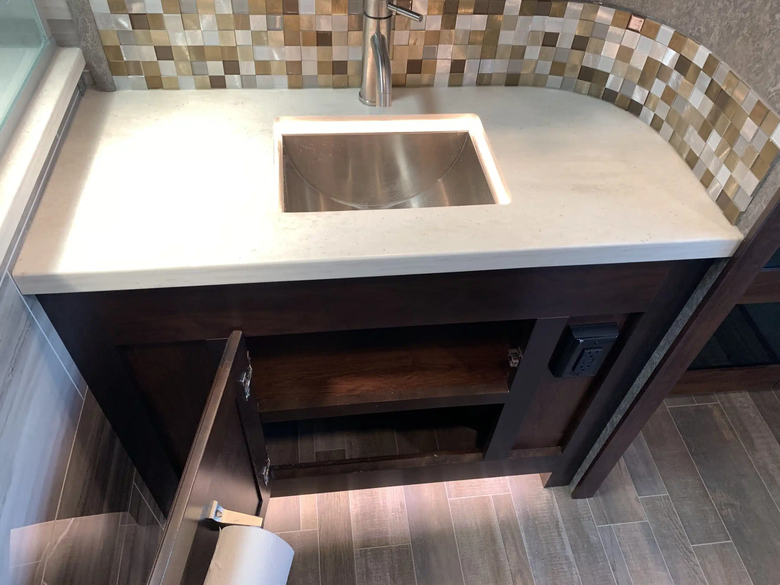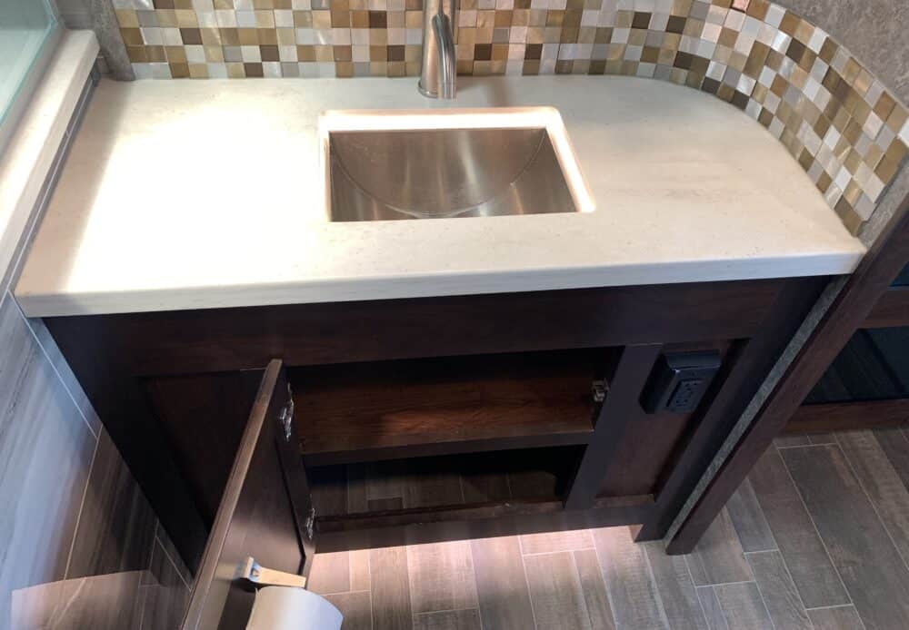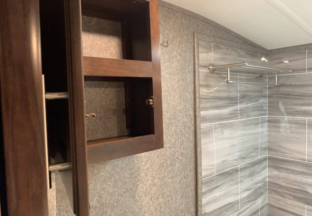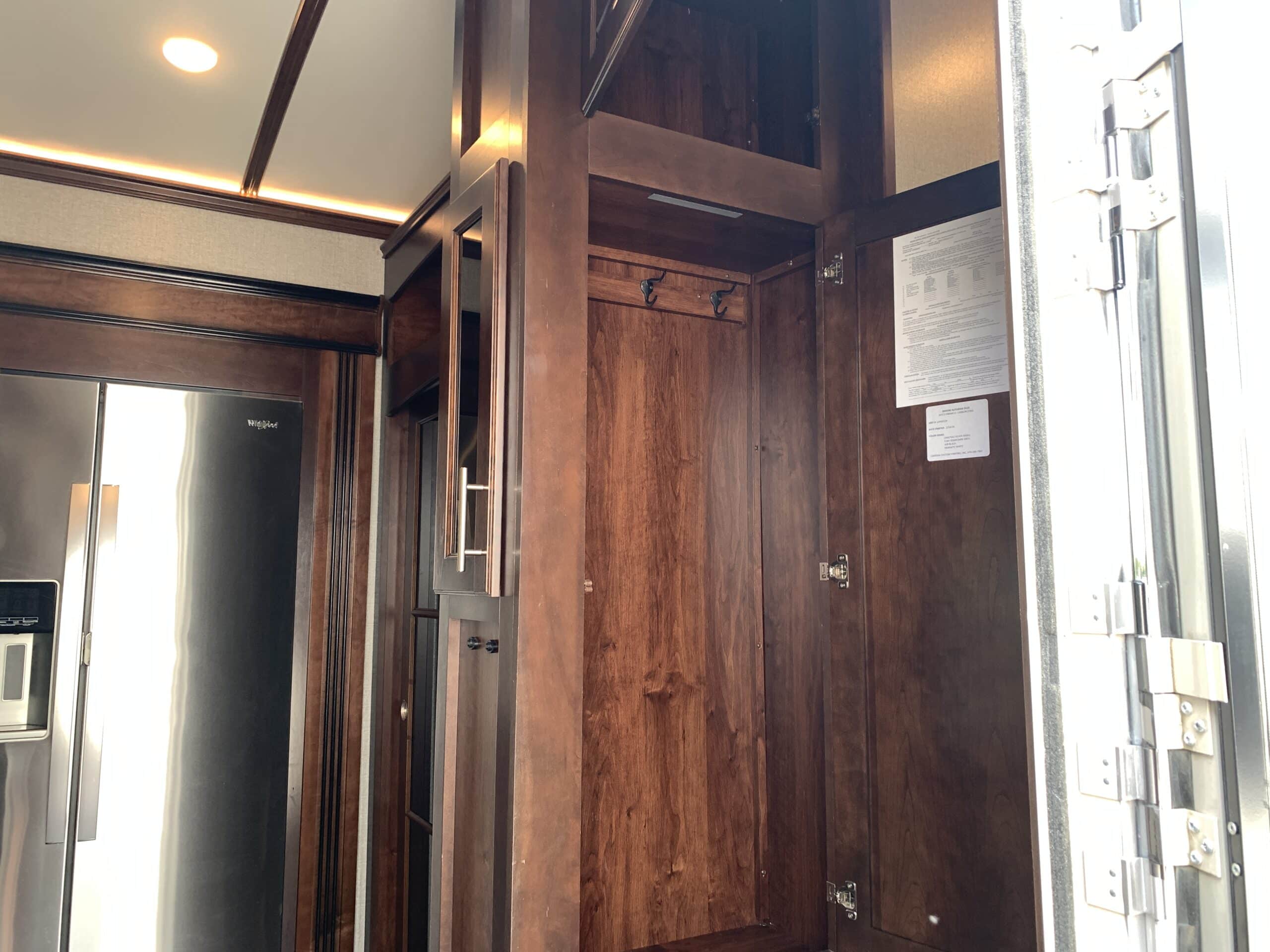De plus, la Pinnacle 36PKTS a un air climatisé de 15000 btu. et un foyer électrique qui tempéreront l’ambiance désirée. L’aire principale avec son îlot central donne un bel espace de vie. Par ailleurs la cuisine a un micro-ondes, un poêle avec 4 brûleurs, un frigo et un très grand garde-manger. Aussi on y retrouve une table avec chaises. Enfin, le système audio vous permettra d’écouter votre musique préférée.