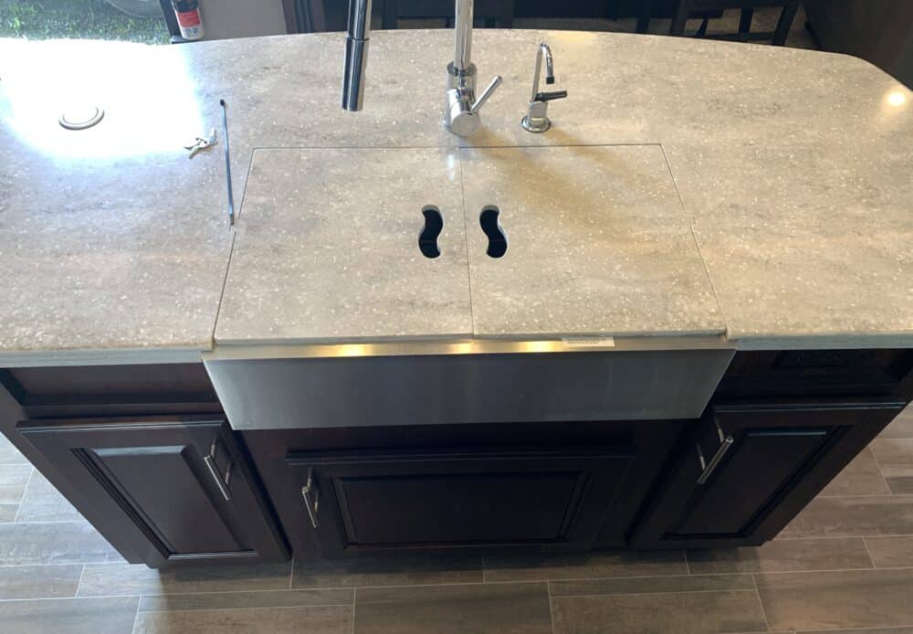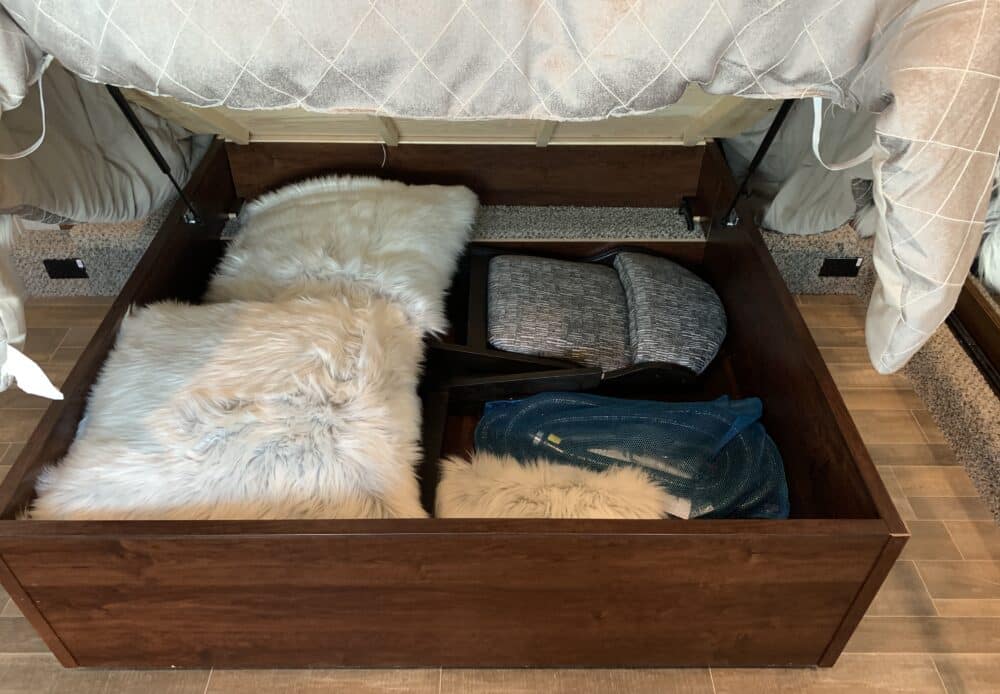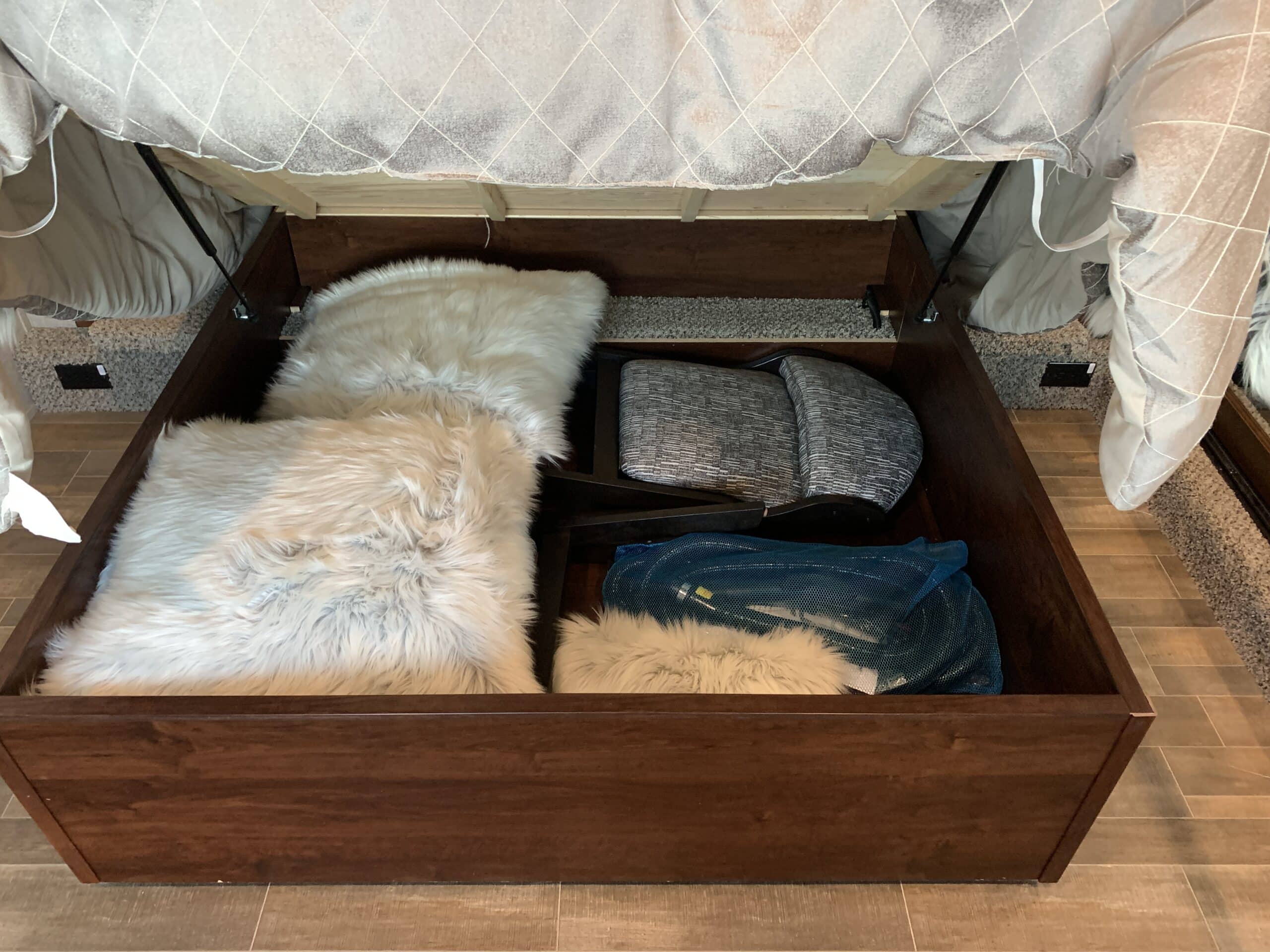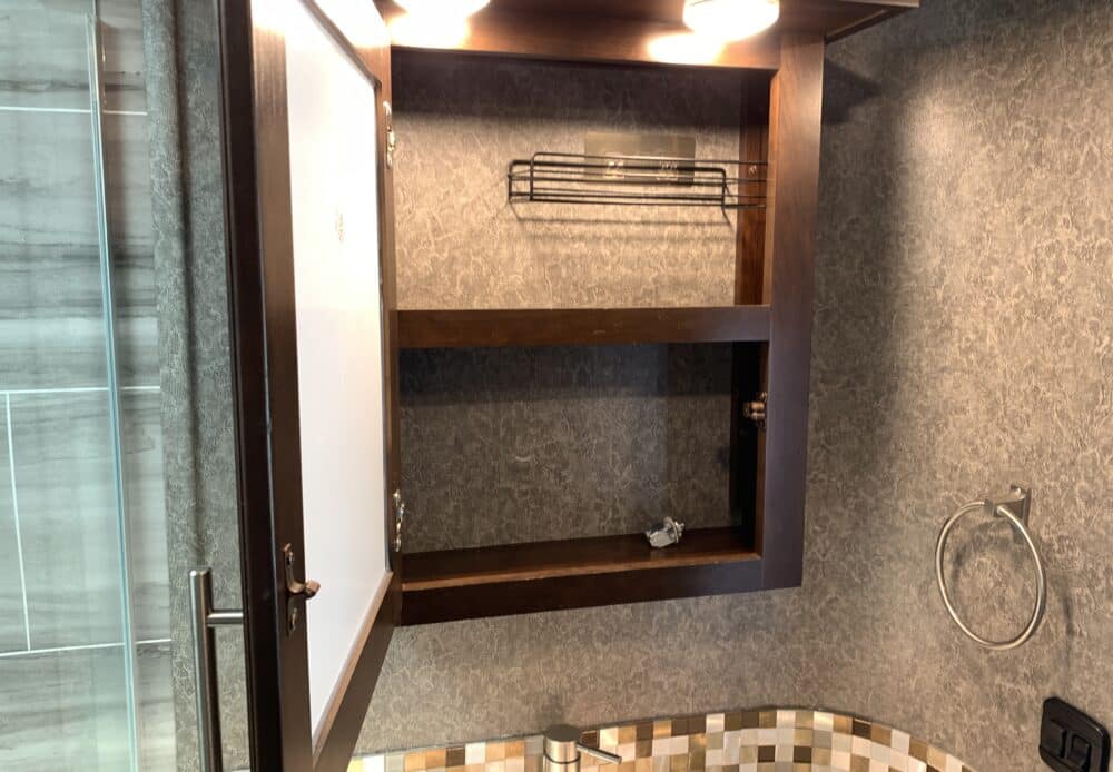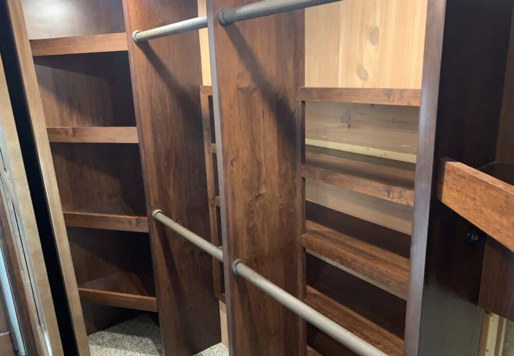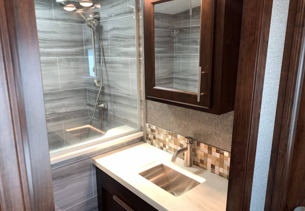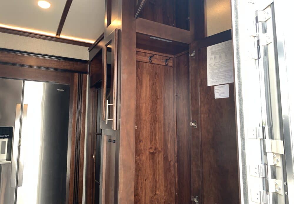 De plus, la Pinnacle 36PKTS a un air climatisé de 15000 btu. et un foyer électrique qui tempéreront l’ambiance désirée. L’aire principale avec son îlot central donne un bel espace de vie. Par ailleurs la cuisine a un micro-ondes, un poêle avec 4 brûleurs, un frigo et un très grand garde-manger. Aussi on y retrouve une table avec chaises. Enfin, le système audio vous permettra d’écouter votre musique préférée.
