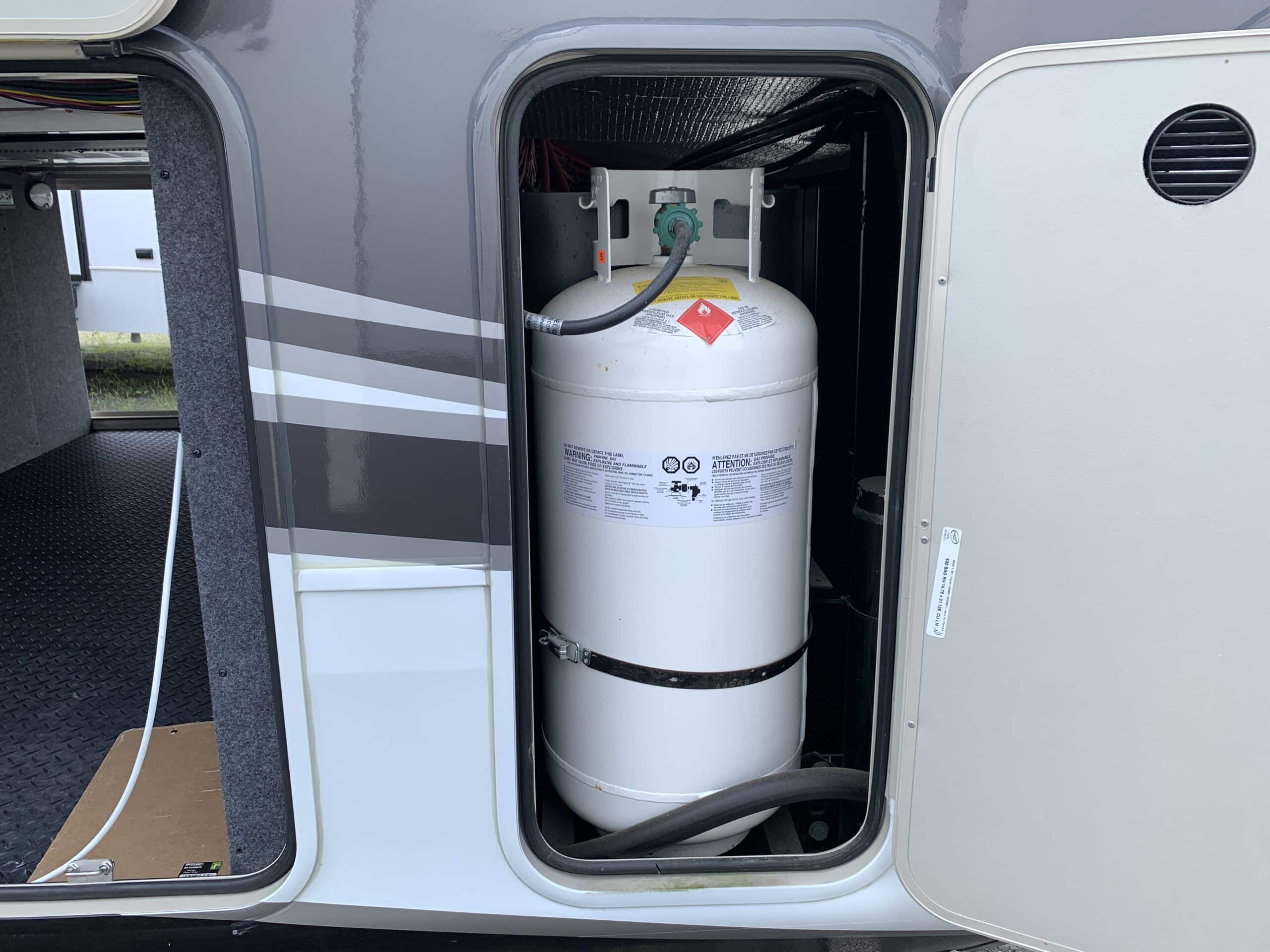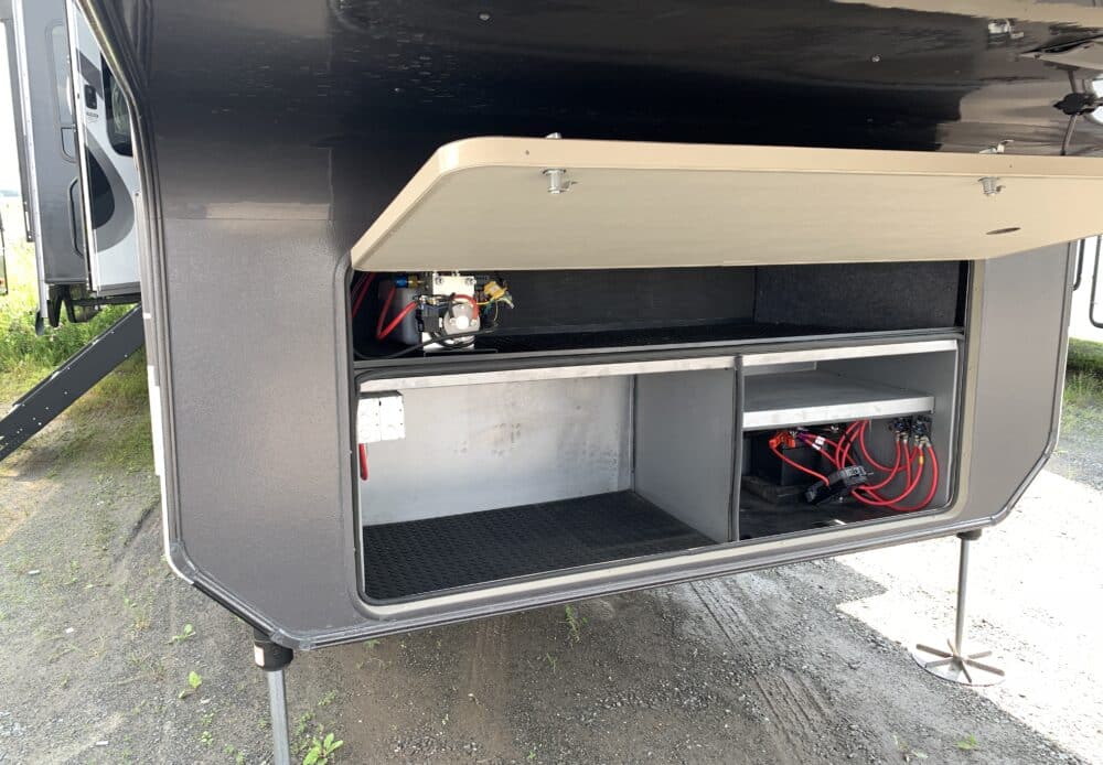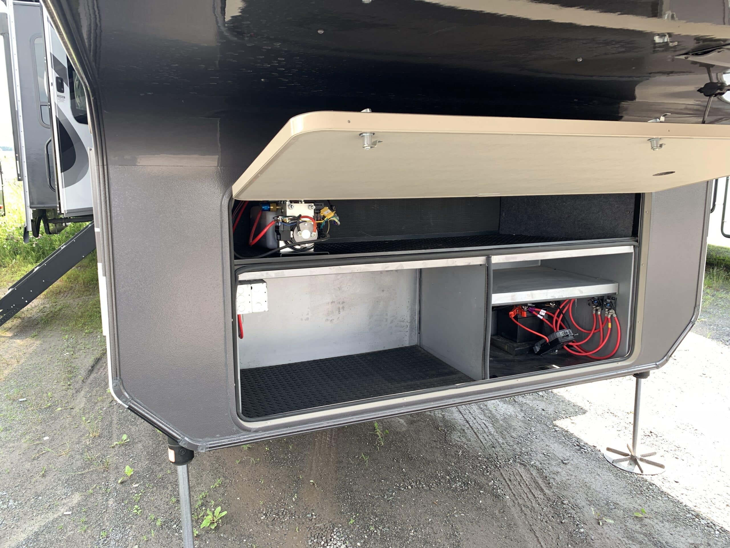 D’abord cette roulotte a 2 auvents de 11 et 18 pieds et une douche pour profiter de l’extérieur sans soucis. Puisque ses marches sont ajustables et très stables vous aurez un accès facile à l’intérieur. Ensuite, elle est muni d’une échelle pour l’accès au toit. De plus une prise 50 ampères pour une meilleure qualité de courant. Les coffres ont un bel espace de rangement.